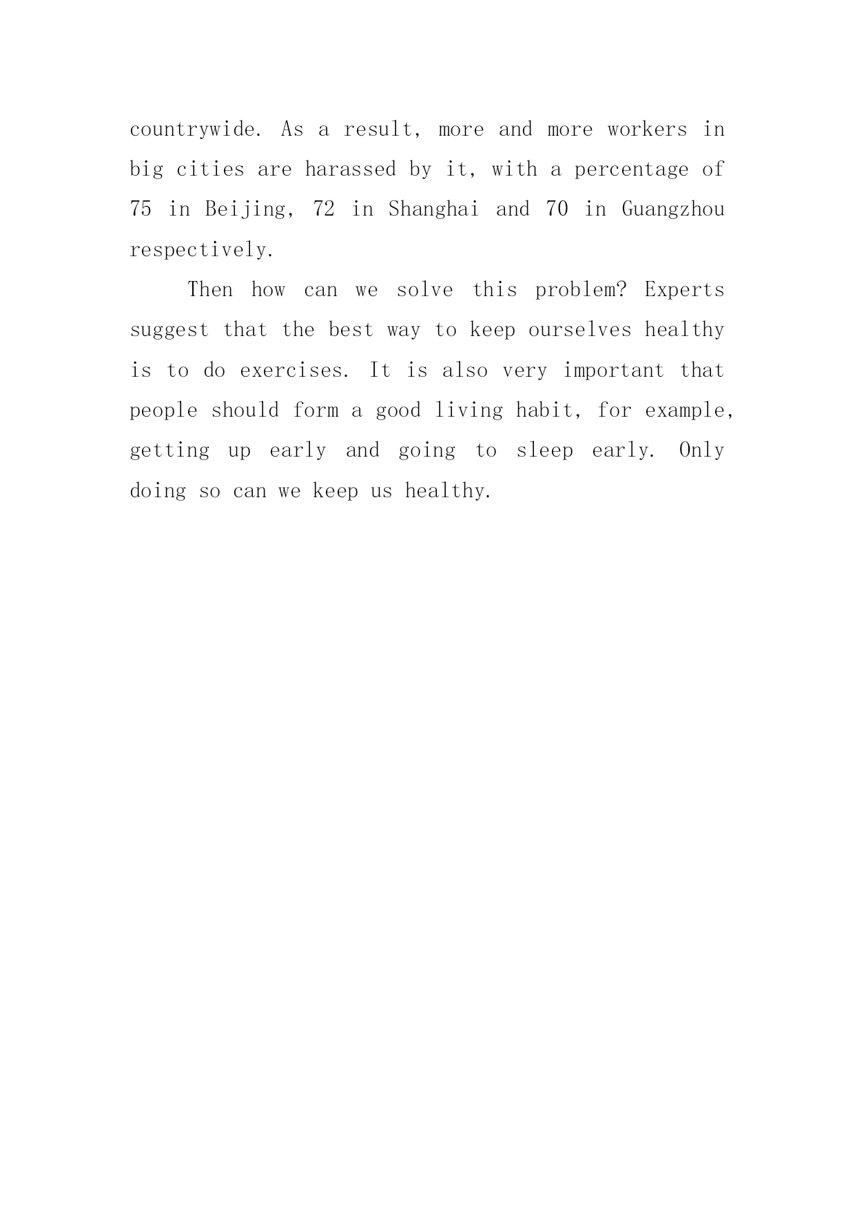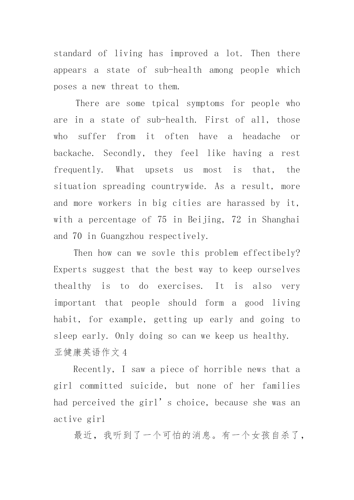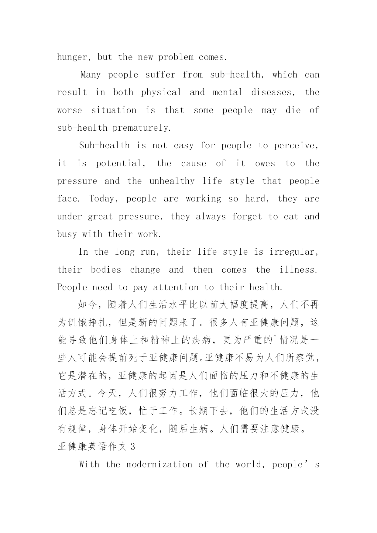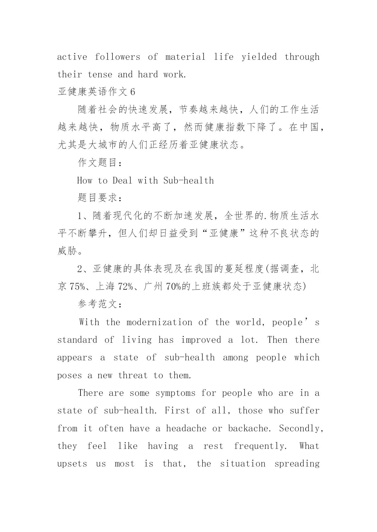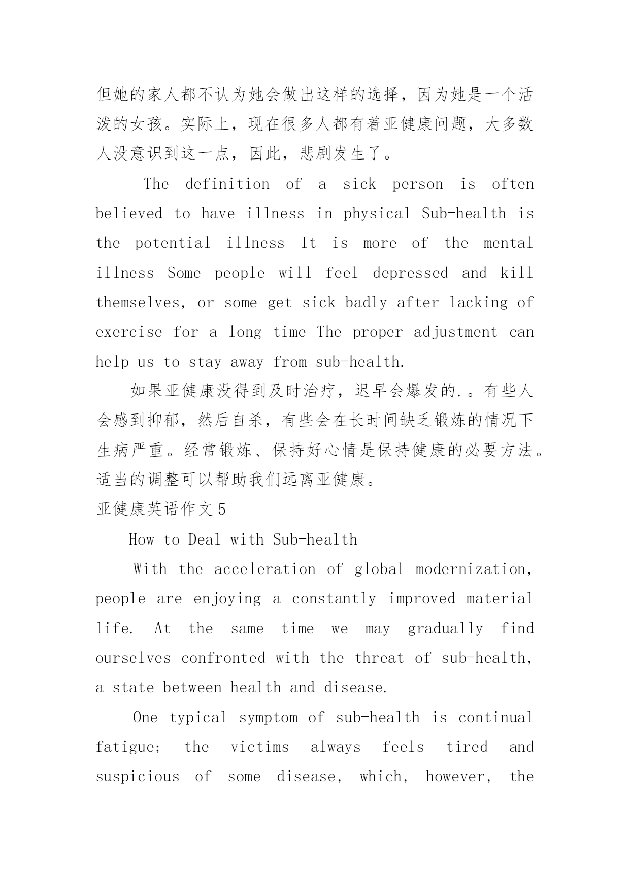 亚健康英语作文亚健康英语作文在日常生活或是工作学习中,大家一定都接触过作文吧,作文可分为小学作文、中学作文、大学作文(论文)。相信许多人会觉得作文很难写吧,下面是小编整理的亚健康英语作文,仅供参考,大家一起来看看吧。亚健康英语作文1withtheaccelerationofglobalmodernization,peopleareenjoyingaconstantlyimprovedmateriallife.atthesametimewemaygraduallyfindourselvesconfrontedwiththethreatofsub-health,astatebetweenhealthanddisease.onetypicalsymptomofsub-healthiscontinualfatigue;thevictimsalwaysfeelstiredandsuspiciousofsomedisease,which,however,theactivefollowersofmateriallifeyieldedthroughtheirtenseandhardwork.亚健康英语作文2Nowadays,aspeople’slivestandardismuchbetterthanbefore,peoplenolongerstruggleforhunger,butthenewproblemcomes.Manypeoplesufferfromsub-health,whichcanresultinbothphysicalandmentaldiseases,theworsesituationisthatsomepeoplemaydieofsub-healthprematurely.Sub-healthisnoteasyforpeopletoperceive,itispotential,thecauseofitowestothepressureandtheunhealthylifestylethatpeopleface.Today,peopleareworkingsohard,theyareundergreatpressure,theyalwaysforgettoeatandbusywiththeirwork.Inthelongrun,theirlifestyleisirregular,theirbodieschangeandthencomestheillness.Peopleneedtopayattentiontotheirhealth.如今,随着人们生活水平比以前大幅度提高,人们不再为饥饿挣扎,但是新的问题来了。很多人有亚健康问题,这能导致他们身体上和精神上的疾病,更为严重的`情况是一些人可能会提前死于亚健康问题。亚健康不易为人们所察觉,它是潜在的,亚健康的起因是人们面临的压力和不健康的生活方式。今天,人们很努力工作,他们面临很大的压力,他们总是忘记吃饭,忙于工作。长期下去,他们的生活方式没有规律,身体开始变化,随后生病。人们需要注意健康。亚健康英语作文3Withthemodernizationoftheworld,people’sstandardoflivinghasimprovedalot.Thenthereappearsastateofsub-healthamongpeoplewhichposesanewthreattothem.Therearesometpicalsymptomsforpeoplewhoareinastateofsub-health.Firstofall,thosewhosufferfromitoftenhaveaheadacheorbackache.Secondly,theyfeellikehavingarestfrequently.Whatupsetsusmostisthat,thesituationspreadingcountrywide.Asaresult,moreandmoreworkersinbigcitiesareharassedbyit,withapercentageof75inBeijing,72inShanghaiand70inGuangzhourespectively.Thenhowcanwesovlethisproblemeffectibely?Expertssuggestthatthebestwaytokeepourselvesthealthyistodoexercises.Itisalsoveryimportantthatpeopleshouldformagoodlivinghabit,forexample,gettingupearlyandgoingtosleepearl