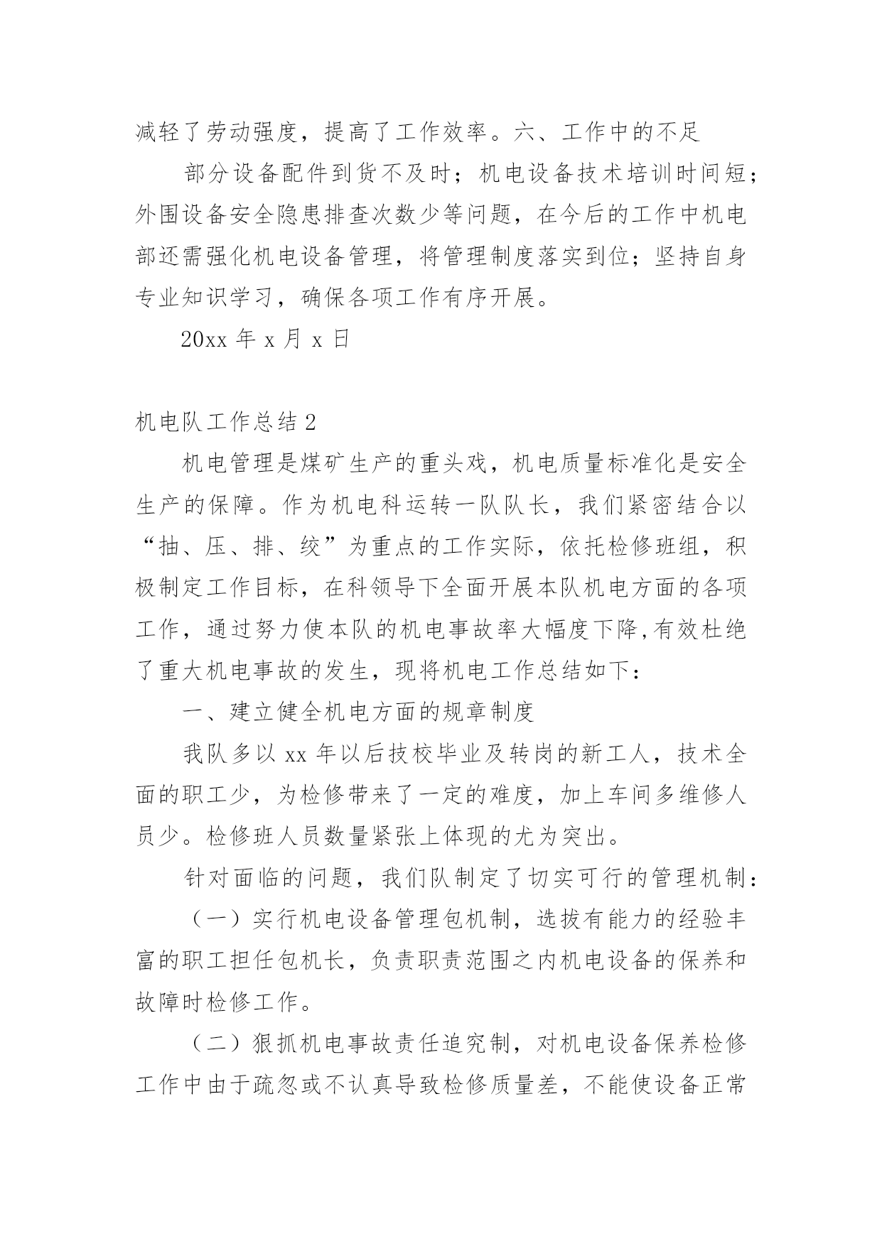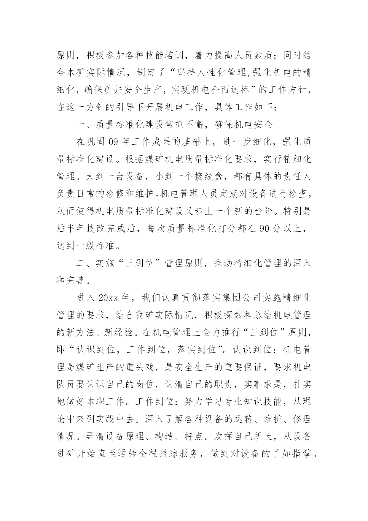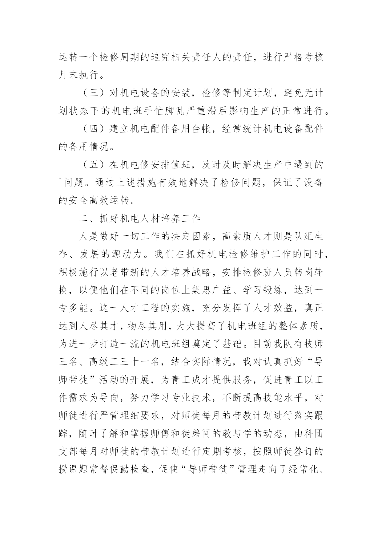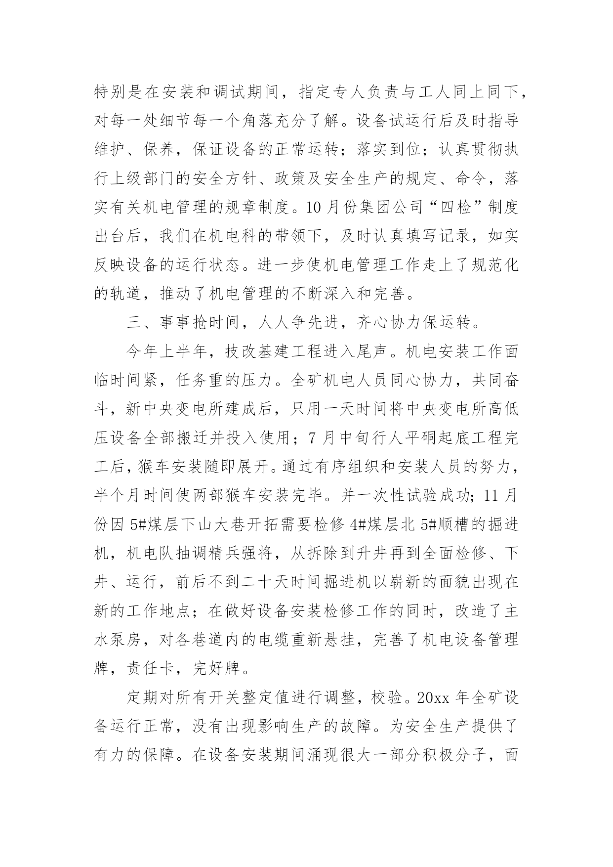 机电队工作总结总结是把一定阶段内的有关情况分析研究,做出有指导性结论的书面材料,它在我们的学习、工作中起到呈上启下的作用,为此我们要做好回顾,写好总结。那么你知道总结如何写吗?下面是小编收集整理的机电队工作总结,仅供参考,希望能够帮助到大家。机电队工作总结17月份已将过去,在这匆忙的31天里,机电设备未出现重大事故,圆满完成了公司下达的原煤生产任务。为更好地开展8月份机电管理工作,确保设备正常运转,现将7月份机电部工作情况总结如下:一、为杜绝和减少输送机运输设备事故,促进采煤队安全生产目标,结合采煤队胶带运输及、刮板输送机管理使用的现状,开展了胶带运输及、刮板运输机专项整治活动。二、强化了机电设备隐患排查整治力度,并实施隐患跟踪监管,对未及时整改落实和重复出现的隐患落实责任,并进行了通报。三、完成了@@@工作面进、回两巷排水设施的安装、试调和运行,并对两巷的供电系统进行了调整。四、邀请了组合开关厂家进行回访,并组织技术、维修、操作等相关人员进行了针对性的技术培训。五、报批了电缆故障探伤仪,节约了寻找故障的时间,减轻了劳动强度,提高了工作效率。六、工作中的不足部分设备配件到货不及时;机电设备技术培训时间短;外围设备安全隐患排查次数少等问题,在今后的工作中机电部还需强化机电设备管理,将管理制度落实到位;坚持自身专业知识学习,确保各项工作有序开展。20xx年x月x日机电队工作总结2机电管理是煤矿生产的重头戏,机电质量标准化是安全生产的保障。作为机电科运转一队队长,我们紧密结合以“抽、压、排、绞”为重点的工作实际,依托检修班组,积极制定工作目标,在科领导下全面开展本队机电方面的各项工作,通过努力使本队的机电事故率大幅度下降,有效杜绝了重大机电事故的发生,现将机电工作总结如下:一、建立健全机电方面的规章制度我队多以xx年以后技校毕业及转岗的新工人,技术全面的职工少,为检修带来了一定的难度,加上车间多维修人员少。检修班人员数量紧张上体现的尤为突出。针对面临的问题,我们队制定了切实可行的管理机制:(一)实行机电设备管理包机制,选拔有能力的经验丰富的职工担任包机长,负责职责范围之内机电设备的保养和故障时检修工作。(二)狠抓机电事故责任追究制,对机电设备保养检修工作中由于疏忽或不认真导致检修质量差,不能使设备正常运转一个检修周期的追究相关责任人的责任,进行严格考核月末执行。(三)对机电设备的安装,检修等制定计划,避免无计划状态下的机电班手忙脚乱严重滞后影响生产的正常进行。(四)建立机电配件备用台帐,经常统计机电设备配件的备用情况。(五)在机电修安排值班,及时及时解决生产中遇到的`问题。通过上述措施有效地解决了检修问题,保证了设备的安全高效运转。二、抓好机电人材培养工作人是做好一切工作的决定因素,高素质人才则是队组生存、发展的源动力。我们在抓好机电检修维护工作的同时,积极施行以老带新的人才培养战略,安排检修班人员转岗轮换,以便他们在不同的岗位上集思广益、学习锻练,达到一专多能。这一人才工程的实施,充分发挥了人才效益,真正达到人尽其才,物尽其用,大大提高了机电班组的整体素质,为进一步打造一流的机电班组奠定了基础。目前我队有技师三名、高级工三十一名,结合实际情况,我对认真抓好“导师带徒”活动的开展,为青工成才提供服务,促进青工以工作需求为导向,努力学习专业技术,不断提高技能水平,对师徒进行严管理细要求,对师徒每月的带教计划进行落实跟踪,随时了解和掌握师傅和徒弟间的教与学的动态,由科团支部每月对师徒的带教计划进行定期考核,按照师徒签订的授课题常督促勤检查,促使“导师带徒”管理走向了经常化、正规化。每月评选优秀青年标兵,进行奖惩兑现,有效地促进了青工学习的主动性和热情,推动了新工艺、新技术的推广和应用,有效地提高了检修质量和效率。三、搞好机电质量标准化工作在机电质量标准化实施中,大到一台设备的安装摆放,一根电缆的悬挂;小到一只照明灯的安装,一副电缆勾的吊挂,都要求专人负责;对主副井绞车、五台压风机、两台抽风机、五台主排水泵、35千伏变电所每一台控制柜都进行编号管理,经常检查设备的完好情况,不允许有丝毫的马虎。要求检修班组精心操作,认真维护,保证设备正常运转,经常保持车间窗明几亮、设备无灰尘、照明灯干净整洁。针对质量标准化工作,设立奖惩制度,让每位员工随时随地地都能认真工作,把质量标准化工作融入到日常管理的每个环节,使该项工作做到持之以恒,长抓不懈,在“不变”中求“变”,在细微之处见精神。我们矿是一个新矿,质量标准化基础还很薄弱,“欠帐”较多,和其他兄弟矿相比,我们还有很大的差距,还存在许多缺点和不足之处,但是我们坚信,只要我们奋勇直追、善于思考、敢于创新,一步一个脚印地干好每一项工作,把质量标准化工作深入持久的开展下去,做到持之以恒,常抓常新,一定能