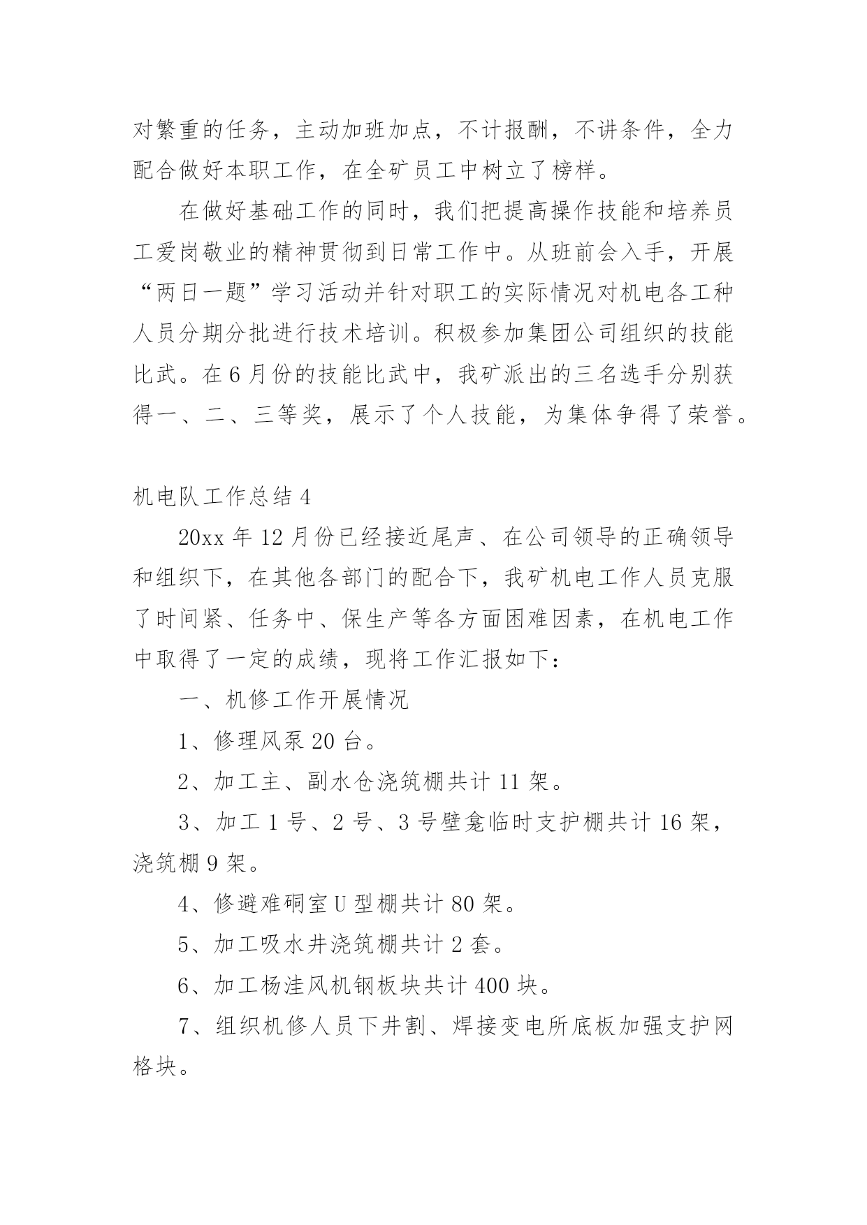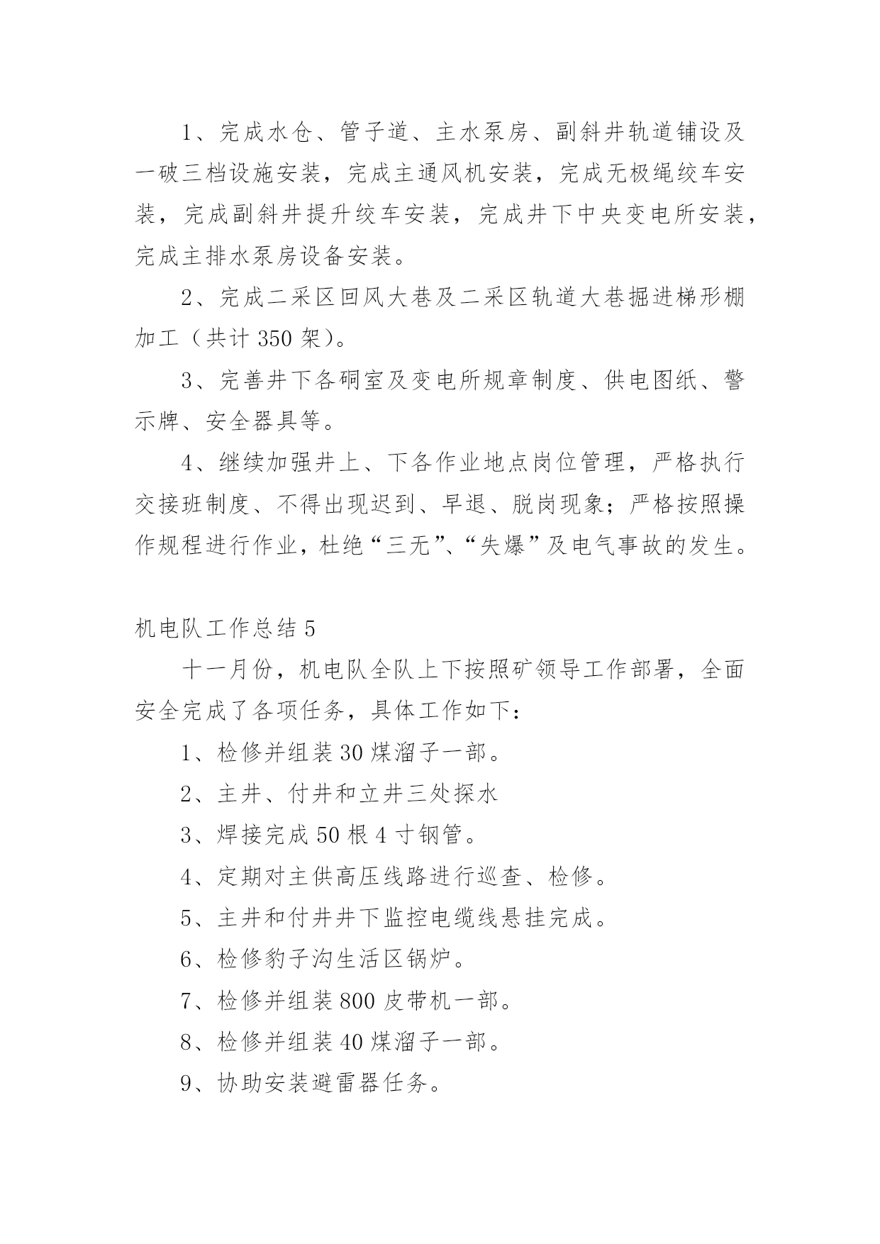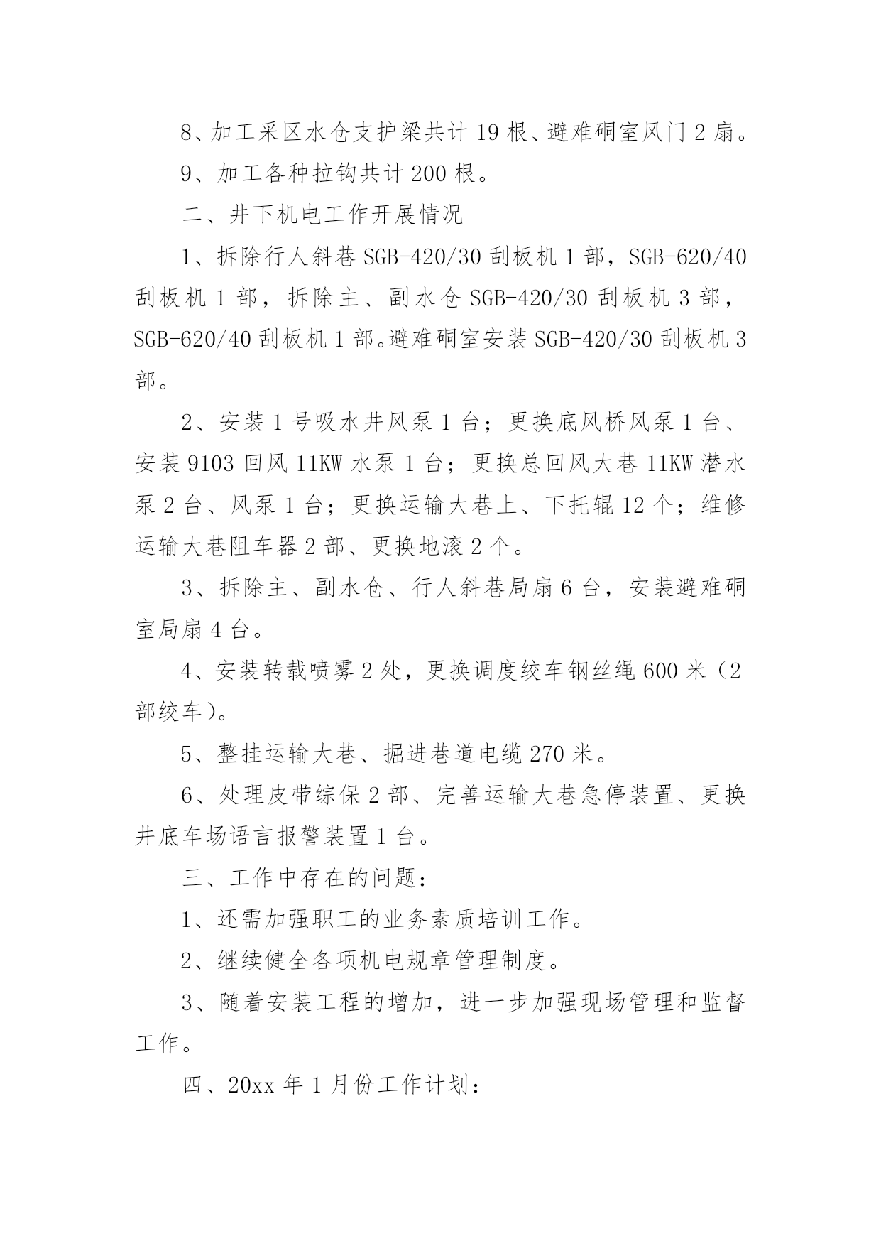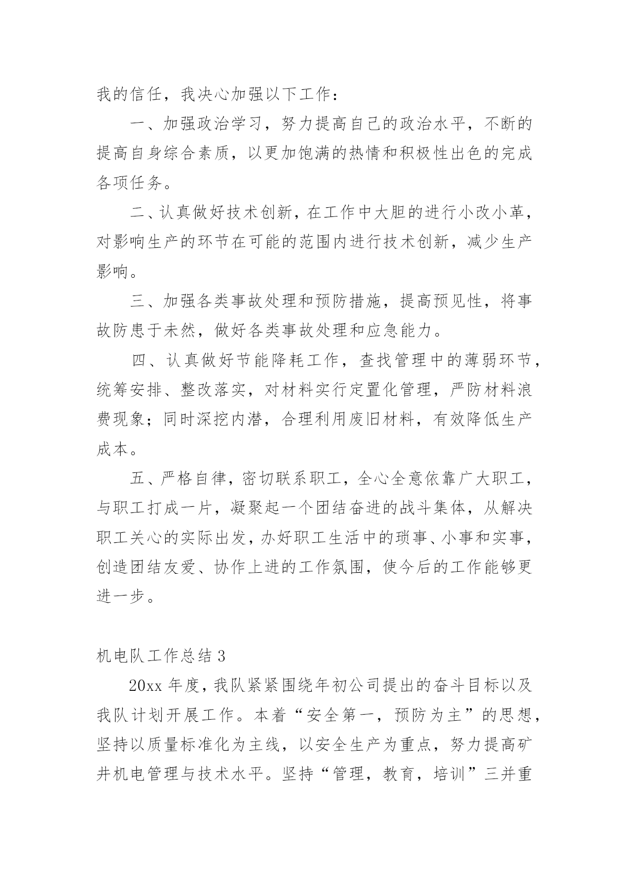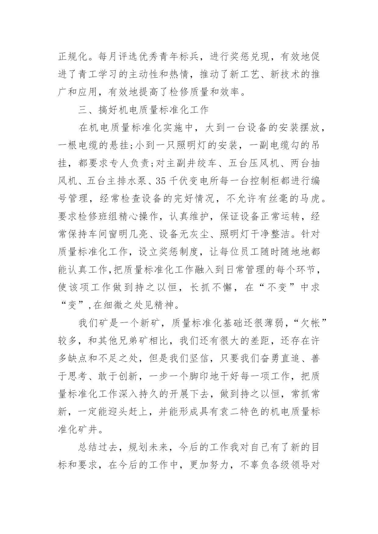 机电队工作总结总结是把一定阶段内的有关情况分析研究,做出有指导性结论的书面材料,它在我们的学习、工作中起到呈上启下的作用,为此我们要做好回顾,写好总结。那么你知道总结如何写吗?下面是小编收集整理的机电队工作总结,仅供参考,希望能够帮助到大家。机电队工作总结17月份已将过去,在这匆忙的31天里,机电设备未出现重大事故,圆满完成了公司下达的原煤生产任务。为更好地开展8月份机电管理工作,确保设备正常运转,现将7月份机电部工作情况总结如下:一、为杜绝和减少输送机运输设备事故,促进采煤队安全生产目标,结合采煤队胶带运输及、刮板输送机管理使用的现状,开展了胶带运输及、刮板运输机专项整治活动。二、强化了机电设备隐患排查整治力度,并实施隐患跟踪监管,对未及时整改落实和重复出现的隐患落实责任,并进行了通报。三、完成了@@@工作面进、回两巷排水设施的安装、试调和运行,并对两巷的供电系统进行了调整。四、邀请了组合开关厂家进行回访,并组织技术、维修、操作等相关人员进行了针对性的技术培训。五、报批了电缆故障探伤仪,节约了寻找故障的时间,减轻了劳动强度,提高了工作效率。六、工作中的不足部分设备配件到货不及时;机电设备技术培训时间短;外围设备安全隐患排查次数少等问题,在今后的工作中机电部还需强化机电设备管理,将管理制度落实到位;坚持自身专业知识学习,确保各项工作有序开展。20xx年x月x日机电队工作总结2机电管理是煤矿生产的重头戏,机电质量标准化是安全生产的保障。作为机电科运转一队队长,我们紧密结合以“抽、压、排、绞”为重点的工作实际,依托检修班组,积极制定工作目标,在科领导下全面开展本队机电方面的各项工作,通过努力使本队的机电事故率大幅度下降,有效杜绝了重大机电事故的发生,现将机电工作总结如下:一、建立健全机电方面的规章制度我队多以xx年以后技校毕业及转岗的新工人,技术全面的职工少,为检修带来了一定的难度,加上车间多维修人员少。检修班人员数量紧张上体现的尤为突出。针对面临的问题,我们队制定了切实可行的管理机制:(一)实行机电设备管理包机制,选拔有能力的经验丰富的职工担任包机长,负责职责范围之内机电设备的保养和故障时检修工作。(二)狠抓机电事故责任追究制,对机电设备保养检修工作中由于疏忽或不认真导致检修质量差,不能使设备正常运转一个检修周期的追究相关责任人的责任,进行严格考核月末执行。(三)对机电设备的安装,检修等制定计划,避免无计划状态下的机电班手忙脚乱严重滞后影响生产的正常进行。(四)建立机电配件备用台帐,经常统计机电设备配件的备用情况。(五)在机电修安排值班,及时及时解决生产中遇到的`问题。通过上述措施有效地解决了检修问题,保证了设备的安全高效运转。二、抓好机电人材培养工作人是做好一切工作的决定因素,高素质人才则是队组生存、发展的源动力。我们在抓好机电检修维护工作的同时,积极施行以老带新的人才培养战略,安排检修班人员转岗轮换,以便他们在不同的岗位上集思广益、学习锻练,达到一专多能。这一人才工程的实施,充分发挥了人才效益,真正达到人尽其才,物尽其用,大大提高了机电班组的整体素质,为进一步打造一流的机电班组奠定了基础。目前我队有技师三名、高级工三十一名,结合实际情况,我对认真抓好“导师带徒”活动的开展,为青工成才提供服务,促进青工以工作需求为导向,努力学习专业技术,不断提高技能水平,对师徒进行严管理细要求,对师徒每月的带教计划进行落实跟踪,随时了解和掌握师傅和徒弟间的教与学的动态,由科团支部每月对师徒的带教计划进行定期考核,按照师徒签订的授课题常督促勤检查,促使“导师带徒”管理走向了经常化、正规化。每月评选优秀青年标兵,进行奖惩兑现,有效地促进了青工学习的主动性和热情,推动了新工艺、新技术的推广和应用,有效地提高了检修质量和效率。三、搞好机电质量标准化工作在机电质量标准化实施中,大到一台设备的安装摆放,一根电缆的悬挂;小到一只照明灯的安装,一副电缆勾的吊挂,都要求专人负责;对主副井绞车、五台压风机、两台抽风机、五台主排水泵、35千伏变电所每一台控制柜都进行编号管理,经常检查设备的完好情况,不允许有丝毫的马虎。要求检修班组精心操作,认真维护,保证设备正常运转,经常保持车间窗明几亮、设备无灰尘、照明灯干净整洁。针对质量标准化工作,设立奖惩制度,让每位员工随时随地地都能认真工作,把质量标准化工作融入到日常管理的每个环节,使该项工作做到持之以恒,长抓不懈,在“不变”中求“变”,在细微之处见精神。我们矿是一个新矿,质量标准化基础还很薄弱,“欠帐”较多,和其他兄弟矿相比,我们还有很大的差距,还存在许多缺点和不足之处,但是我们坚信,只要我们奋勇直追、善于思考、敢于创新,一步一个脚印地干好每一项工作,把质量标准化工作深入持久的开展下去,做到持之以恒,常抓常新,一定能