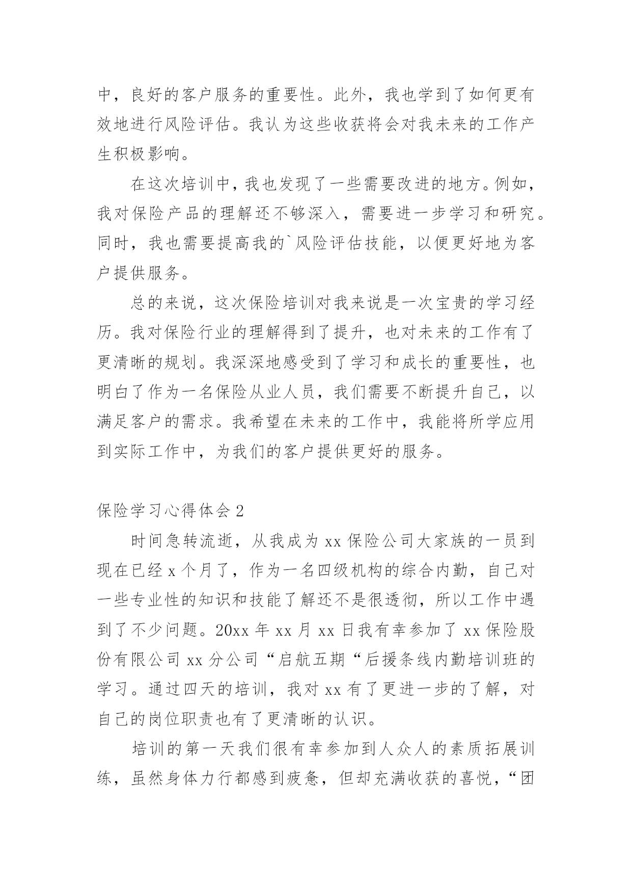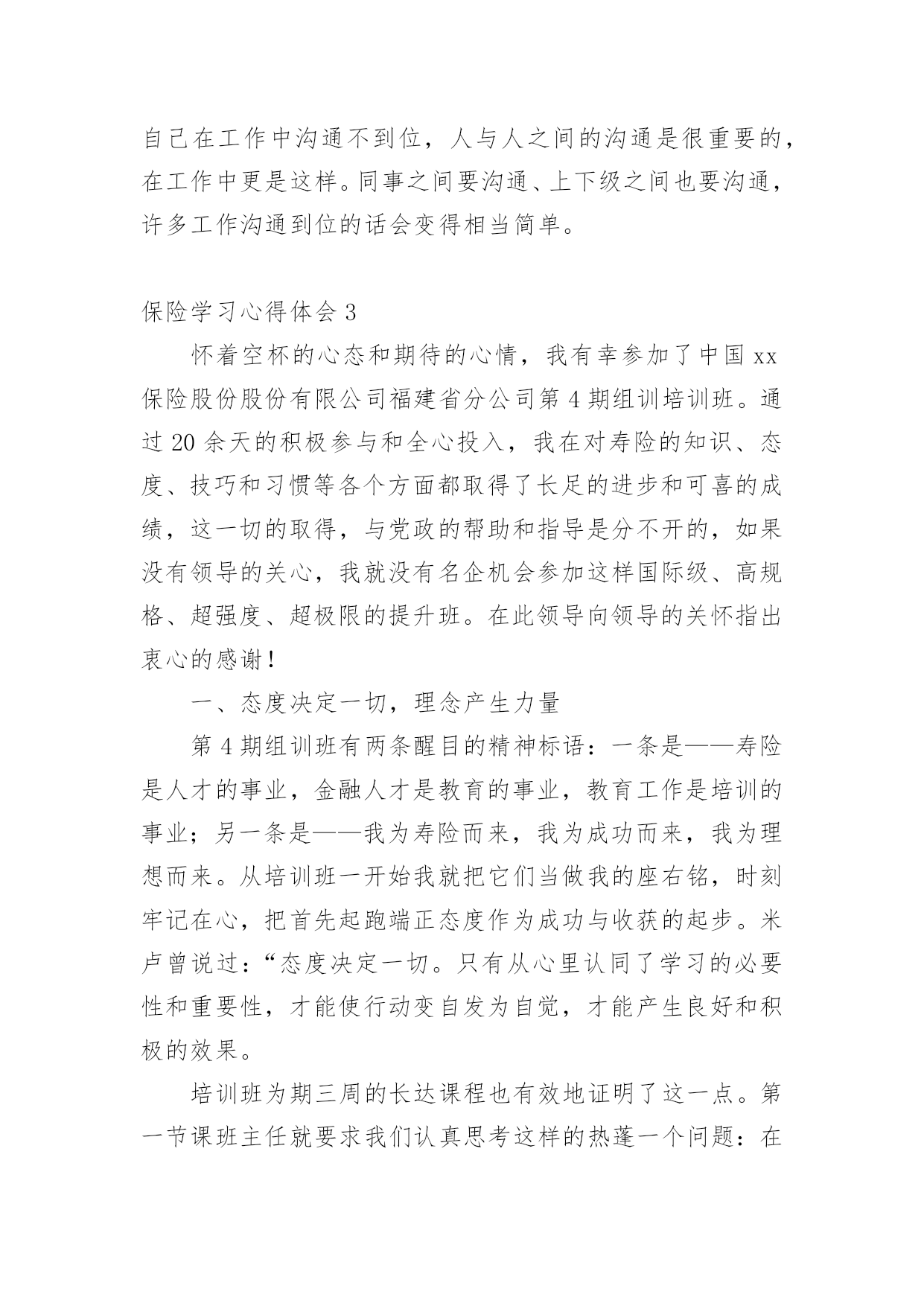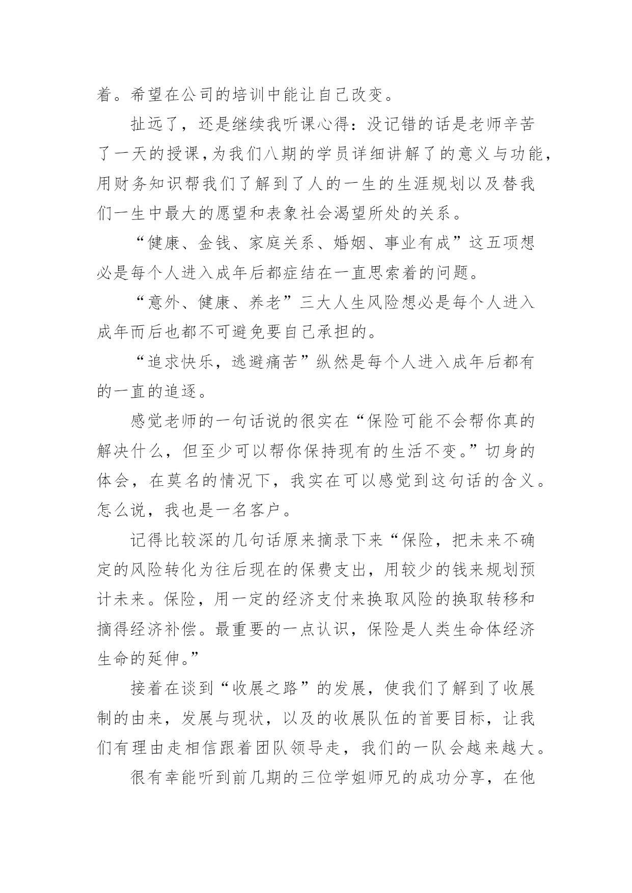 保险学习心得体会(必备)保险学习心得体会当我们对人生或者事物有了新的思考时,可以寻思将其写进心得体会中,如此就可以提升我们写作能力了。应该怎么写才合适呢?以下是小编帮大家整理的保险学习心得体会,供大家参考借鉴,希望可以帮助到有需要的朋友。保险学习心得体会1我很高兴能与大家分享我最近参加的保险培训的一些核心收获和感悟。这次的培训由我所在的公司组织,为期两周,地点在我们的总部。培训的主要目标是帮助我们更好地理解保险行业的最新动态,提升我们的专业技能,以及强化我们的服务理念。这次培训的内容涵盖了保险行业的各个方面,包括保险产品的设计、销售策略、风险评估,以及客户服务。我们通过讲座、小组讨论和实战演练等多种方式进行学习。讲座由公司的高级领导和行业专家主讲,他们深入浅出的讲解让我们对保险行业有了更深入的理解。小组讨论则让我们有机会分享自己的经验和观点,也使我们了解到其他团队的工作方式。实战演练则帮助我们在实际情况下应用我们所学的知识。在这次培训中,我最大的收获是对保险产品的设计和销售策略有了更深入的理解。同时,我也意识到了在保险行业中,良好的客户服务的重要性。此外,我也学到了如何更有效地进行风险评估。我认为这些收获将会对我未来的工作产生积极影响。在这次培训中,我也发现了一些需要改进的地方。例如,我对保险产品的理解还不够深入,需要进一步学习和研究。同时,我也需要提高我的`风险评估技能,以便更好地为客户提供服务。总的来说,这次保险培训对我来说是一次宝贵的学习经历。我对保险行业的理解得到了提升,也对未来的工作有了更清晰的规划。我深深地感受到了学习和成长的重要性,也明白了作为一名保险从业人员,我们需要不断提升自己,以满足客户的需求。我希望在未来的工作中,我能将所学应用到实际工作中,为我们的客户提供更好的服务。保险学习心得体会2时间急转流逝,从我成为xx保险公司大家族的一员到现在已经x个月了,作为一名四级机构的综合内勤,自己对一些专业性的知识和技能了解还不是很透彻,所以工作中遇到了不少问题。20xx年xx月xx日我有幸参加了xx保险股份有限公司xx分公司“启航五期“后援条线内勤培训班的学习。通过四天的培训,我对xx有了更进一步的了解,对自己的岗位职责也有了更清晰的认识。培训的第一天我们很有幸参加到人众人的素质拓展训练,虽然身体力行都感到疲惫,但却充满收获的喜悦,“团队、协作、沟通、勇气”,这些往常挂到嘴边的,今天都得到了实实在在体现。参加的每一个游戏,都是小组成员智慧的结晶,从极速六十秒到鼓动人心,从七巧板到惊险倒计时,每一项都是所有成员决策、分工与决心的`努力。一天半的拓展训练告诉我们一些道理:1、团队的成功,不一定取决于某一个人,而取决于团队的向心力和协作以及相互的鼓励和加油,否则即便这个人的能力再高,也会遭到必然的失败,每一个人的个人成功,并不能代表一个团体的成功,而团体的失败,则一定是每一个人的失败。2、在工作和生活中会遇到很多事情,不要老是去抱怨事情太多,每做一件事情要注意时间上的衔接,从而有效地提高工作的效率。3、言胜于行,想到和得到中间还有两个字就是做到。4、在工作和生活中要关注积极向上的事物,俗话说:你的注意力在哪里,你的舞台就在哪里。在工作和生活中,如果你的关注点放在积极向上的事情上面,那么你的生活将充满阳光;如果你只会一味的抱怨,那么你将生活在无尽的黑暗中,发现不了任何美的事物。生活中不是缺少美,而是缺少发现美的眼睛。第二天的培训由总经理室各条线的分管总对整个公司的一个系统讲解。通过学习,我对整个公司有了一个更深更全面的了解,也加深了我作为一个太保人的荣誉感。各条线分管总也与我们分享了一些人生感悟,他们的不凡的经历、拼搏奋斗的精神更值得我们努力学习。我们要以创业者的激情投入到工作中,为自己开辟一番天地。通过学习我意识到自己在工作中沟通不到位,人与人之间的沟通是很重要的,在工作中更是这样。同事之间要沟通、上下级之间也要沟通,许多工作沟通到位的话会变得相当简单。保险学习心得体会3怀着空杯的心态和期待的心情,我有幸参加了中国xx保险股份股份有限公司福建省分公司第4期组训培训班。通过20余天的积极参与和全心投入,我在对寿险的知识、态度、技巧和习惯等各个方面都取得了长足的进步和可喜的成绩,这一切的取得,与党政的帮助和指导是分不开的,如果没有领导的关心,我就没有名企机会参加这样国际级、高规格、超强度、超极限的提升班。在此领导向领导的关怀指出衷心的感谢!一、态度决定一切,理念产生力量第4期组训班有两条醒目的精神标语:一条是——寿险是人才的事业,金融人才是教育的事业,教育工作是培训的事业;另一条是——我为寿险而来,我为成功而来,我为理想而来。从培训班一开始我就把它们当做我的座右铭,时刻牢记在心,把首先起跑端正态度作为成功与收获的起步。米卢