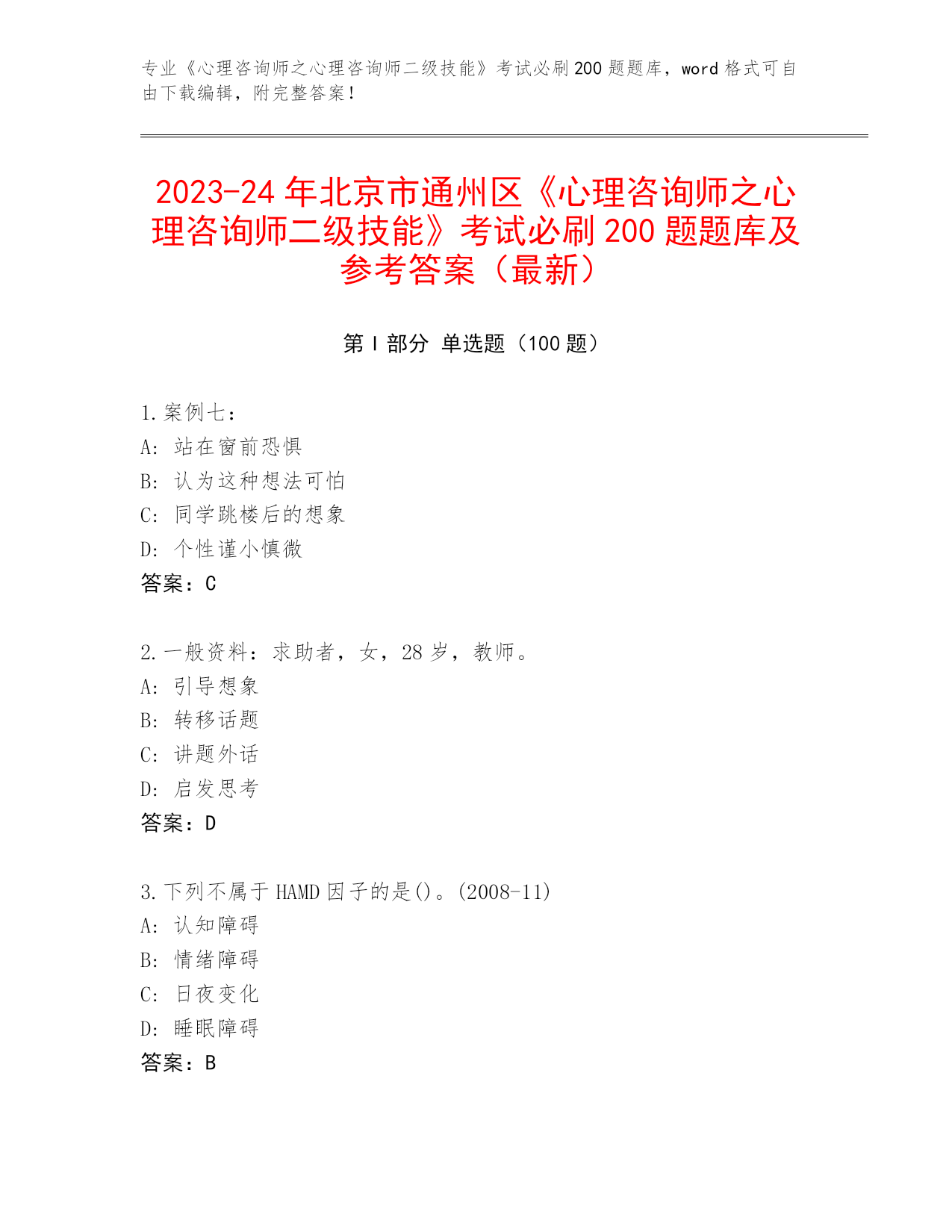 2023-24年北京市通州区《心理咨询师之心理咨询师二级技能》考试必刷200题题库及参考答案(最新)