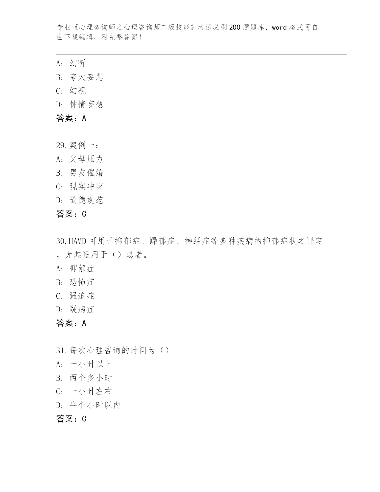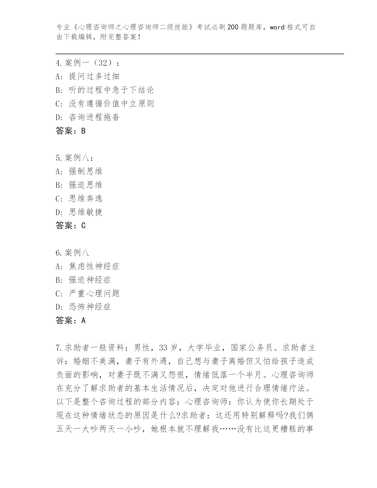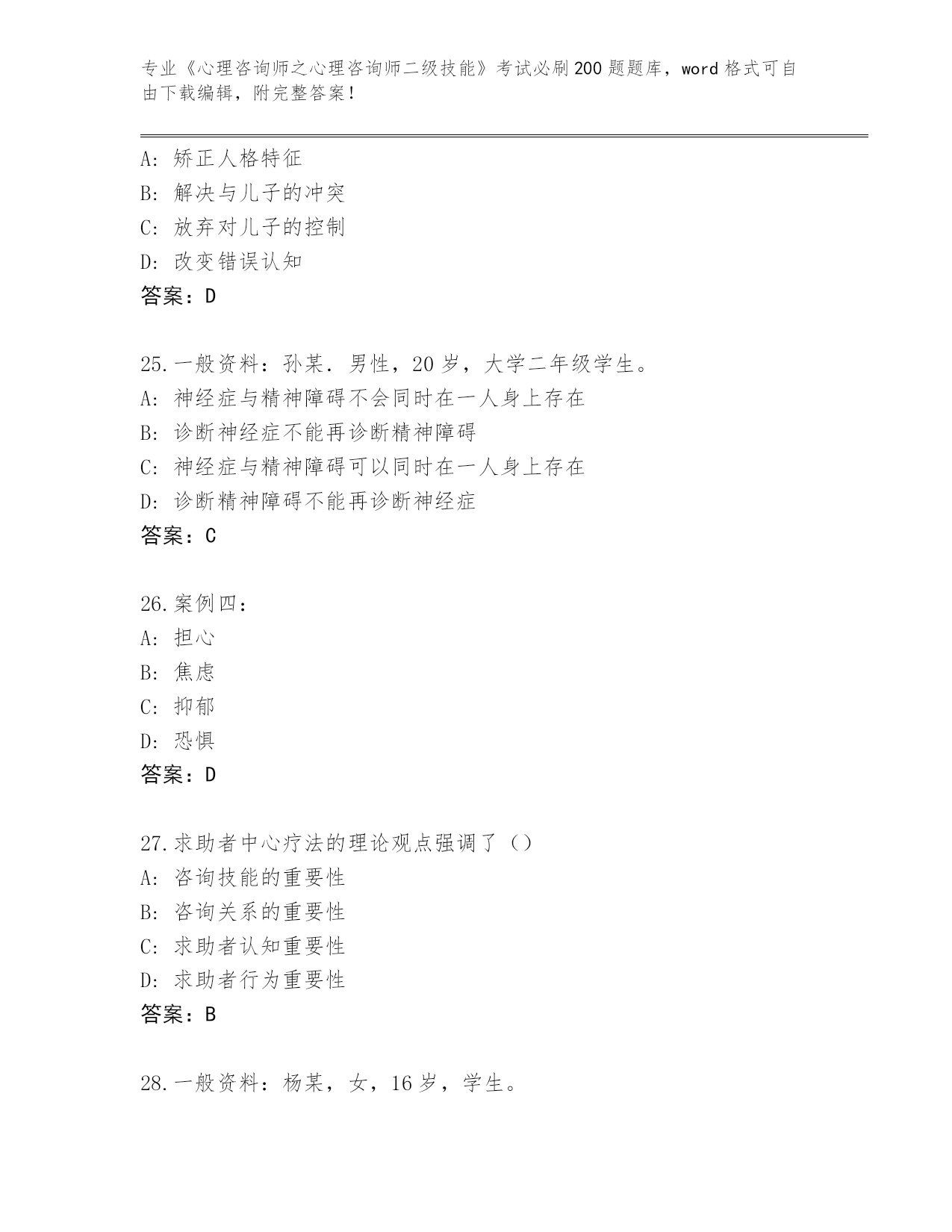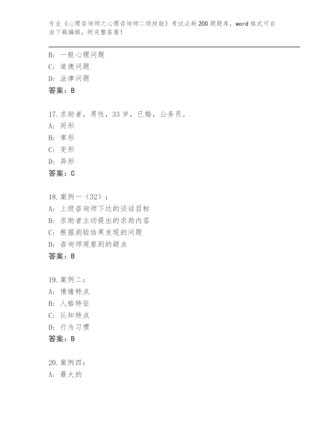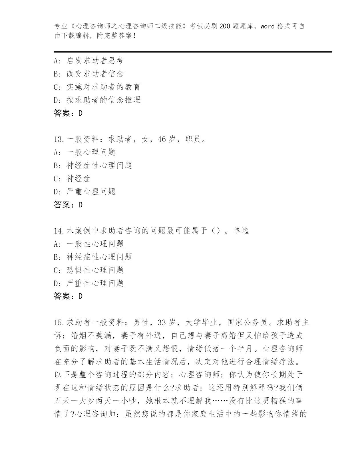 内部使用北京市通州区《心理咨询师之心理咨询师二级技能》资格考试必刷200题完整题库及答案【考点梳理】