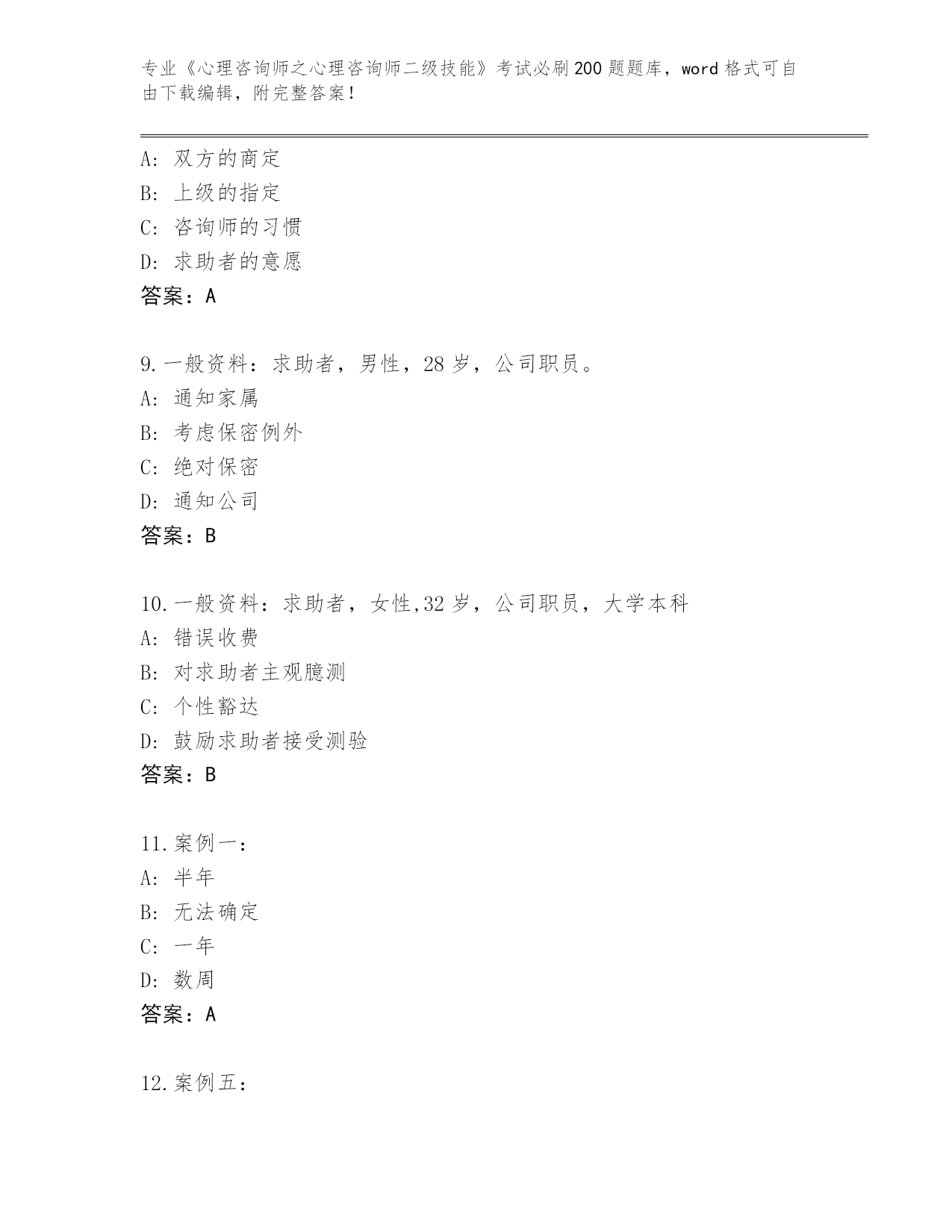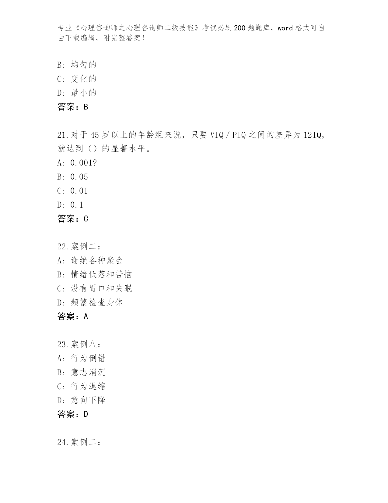 甘肃省2024《心理咨询师之心理咨询师二级技能》考试必刷200题题库及参考答案(最新)