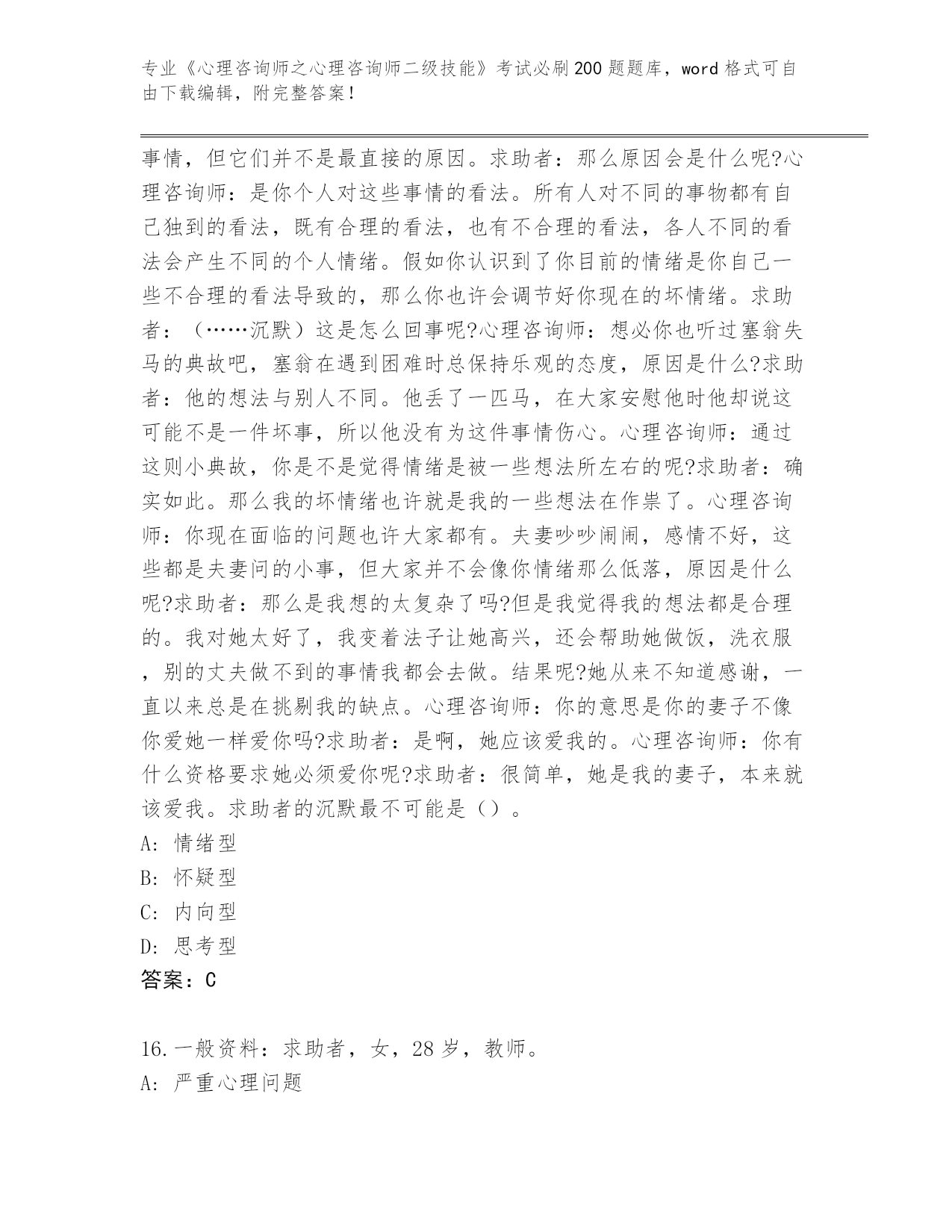 2024年北京市通州区《心理咨询师之心理咨询师二级技能》资格考试必刷200题真题题库含答案【模拟题】