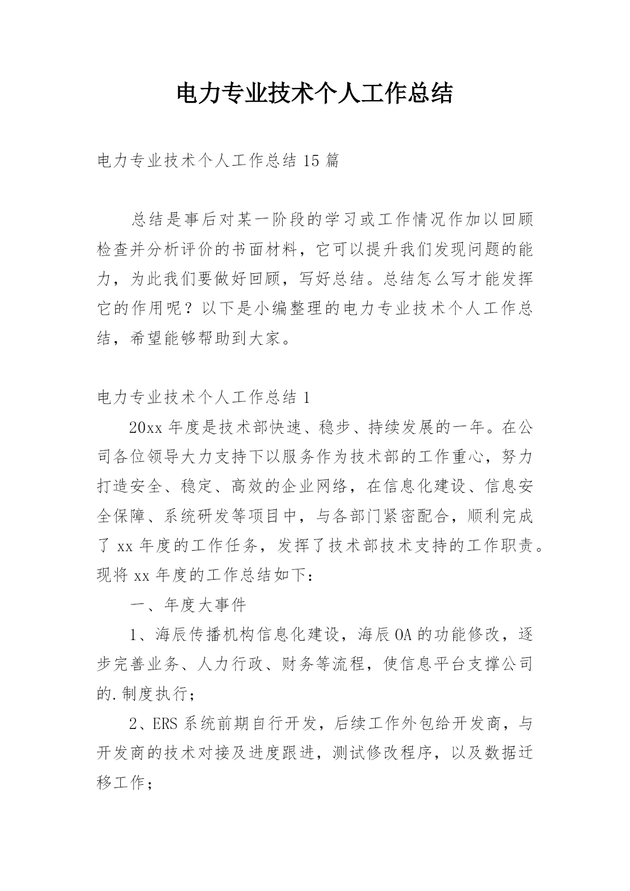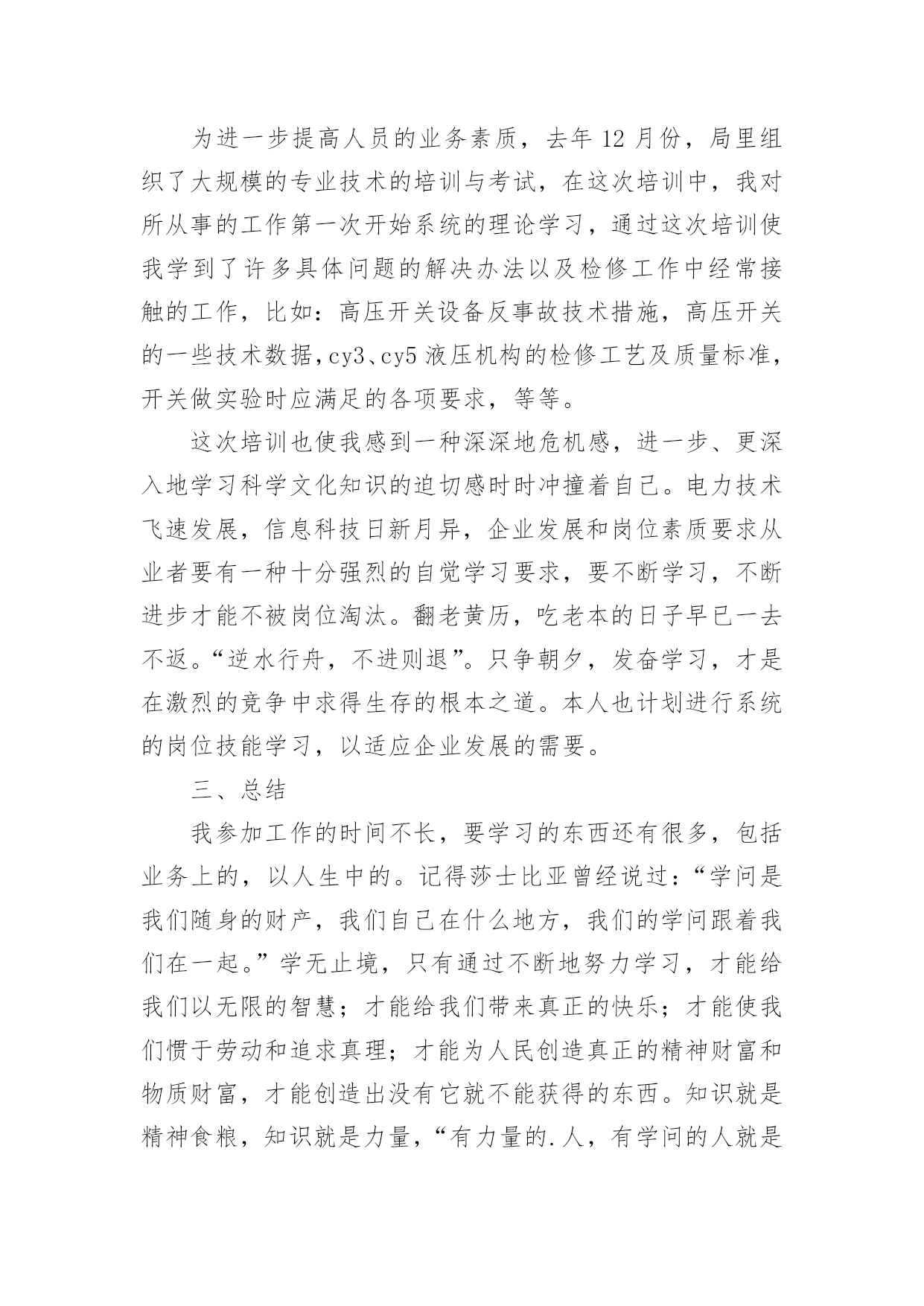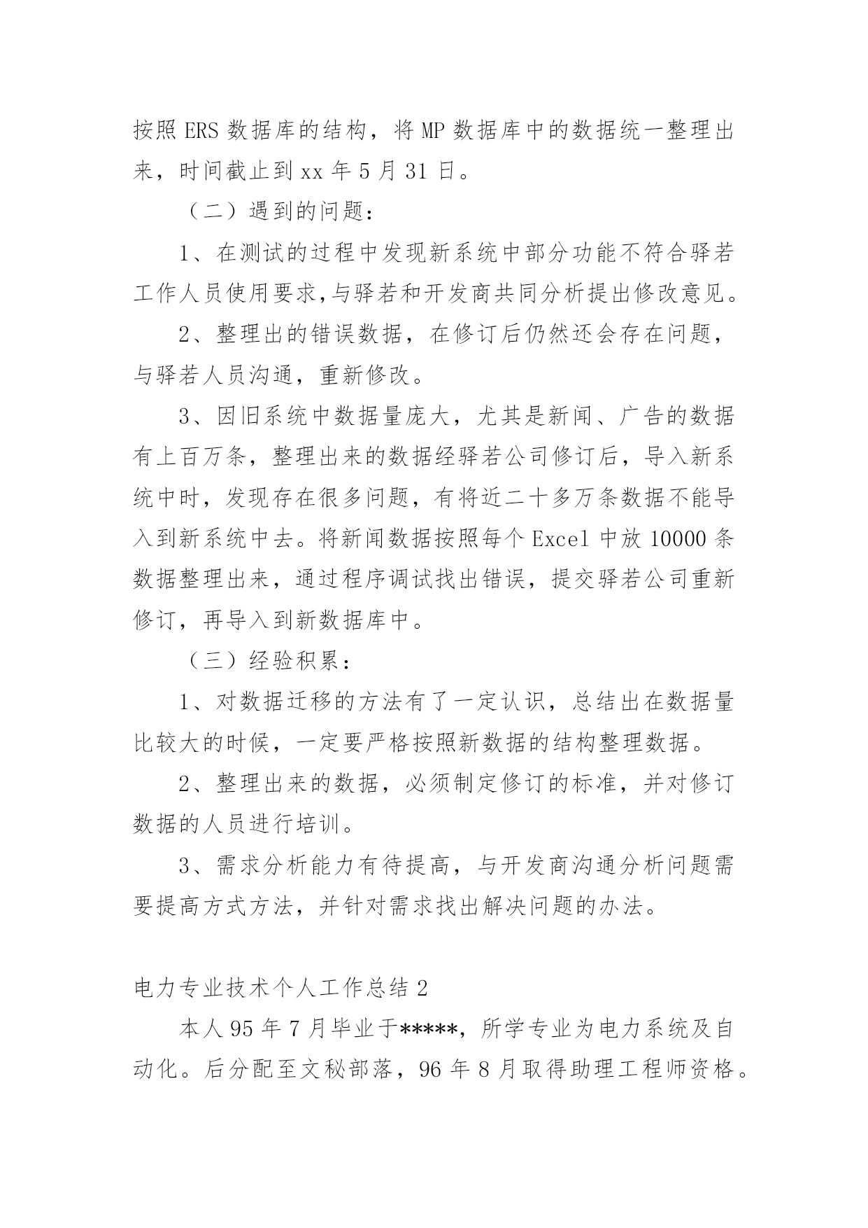 电力专业技术个人工作总结电力专业技术个人工作总结15篇总结是事后对某一阶段的学习或工作情况作加以回顾检查并分析评价的书面材料,它可以提升我们发现问题的能力,为此我们要做好回顾,写好总结。总结怎么写才能发挥它的作用呢?以下是小编整理的电力专业技术个人工作总结,希望能够帮助到大家。电力专业技术个人工作总结120xx年度是技术部快速、稳步、持续发展的一年。在公司各位领导大力支持下以服务作为技术部的工作重心,努力打造安全、稳定、高效的企业网络,在信息化建设、信息安全保障、系统研发等项目中,与各部门紧密配合,顺利完成了xx年度的工作任务,发挥了技术部技术支持的工作职责。现将xx年度的工作总结如下:一、年度大事件1、海辰传播机构信息化建设,海辰OA的功能修改,逐步完善业务、人力行政、财务等流程,使信息平台支撑公司的.制度执行;2、ERS系统前期自行开发,后续工作外包给开发商,与开发商的技术对接及进度跟进,测试修改程序,以及数据迁移工作;3、MOSS系统解决方案的定制,并根据海辰自身特性,做出规划实施方案和实施周期,计划将OA个别功能集成开发至MOSS中;4、配合公司的种子计划提供技术支持;5、海辰机房高温预警解决方案;6、保障总部、分支机构网络安全运维,突发事件的及时响应恢复;7、上海分公司办公地址搬迁,网络、电话综合布线规划及工程实施;8、企业域名续费及备案工作;9、部门人员流动,做好人员及时补充,避免工作衔接疏漏可能造成的工作停滞;10、协助公司制作绿色办公宣传报,协调海辰十周年庆活动筹备工作。二、开发组工作(一)ERS系统开发工作:1、发布开发商修改的ERS程序并进行测试,将错误整理成文档,提交给开发商继续修改,循序渐进地进行这些工作。2、不断跟进开发商修改的进度,向领导汇报工作情况。3、分析ERS数据库和MP数据库,并整理数据库中各个数据表的结构表。4、开发程序迁移的程序,并不断完善和改进程序。5、分析ERS数据库和MP数据库中各个表之间的关系,按照ERS数据库的结构,将MP数据库中的数据统一整理出来,时间截止到xx年5月31日。(二)遇到的问题:1、在测试的过程中发现新系统中部分功能不符合驿若工作人员使用要求,与驿若和开发商共同分析提出修改意见。2、整理出的错误数据,在修订后仍然还会存在问题,与驿若人员沟通,重新修改。3、因旧系统中数据量庞大,尤其是新闻、广告的数据有上百万条,整理出来的数据经驿若公司修订后,导入新系统中时,发现存在很多问题,有将近二十多万条数据不能导入到新系统中去。将新闻数据按照每个Excel中放10000条数据整理出来,通过程序调试找出错误,提交驿若公司重新修订,再导入到新数据库中。(三)经验积累:1、对数据迁移的方法有了一定认识,总结出在数据量比较大的时候,一定要严格按照新数据的结构整理数据。2、整理出来的数据,必须制定修订的标准,并对修订数据的人员进行培训。3、需求分析能力有待提高,与开发商沟通分析问题需要提高方式方法,并针对需求找出解决问题的办法。电力专业技术个人工作总结2本人95年7月毕业于*****,所学专业为电力系统及自动化。后分配至文秘部落,96年8月取得助理工程师资格。几年来在身边师傅同事及领导的帮助下做了一些专业技术工作,请看下文电力专业技术个人年终工作总结。一、继电保护定值整定工作(10kv及以下)96年9月至97年担负分公司10kv配电线路(含电容器)、10kv用户站继电保护定值整定工作,由于分公司原来没有整定人员,但自从开展工作以来建立了继电保护整定档案资料,如系统阻抗表、分线路阻抗图、系统站定值单汇总(分线路)用户站定值单汇总(分线路),并将定值单用微机打印以规范管理,还包括各重新整定定值的计算依据和计算过程,形成较为完善的定值整定计算的管理资料。未出现误整定现象,且通过对系统短路容量的'计算为配电线路开关等设备的选择提供了依据。97年底由于机构设置变化,指导初级技术人员开展定值整定工作并顺利完成工作交接。二、线损专业管理工作96年至98年9月,作为分公司线损专责人主要开展了以下工作:完成了线损统计计算的微机化工作,应用线损计算统计程序输入表码,自动生成线损报表,并对母线平衡加以分析,主持完成理论线损计算工作,利用理论线损计算程序,准备线损参数图,编制线损拓补网络节点,输入微机,完成35kv、10kv线路理论线损计算工作,为线损分析、降损技术措施的采用提供了理论依据,编制“xx”降损规划,96-98各年度降损实施计划,月度、季度、年度的线损分析,积极采取技术措施降低线损,完成贯庄、大毕庄等35kv站10kv电容器投入工作,完成迂回线路、过负荷、供电半径大、小导线等线路的切改、改造工作,98年关于无功降损节电的论文获市电力企协论文三等奖,荣获市电力公司线损管理工作第二名。三、电网规