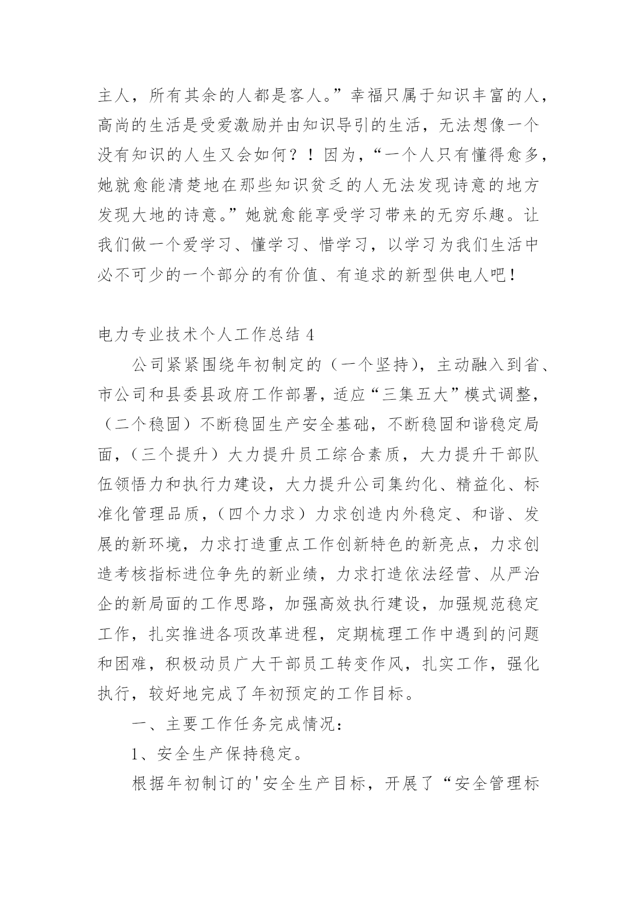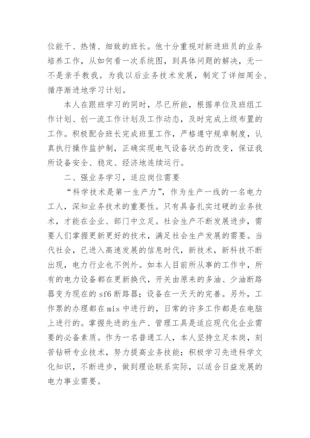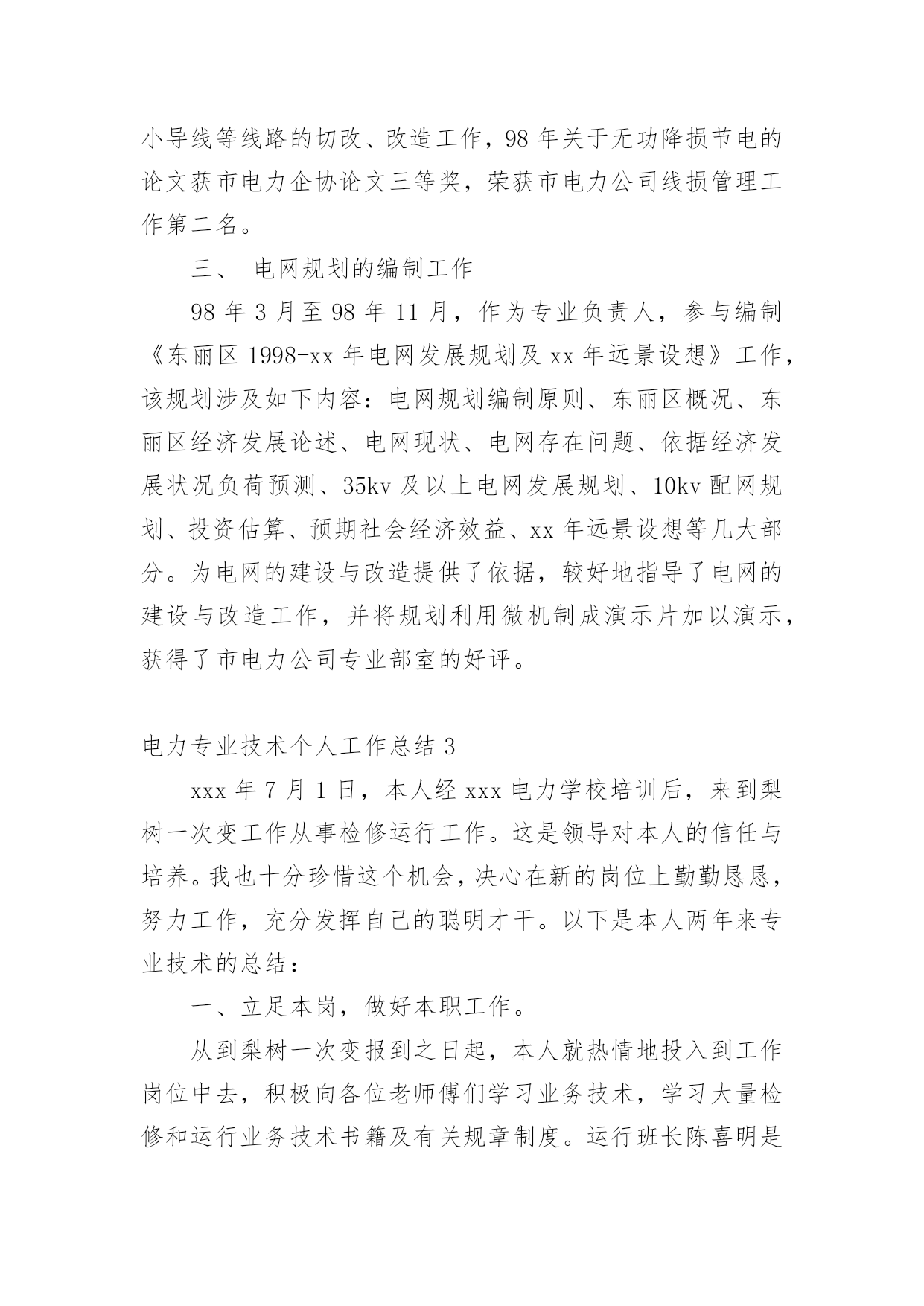 电力专业技术个人工作总结电力专业技术个人工作总结15篇总结是事后对某一阶段的学习或工作情况作加以回顾检查并分析评价的书面材料,它可以提升我们发现问题的能力,为此我们要做好回顾,写好总结。总结怎么写才能发挥它的作用呢?以下是小编整理的电力专业技术个人工作总结,希望能够帮助到大家。电力专业技术个人工作总结120xx年度是技术部快速、稳步、持续发展的一年。在公司各位领导大力支持下以服务作为技术部的工作重心,努力打造安全、稳定、高效的企业网络,在信息化建设、信息安全保障、系统研发等项目中,与各部门紧密配合,顺利完成了xx年度的工作任务,发挥了技术部技术支持的工作职责。现将xx年度的工作总结如下:一、年度大事件1、海辰传播机构信息化建设,海辰OA的功能修改,逐步完善业务、人力行政、财务等流程,使信息平台支撑公司的.制度执行;2、ERS系统前期自行开发,后续工作外包给开发商,与开发商的技术对接及进度跟进,测试修改程序,以及数据迁移工作;3、MOSS系统解决方案的定制,并根据海辰自身特性,做出规划实施方案和实施周期,计划将OA个别功能集成开发至MOSS中;4、配合公司的种子计划提供技术支持;5、海辰机房高温预警解决方案;6、保障总部、分支机构网络安全运维,突发事件的及时响应恢复;7、上海分公司办公地址搬迁,网络、电话综合布线规划及工程实施;8、企业域名续费及备案工作;9、部门人员流动,做好人员及时补充,避免工作衔接疏漏可能造成的工作停滞;10、协助公司制作绿色办公宣传报,协调海辰十周年庆活动筹备工作。二、开发组工作(一)ERS系统开发工作:1、发布开发商修改的ERS程序并进行测试,将错误整理成文档,提交给开发商继续修改,循序渐进地进行这些工作。2、不断跟进开发商修改的进度,向领导汇报工作情况。3、分析ERS数据库和MP数据库,并整理数据库中各个数据表的结构表。4、开发程序迁移的程序,并不断完善和改进程序。5、分析ERS数据库和MP数据库中各个表之间的关系,按照ERS数据库的结构,将MP数据库中的数据统一整理出来,时间截止到xx年5月31日。(二)遇到的问题:1、在测试的过程中发现新系统中部分功能不符合驿若工作人员使用要求,与驿若和开发商共同分析提出修改意见。2、整理出的错误数据,在修订后仍然还会存在问题,与驿若人员沟通,重新修改。3、因旧系统中数据量庞大,尤其是新闻、广告的数据有上百万条,整理出来的数据经驿若公司修订后,导入新系统中时,发现存在很多问题,有将近二十多万条数据不能导入到新系统中去。将新闻数据按照每个Excel中放10000条数据整理出来,通过程序调试找出错误,提交驿若公司重新修订,再导入到新数据库中。(三)经验积累:1、对数据迁移的方法有了一定认识,总结出在数据量比较大的时候,一定要严格按照新数据的结构整理数据。2、整理出来的数据,必须制定修订的标准,并对修订数据的人员进行培训。3、需求分析能力有待提高,与开发商沟通分析问题需要提高方式方法,并针对需求找出解决问题的办法。电力专业技术个人工作总结2本人95年7月毕业于*****,所学专业为电力系统及自动化。后分配至文秘部落,96年8月取得助理工程师资格。几年来在身边师傅同事及领导的帮助下做了一些专业技术工作,请看下文电力专业技术个人年终工作总结。一、继电保护定值整定工作(10kv及以下)96年9月至97年担负分公司10kv配电线路(含电容器)、10kv用户站继电保护定值整定工作,由于分公司原来没有整定人员,但自从开展工作以来建立了继电保护整定档案资料,如系统阻抗表、分线路阻抗图、系统站定值单汇总(分线路)用户站定值单汇总(分线路),并将定值单用微机打印以规范管理,还包括各重新整定定值的计算依据和计算过程,形成较为完善的定值整定计算的管理资料。未出现误整定现象,且通过对系统短路容量的'计算为配电线路开关等设备的选择提供了依据。97年底由于机构设置变化,指导初级技术人员开展定值整定工作并顺利完成工作交接。二、线损专业管理工作96年至98年9月,作为分公司线损专责人主要开展了以下工作:完成了线损统计计算的微机化工作,应用线损计算统计程序输入表码,自动生成线损报表,并对母线平衡加以分析,主持完成理论线损计算工作,利用理论线损计算程序,准备线损参数图,编制线损拓补网络节点,输入微机,完成35kv、10kv线路理论线损计算工作,为线损分析、降损技术措施的采用提供了理论依据,编制“xx”降损规划,96-98各年度降损实施计划,月度、季度、年度的线损分析,积极采取技术措施降低线损,完成贯庄、大毕庄等35kv站10kv电容器投入工作,完成迂回线路、过负荷、供电半径大、小导线等线路的切改、改造工作,98年关于无功降损节电的论文获市电力企协论文三等奖,荣获市电力公司线损管理工作第二名。三、电网规