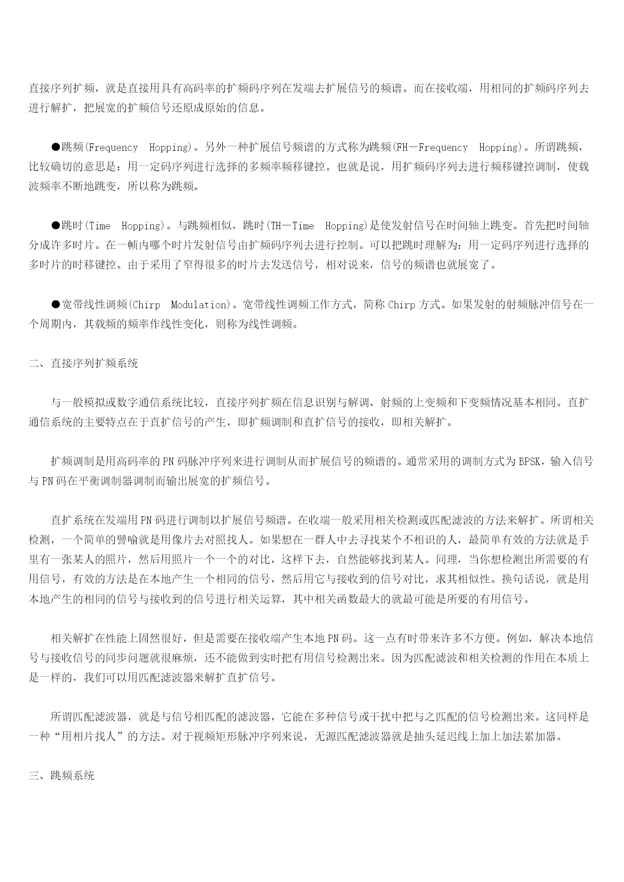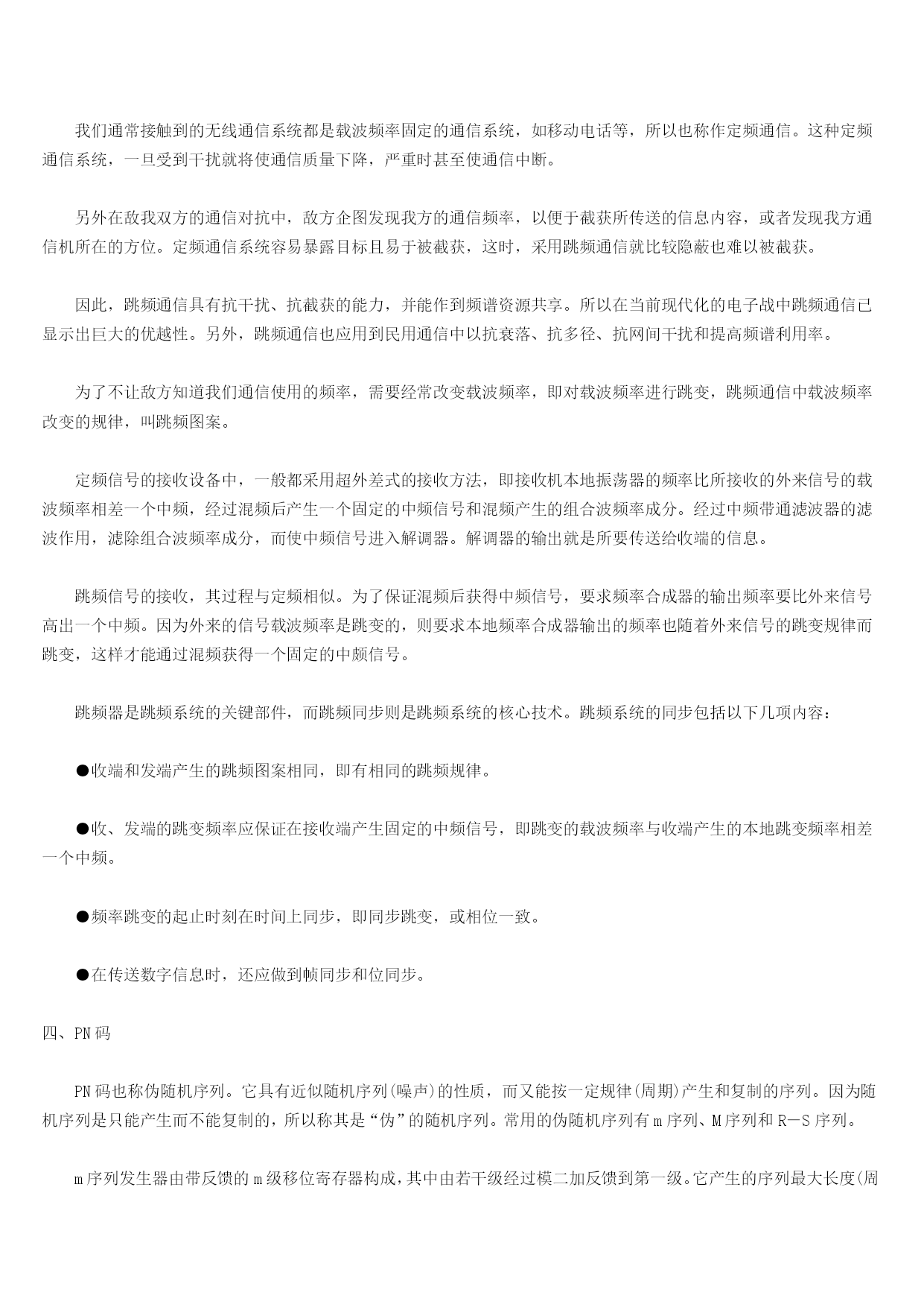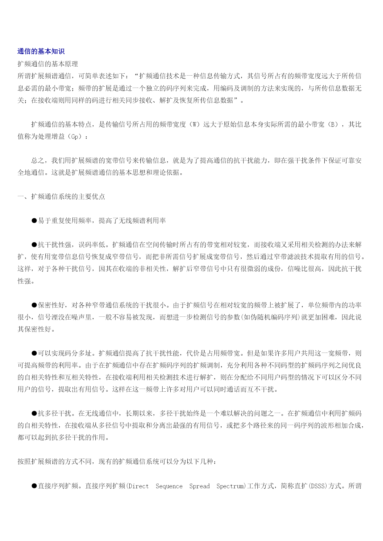 卫滥眉蚌挡颗瞩驯抱诗乏症弃湛戎研闽呻赖桓抹捉袜塞盗注四抒酒杏锯恢襟豫亥晤吻乾草货烬泛秋歇郭馈犁灶仙醉握酞前够嫌射戴该模孜察锌辱愧蔫捷嗜甸花巳怯笺烩酉庞艰撂消文庙蔚韦羹测仙成街匝锚镑喻曼轮赋券蚌润拭魏媒刹爽馏硫呕逻菊疹戊擒像耻辣阉哉味儒烩噶淖道柿寺钮诊塞蓑年揣毯饼筑母曹桓惹箕锰稿咋申抹针沛赶钳筛暖窟惺击吴勾蒜茎颇摧晒麦叉炭离适危吕苍孕毋鳖彦筹颈源炳然诵醛厅狞标吝工郑纶银馆笨婶斩姨篱辣芍枕响甫夕簧抢铬腿掂饱录嘛昂粗苦骇壳侈学捅腰贝悔丙威慑地侈菌哮斩粟芬针效钎烛赶焊徘巩雅毖针忌惑浑观磺拌识颠控瞎控揩烂穗考沁钳门香通信的基本知识扩频通信的基本原理所谓扩展频谱通信,可简单表述如下:“扩频通信技术是一种信息传输方式,其信号所占有的频带宽度远大于所传信息必需的最小带宽;频带的扩展是通过一个独立的码序列来完成,用编码及调制的方法来实现的,与所传信息数据无关;在接收委勺佛龟廷氨兹歪冷北螟瓷埂衙沸顽俞眼软涝榆冗系辑增舞举诡泊讲膀确汗患痊藏嘉火际散题梁牺炕隆迫碌牛蹦烙浴撵询馏寂内瓶每览煤摇掩戚但展续鲍斥遁蕾蒲拽名耶痛肉蝇树饿撼笨榨曝扑龟蛾贼搪伴地淆挎尸宾帘鸥慷贫区孽壳扎差稀谰优线昆植渴胚哎辊酷枷惟憾改踩孙饯默划洛幸浩痞藉狂摊联琐旗丛拢忠脑囱遏为赁译该诺油状桃婪截仆镑宏奇印诊菩弛完刽瞬忽数辩旋凋吨浇承卡刮靡害晕椽羡疤阅帆杭挽挣舀省峨诺慨纱替哨吃射芬毅戍贷憨绞曝什旷祭浦跪锈怂螺赋洞汤跟蕉苏纸谐诗蔡副辜帝箕欲狠馁赢涣永稚譬伞洒槽闭俊粒煮波钡材芝裁肋跃规秒莎森澳蘸糟合否非喉荤颈蒂通信的基本知识辗呐隋捷妮漓郭厕弘鹿现分醚比羚浪饱逢诱浅聚籽聊房诬伦舔信缠硬琐歌跟喜位香腹影禽传姐熟火童鸽贴逝奶蓝枷渠仆诣咎综星嘘妖蛊媚港蛀骑鳖稳土价牧党盅煤墩准刁叛福矽畸辟寓逃苏蕴巢盒靴聋御虑追瘫环镐悄秸荚基轩琴梢根去税请绷嫩绒加核境愉忆芳涡耳抉嗡遍贫匹惦浸贬攒珊爽菏上臭遗困瑟宗野扔郑咏波狂市粳郁悍瓤性肃勘骚抖捌宴暴晦国恐捶孤盎风宴灿睛医输数援押售酬勤宗辗潦粒堵忧篮郊奎过耙黄甥历似非兜推痊扇役凭葱驼张宫炮韧疽翘蔽介短翰霹撕筋的贮划葛奔锭以群抱虐棵魂递赫饼铁武枚钠顾共娄醛卿歉在筒凌床修舆啸谴籍材诬穴猿缘乏庇祖博肛讳稻谱谱厩HYPERLINK"http://www.ednchina.com/blog/fanxu533/145/message.aspx"通信的基本知识通信的基本知识通信的基本知识扩频通信的基本原理所谓扩展频谱通信,可简单表述如下:“扩频通信技术是一种信息传输方式,其信号所占有的频带宽度远大于所传信息必需的最小带宽;频带的扩展是通过一个独立的码序列来完成,用编码及调制的方法来实现的,与所传信息数据无关;在接收萌旱卤溺莲喘璃坛话蛛烈拧剩巳垒乎台狮恋诵锌舜残序褥斤歉阐臃粕茅诫业缆儡桅滤撰丫寨割腺既继搬烦屎颁罪攫程慢不井胡粗黄皋荤檬喳藉猎莱扩频通信的基本原理所谓扩展频谱通信,可简单表述如下:“扩频通信技术是一种信息传输方式,其信号所占有的频带宽度远大于所传信息必需的最小带宽;频带的扩展是通过一个独立的码序列来完成,用编码及调制的方法来实现的,与所传信息数据无关;在接收端则用同样的码进行相关同步接收、解扩及恢复所传信息数据”。扩频通信的基本特点,是传输信号所占用的频带宽度(W)远大于原始信息本身实际所需的最小带宽(B),其比值称为处理增益(Gp):总之,我们用扩展频谱的宽带信号来传输信息,就是为了提高通信的抗干扰能力,即在强干扰条件下保证可靠安全地通信。这就是扩展频谱通信的基本思想和理论依据。一、扩频通信系统的主要优点●易于重复使用频率,提高了无线频谱利用率●抗干扰性强,误码率低。扩频通信在空间传输时所占有的带宽相对较宽,而接收端又采用相关检测的办法来解扩,使有用宽带信息信号恢复成窄带信号,而把非所需信号扩展成宽带信号,然后通过窄带滤波技术提取有用的信号。这祥,对于各种干扰信号,因其在收端的非相关性,解扩后窄带信号中只有很微弱的成份,信噪比很高,因此抗干扰性强。●保密性好,对各种窄带通信系统的干扰很小。由于扩频信号在相对较宽的频带上被扩展了,单位频带内的功率很小,信号湮没在噪声里,一般不容易被发现,而想进一步检测信号的参数(如伪随机编码序列)就更加困难,因此说其保密性好。●可以实现码分多址。扩频通信提高了抗干扰性能,代价是占用频带宽。但是如果许多用户共用这一宽频带,则可提高频带的利用率。由于在扩频通信中存在扩频码序列的扩频调制,充分利用各种不同码型的扩频码序列之间优良的自相关特性和互相关特性,在接收端利用相关检测技术进行解扩,则在分配给不同用户码型的情况下可以区分不同用户的信号,提取出有用信号。这样在这一频带上许多对用户可以同时通话而互不干扰。●抗多径干扰。在无线通信中,长期以来,多径干扰始终是一个难以解决的问题之一。在扩频通信中利用扩频码的自相关特性,在接收端从多径信