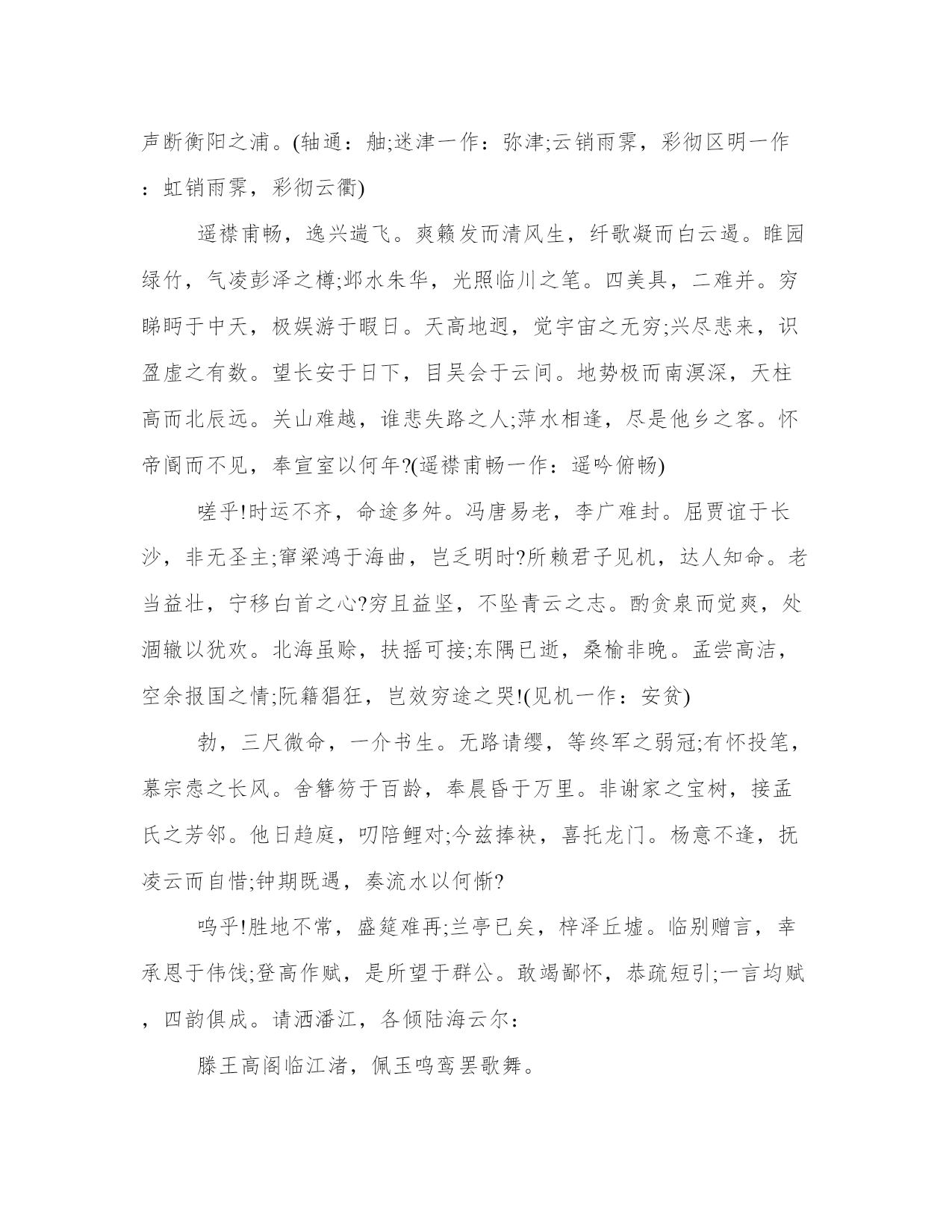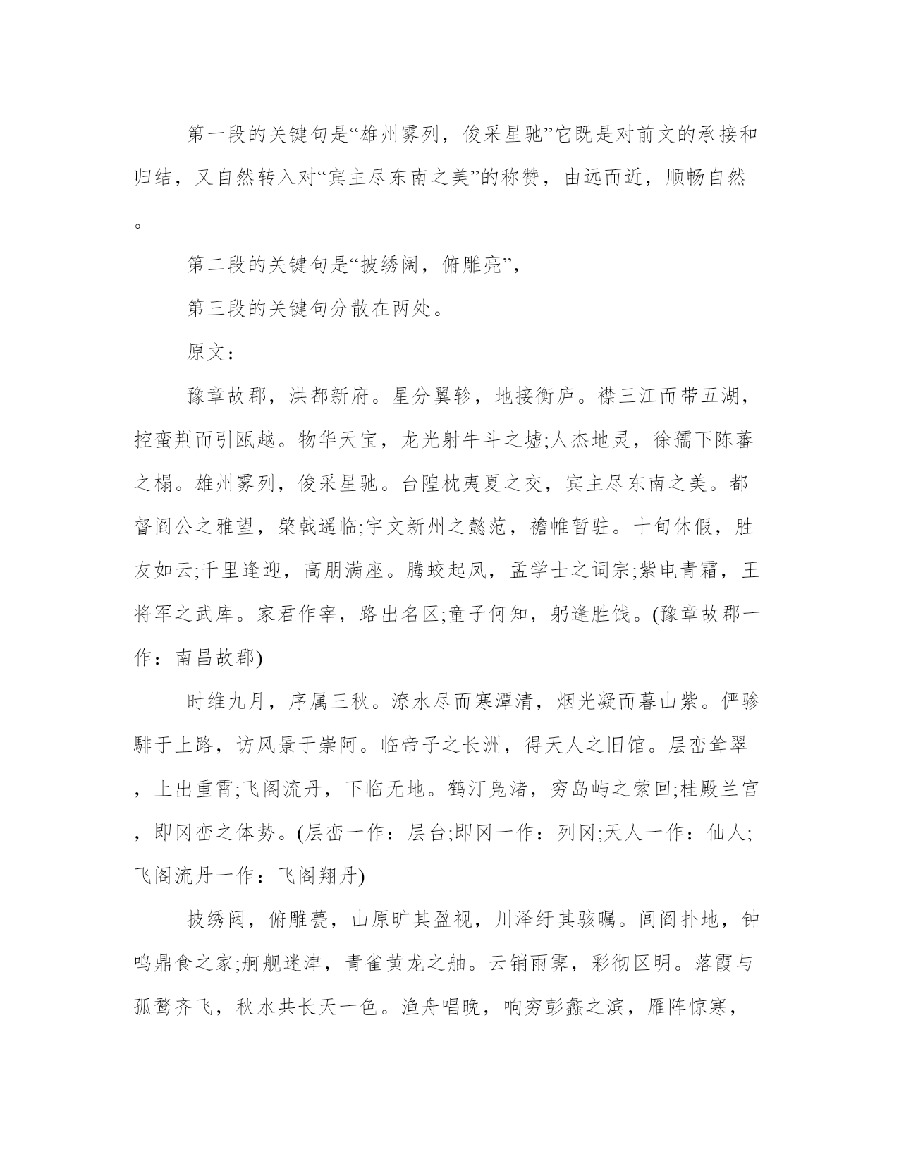 《滕王阁序》为何在文学史上享有盛名滕王阁序为何在文学史上享有盛名骈文是我国文学史上争议较大、影响较深的文体。王勃的滕王阁序无论内容还是形式,都代表骈文的最高成就。从内容上看,滕王阁序拓展了骈文的艺术境界。在艺术形式上滕王阁序接受了六朝抒情小赋的传统,又在骈赋的形式上加以散文化,达到了内容美与形式美的统一。自唐以来,骄文无论作为表达形式,还是作为一种文体,一直受到种种指责。有的人认为骄文是“宫廷文学”、“贵族文学”,“是一股逆流”;有的人认为“骄文本身具有不可克服的缺点”。对其在文学史上的地位,大都持否定的态度,这些看法值得商榷。骄文产生于魏晋,经南北朝的发展、繁荣直至唐初。“四杰”续六朝文学传统,屡有优秀作品,而王勃的滕王阁序无论内容还是形式,都代表骄文的最高成就。从内容上看,滕王阁序变流行的装演粉饰为抒写真情,脱离“宫廷文学”的樊笼,拓展了骄文的艺术境界。结构分析全文共四个段落:第一段叙事,是个引子;第二段基本上是写景;第三段基本上是抒情;第四段叙事,照应开头。文章的中心事件是滕王阁宴会,第一段的关键句是“雄州雾列,俊采星驰”它既是对前文的承接和归结,又自然转入对“宾主尽东南之美”的称赞,由远而近,顺畅自然。第二段的关键句是“披绣阔,俯雕亮”,第三段的关键句分散在两处。原文:豫章故郡,洪都新府。星分翼轸,地接衡庐。襟三江而带五湖,控蛮荆而引瓯越。物华天宝,龙光射牛斗之墟;人杰地灵,徐孺下陈蕃之榻。雄州雾列,俊采星驰。台隍枕夷夏之交,宾主尽东南之美。都督阎公之雅望,棨戟遥临;宇文新州之懿范,襜帷暂驻。十旬休假,胜友如云;千里逢迎,高朋满座。腾蛟起凤,孟学士之词宗;紫电青霜,王将军之武库。家君作宰,路出名区;童子何知,躬逢胜饯。(豫章故郡一作:南昌故郡)时维九月,序属三秋。潦水尽而寒潭清,烟光凝而暮山紫。俨骖騑于上路,访风景于崇阿。临帝子之长洲,得天人之旧馆。层峦耸翠,上出重霄;飞阁流丹,下临无地。鹤汀凫渚,穷岛屿之萦回;桂殿兰宫,即冈峦之体势。(层峦一作:层台;即冈一作:列冈;天人一作:仙人;飞阁流丹一作:飞阁翔丹)披绣闼,俯雕甍,山原旷其盈视,川泽纡其骇瞩。闾阎扑地,钟鸣鼎食之家;舸舰迷津,青雀黄龙之舳。云销雨霁,彩彻区明。落霞与孤鹜齐飞,秋水共长天一色。渔舟唱晚,响穷彭蠡之滨,雁阵惊寒,声断衡阳之浦。(轴通:舳;迷津一作:弥津;云销雨霁,彩彻区明一作:虹销雨霁,彩彻云衢)遥襟甫畅,逸兴遄飞。爽籁发而清风生,纤歌凝而白云遏。睢园绿竹,气凌彭泽之樽;邺水朱华,光照临川之笔。四美具,二难并。穷睇眄于中天,极娱游于暇日。天高地迥,觉宇宙之无穷;兴尽悲来,识盈虚之有数。望长安于日下,目吴会于云间。地势极而南溟深,天柱高而北辰远。关山难越,谁悲失路之人;萍水相逢,尽是他乡之客。怀帝阍而不见,奉宣室以何年?(遥襟甫畅一作:遥吟俯畅)嗟乎!时运不齐,命途多舛。冯唐易老,李广难封。屈贾谊于长沙,非无圣主;窜梁鸿于海曲,岂乏明时?所赖君子见机,达人知命。老当益壮,宁移白首之心?穷且益坚,不坠青云之志。酌贪泉而觉爽,处涸辙以犹欢。北海虽赊,扶摇可接;东隅已逝,桑榆非晚。孟尝高洁,空余报国之情;阮籍猖狂,岂效穷途之哭!(见机一作:安贫)勃,三尺微命,一介书生。无路请缨,等终军之弱冠;有怀投笔,慕宗悫之长风。舍簪笏于百龄,奉晨昏于万里。非谢家之宝树,接孟氏之芳邻。他日趋庭,叨陪鲤对;今兹捧袂,喜托龙门。杨意不逢,抚凌云而自惜;钟期既遇,奏流水以何惭?呜乎!胜地不常,盛筵难再;兰亭已矣,梓泽丘墟。临别赠言,幸承恩于伟饯;登高作赋,是所望于群公。敢竭鄙怀,恭疏短引;一言均赋,四韵俱成。请洒潘江,各倾陆海云尔:滕王高阁临江渚,佩玉鸣鸾罢歌舞。画栋朝飞南浦云,珠帘暮卷西山雨。闲云潭影日悠悠,物换星移几度秋。阁中帝子今何在?槛外长江空自流。