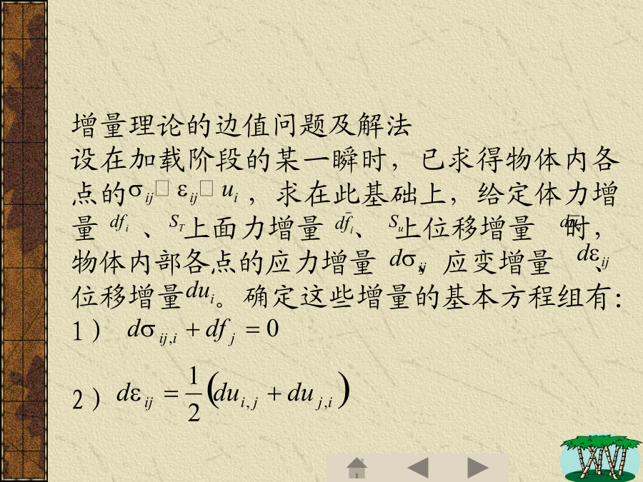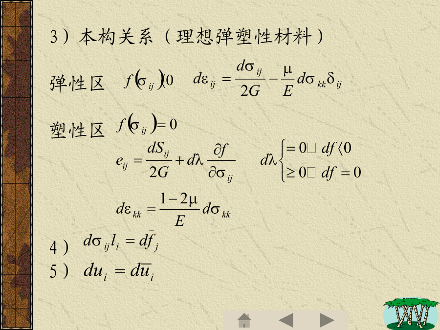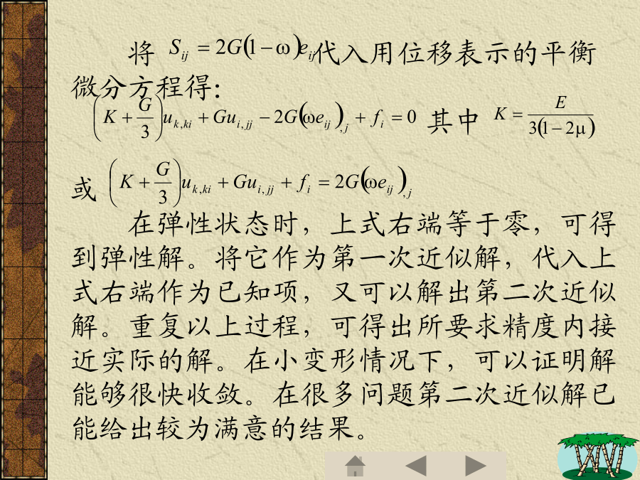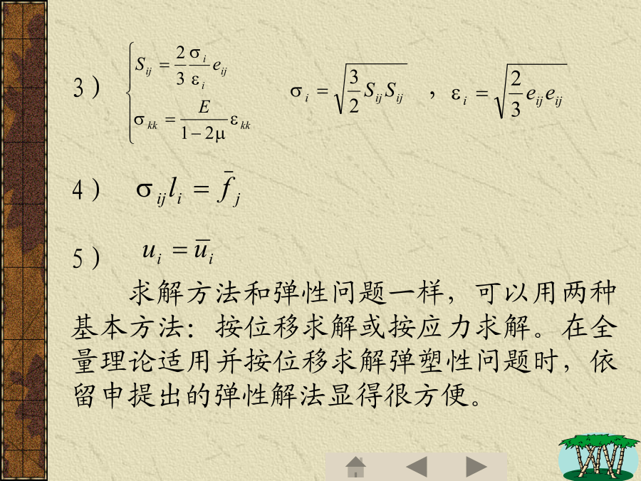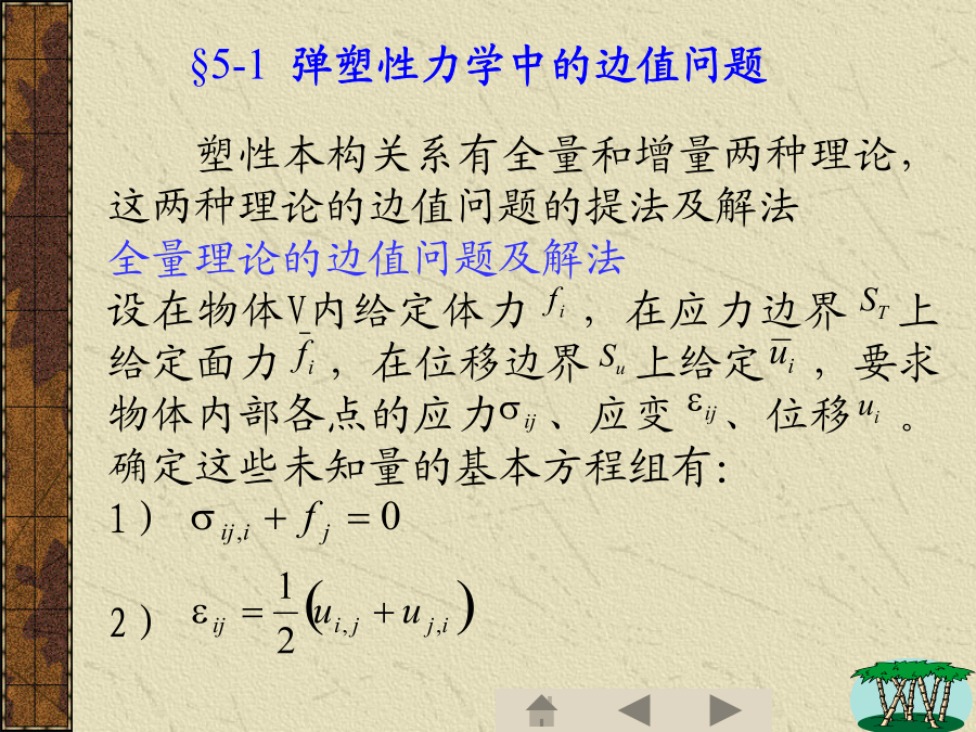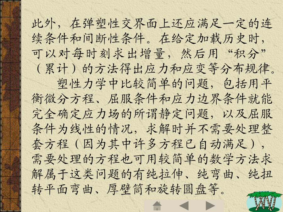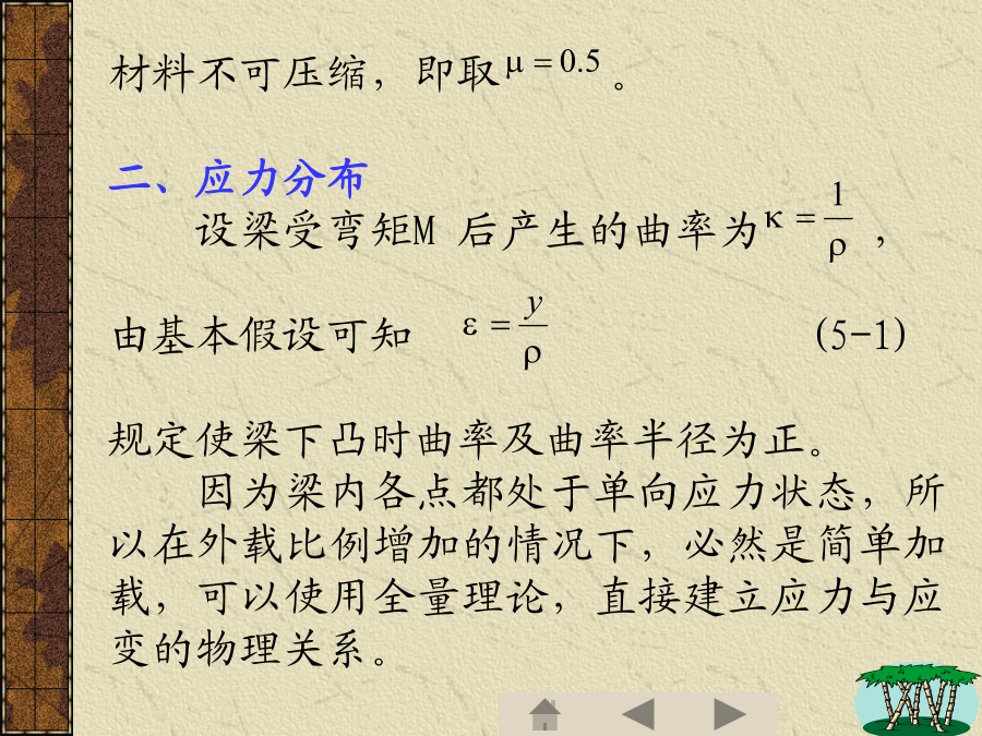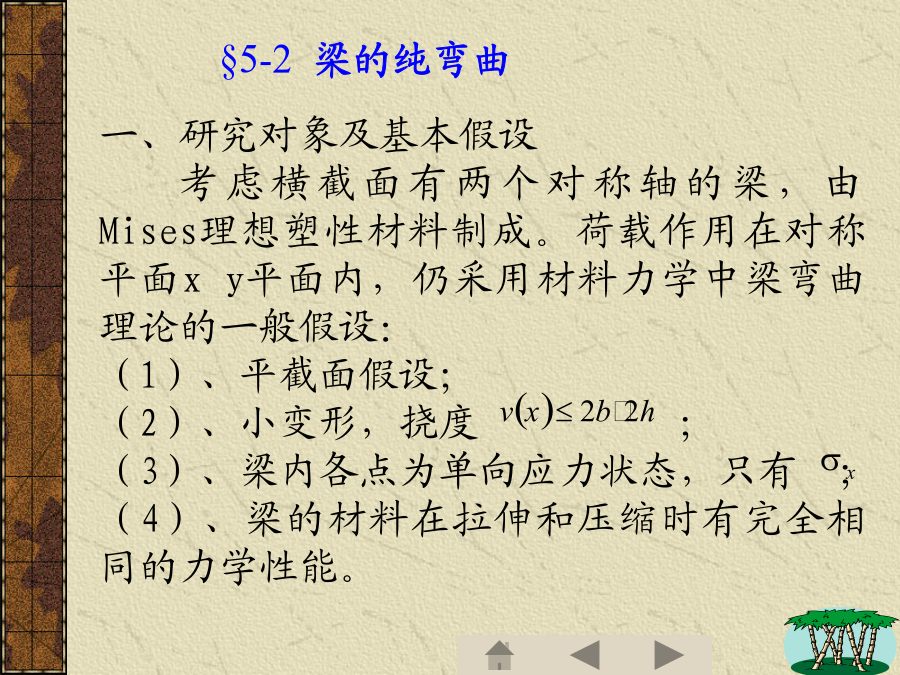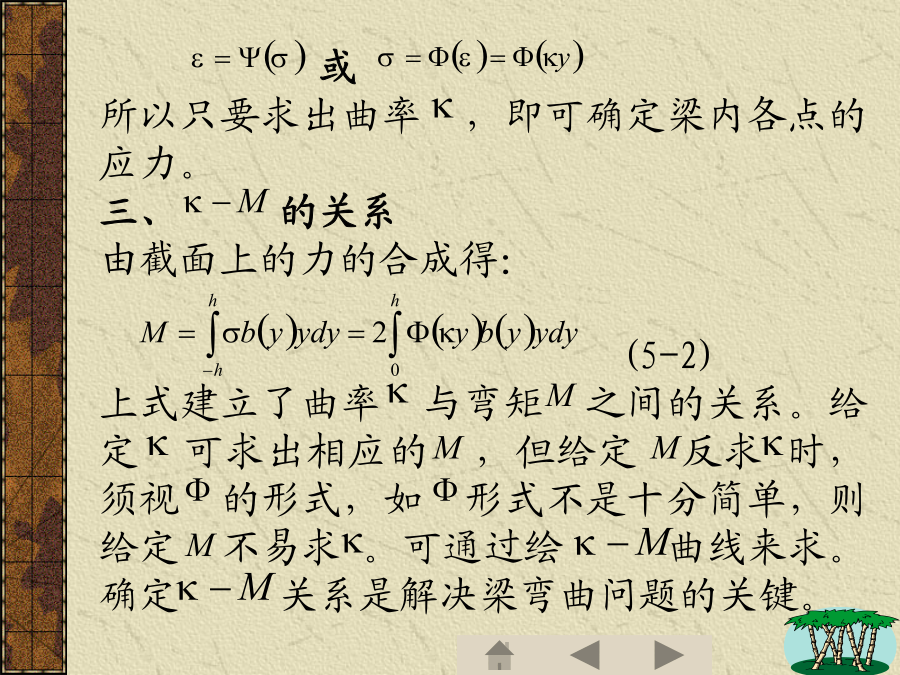 §5-1弹塑性力学中的边值问题3),4)5)求解方法和弹性问题一样,可以用两种基本方法:按位移求解或按应力求解。在全量理论适用并按位移求解弹塑性问题时,依留申提出的弹性解法显得很方便。将代入用位移表示的平衡微分方程得:其中或在弹性状态时,上式右端等于零,可得到弹性解。将它作为第一次近似解,代入上式右端作为已知项,又可以解出第二次近似解。重复以上过程,可得出所要求精度内接近实际的解。在小变形情况下,可以证明解能够很快收敛。在很多问题第二次近似解已能给出较为满意的结果。增量理论的边值问题及解法设在加载阶段的某一瞬时,已求得物体内各点的,求在此基础上,给定体力增量、上面力增量、上位移增量时,物体内部各点的应力增量、应变增量、位移增量。确定这些增量的基本方程组有:1)2)3)本构关系(理想弹塑性材料)弹性区塑性区4)5)此外,在弹塑性交界面上还应满足一定的连续条件和间断性条件。在给定加载历史时,可以对每时刻求出增量,然后用“积分”(累计)的方法得出应力和应变等分布规律。塑性力学中比较简单的问题,包括用平衡微分方程、屈服条件和应力边界条件就能完全确定应力场的所谓静定问题,以及屈服条件为线性的情况,求解时并不需要处理整套方程(因为其中许多方程已自动满足),需要处理的方程也可用较简单的数学方法求解属于这类问题的有纯拉伸、纯弯曲、纯扭转平面弯曲、厚壁筒和旋转圆盘等。一、研究对象及基本假设考虑横截面有两个对称轴的梁,由Mises理想塑性材料制成。荷载作用在对称平面xy平面内,仍采用材料力学中梁弯曲理论的一般假设:(1)、平截面假设;(2)、小变形,挠度;(3)、梁内各点为单向应力状态,只有;(4)、梁的材料在拉伸和压缩时有完全相同的力学性能。材料不可压缩,即取。二、应力分布设梁受弯矩M后产生的曲率为,由基本假设可知(5-1)规定使梁下凸时曲率及曲率半径为正。因为梁内各点都处于单向应力状态,所以在外载比例增加的情况下,必然是简单加载,可以使用全量理论,直接建立应力与应变的物理关系。或所以只要求出曲率,即可确定梁内各点的应力。三、的关系由截面上的力的合成得:(5-2)上式建立了曲率与弯矩之间的关系。给定可求出相应的,但给定反求时,须视的形式,如形式不是十分简单,则给定不易求。可通过绘曲线来求。确定关系是解决梁弯曲问题的关键。四、理想弹塑性材料梁对于理想弹塑性材料,其应力应变关系如下表示:当弯矩超过一定大小,使得梁截面上一部分区域进入塑性之后,梁截面上的应力分布如图。是塑性区的边缘到中性轴的距离。以代入(5-1)得:(5-3)得(5-4)其中是截面的弹性区对中性轴的惯性矩。是截面一块塑性区对中性轴的静矩。五、梁的变形及挠度在弹性区梁的位移分量为梁的应变分量为满足应变协调方程。在弹性区的边界处,由所以梁轴的挠曲方程为故如梁的横截面是高为h、宽为b的矩形,则令即得梁刚开始产生塑性变形时的弯矩—最大弹性弯矩。即得梁截面全部进入塑性状态时的弯矩—塑性极限矩。令和相应的梁的曲率半径为,此时即得这是梁屈服以后曲率半径和弯矩的关系。屈服前为求的显式为:给定可求得相应的,然后可求得梁截面上的应力分布。同样可以得的关系六、幂次强化材料设梁的材料为幂次强化材料,其单向拉压时的应力-应变关系服从幂规律式中B和n为常数,由实验测定,。单拉时式中,为截面的一种几何性质(n=1时,即为惯性矩)给定即可求出,从而可求得应变和应力分布。对于矩形截面梁,宽为(高为)。可得应力分布为:弹性状态及理想塑性极限状态都是幂次强化的特例。(为线弹性关系,即为理想塑性极限状态)七、线性强化材料梁设梁的材料为线性强化,其单向拉伸时的应力-应变关系为:则梁的应力为那么上式的适用范围是对宽为(高为)的矩形截面一、研究对象及基本假设考虑横截面有两个对称轴的梁,由Mises理想塑性材料制成。荷载作用在对称平面xy平面内,仍采用材料力学中梁弯曲理论的一般假设:(1)、平截面假设;(2)、小变形,挠度;(3)、各层间相互挤压不计;(4)、长度远大于横向尺寸,因而。材料不可压缩,即取。梁的位移分量为:梁的应变分量为:满足应变协调方程。梁的纵向纤维是受简单拉伸或压缩。在弯矩M增长时,每一单元体的加载显然都是简单加载,故可以用全量理论求解。二、本构方程在本构方程中忽略次要应力(即挤压应力和横向剪应力)的影响,材料处于轴向应力的单向拉压状态。对于理想弹塑性材料,应力—应变关系为其中,为屈服应变,即应力刚达到屈服应力时的应变。