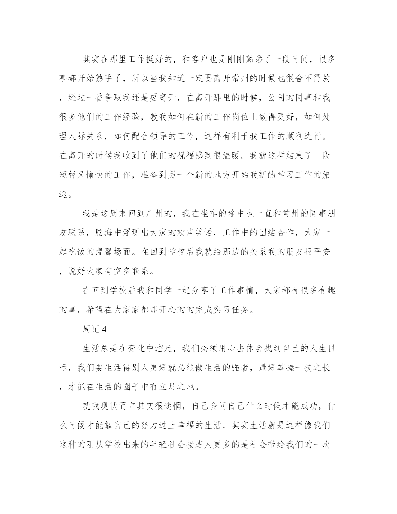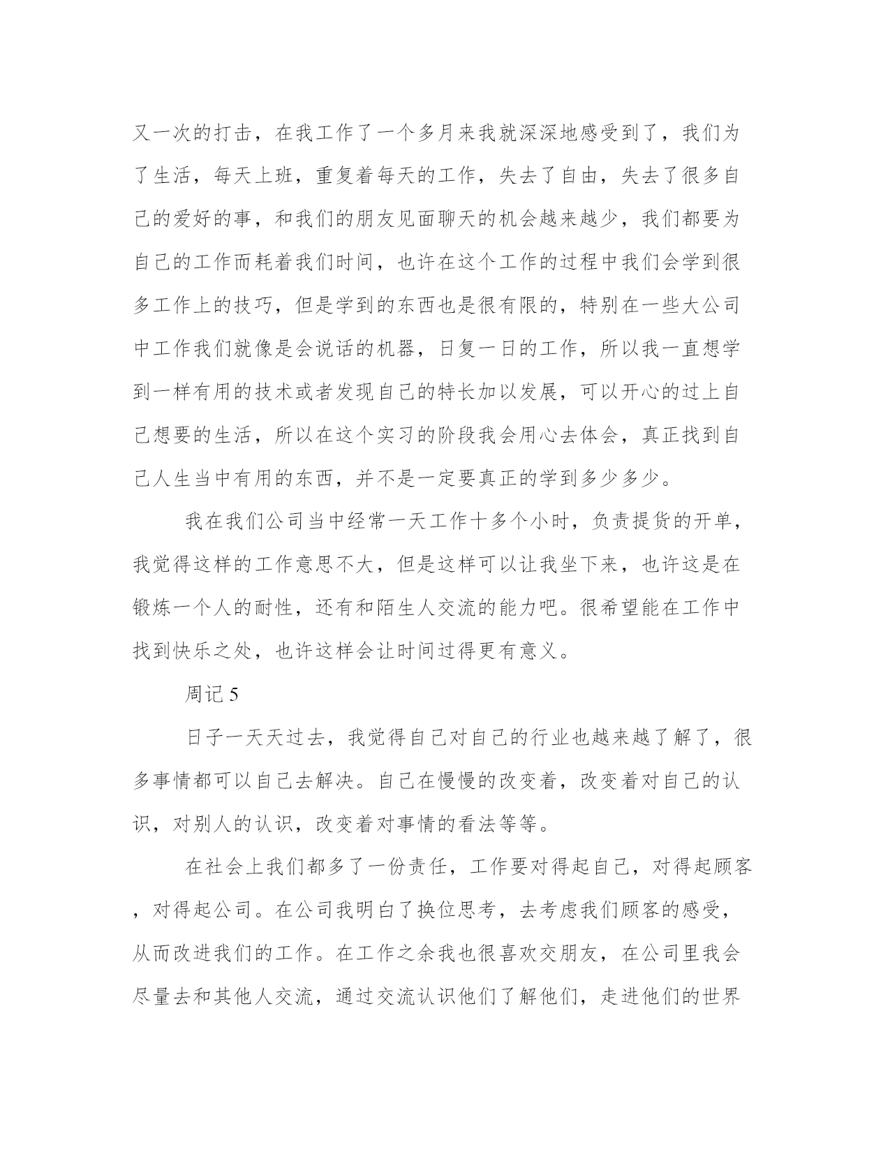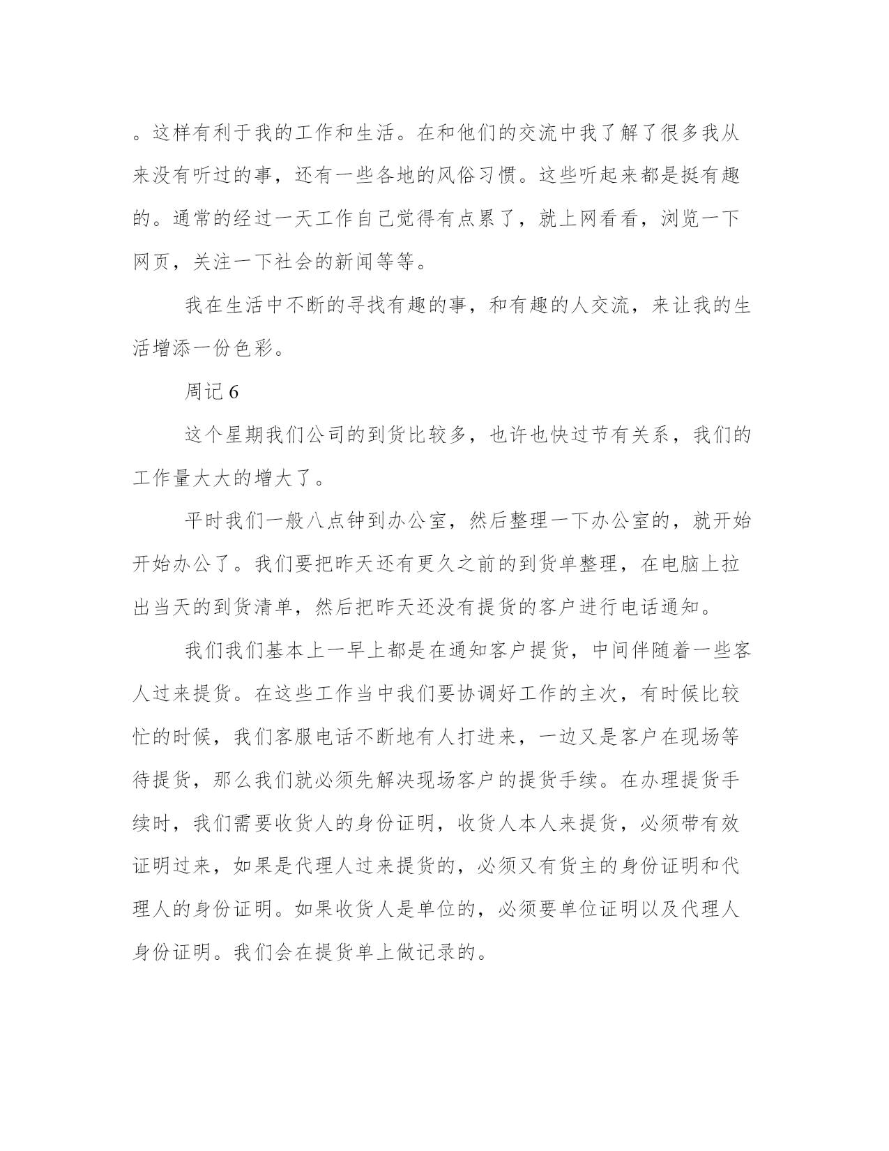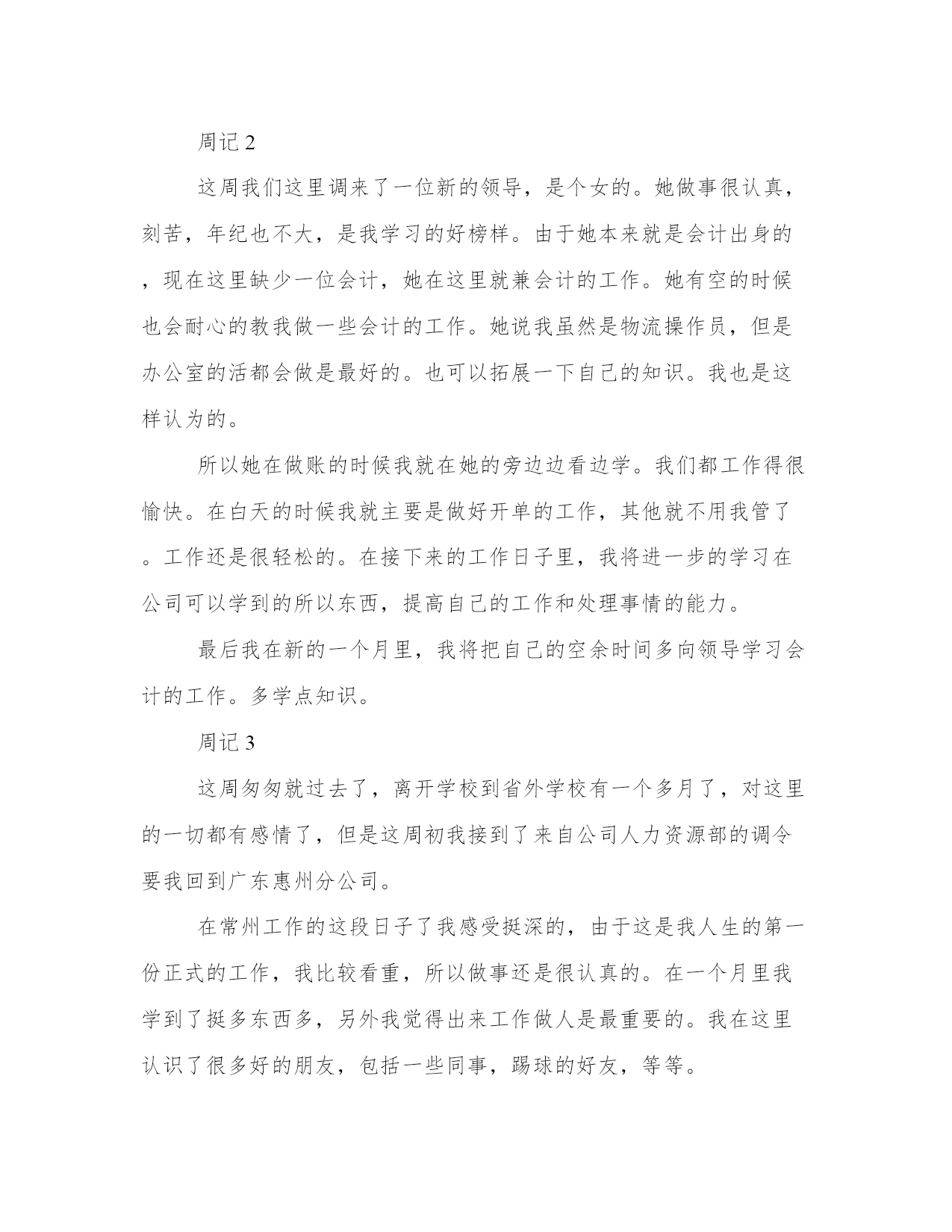 物流公司实习周记的范文周记1这个星期即将过去,这里我该做的工作基本熟识了。我们分公司中有的组织架构是这样的,领导是我们主管,下面有操作员,会计,出纳,装卸工,司机,我们各尽各职。我是操作员,我主要学习电脑的开单管理系统,进一步做好与客户的沟通服务工作。在工作的过程中,其实要做很多琐事,例如作为公司的物流操作员,工作上首先是要为客户提供开单工作,发货开单后还要检查货物在贴标签,装车出库,还要做好货物的跟踪情况。因为在物流运输的途中经常会出现耽误货物到达时间,或者货物在分流中心出现错误,又或者在贴标签时出错等等情况,所以,要锻炼良好的沟通能力,才能更好的协调各方面的工作,以最快的速度解决问题,为客户提供最有效的解决方案。有时候客户的货物由于急需但是运输途中偏偏出错了,我们会一直被客户追问的,我们就要学会如何解答客户的问题了。例如当被问到货物到底具体到哪里啦,我们就要马上联系该货物的到货公司,确认货物具体情况,如果还没有到达到货公司我们得联系分流中心,了解货物到了分流中心分流了没有,有没有缺货等等,最后转告客户,让他们再耐心等待。其实,作为物流操作员很多东西都要了解的。这样才能一站式的服务客户,做到一站到位。周记2这周我们这里调来了一位新的领导,是个女的。她做事很认真,刻苦,年纪也不大,是我学习的好榜样。由于她本来就是会计出身的,现在这里缺少一位会计,她在这里就兼会计的工作。她有空的时候也会耐心的教我做一些会计的工作。她说我虽然是物流操作员,但是办公室的活都会做是最好的。也可以拓展一下自己的知识。我也是这样认为的。所以她在做账的时候我就在她的旁边边看边学。我们都工作得很愉快。在白天的时候我就主要是做好开单的工作,其他就不用我管了。工作还是很轻松的。在接下来的工作日子里,我将进一步的学习在公司可以学到的所以东西,提高自己的工作和处理事情的能力。最后我在新的一个月里,我将把自己的空余时间多向领导学习会计的工作。多学点知识。周记3这周匆匆就过去了,离开学校到省外学校有一个多月了,对这里的一切都有感情了,但是这周初我接到了来自公司人力资源部的调令要我回到广东惠州分公司。在常州工作的这段日子了我感受挺深的,由于这是我人生的第一份正式的工作,我比较看重,所以做事还是很认真的。在一个月里我学到了挺多东西多,另外我觉得出来工作做人是最重要的。我在这里认识了很多好的朋友,包括一些同事,踢球的好友,等等。其实在那里工作挺好的,和客户也是刚刚熟悉了一段时间,很多事都开始熟手了,所以当我知道一定要离开常州的时候也很舍不得放,经过一番争取我还是要离开,在离开那里的时候,公司的同事和我很多他们的工作经验,教我如何在新的工作岗位上做得更好,如何处理人际关系,如何配合领导的工作,这样有利于我工作的顺利进行。在离开的时候我收到了他们的祝福感到很温暖。我就这样结束了一段短暂又愉快的工作,准备到另一个新的地方开始我新的学习工作的旅途。我是这周末回到广州的,我在坐车的途中也一直和常州的同事朋友联系,脑海中浮现出大家的欢声笑语,工作中的团结合作,大家一起吃饭的温馨场面。在回到学校后我就给那边的关系我的朋友报平安,说好大家有空多联系。在回到学校后我和同学一起分享了工作事情,大家都有很多有趣的事,希望在大家家都能开心的的完成实习任务。周记4生活总是在变化中溜走,我们必须用心去体会找到自己的人生目标,我们要生活得别人更好就必须做生活的强者,最好掌握一技之长,才能在生活的圈子中有立足之地。就我现状而言其实很迷惘,自己会问自己什么时候才能成功,什么时候才能靠自己的努力过上幸福的生活,其实生活就是这样像我们这种的刚从学校出来的年轻社会接班人更多的是社会带给我们的一次又一次的打击,在我工作了一个多月来我就深深地感受到了,我们为了生活,每天上班,重复着每天的工作,失去了自由,失去了很多自己的爱好的事,和我们的朋友见面聊天的机会越来越少,我们都要为自己的工作而耗着我们时间,也许在这个工作的过程中我们会学到很多工作上的技巧,但是学到的东西也是很有限的,特别在一些大公司中工作我们就像是会说话的机器,日复一日的工作,所以我一直想学到一样有用的技术或者发现自己的特长加以发展,可以开心的过上自己想要的生活,所以在这个实习的阶段我会用心去体会,真正找到自己人生当中有用的东西,并不是一定要真正的学到多少多少。我在我们公司当中经常一天工作十多个小时,负责提货的开单,我觉得这样的工作意思不大,但是这样可以让我坐下来,也许这是在锻炼一个人的耐性,还有和陌生人交流的能力吧。很希望能在工作中找到快乐之处,也许这样会让时间过得更有意义。周记5日子一天天过去,我觉得自己对自己的行业也越来越了解了,很多事情都可以自己去解决。自己在慢慢的改变着,改变着对自己的认识,对别人的认识,改