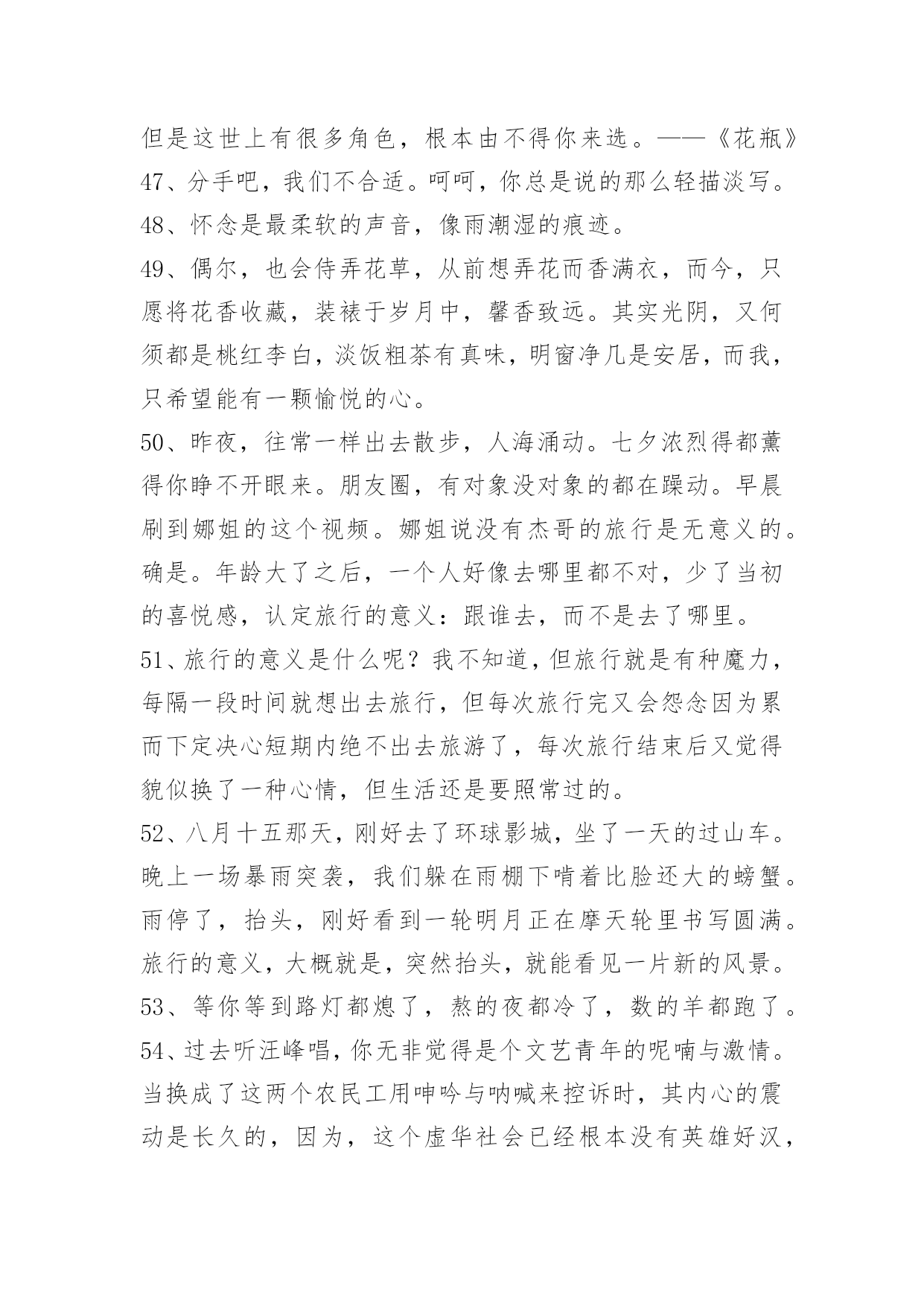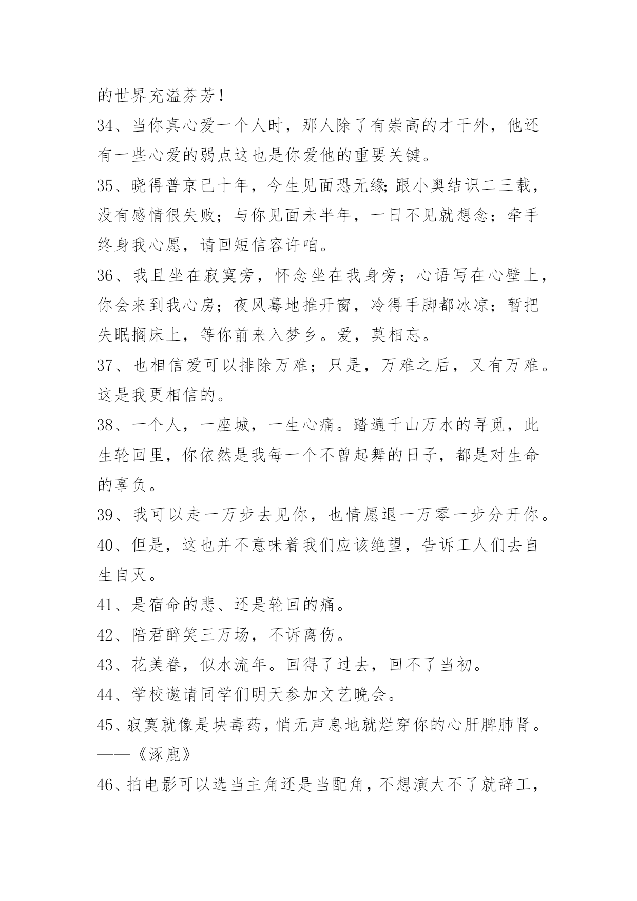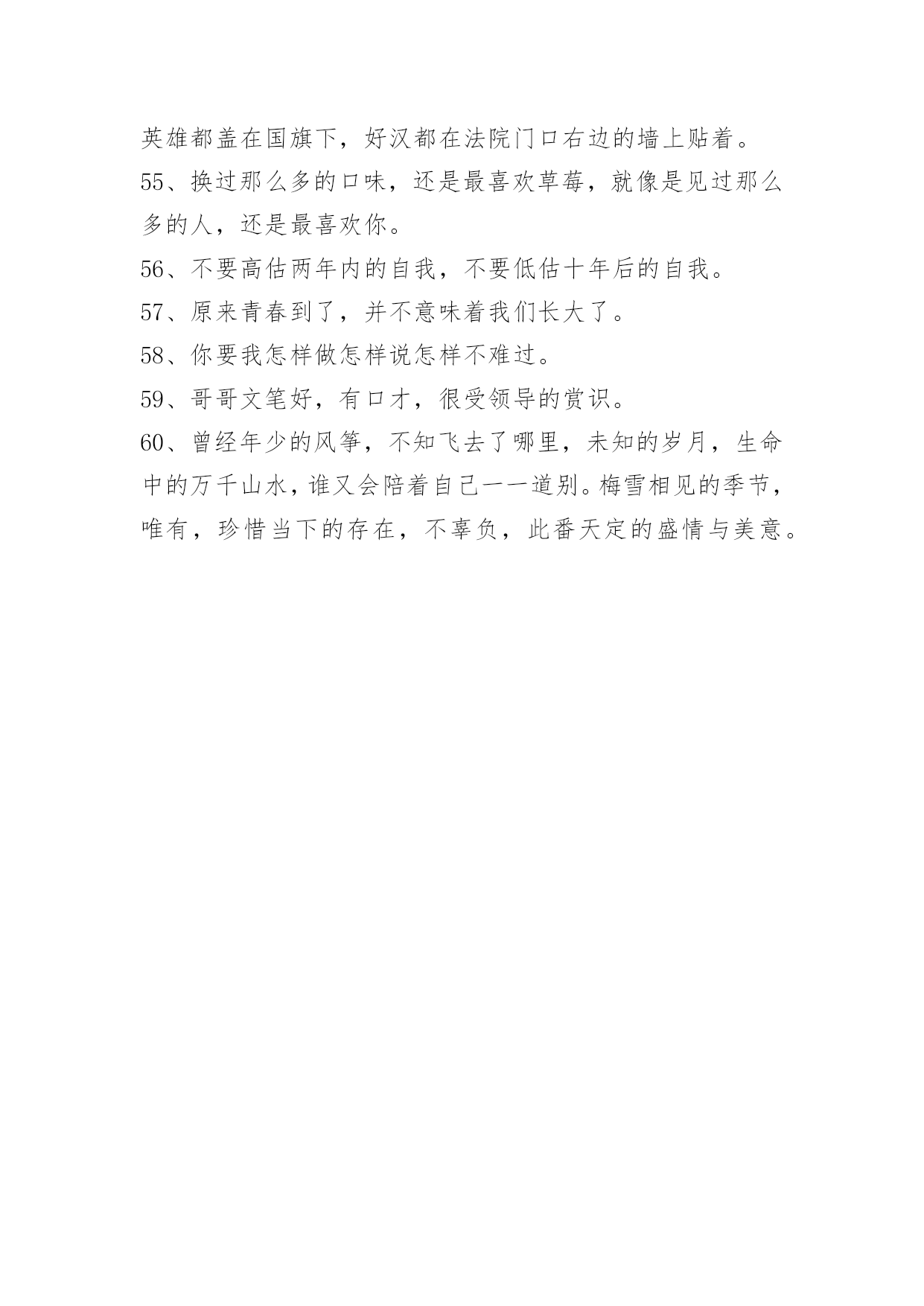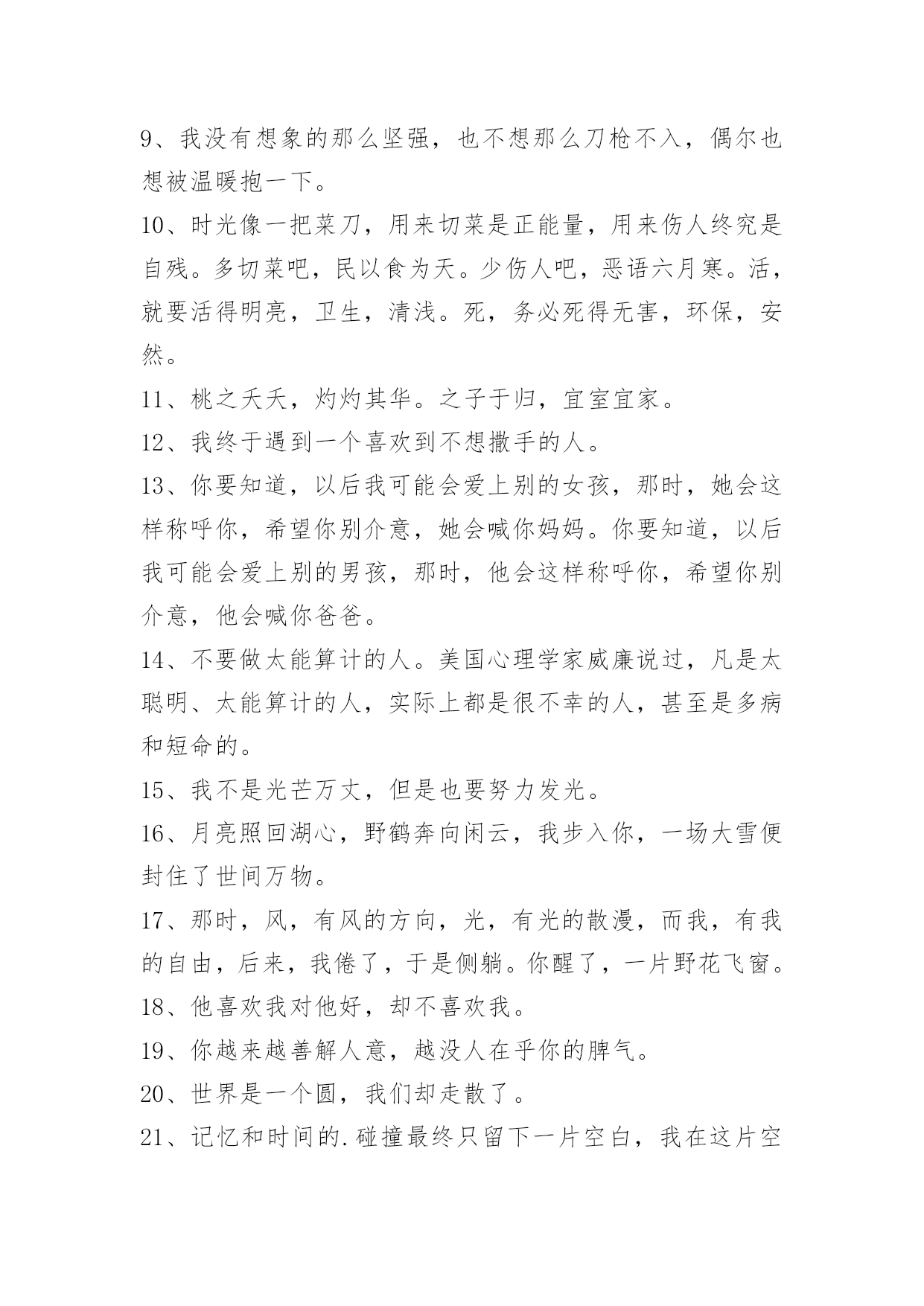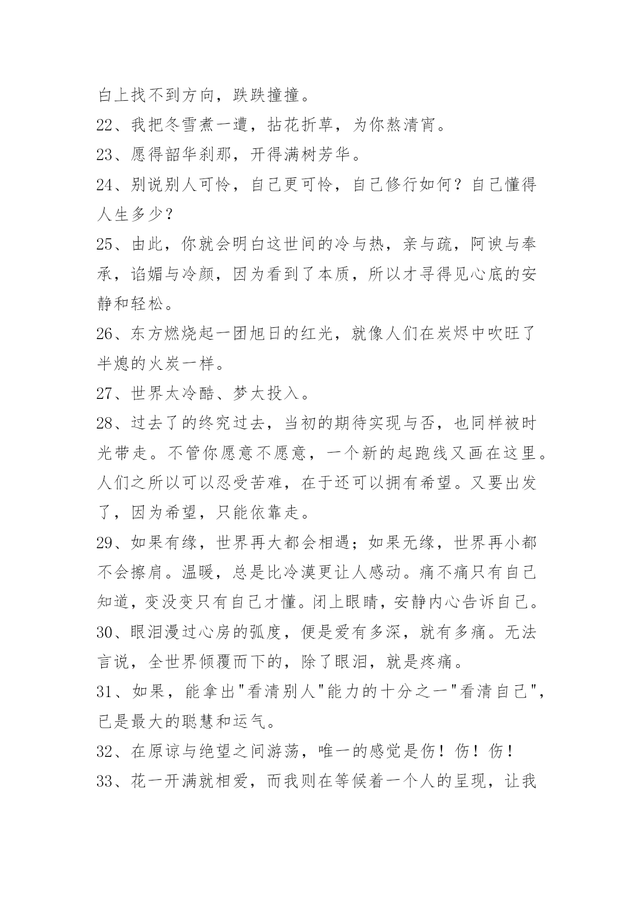 文艺青春句子60条2022年通用文艺青春句子汇编60条做好自己,世界就美丽了。保持内心的安静与善良,不要因为诱惑和欲望,而扭曲自己的心灵和本性。让灵魂拥有一种自由,不去患得患失,不去小心翼翼,更不要活得战战兢兢。以下是关于文艺青春句子60条,希望对大家有所帮助。1、你知道吗?我为你守候了三十多年。三十多年里,思念漫过心海,忧伤穿越每一个细胞,渴望见到你的心从未改变。而今,真得相遇又如何,还不是柔肠寸断,残梦一场。封存了半生的爱恋,原来是落花有意,流水无情。纵使有千缕情思,终究化作万缕惆怅的音符,飘荡在寒冷的冬季。2、外表的笑没心没肺,只是为了掩饰那颗脆弱的内心。3、总是活在一些极致的情绪里,某一段时间会对生活充满了信心,但突然在某一瞬间,你又会全盘推翻。4、我也不要你后悔,我就要你在平淡生活的某一天里,突然想起我,然后猛的意识到自己失去了什么最珍贵的。5、你是我的特别关心,我是你的权限设置。6、一个人陷入回忆,待过往的疼痛唤醒自己的深沉。7、有没有过看到对方说的一句话,那一瞬间,眼泪立马就飚出来,止也止不住……8、度过多少的清浅岁月,青苔才会入境而来,淋过多少的倾盆大雨,姑娘才会为我撑起纸伞。9、我没有想象的那么坚强,也不想那么刀枪不入,偶尔也想被温暖抱一下。10、时光像一把菜刀,用来切菜是正能量,用来伤人终究是自残。多切菜吧,民以食为天。少伤人吧,恶语六月寒。活,就要活得明亮,卫生,清浅。死,务必死得无害,环保,安然。11、桃之夭夭,灼灼其华。之子于归,宜室宜家。12、我终于遇到一个喜欢到不想撒手的人。13、你要知道,以后我可能会爱上别的女孩,那时,她会这样称呼你,希望你别介意,她会喊你妈妈。你要知道,以后我可能会爱上别的男孩,那时,他会这样称呼你,希望你别介意,他会喊你爸爸。14、不要做太能算计的人。美国心理学家威廉说过,凡是太聪明、太能算计的人,实际上都是很不幸的人,甚至是多病和短命的。15、我不是光芒万丈,但是也要努力发光。16、月亮照回湖心,野鹤奔向闲云,我步入你,一场大雪便封住了世间万物。17、那时,风,有风的方向,光,有光的散漫,而我,有我的自由,后来,我倦了,于是侧躺。你醒了,一片野花飞窗。18、他喜欢我对他好,却不喜欢我。19、你越来越善解人意,越没人在乎你的脾气。20、世界是一个圆,我们却走散了。21、记忆和时间的.碰撞最终只留下一片空白,我在这片空白上找不到方向,跌跌撞撞。22、我把冬雪煮一遭,拈花折草,为你熬清宵。23、愿得韶华刹那,开得满树芳华。24、别说别人可怜,自己更可怜,自己修行如何?自己懂得人生多少?25、由此,你就会明白这世间的冷与热,亲与疏,阿谀与奉承,谄媚与冷颜,因为看到了本质,所以才寻得见心底的安静和轻松。26、东方燃烧起一团旭日的红光,就像人们在炭烬中吹旺了半熄的火炭一样。27、世界太冷酷、梦太投入。28、过去了的终究过去,当初的期待实现与否,也同样被时光带走。不管你愿意不愿意,一个新的起跑线又画在这里。人们之所以可以忍受苦难,在于还可以拥有希望。又要出发了,因为希望,只能依靠走。29、如果有缘,世界再大都会相遇;如果无缘,世界再小都不会擦肩。温暖,总是比冷漠更让人感动。痛不痛只有自己知道,变没变只有自己才懂。闭上眼睛,安静内心告诉自己。30、眼泪漫过心房的弧度,便是爱有多深,就有多痛。无法言说,全世界倾覆而下的,除了眼泪,就是疼痛。31、如果,能拿出"看清别人"能力的十分之一"看清自己",已是最大的聪慧和运气。32、在原谅与绝望之间游荡,唯一的感觉是伤!伤!伤!33、花一开满就相爱,而我则在等候着一个人的呈现,让我的世界充溢芬芳!34、当你真心爱一个人时,那人除了有崇高的才干外,他还有一些心爱的弱点这也是你爱他的重要关键。35、晓得普京已十年,今生见面恐无缘;跟小奥结识二三载,没有感情很失败;与你见面未半年,一日不见就想念;牵手终身我心愿,请回短信容许咱。36、我且坐在寂寞旁,怀念坐在我身旁;心语写在心壁上,你会来到我心房;夜风蓦地推开窗,冷得手脚都冰凉;暂把失眠搁床上,等你前来入梦乡。爱,莫相忘。37、也相信爱可以排除万难;只是,万难之后,又有万难。这是我更相信的。38、一个人,一座城,一生心痛。踏遍千山万水的寻觅,此生轮回里,你依然是我每一个不曾起舞的日子,都是对生命的辜负。39、我可以走一万步去见你,也情愿退一万零一步分开你。40、但是,这也并不意味着我们应该绝望,告诉工人们去自生自灭。41、是宿命的悲、还是轮回的痛。42、陪君醉笑三万场,不诉离伤。43、花美眷,似水流年。回得了过去,回不了当初。44、学校邀请同学们明天参加文艺晚会。45、寂寞就像是块毒药,悄无声息地就烂穿你的心肝脾肺肾。——《涿鹿》46、拍电影可以选当主角还是当配角,不想演大不了就辞工,但是这世上有很多