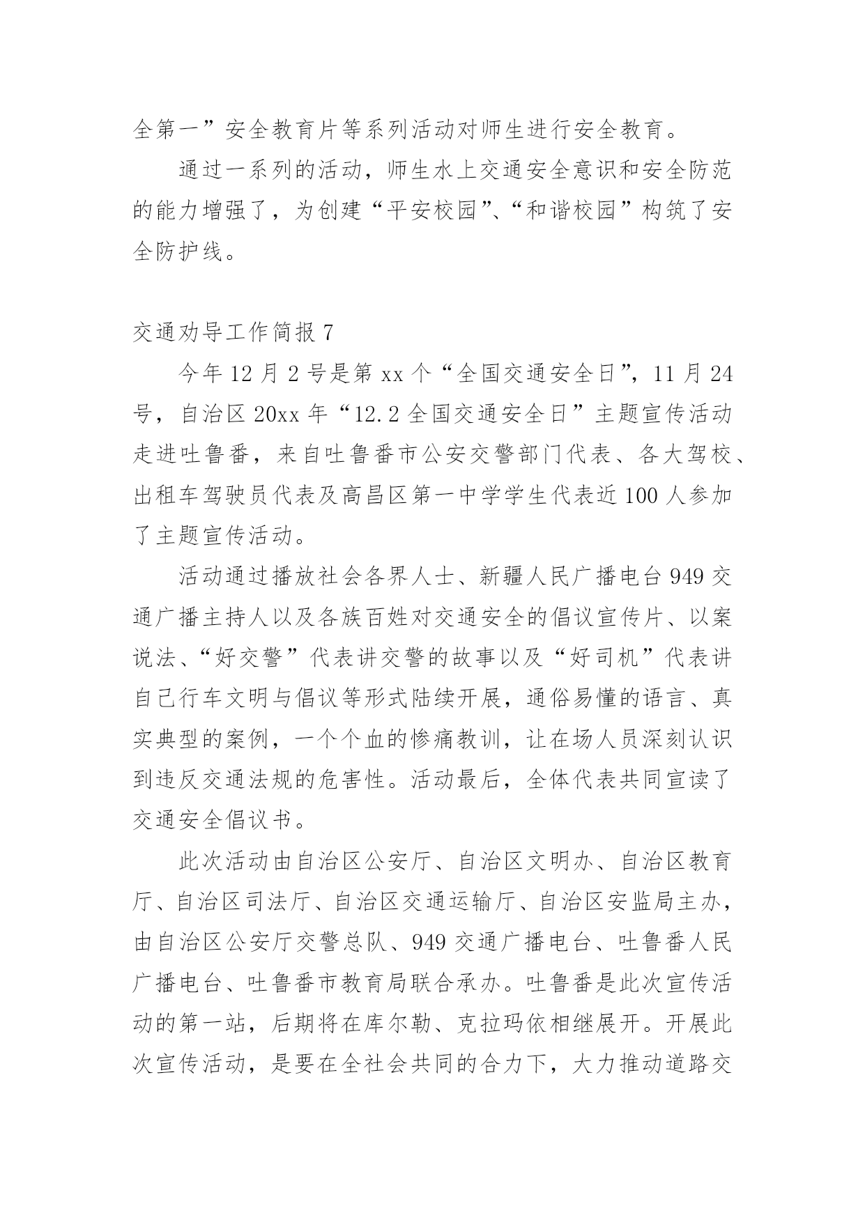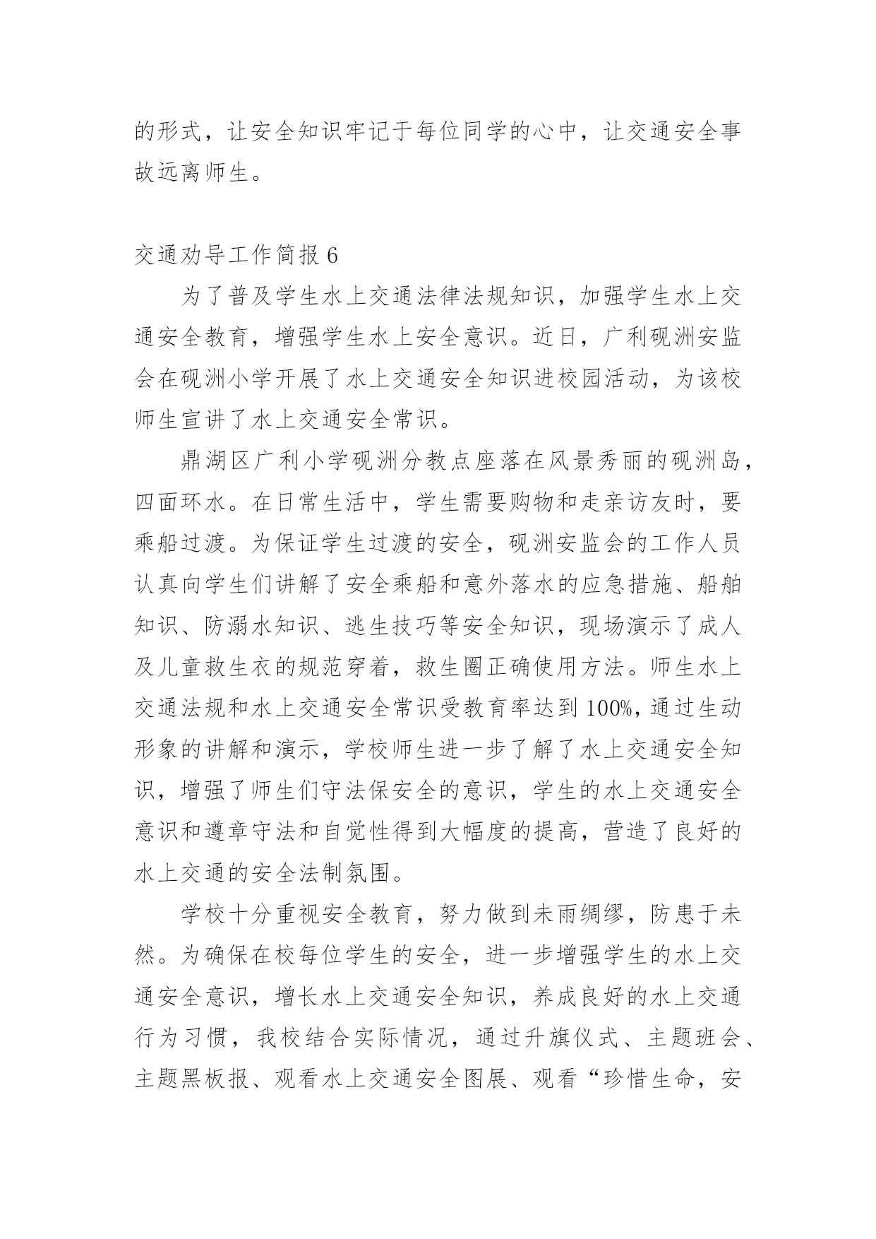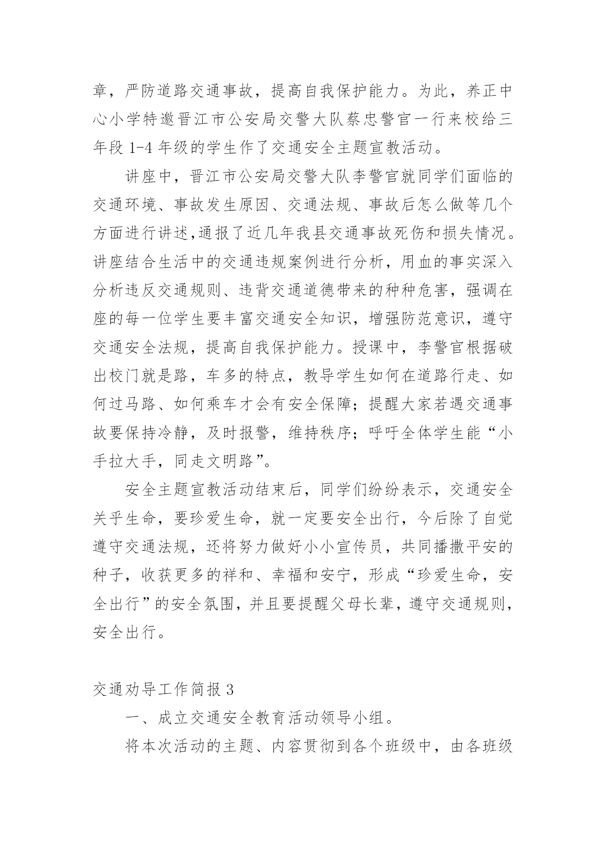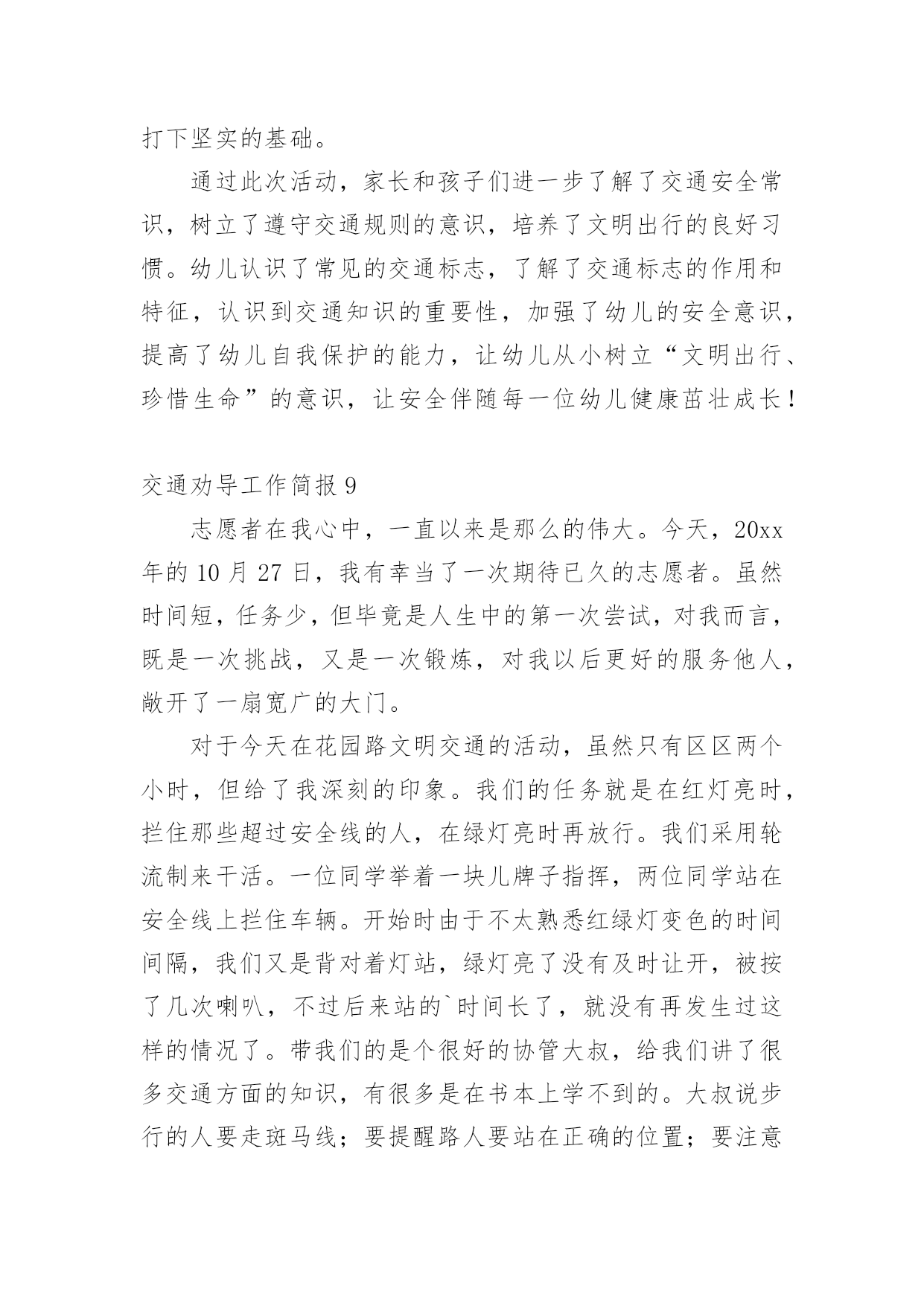 交通劝导工作简报随着社会不断地进步,越来越多地方需要用到简报,简报是传递某方面信息的简短的内部小报。什么样的简报才是有效的呢?下面是小编整理的交通劝导工作简报(通用18篇),仅供参考,欢迎大家阅读。交通劝导工作简报1为提升群众文明素质,做好公共文明指数测评,更好提升莲花县文明程度和城市形象,展现莲花市民和志愿者风采,又到了为期一周的“交通劝导服务”,这周恰逢是中小学开课季。协会志愿者们积极响应县文明办的号召,纷纷来到各个主要红绿灯路口。上下班,上下学高峰时段,志愿者们对行人横穿马路、电动车闯红灯、机动车不礼让行人等不文明行为进行劝导,提醒过往群众遵守交通规则,安全文明出行。尤其是最后一天的文明交通劝导,突然倾盆大雨,志愿者们仍然穿协服,戴协帽,站好最后一天的岗位,红色的身影是街头一道最靓丽的风景。交通劝导工作简报2为了更好营造安全、有序、文明的校园周边交通环境,培养师生良好的交通安全意识,教育学生关爱生命、拒绝违章,严防道路交通事故,提高自我保护能力。为此,养正中心小学特邀晋江市公安局交警大队蔡忠警官一行来校给三年段1-4年级的学生作了交通安全主题宣教活动。讲座中,晋江市公安局交警大队李警官就同学们面临的交通环境、事故发生原因、交通法规、事故后怎么做等几个方面进行讲述,通报了近几年我县交通事故死伤和损失情况。讲座结合生活中的交通违规案例进行分析,用血的事实深入分析违反交通规则、违背交通道德带来的种种危害,强调在座的每一位学生要丰富交通安全知识,增强防范意识,遵守交通安全法规,提高自我保护能力。授课中,李警官根据破出校门就是路,车多的特点,教导学生如何在道路行走、如何过马路、如何乘车才会有安全保障;提醒大家若遇交通事故要保持冷静,及时报警,维持秩序;呼吁全体学生能“小手拉大手,同走文明路”。安全主题宣教活动结束后,同学们纷纷表示,交通安全关乎生命,要珍爱生命,就一定要安全出行,今后除了自觉遵守交通法规,还将努力做好小小宣传员,共同播撒平安的种子,收获更多的祥和、幸福和安宁,形成“珍爱生命,安全出行”的安全氛围,并且要提醒父母长辈,遵守交通规则,安全出行。交通劝导工作简报3一、成立交通安全教育活动领导小组。将本次活动的主题、内容贯彻到各个班级中,由各班级进一步落实到各个学生当中。要求大家“事事讲安全,人人懂安全,健康快乐每一天”。二、开展丰富多彩的安全教育活动。1、结合主题班队会活动进行开展。活动有观看安全教育动画片、互动提问、现场模仿等,活动中,老师们用通俗易懂的语言为学生讲解了道路交通安全知识,并通过安全小故事、交通事故案例、认识交通标志等进行了讲解和提问互动。学生们也在愉悦的动画片中学习了各种交通安全知识,进一步增强了交通安全意识,提高了自我保护能力。2、我校根据这次的安全教育活动的.主题,设计了以“交通安全”为主的宣传栏,布置班级出一期有关“交通安全知识”手抄报,各班级利用课余时间收集积累交通安全知识。3、利用学校各种宣传途径,如电子屏幕、学校网站、安全宣传专栏等。发动联合家长广泛关注、积极配合学校共同进行有关交通安全知识的教育,召开校车司机会议,并分发《致校车司机、学生家长的一封信》,努力构建家、校一体的安全教育。经过开展这次丰富多彩的安全教育活动,师生们得到了深刻的教育,进一步提高了安全意识。让安全教育牢记在每一位师生的心中,让健康快乐伴随孩子成长的每一天。交通劝导工作简报4为进一步加强交通安全宣传教育,不断提升小学生交通安全防范意识,养成文明交通行为习惯,有效预防和减少涉及学生的道路交通事故,倡导绿色低碳出行方式,营造文明礼让、和谐顺畅的交通环境,近日,实验小学开展了交通安全系列宣传教育活动。实验小学通过国旗下讲话、宣传窗等开展形式多样、内容丰富的系列主题教育活动,邀请交警城区中队的警官开展交通安全知识进校园活动,发放交通安全知识宣传册,宣讲《道路交通安全法》,具体指导学生怎样走路、乘车、过路口,切实提升了小学生交通安全素质。发挥“小手拉大手”的辐射带动作用,鼓励学生不仅要做文明交通的实践者,还要努力当好宣传员,用自己学到的知识对家长、亲朋好友进行交通安全提醒,共同拒绝交通违法行为,做到安全文明出行。实验小学通过微信向家长宣传学校在交通安全方面需要家长配合的举措,倡导家长主动遵守交通法规,安全出行、文明出行、绿色出行。充分发挥教职员工文明出行模范带头作用,大力倡导教职员工文明出行、步行、乘坐公共交通、自行车出行。切实把体验式教育融入于社会课堂,让每个学生掌握候车、行走、过马路、上下车、乘车等交通参与的注意事项和要求,深刻领会遵守交通法规的重要性和必要性,增强安全意识,提高自我防范能力和危险情况下的自救能力,从源头上减少交通乱象发生,共同创造良好交通秩序。交通劝导工作简报5为增强全体师生的交通安全意识,丰富交通安全