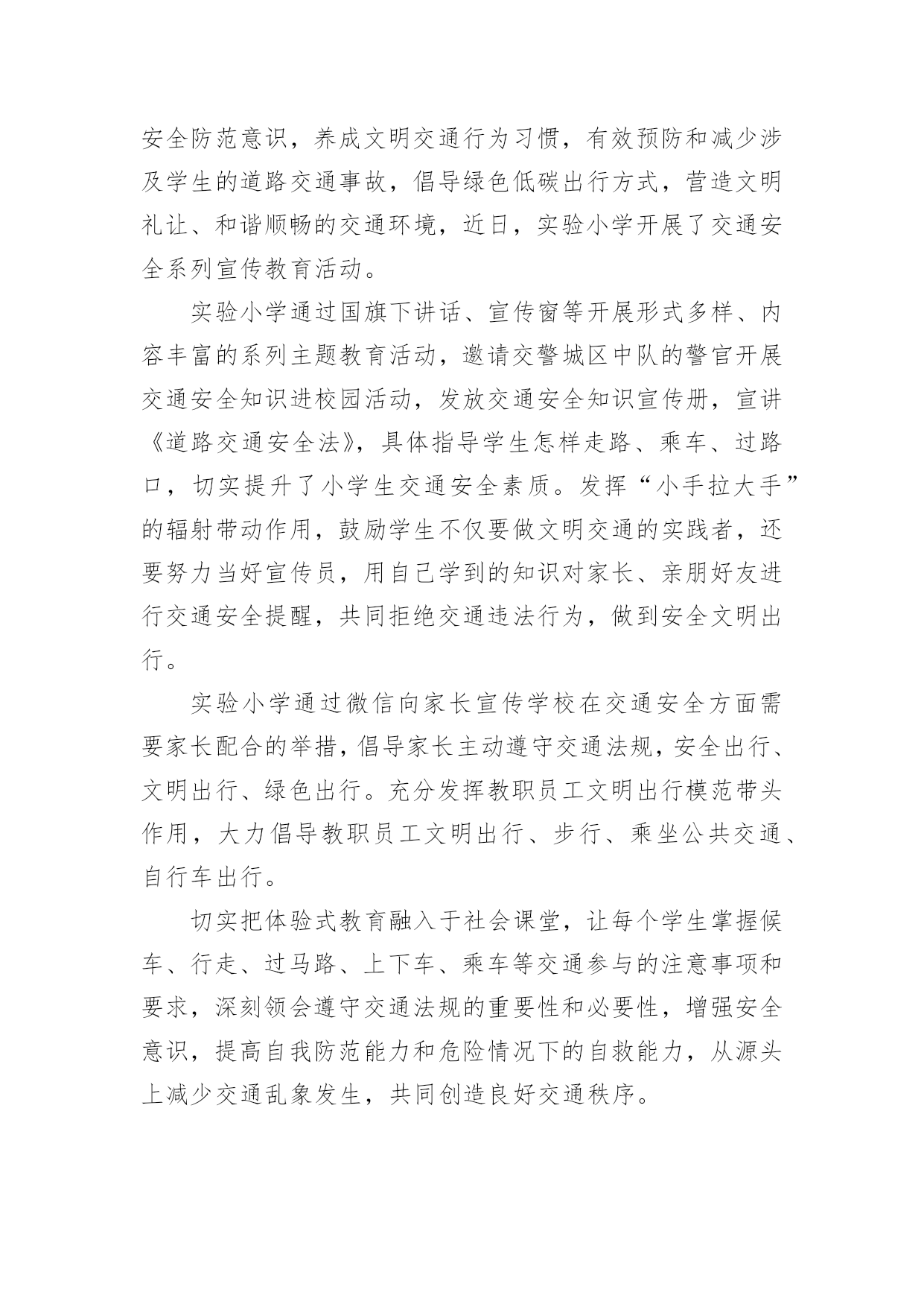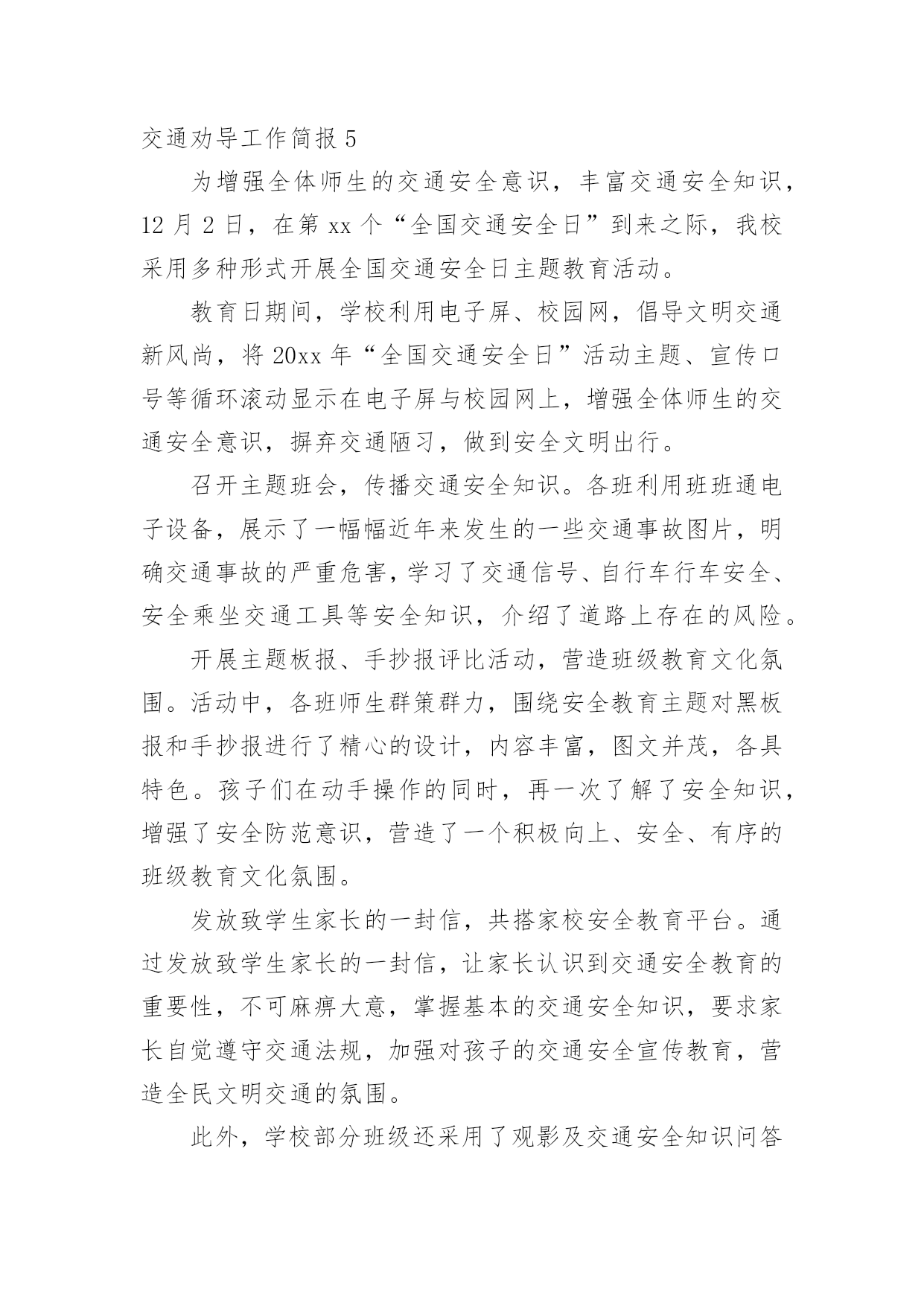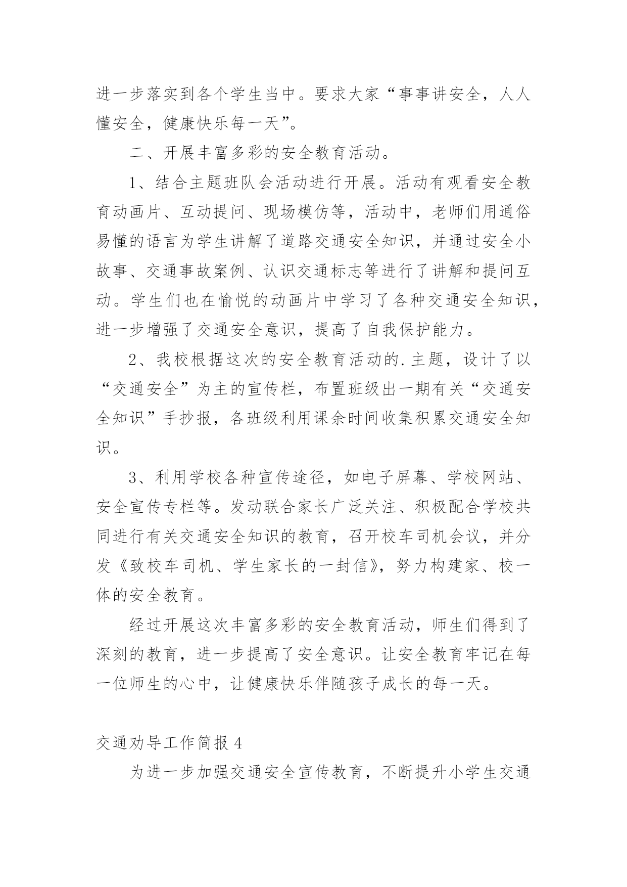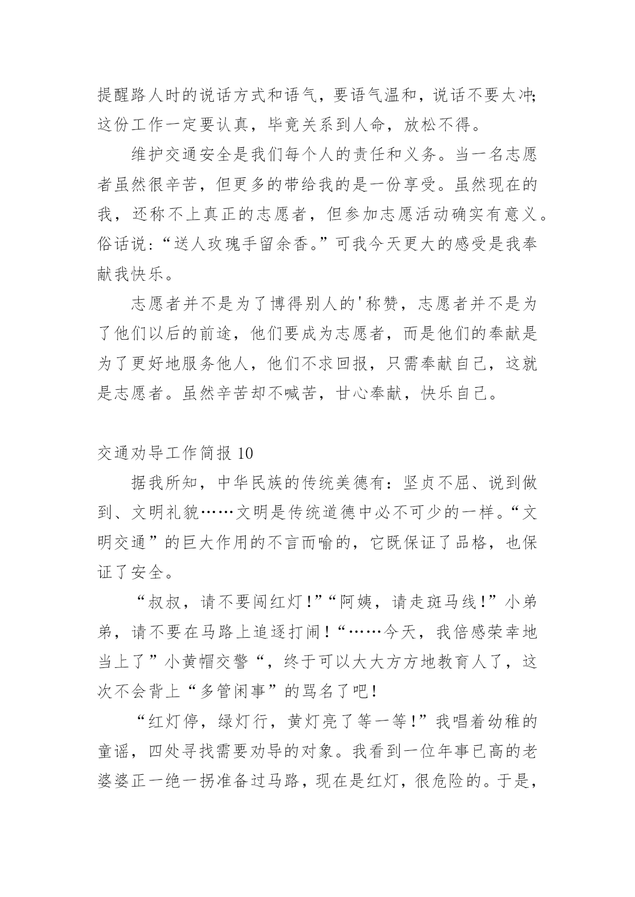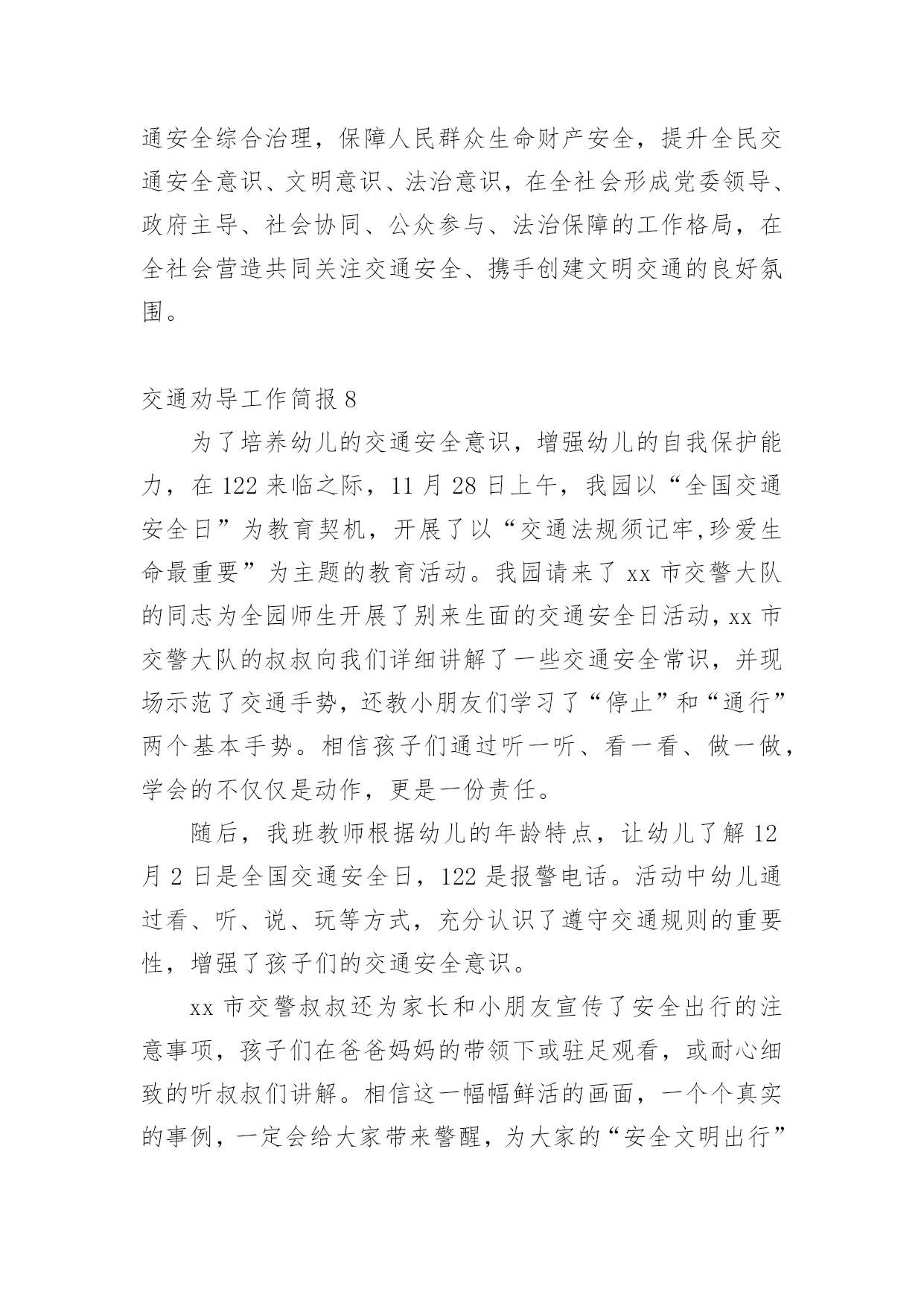 交通劝导工作简报随着社会不断地进步,越来越多地方需要用到简报,简报是传递某方面信息的简短的内部小报。什么样的简报才是有效的呢?下面是小编整理的交通劝导工作简报(通用18篇),仅供参考,欢迎大家阅读。交通劝导工作简报1为提升群众文明素质,做好公共文明指数测评,更好提升莲花县文明程度和城市形象,展现莲花市民和志愿者风采,又到了为期一周的“交通劝导服务”,这周恰逢是中小学开课季。协会志愿者们积极响应县文明办的号召,纷纷来到各个主要红绿灯路口。上下班,上下学高峰时段,志愿者们对行人横穿马路、电动车闯红灯、机动车不礼让行人等不文明行为进行劝导,提醒过往群众遵守交通规则,安全文明出行。尤其是最后一天的文明交通劝导,突然倾盆大雨,志愿者们仍然穿协服,戴协帽,站好最后一天的岗位,红色的身影是街头一道最靓丽的风景。交通劝导工作简报2为了更好营造安全、有序、文明的校园周边交通环境,培养师生良好的交通安全意识,教育学生关爱生命、拒绝违章,严防道路交通事故,提高自我保护能力。为此,养正中心小学特邀晋江市公安局交警大队蔡忠警官一行来校给三年段1-4年级的学生作了交通安全主题宣教活动。讲座中,晋江市公安局交警大队李警官就同学们面临的交通环境、事故发生原因、交通法规、事故后怎么做等几个方面进行讲述,通报了近几年我县交通事故死伤和损失情况。讲座结合生活中的交通违规案例进行分析,用血的事实深入分析违反交通规则、违背交通道德带来的种种危害,强调在座的每一位学生要丰富交通安全知识,增强防范意识,遵守交通安全法规,提高自我保护能力。授课中,李警官根据破出校门就是路,车多的特点,教导学生如何在道路行走、如何过马路、如何乘车才会有安全保障;提醒大家若遇交通事故要保持冷静,及时报警,维持秩序;呼吁全体学生能“小手拉大手,同走文明路”。安全主题宣教活动结束后,同学们纷纷表示,交通安全关乎生命,要珍爱生命,就一定要安全出行,今后除了自觉遵守交通法规,还将努力做好小小宣传员,共同播撒平安的种子,收获更多的祥和、幸福和安宁,形成“珍爱生命,安全出行”的安全氛围,并且要提醒父母长辈,遵守交通规则,安全出行。交通劝导工作简报3一、成立交通安全教育活动领导小组。将本次活动的主题、内容贯彻到各个班级中,由各班级进一步落实到各个学生当中。要求大家“事事讲安全,人人懂安全,健康快乐每一天”。二、开展丰富多彩的安全教育活动。1、结合主题班队会活动进行开展。活动有观看安全教育动画片、互动提问、现场模仿等,活动中,老师们用通俗易懂的语言为学生讲解了道路交通安全知识,并通过安全小故事、交通事故案例、认识交通标志等进行了讲解和提问互动。学生们也在愉悦的动画片中学习了各种交通安全知识,进一步增强了交通安全意识,提高了自我保护能力。2、我校根据这次的安全教育活动的.主题,设计了以“交通安全”为主的宣传栏,布置班级出一期有关“交通安全知识”手抄报,各班级利用课余时间收集积累交通安全知识。3、利用学校各种宣传途径,如电子屏幕、学校网站、安全宣传专栏等。发动联合家长广泛关注、积极配合学校共同进行有关交通安全知识的教育,召开校车司机会议,并分发《致校车司机、学生家长的一封信》,努力构建家、校一体的安全教育。经过开展这次丰富多彩的安全教育活动,师生们得到了深刻的教育,进一步提高了安全意识。让安全教育牢记在每一位师生的心中,让健康快乐伴随孩子成长的每一天。交通劝导工作简报4为进一步加强交通安全宣传教育,不断提升小学生交通安全防范意识,养成文明交通行为习惯,有效预防和减少涉及学生的道路交通事故,倡导绿色低碳出行方式,营造文明礼让、和谐顺畅的交通环境,近日,实验小学开展了交通安全系列宣传教育活动。实验小学通过国旗下讲话、宣传窗等开展形式多样、内容丰富的系列主题教育活动,邀请交警城区中队的警官开展交通安全知识进校园活动,发放交通安全知识宣传册,宣讲《道路交通安全法》,具体指导学生怎样走路、乘车、过路口,切实提升了小学生交通安全素质。发挥“小手拉大手”的辐射带动作用,鼓励学生不仅要做文明交通的实践者,还要努力当好宣传员,用自己学到的知识对家长、亲朋好友进行交通安全提醒,共同拒绝交通违法行为,做到安全文明出行。实验小学通过微信向家长宣传学校在交通安全方面需要家长配合的举措,倡导家长主动遵守交通法规,安全出行、文明出行、绿色出行。充分发挥教职员工文明出行模范带头作用,大力倡导教职员工文明出行、步行、乘坐公共交通、自行车出行。切实把体验式教育融入于社会课堂,让每个学生掌握候车、行走、过马路、上下车、乘车等交通参与的注意事项和要求,深刻领会遵守交通法规的重要性和必要性,增强安全意识,提高自我防范能力和危险情况下的自救能力,从源头上减少交通乱象发生,共同创造良好交通秩序。交通劝导工作简报5为增强全体师生的交通安全意识,丰富交通安全