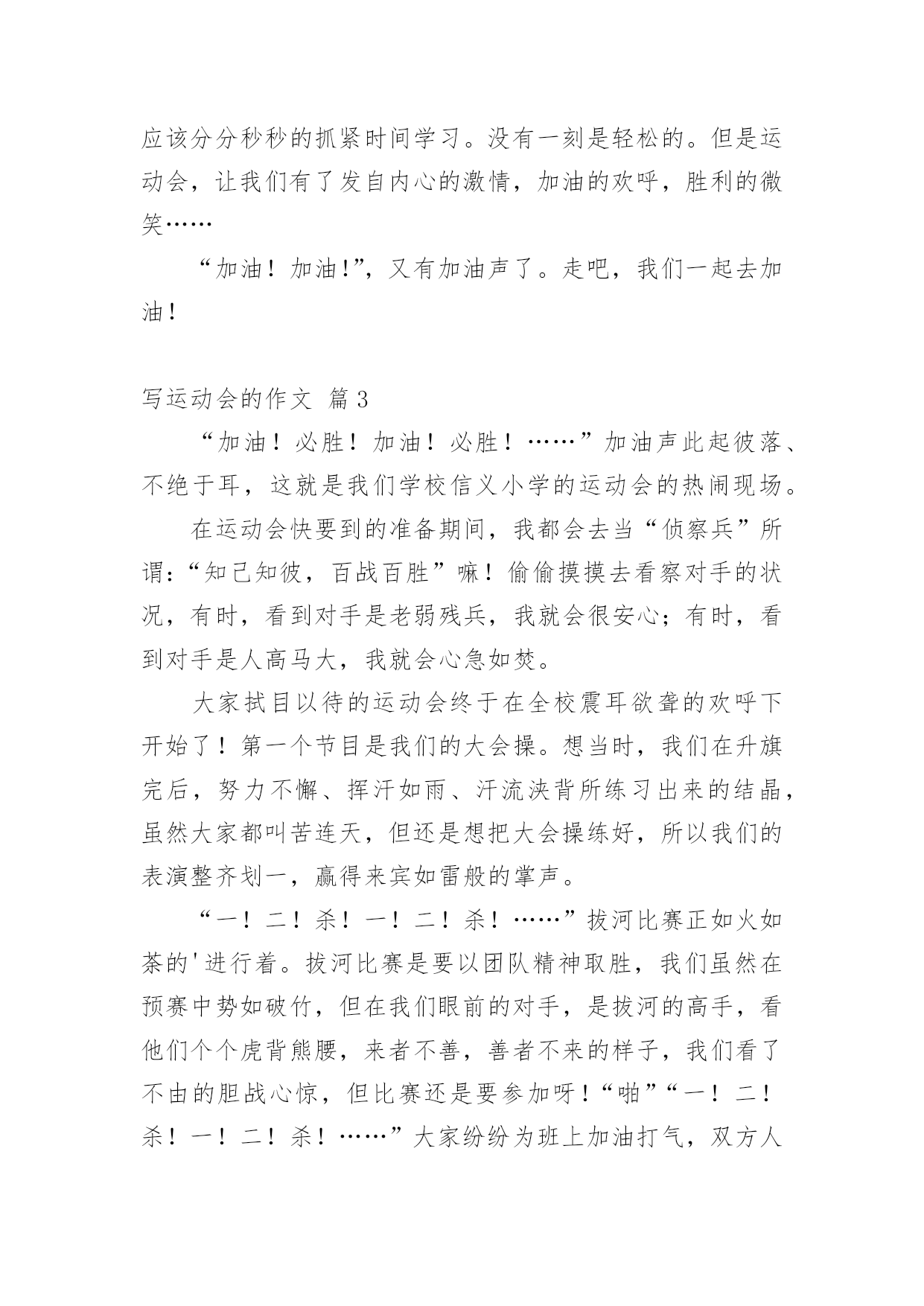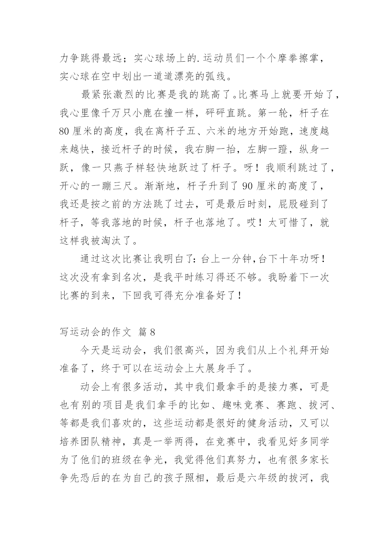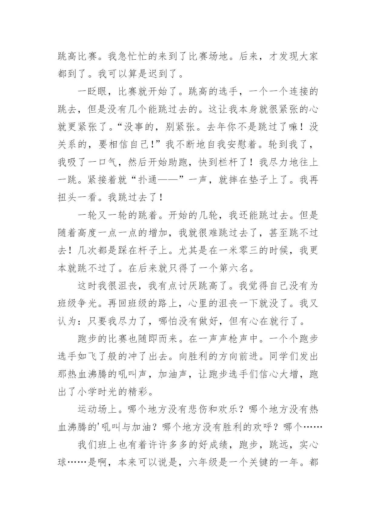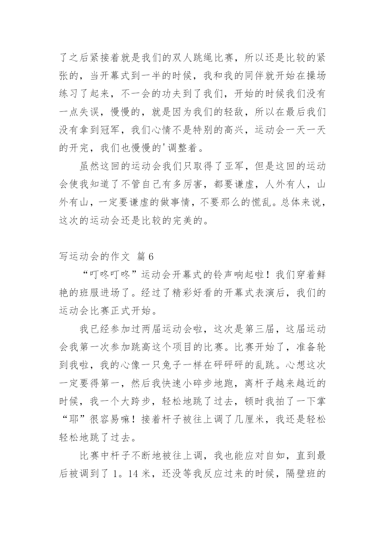 写运动会的作文【精华】写运动会的作文10篇在日常生活或是工作学习中,许多人都有过写作文的经历,对作文都不陌生吧,作文根据写作时限的不同可以分为限时作文和非限时作文。你所见过的作文是什么样的呢?下面是小编帮大家整理的写运动会的作文10篇,希望能够帮助到大家。写运动会的作文篇1周三,我们学校举行了运动会,割软泡的第一天,我来到了体育场,去参加我的项目比赛,也顺便为同学们加油、鼓劲!我怀着喜悦的心情,兴高采烈地来到了体育场,我站在体育场中间,东张西望,左顾右盼,寻找着同学,啊!她们在那!我向同学们“飞奔”而去,紧紧地抱住她们,就好像几年没见的朋友一样,好激动!我们在一起玩了一会儿,才想起了正事,“我好像是来练习的啊?”我想了起来,“对啊!”她们连声说道,我们如箭一般跑去,找到王老师后,我们开始了丢拾球的练习,“预备,开始!”只听口哨声从耳边响了起来,我疯跑过去,把三个乒乓球放入三个盘子里,绕过杆子,再将乒乓球拿在手心,传递给另一个同学,就这样,最后一个同学回到起点,王老师看了看时间,说到“嗯,这一次做得挺好,2分23秒。”“耶!”我们大声欢呼。正式的比赛开始了!我有一点点的小紧张,双腿抖个不停,裁判员大喊一声“开始!”我瞬间冲了出去,投入到比赛中,丢球,拾球,进行得很顺利,到后来把球稳稳地交到下一个同学手中,我终于松了一口气,紧接着我又急忙为同学加油助威,一开始跟别班不相上下,后来我们班遥遥领先了,可在最后的关键时刻,最后一个同学却掉了球,“啊!”第一离我们远去,加十秒啊,我一下子感到天都塌了!同学们个个唉声叹气,但只好接受命运,我们垂头丧气的离开了,还是为班里别的'运动员加油去吧,“我们既然输了,就要让其他同学们赢!”我心里想着,嘴里嘶声裂肺的喊着“加油、加油、加油!”我一定要让我们班成为20xx年的运动会团体第一名!写运动会的作文篇2一年一度的校园运动会又来了。大家也怀着好心情来到了学校。每个人都带着五颜六色的小板凳,说说笑笑的来到了学校。很快的,开幕式开始了。每一个班级在响亮的音乐中迈着正步铿锵有力地走着。紧接着就是罗校长,于校长为运动会致辞。在于海燕校长宣誓:“我宣布……运动会正式开始!”的时候,全校学生同时欢呼着!那几乎能把教学楼都能整塌了!同学们立刻地回到了自己的位置上。就在这时,运动会开始了。大家忙得不可开交。去准备比赛的,说话的,还在练习的……我也不例外。今天上午就有一场我要参加的跳高比赛。我急忙忙的来到了比赛场地。后来,才发现大家都到了。我可以算是迟到了。一眨眼,比赛就开始了。跳高的选手,一个一个连接的跳去,但是没有几个能跳过去的。这让我本身就很紧张的心就更紧张了。“没事的,别紧张。去年你不是跳过了嘛!没关系的,要相信自己!”我不断地自我安慰着。轮到我了,我吸了一口气,然后开始助跑,快到栏杆了!我尽力地往上一跳。紧接着就“扑通——”一声,就摔在垫子上了。我再扭头一看。我跳过去了!一轮又一轮的跳着。开始的几轮,我还能跳过去。但是随着高度一点一点的增加,我就很难跳过去了,甚至跳不过去!几次都是踩在杆子上。尤其是在一米零三的时候,我更本就跳不过了。在后来就只得了一个第六名。这时我很沮丧,我有点讨厌跳高了。我觉得自己没有为班级争光。再回班级的路上,心里的沮丧一下就没了。我又认为:只要我尽力了,哪怕没有做好,但有心在就行了。跑步的比赛也随即而来。在一声声枪声中。一个个跑步选手如飞了般的冲了出去。向胜利的方向前进。同学们发出那热血沸腾的吼叫声,加油声,让跑步选手们信心大增,跑出了小学时光的精彩。运动场上。哪个地方没有悲伤和欢乐?哪个地方没有热血沸腾的'吼叫与加油?哪个地方没有胜利的欢呼?哪个……我们班上也有着许许多多的好成绩,跑步,跳远,实心球……是啊,本来可以说是,六年级是一个关键的一年。都应该分分秒秒的抓紧时间学习。没有一刻是轻松的。但是运动会,让我们有了发自内心的激情,加油的欢呼,胜利的微笑……“加油!加油!”,又有加油声了。走吧,我们一起去加油!写运动会的作文篇3“加油!必胜!加油!必胜!……”加油声此起彼落、不绝于耳,这就是我们学校信义小学的运动会的热闹现场。在运动会快要到的准备期间,我都会去当“侦察兵”所谓:“知己知彼,百战百胜”嘛!偷偷摸摸去看察对手的状况,有时,看到对手是老弱残兵,我就会很安心;有时,看到对手是人高马大,我就会心急如焚。大家拭目以待的运动会终于在全校震耳欲聋的欢呼下开始了!第一个节目是我们的大会操。想当时,我们在升旗完后,努力不懈、挥汗如雨、汗流浃背所练习出来的结晶,虽然大家都叫苦连天,但还是想把大会操练好,所以我们的表演整齐划一,赢得来宾如雷般的掌声。“一!二!杀!一!二!杀!……”拔河比赛正如火如荼的'进行着。拔河比赛是要以团队精神取胜,我们虽然在预赛中势如破竹,但在我们眼前的对手,是拔