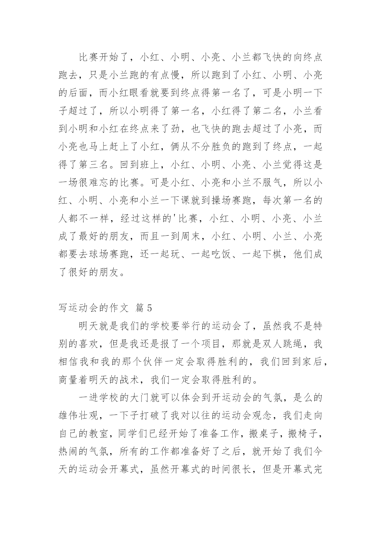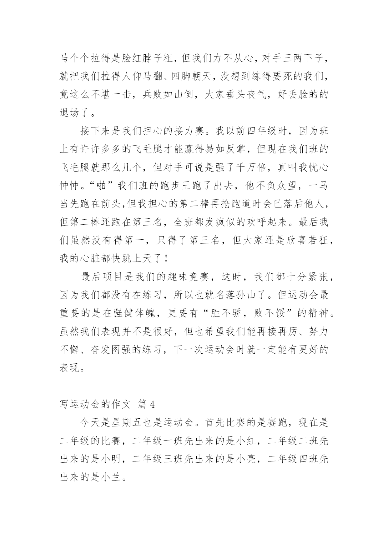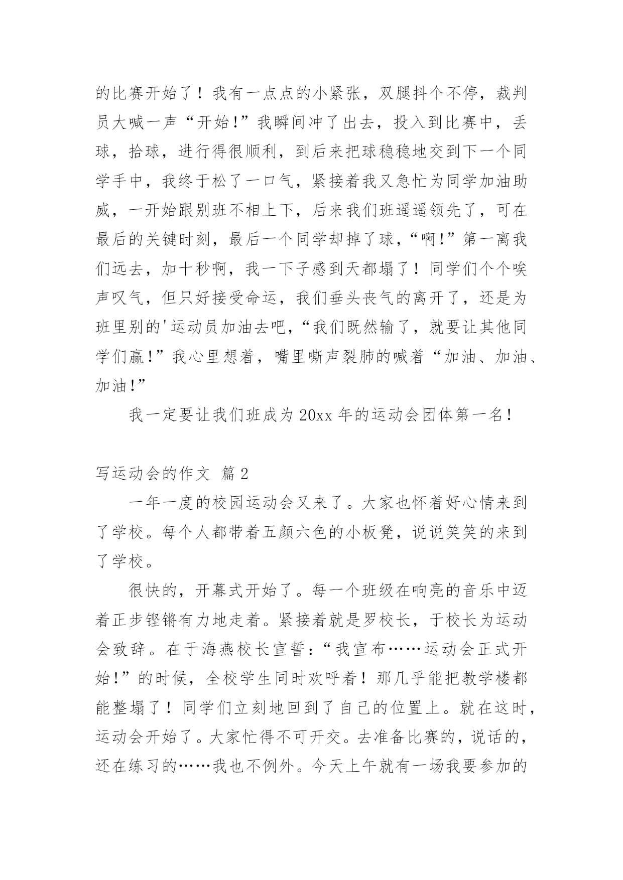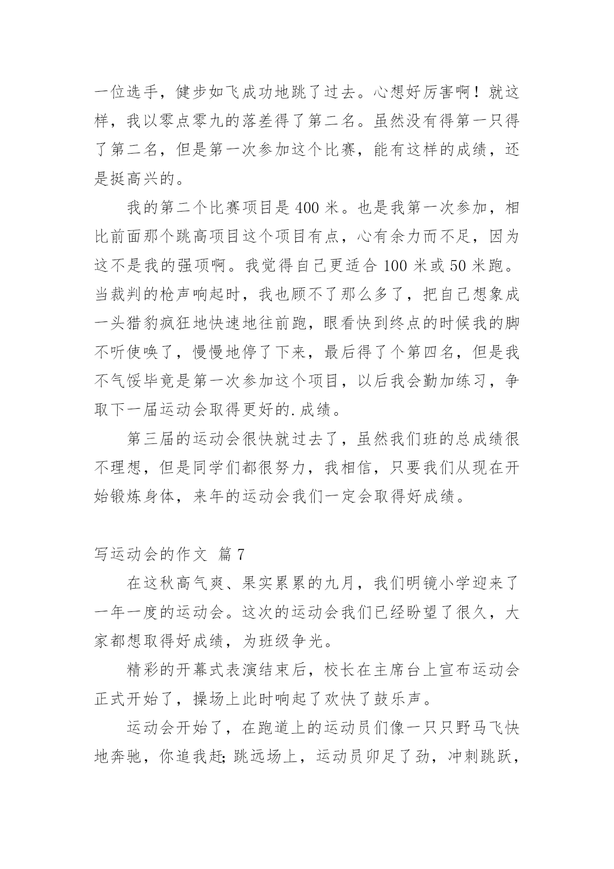 写运动会的作文【精华】写运动会的作文10篇在日常生活或是工作学习中,许多人都有过写作文的经历,对作文都不陌生吧,作文根据写作时限的不同可以分为限时作文和非限时作文。你所见过的作文是什么样的呢?下面是小编帮大家整理的写运动会的作文10篇,希望能够帮助到大家。写运动会的作文篇1周三,我们学校举行了运动会,割软泡的第一天,我来到了体育场,去参加我的项目比赛,也顺便为同学们加油、鼓劲!我怀着喜悦的心情,兴高采烈地来到了体育场,我站在体育场中间,东张西望,左顾右盼,寻找着同学,啊!她们在那!我向同学们“飞奔”而去,紧紧地抱住她们,就好像几年没见的朋友一样,好激动!我们在一起玩了一会儿,才想起了正事,“我好像是来练习的啊?”我想了起来,“对啊!”她们连声说道,我们如箭一般跑去,找到王老师后,我们开始了丢拾球的练习,“预备,开始!”只听口哨声从耳边响了起来,我疯跑过去,把三个乒乓球放入三个盘子里,绕过杆子,再将乒乓球拿在手心,传递给另一个同学,就这样,最后一个同学回到起点,王老师看了看时间,说到“嗯,这一次做得挺好,2分23秒。”“耶!”我们大声欢呼。正式的比赛开始了!我有一点点的小紧张,双腿抖个不停,裁判员大喊一声“开始!”我瞬间冲了出去,投入到比赛中,丢球,拾球,进行得很顺利,到后来把球稳稳地交到下一个同学手中,我终于松了一口气,紧接着我又急忙为同学加油助威,一开始跟别班不相上下,后来我们班遥遥领先了,可在最后的关键时刻,最后一个同学却掉了球,“啊!”第一离我们远去,加十秒啊,我一下子感到天都塌了!同学们个个唉声叹气,但只好接受命运,我们垂头丧气的离开了,还是为班里别的'运动员加油去吧,“我们既然输了,就要让其他同学们赢!”我心里想着,嘴里嘶声裂肺的喊着“加油、加油、加油!”我一定要让我们班成为20xx年的运动会团体第一名!写运动会的作文篇2一年一度的校园运动会又来了。大家也怀着好心情来到了学校。每个人都带着五颜六色的小板凳,说说笑笑的来到了学校。很快的,开幕式开始了。每一个班级在响亮的音乐中迈着正步铿锵有力地走着。紧接着就是罗校长,于校长为运动会致辞。在于海燕校长宣誓:“我宣布……运动会正式开始!”的时候,全校学生同时欢呼着!那几乎能把教学楼都能整塌了!同学们立刻地回到了自己的位置上。就在这时,运动会开始了。大家忙得不可开交。去准备比赛的,说话的,还在练习的……我也不例外。今天上午就有一场我要参加的跳高比赛。我急忙忙的来到了比赛场地。后来,才发现大家都到了。我可以算是迟到了。一眨眼,比赛就开始了。跳高的选手,一个一个连接的跳去,但是没有几个能跳过去的。这让我本身就很紧张的心就更紧张了。“没事的,别紧张。去年你不是跳过了嘛!没关系的,要相信自己!”我不断地自我安慰着。轮到我了,我吸了一口气,然后开始助跑,快到栏杆了!我尽力地往上一跳。紧接着就“扑通——”一声,就摔在垫子上了。我再扭头一看。我跳过去了!一轮又一轮的跳着。开始的几轮,我还能跳过去。但是随着高度一点一点的增加,我就很难跳过去了,甚至跳不过去!几次都是踩在杆子上。尤其是在一米零三的时候,我更本就跳不过了。在后来就只得了一个第六名。这时我很沮丧,我有点讨厌跳高了。我觉得自己没有为班级争光。再回班级的路上,心里的沮丧一下就没了。我又认为:只要我尽力了,哪怕没有做好,但有心在就行了。跑步的比赛也随即而来。在一声声枪声中。一个个跑步选手如飞了般的冲了出去。向胜利的方向前进。同学们发出那热血沸腾的吼叫声,加油声,让跑步选手们信心大增,跑出了小学时光的精彩。运动场上。哪个地方没有悲伤和欢乐?哪个地方没有热血沸腾的'吼叫与加油?哪个地方没有胜利的欢呼?哪个……我们班上也有着许许多多的好成绩,跑步,跳远,实心球……是啊,本来可以说是,六年级是一个关键的一年。都应该分分秒秒的抓紧时间学习。没有一刻是轻松的。但是运动会,让我们有了发自内心的激情,加油的欢呼,胜利的微笑……“加油!加油!”,又有加油声了。走吧,我们一起去加油!写运动会的作文篇3“加油!必胜!加油!必胜!……”加油声此起彼落、不绝于耳,这就是我们学校信义小学的运动会的热闹现场。在运动会快要到的准备期间,我都会去当“侦察兵”所谓:“知己知彼,百战百胜”嘛!偷偷摸摸去看察对手的状况,有时,看到对手是老弱残兵,我就会很安心;有时,看到对手是人高马大,我就会心急如焚。大家拭目以待的运动会终于在全校震耳欲聋的欢呼下开始了!第一个节目是我们的大会操。想当时,我们在升旗完后,努力不懈、挥汗如雨、汗流浃背所练习出来的结晶,虽然大家都叫苦连天,但还是想把大会操练好,所以我们的表演整齐划一,赢得来宾如雷般的掌声。“一!二!杀!一!二!杀!……”拔河比赛正如火如荼的'进行着。拔河比赛是要以团队精神取胜,我们虽然在预赛中势如破竹,但在我们眼前的对手,是拔