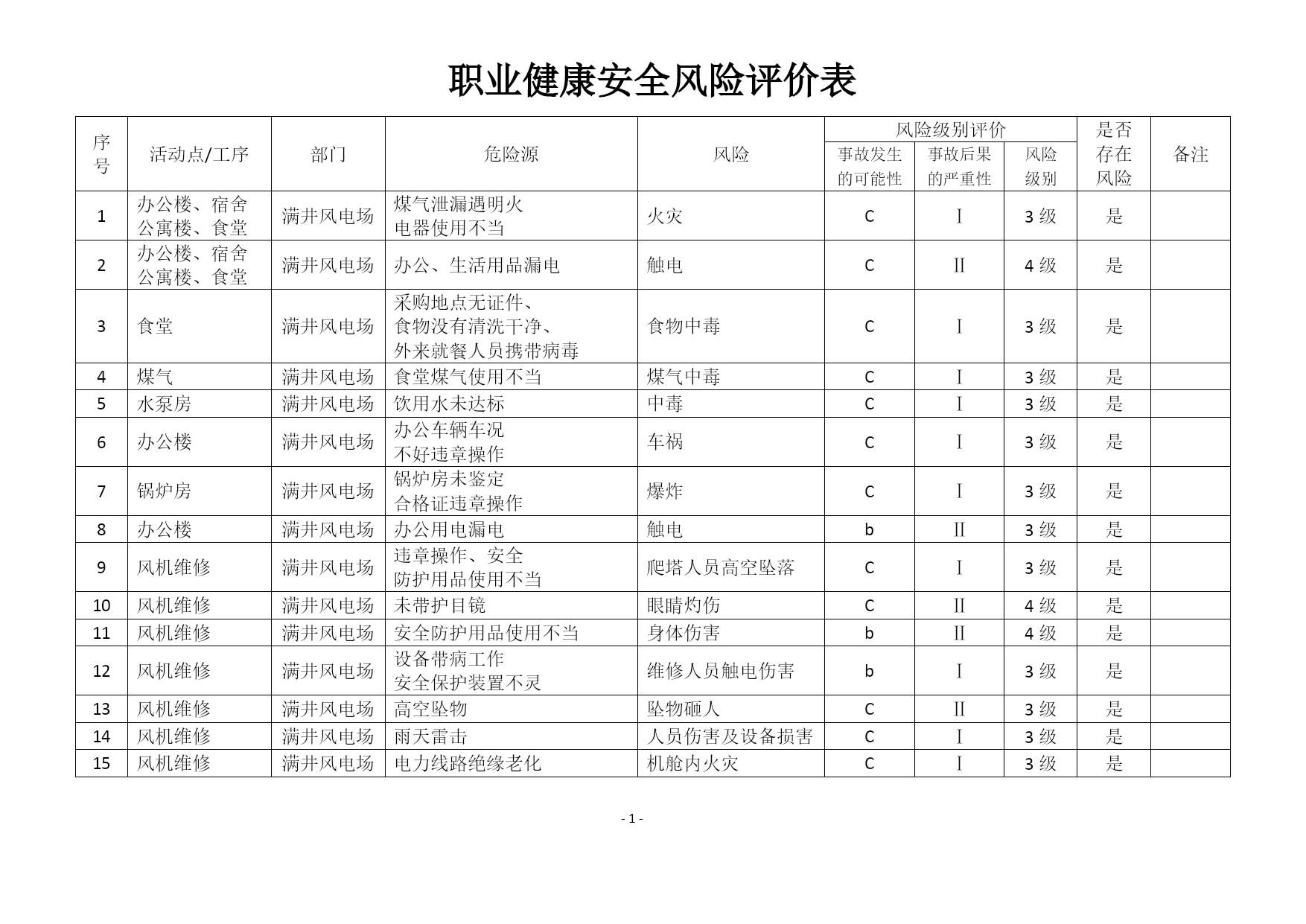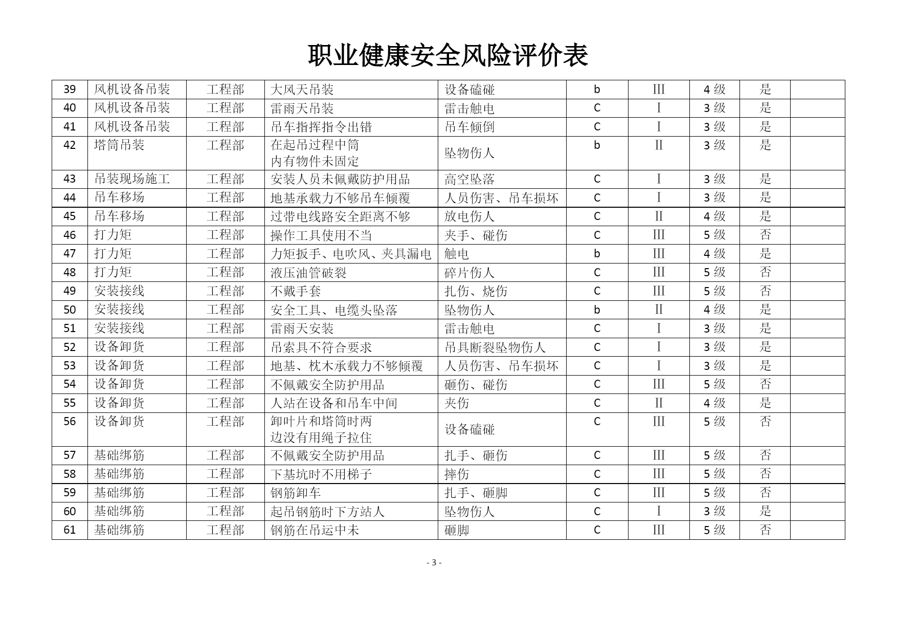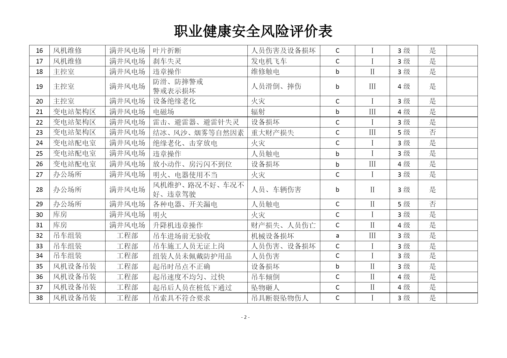 职业健康安全风险评价表-PAGE6-序号活动点/工序部门危险源风险风险级别评价是否存在风险备注事故发生的可能性事故后果的严重性风险级别1办公楼、宿舍公寓楼、食堂满井风电场煤气泄漏遇明火电器使用不当火灾CⅠ3级是2办公楼、宿舍公寓楼、食堂满井风电场办公、生活用品漏电触电CⅡ4级是3食堂满井风电场采购地点无证件、食物没有清洗干净、外来就餐人员携带病毒食物中毒CⅠ3级是4煤气满井风电场食堂煤气使用不当煤气中毒CⅠ3级是5水泵房满井风电场饮用水未达标中毒CⅠ3级是6办公楼满井风电场办公车辆车况不好违章操作车祸CⅠ3级是7锅炉房满井风电场锅炉房未鉴定合格证违章操作爆炸CⅠ3级是8办公楼满井风电场办公用电漏电触电bⅡ3级是9风机维修满井风电场违章操作、安全防护用品使用不当爬塔人员高空坠落CⅠ3级是10风机维修满井风电场未带护目镜眼睛灼伤CⅡ4级是11风机维修满井风电场安全防护用品使用不当身体伤害bⅡ4级是12风机维修满井风电场设备带病工作安全保护装置不灵维修人员触电伤害bⅠ3级是13风机维修满井风电场高空坠物坠物砸人CⅡ3级是14风机维修满井风电场雨天雷击人员伤害及设备损害CⅠ3级是15风机维修满井风电场电力线路绝缘老化机舱内火灾CⅠ3级是16风机维修满井风电场叶片折断人员伤害及设备损坏CⅠ3级是17风机维修满井风电场刹车失灵发电机飞车CⅠ3级是18主控室满井风电场违章操作维修触电bⅡ3级是19主控室满井风电场防滑、防摔警戒警戒表示损坏人员滑倒、摔伤bⅢ4级是20主控室满井风电场设备绝缘老化火灾CⅠ3级是21变电站架构区满井风电场电磁场辐射bⅢ4级是22变电站架构区满井风电场雷击、避雷器、避雷针失灵设备损坏CⅠ3级是23变电站架构区满井风电场结冰、风沙、烟雾等自然因素重大财产损失CⅢ5级否24变电站配电室满井风电场绝缘老化、击穿放电火灾CⅠ3级是25变电站配电室满井风电场违章操作人员触电bⅠ3级是26变电站配电室满井风电场放小动作、房污闪不到位设备损坏bⅢ4级是27办公场所满井风电场明火、电器使用不当火灾CⅠ3级是28办公场所满井风电场风机维护、路况不好、车况不好、违章驾驶人员、车辆伤害bⅡ3级是29办公场所满井风电场各种电器、开关漏电人员触电CⅡ5级否30库房满井风电场明火火灾CⅠ3级是31库房满井风电场升降机违章操作财产损失、人员伤亡CⅡ4级是32吊车组装工程部吊车进场前无验收机械设备损坏aⅢ3级是33吊车组装工程部吊车施工人员无证上岗人员伤害、设备损坏CⅠ3级是34吊车组装工程部组装人员未佩戴防护用品人员伤害CⅠ3级是35风机设备吊装工程部起吊时吊点不正确设备损坏bⅡ3级是36风机设备吊装工程部起吊速度不均匀、过快吊车倾倒CⅡ4级是37风机设备吊装工程部起吊后人员在桩低下通过坠物砸人CⅡ4级是38风机设备吊装工程部吊索具不符合要求吊具断裂坠物伤人CⅠ3级是39风机设备吊装工程部大风天吊装设备磕碰bⅢ4级是40风机设备吊装工程部雷雨天吊装雷击触电CⅠ3级是41风机设备吊装工程部吊车指挥指令出错吊车倾倒CⅠ3级是42塔筒吊装工程部在起吊过程中筒内有物件未固定坠物伤人bⅡ3级是43吊装现场施工工程部安装人员未佩戴防护用品高空坠落CⅠ3级是44吊车移场工程部地基承载力不够吊车倾覆人员伤害、吊车损坏CⅠ3级是45吊车移场工程部过带电线路安全距离不够放电伤人CⅡ4级是46打力矩工程部操作工具使用不当夹手、碰伤CⅢ5级否47打力矩工程部力矩扳手、电吹风、夹具漏电触电bⅢ4级是48打力矩工程部液压油管破裂碎片伤人CⅢ5级否49安装接线工程部不戴手套扎伤、烧伤CⅢ5级否50安装接线工程部安全工具、电缆头坠落坠物伤人bⅡ4级是51安装接线工程部雷雨天安装雷击触电CⅠ3级是52设备卸货工程部吊索具不符合要求吊具断裂坠物伤人CⅠ3级是53设备卸货工程部地基、枕木承载力不够倾覆人员伤害、吊车损坏CⅠ3级是54设备卸货工程部不佩戴安全防护用品砸伤、碰伤CⅢ5级否55设备卸货工程部人站在设备和吊车中间夹伤CⅡ4级是56设备卸货工程部卸叶片和塔筒时两边没有用绳子拉住设备磕碰CⅢ5级否57基础绑筋工程部不佩戴安全防护用品扎手、砸伤CⅢ5级否58基础绑筋工程部下基坑时不用梯子摔伤CⅢ5级否59基础绑筋工程部钢筋卸车扎手、砸脚CⅢ5级否60基础绑筋工程部起吊钢筋时下方站人坠物伤人CⅠ3级是61基础绑筋工程部钢筋在吊运中未降到1米就靠近砸脚CⅢ5级否62基础绑筋工程部在钢筋骨架上行走摔伤、砸脚CⅢ5级否63钢筋切割加工工程部切割机附近堆放易燃物品火灾CⅠ3级是64钢筋切割加工工程部切割机无火星挡板人员灼伤CⅠ3级是65钢筋切割加工工程部钢筋送入后叶轮太近伤手CⅠ3级是66钢筋切割加工工程部剪切超过铭牌规定直径的料设备损坏CⅢ5
