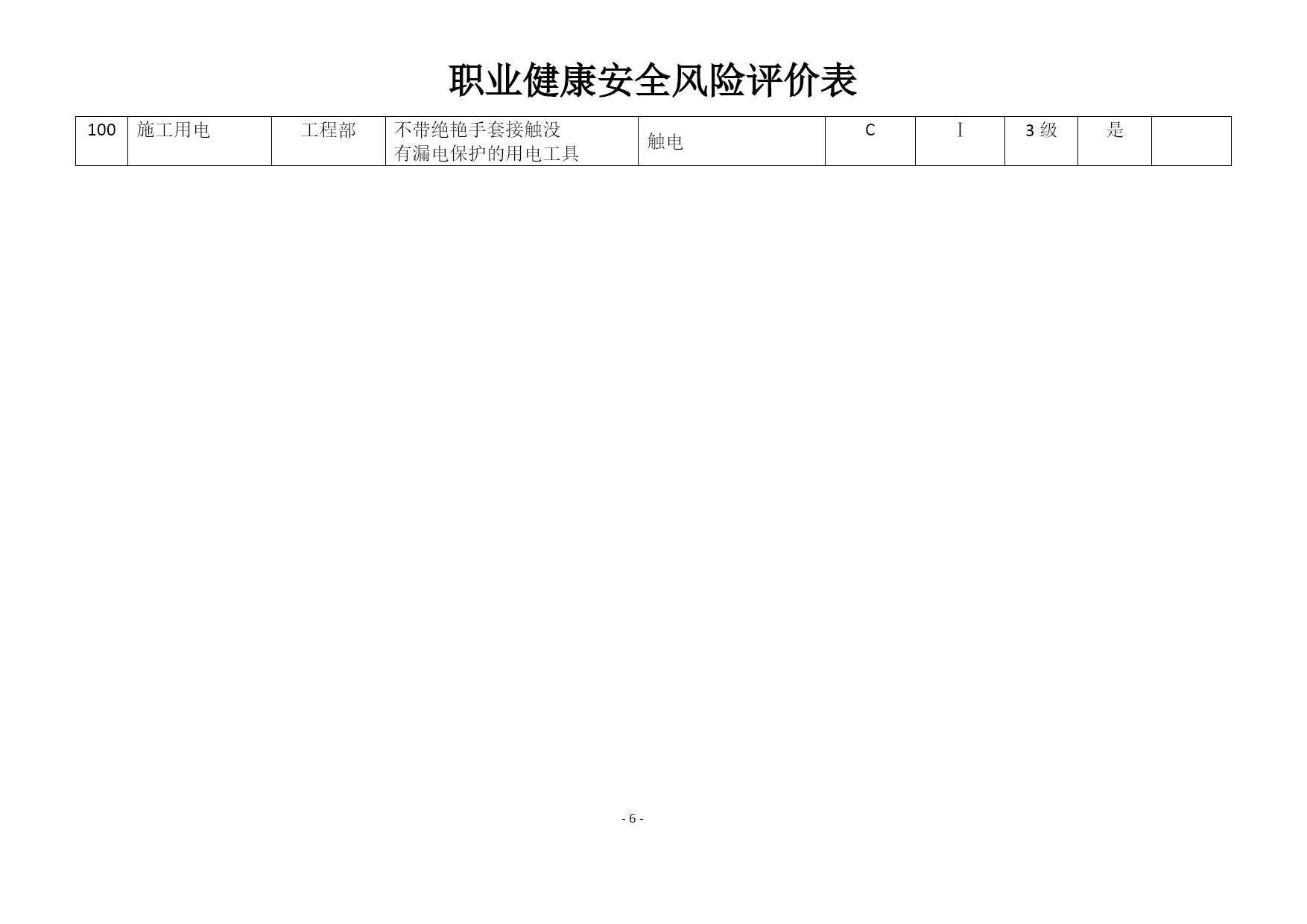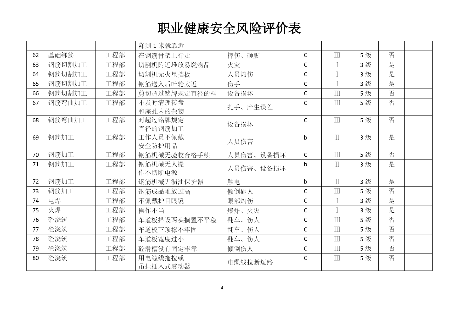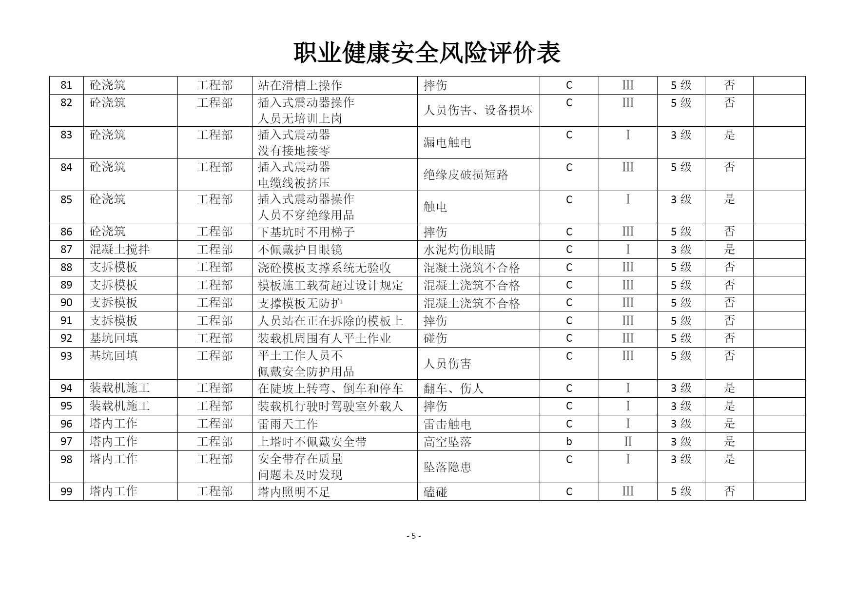 职业健康安全风险评价表-PAGE6-序号活动点/工序部门危险源风险风险级别评价是否存在风险备注事故发生的可能性事故后果的严重性风险级别1办公楼、宿舍公寓楼、食堂满井风电场煤气泄漏遇明火电器使用不当火灾CⅠ3级是2办公楼、宿舍公寓楼、食堂满井风电场办公、生活用品漏电触电CⅡ4级是3食堂满井风电场采购地点无证件、食物没有清洗干净、外来就餐人员携带病毒食物中毒CⅠ3级是4煤气满井风电场食堂煤气使用不当煤气中毒CⅠ3级是5水泵房满井风电场饮用水未达标中毒CⅠ3级是6办公楼满井风电场办公车辆车况不好违章操作车祸CⅠ3级是7锅炉房满井风电场锅炉房未鉴定合格证违章操作爆炸CⅠ3级是8办公楼满井风电场办公用电漏电触电bⅡ3级是9风机维修满井风电场违章操作、安全防护用品使用不当爬塔人员高空坠落CⅠ3级是10风机维修满井风电场未带护目镜眼睛灼伤CⅡ4级是11风机维修满井风电场安全防护用品使用不当身体伤害bⅡ4级是12风机维修满井风电场设备带病工作安全保护装置不灵维修人员触电伤害bⅠ3级是13风机维修满井风电场高空坠物坠物砸人CⅡ3级是14风机维修满井风电场雨天雷击人员伤害及设备损害CⅠ3级是15风机维修满井风电场电力线路绝缘老化机舱内火灾CⅠ3级是16风机维修满井风电场叶片折断人员伤害及设备损坏CⅠ3级是17风机维修满井风电场刹车失灵发电机飞车CⅠ3级是18主控室满井风电场违章操作维修触电bⅡ3级是19主控室满井风电场防滑、防摔警戒警戒表示损坏人员滑倒、摔伤bⅢ4级是20主控室满井风电场设备绝缘老化火灾CⅠ3级是21变电站架构区满井风电场电磁场辐射bⅢ4级是22变电站架构区满井风电场雷击、避雷器、避雷针失灵设备损坏CⅠ3级是23变电站架构区满井风电场结冰、风沙、烟雾等自然因素重大财产损失CⅢ5级否24变电站配电室满井风电场绝缘老化、击穿放电火灾CⅠ3级是25变电站配电室满井风电场违章操作人员触电bⅠ3级是26变电站配电室满井风电场放小动作、房污闪不到位设备损坏bⅢ4级是27办公场所满井风电场明火、电器使用不当火灾CⅠ3级是28办公场所满井风电场风机维护、路况不好、车况不好、违章驾驶人员、车辆伤害bⅡ3级是29办公场所满井风电场各种电器、开关漏电人员触电CⅡ5级否30库房满井风电场明火火灾CⅠ3级是31库房满井风电场升降机违章操作财产损失、人员伤亡CⅡ4级是32吊车组装工程部吊车进场前无验收机械设备损坏aⅢ3级是33吊车组装工程部吊车施工人员无证上岗人员伤害、设备损坏CⅠ3级是34吊车组装工程部组装人员未佩戴防护用品人员伤害CⅠ3级是35风机设备吊装工程部起吊时吊点不正确设备损坏bⅡ3级是36风机设备吊装工程部起吊速度不均匀、过快吊车倾倒CⅡ4级是37风机设备吊装工程部起吊后人员在桩低下通过坠物砸人CⅡ4级是38风机设备吊装工程部吊索具不符合要求吊具断裂坠物伤人CⅠ3级是39风机设备吊装工程部大风天吊装设备磕碰bⅢ4级是40风机设备吊装工程部雷雨天吊装雷击触电CⅠ3级是41风机设备吊装工程部吊车指挥指令出错吊车倾倒CⅠ3级是42塔筒吊装工程部在起吊过程中筒内有物件未固定坠物伤人bⅡ3级是43吊装现场施工工程部安装人员未佩戴防护用品高空坠落CⅠ3级是44吊车移场工程部地基承载力不够吊车倾覆人员伤害、吊车损坏CⅠ3级是45吊车移场工程部过带电线路安全距离不够放电伤人CⅡ4级是46打力矩工程部操作工具使用不当夹手、碰伤CⅢ5级否47打力矩工程部力矩扳手、电吹风、夹具漏电触电bⅢ4级是48打力矩工程部液压油管破裂碎片伤人CⅢ5级否49安装接线工程部不戴手套扎伤、烧伤CⅢ5级否50安装接线工程部安全工具、电缆头坠落坠物伤人bⅡ4级是51安装接线工程部雷雨天安装雷击触电CⅠ3级是52设备卸货工程部吊索具不符合要求吊具断裂坠物伤人CⅠ3级是53设备卸货工程部地基、枕木承载力不够倾覆人员伤害、吊车损坏CⅠ3级是54设备卸货工程部不佩戴安全防护用品砸伤、碰伤CⅢ5级否55设备卸货工程部人站在设备和吊车中间夹伤CⅡ4级是56设备卸货工程部卸叶片和塔筒时两边没有用绳子拉住设备磕碰CⅢ5级否57基础绑筋工程部不佩戴安全防护用品扎手、砸伤CⅢ5级否58基础绑筋工程部下基坑时不用梯子摔伤CⅢ5级否59基础绑筋工程部钢筋卸车扎手、砸脚CⅢ5级否60基础绑筋工程部起吊钢筋时下方站人坠物伤人CⅠ3级是61基础绑筋工程部钢筋在吊运中未降到1米就靠近砸脚CⅢ5级否62基础绑筋工程部在钢筋骨架上行走摔伤、砸脚CⅢ5级否63钢筋切割加工工程部切割机附近堆放易燃物品火灾CⅠ3级是64钢筋切割加工工程部切割机无火星挡板人员灼伤CⅠ3级是65钢筋切割加工工程部钢筋送入后叶轮太近伤手CⅠ3级是66钢筋切割加工工程部剪切超过铭牌规定直径的料设备损坏CⅢ5