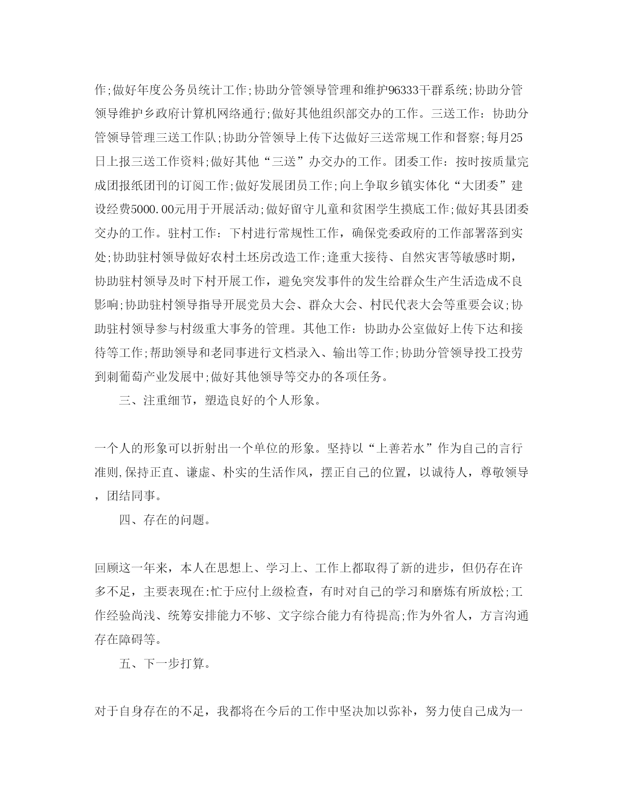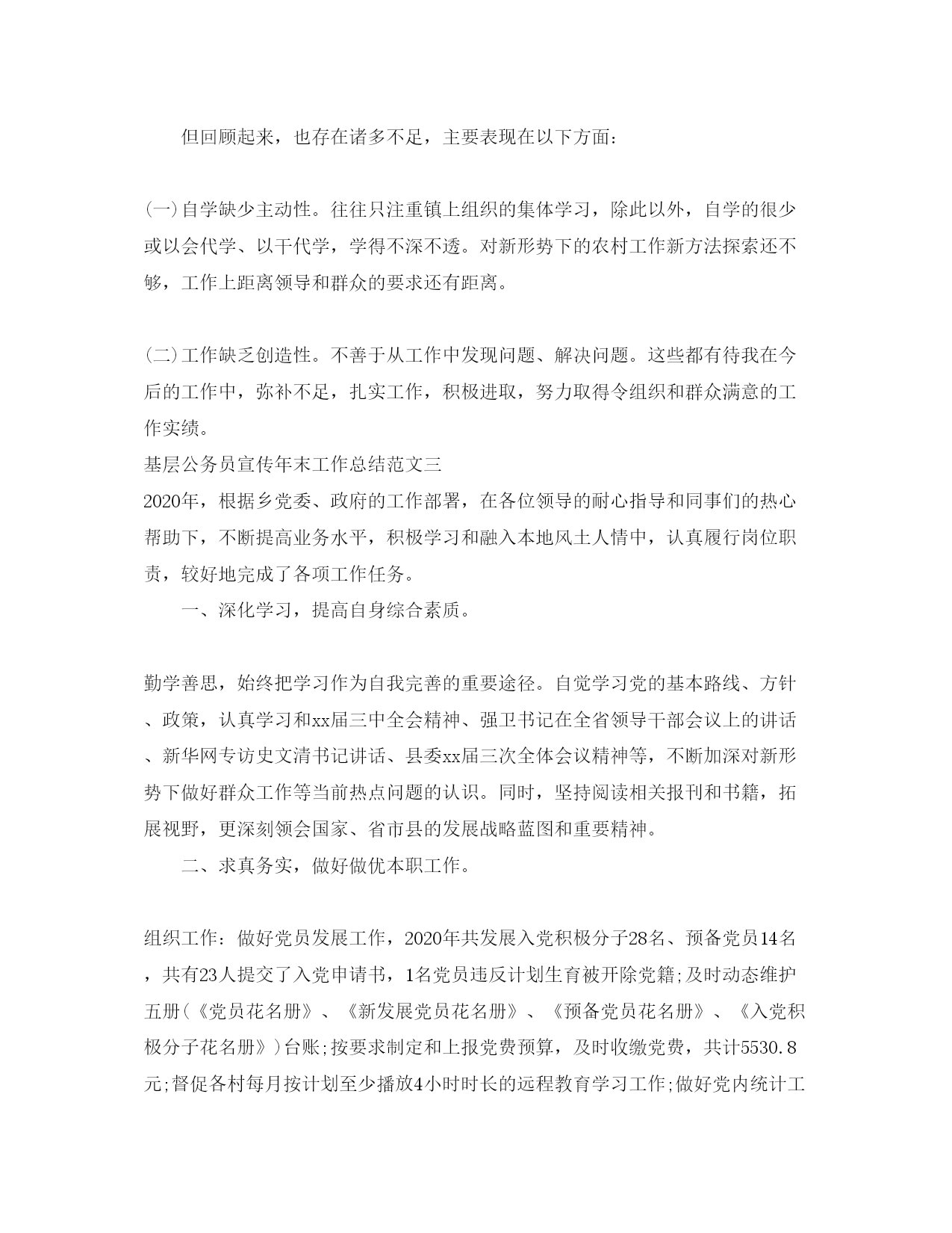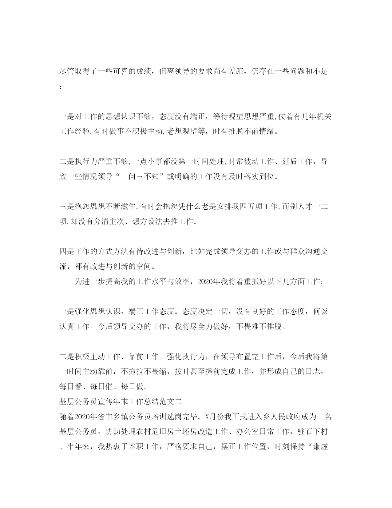 此资料由网络收集而来,如有侵权请告知上传者立即删除。资料共分享,我们负责传递知识。基层公务员宣传年末工作总结基层公务员是国家进行公共管理的最直接、最基础、最具体的“执行者”,尤其是乡镇公务员,他们直接面对广大人民群众,为广大人民群众提供服务。今天小编给大家整理了基层公务员宣传年末工作总结,希望对大家有所帮助。基层公务员宣传年末工作总结范文一我在开发区党政办公室工作,主要从事信息督查工作;9月份至今,根据省公务员考试成绩及组织安排,我进入县乡政府工作。3个多月时间,在乡领导的细心关怀与精心指导以及同事的精诚合作、耐心帮助下,本人深入贯彻落实领导指示及相关文件精神,按照各项工作要求,强化思想认识、狠抓工作落实,努力拼搏、奋勇向前,较好的完成了本年度自己的工作任务,也为推动我乡各项工作的顺利完成贡献出了自己应有力量。现将本人9月份以来工作情况汇报如下:一、主要工作成效9月份以来,根据领导安排,我主要负责综治工作及协助党政办主任处理办公室有关工作。同时,跟随政府副乡长刘福海及规划所长驻点村开展“三送”工作。所做工作可概括为“五个紧抓”:紧抓“三送”工作,全面服务群众。一是坚持上门走访,化解矛盾纠纷。9月份以来,坚持每周下村3-5次,多次上门走访所包农户,协助村民化解矛盾纠纷3起。二是协助开展了村第二、三、四批土坯房改造验收工作,总计19户,全部做好了“一户一档”,并及时更新了土坯房改造系统平台信息。三是协助做好了柑橘黄龙病普查防控工作,总计普查出病株200余株,涉及50余户农户,目前大多数已喷洒农药,并砍除了病株。四是协助做好了合作医疗收费、扶贫及经济普查等有关工作。紧抓维稳工作,确保和谐平安。一是制定印发了《乡信访问题和矛盾纠纷领导干部包案工作方案》,将全乡信访问题和矛盾纠纷一一分解包案,确保案件及时化解销号。二是制定印发了《乡重点人员稳控责任分解表》,对全乡重点人员明确了责任领导和具体责任人。三是做好了每月矛盾纠纷排查报表的汇总报送工作。四是在国庆、xx届三中全会及省委巡视组在巡视期间,参与了办公室应急值班,做到在岗在位,并按时向县委政法委及县信访局进行“零报告”。紧抓安全生产及火灾防控工作,确保长治久安。一是协助召开了全乡安全生产、火灾防控工作会议,制定了《乡安全生产大检查工作方案》、《乡今冬明春火灾防控工作方案》等。二是积极参与了安全生产及火灾防控大检查活动,与各村、乡直单位、重点企业商户签订了安全生产、消防管理责任书。同时,对全乡企业、商店、学校、人员密集场所、重要公共基础设施等进行了全面排查,对部分企业商户非法生产经营行为进行了教育,下发了《整改通知书》共38份,目前大多数已整改到位。紧抓办公室工作,帮领导分忧解难。根据领导安排,我作为办公室副主任协助主任开展有关工作。9月份以来,收发文件30余次,协助召开会议10余次,接待相关客人40余批,发送有关信息30余次,有效做好了领导的副手。紧抓信息报送,强化责任意识。一是紧急信息随时报。通过不断强化责任意识,一旦发生紧急信访维稳信息,我都第一时间向乡领导报告,并根据指示及时向县委政法委、县信访局报送相关信息。9月份以来,共向上报送各类信息32条,如华山村彭屋组及横龙组村民与华山电站发生纠纷、石下村村民罗斌发生交通事故一事等都第一时间上报了县里相关部门。二是一般信息按时报。按照工作要求,我紧抓日常信息报送,主要涉及相关业务工作、土坯房改造及柑橘黄龙病防控等工作。9月份以来,我向《手机报》报送信息8条,已采用4条。二、存在问题及下一步工作打算尽管取得了一些可喜的成绩,但离领导的要求尚有差距,仍存在一些问题和不足:一是对工作的思想认识不够,态度没有端正,等待观望思想严重,仗着有几年机关工作经验,有时做事不积极主动,老想观望等,时有推脱不前情绪。二是执行力严重不够,一点小事都没第一时间处理,时常被动工作、延后工作,导致一些情况领导“一问三不知”或明确的工作没有及时落实到位。三是抱怨思想不断滋生,有时会抱怨凭什么老是安排我四五项工作,而别人才一二项,却没有分清主次、想方设法去推工作。四是工作的方式方法有待改进与创新,比如完成领导交办的工作或与群众沟通交流,都有改进与创新的空间。为进一步提高我的工作水平与效率,2020年我将着重抓好以下几方面工作:一是强化思想认识,端正工作态度。态度决定一切,没有良好的工作态度,何谈认真工作。今后领导交办的工作,我将尽全力做好,不畏难不推脱。二是积极主动工作、靠前工作。强化执行力,在领导布置完工作后,今后我将第一时间主动靠前,不拖拉不畏缩,按时甚至提前完成工作,并形成自己的日志,每日看、每日催、每日做。基层公务员宣传年末工作总结范文二随着2020年省市乡镇公务员培训选岗完毕。X月份我正式进入乡人民政府成为一名基层公务
