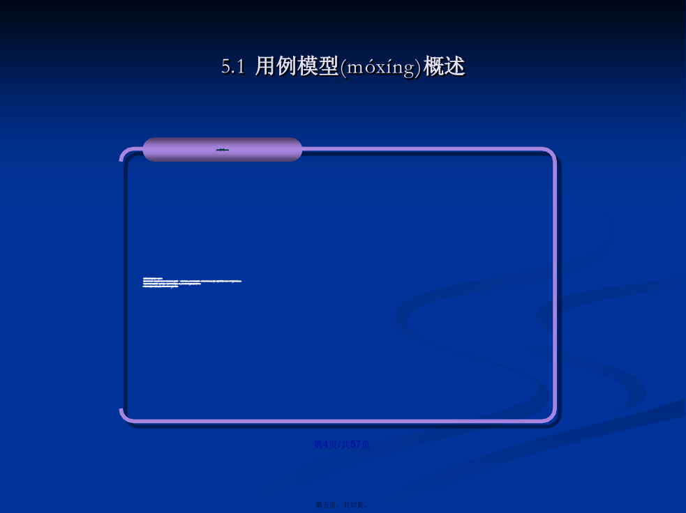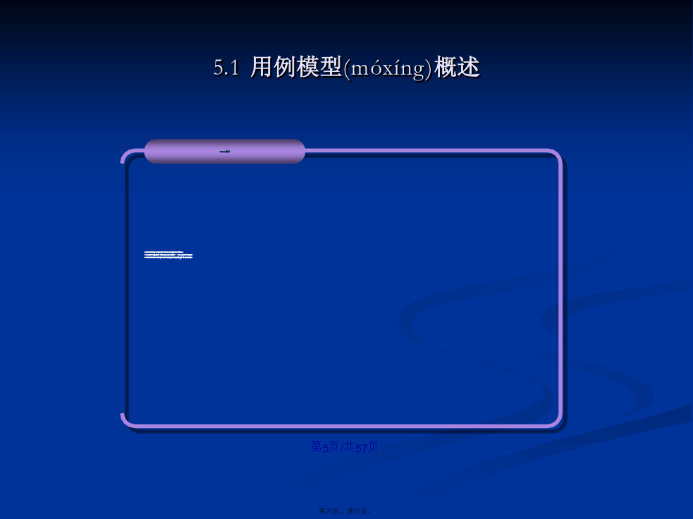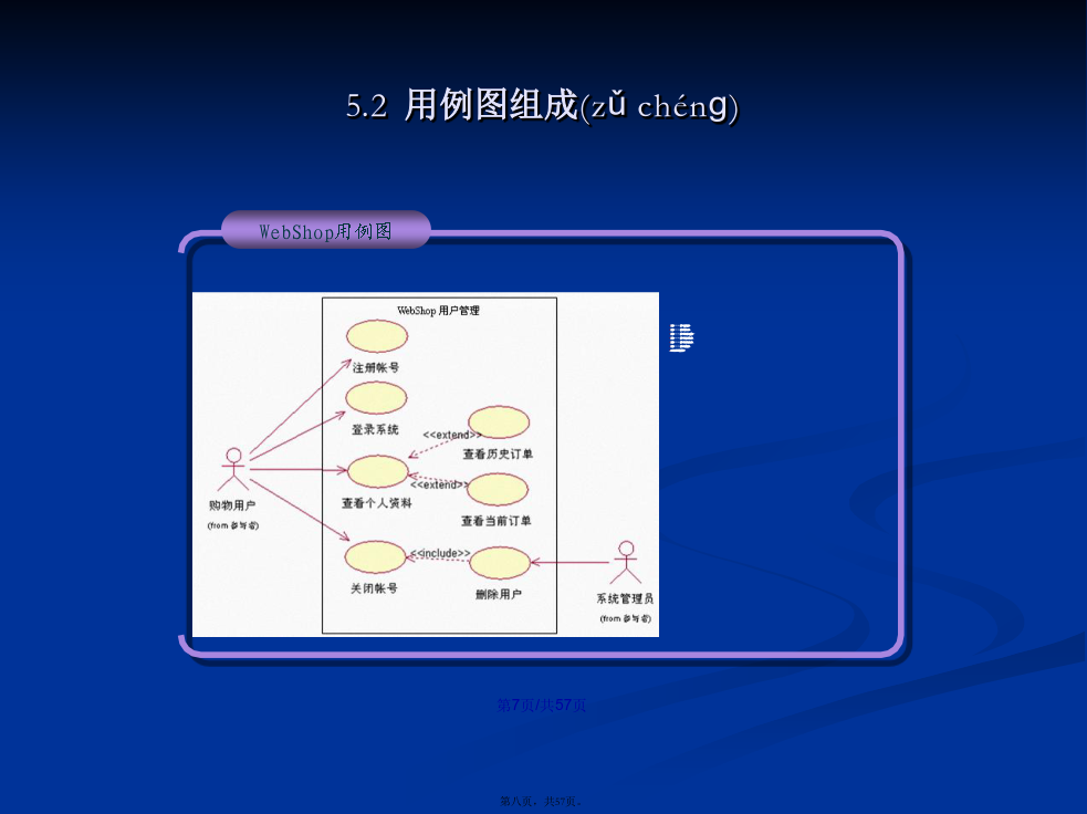 会计学本章(běnzhānɡ)学习要点任务(rènwu)15.1用例模型(móxíng)概述5.1用例模型(móxíng)概述5.1用例模型(móxíng)概述任务(rènwu)25.2用例图组成(zǔchénɡ)参与者参与者参与者参与者系统(xìtǒng)用例用例课堂(kètáng)实践1任务(rènwu)3识别(shíbié)用例识别(shíbié)用例识别(shíbié)用例识别(shíbié)用例识别(shíbié)用例绘制(huìzhì)WebShop用例图绘制(huìzhì)WebShop用例图绘制(huìzhì)WebShop用例图绘制(huìzhì)WebShop用例图绘制(huìzhì)WebShop用例图绘制(huìzhì)WebShop用例图绘制(huìzhì)WebShop用例图绘制(huìzhì)WebShop用例图通过包对用例进行合理(hélǐ)规划用例图(不含关系(guānxì))用例图(不含关系(guānxì))用例图(不含关系(guānxì))用例图(不含关系(guānxì))用例图(不含关系(guānxì))用例描述(miáoshù)用例描述(miáoshù)用例描述(miáoshù)课堂(kètáng)实践2任务(rènwu)4泛化关系(guānxì)泛化关系(guānxì)使用(shǐyòng)关系包含(bāohán)关系扩展(kuòzhǎn)关系扩展(kuòzhǎn)关系关系(guānxì)小结关系(guānxì)小结关系(guānxì)小结用例图(含关系(guānxì))用例图(含关系(guānxì))用例图(含关系(guānxì))用例图(含关系(guānxì))课堂(kètáng)实践3课堂(kètáng)实践3课外(kèwài)拓展