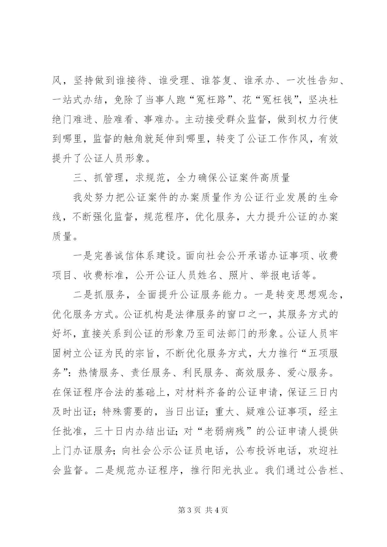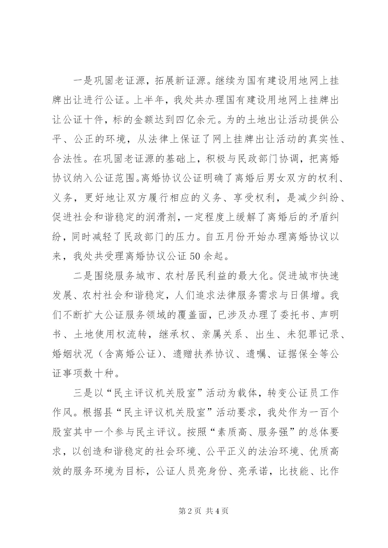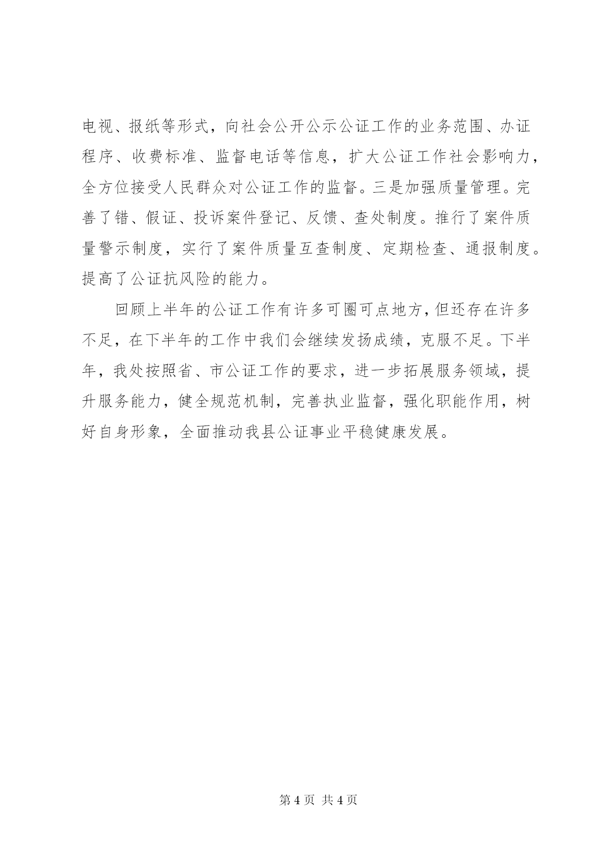 第PAGE\*Arabic\*MERGEFORMAT4页共NUMPAGES\*MERGEFORMAT4页司法局公证处工作总结上半年,我处在县司法局党组的正确领导和上级公证业务科的大力指导和热心关怀下,全体公证人员紧跟经济社会大发展的时代步伐,忠于法律尽职履责,恪守客观、公正的原则,围绕“拓展、规范、做强、做大”的思路,求真务实,扎实工作,取得了可喜的成绩。现将上半年的工作总结汇报如下:一、基本情况上半年我处共办证134件,收费共计43600元。其中国内公证80件,收费计36000元;涉外公证32件,收费计3600元;涉及港澳台公证22件,收费计4000元。所有公证无一例假证、错证出现,未接一例投诉案件。第二季度共办证53件,收费共计11160元。其中国内公证30件,收费计7560元;涉外公证32件,收费计1200元;涉港澳台9件,收费计2400元。针对经济困难等特殊情况的申办人员,上半年我处共办理3件法律援助案件,减免金额1200元。一定程度上为经济困难人员提供了帮助,缓解了社会压力。二、主要特点诚信是公证之灵魂,质量是公证之命脉,务实是公证之基础。随着人民追求法律服务需求与日俱增,我处本着与时俱进,利民服务、高效服务,扎实服务,不断满足人民群众的生活需求。一是巩固老证源,拓展新证源。继续为国有建设用地网上挂牌出让进行公证。上半年,我处共办理国有建设用地网上挂牌出让公证十件,标的金额达到四亿余元。为的土地出让活动提供公平、公正的环境,从法律上保证了网上挂牌出让活动的真实性、合法性。在巩固老证源的基础上,积极与民政部门协调,把离婚协议纳入公证范围。离婚协议公证明确了离婚后男女双方的权利、义务,更好地让双方履行相应的义务、享受权利,是减少纠纷、促进社会和谐稳定的润滑剂,一定程度上缓解了离婚后的矛盾纠纷,同时减轻了民政部门的压力。自五月份开始办理离婚协议以来,我处共受理离婚协议公证50余起。二是围绕服务城市、农村居民利益的最大化。促进城市快速发展、农村社会和谐稳定,人们追求法律服务需求与日俱增。我们不断扩大公证服务领域的覆盖面,已涉及办理了委托书、声明书、土地使用权流转,继承权、亲属关系、出生、未犯罪记录、婚姻状况(含离婚公证)、遗赠扶养协议、遗嘱、证据保全等公证事项数十种。三是以“民主评议机关股室”活动为载体,转变公证员工作作风。根据县“民主评议机关股室”活动要求,我处作为一百个股室其中一个参与民主评议。按照“素质高、服务强”的总体要求,以创造和谐稳定的社会环境、公平正义的法治环境、优质高效的服务环境为目标,公证人员亮身份、亮承诺,比技能、比作风,坚持做到谁接待、谁受理、谁答复、谁承办、一次性告知、一站式办结,免除了当事人跑“冤枉路”、花“冤枉钱”,坚决杜绝门难进、脸难看、事难办。主动接受群众监督,做到权力行使到哪里,监督的触角就延伸到哪里,转变了公证工作作风,有效提升了公证人员形象。三、抓管理,求规范,全力确保公证案件高质量我处努力把公证案件的办案质量作为公证行业发展的生命线,不断强化监督,规范程序,优化服务,大力提升公证的办案质量。一是完善诚信体系建设。面向社会公开承诺办证事项、收费项目、收费标准,公开公证人员姓名、照片、举报电话等。二是抓服务,全面提升公证服务能力。一是转变思想观念,优化服务方式。公证机构是法律服务的窗口之一,其服务方式的好坏,直接关系到公证的形象乃至司法部门的形象。公证人员牢固树立公证为民的宗旨,不断优化服务方式,大力推行“五项服务”:热情服务、责任服务、利民服务、高效服务、爱心服务。在保证程序合法的基础上,对材料齐备的公证申请,保证三日内及时出证;特殊需要的,当日出证;重大、疑难公证事项,经主任批准,三十日内办结出证;对“老弱病残”的公证申请人提供上门办证服务;向社会公示公证员电话,公布投诉电话,欢迎社会监督。二是规范办证程序,推行阳光执业。我们通过公告栏、电视、报纸等形式,向社会公开公示公证工作的业务范围、办证程序、收费标准、监督电话等信息,扩大公证工作社会影响力,全方位接受人民群众对公证工作的监督。三是加强质量管理。完善了错、假证、投诉案件登记、反馈、查处制度。推行了案件质量警示制度,实行了案件质量互查制度、定期检查、通报制度。提高了公证抗风险的能力。回顾上半年的公证工作有许多可圈可点地方,但还存在许多不足,在下半年的工作中我们会继续发扬成绩,克服不足。下半年,我处按照省、市公证工作的要求,进一步拓展服务领域,提升服务能力,健全规范机制,完善执业监督,强化职能作用,树好自身形象,全面推动我县公证事业平稳健康发展。