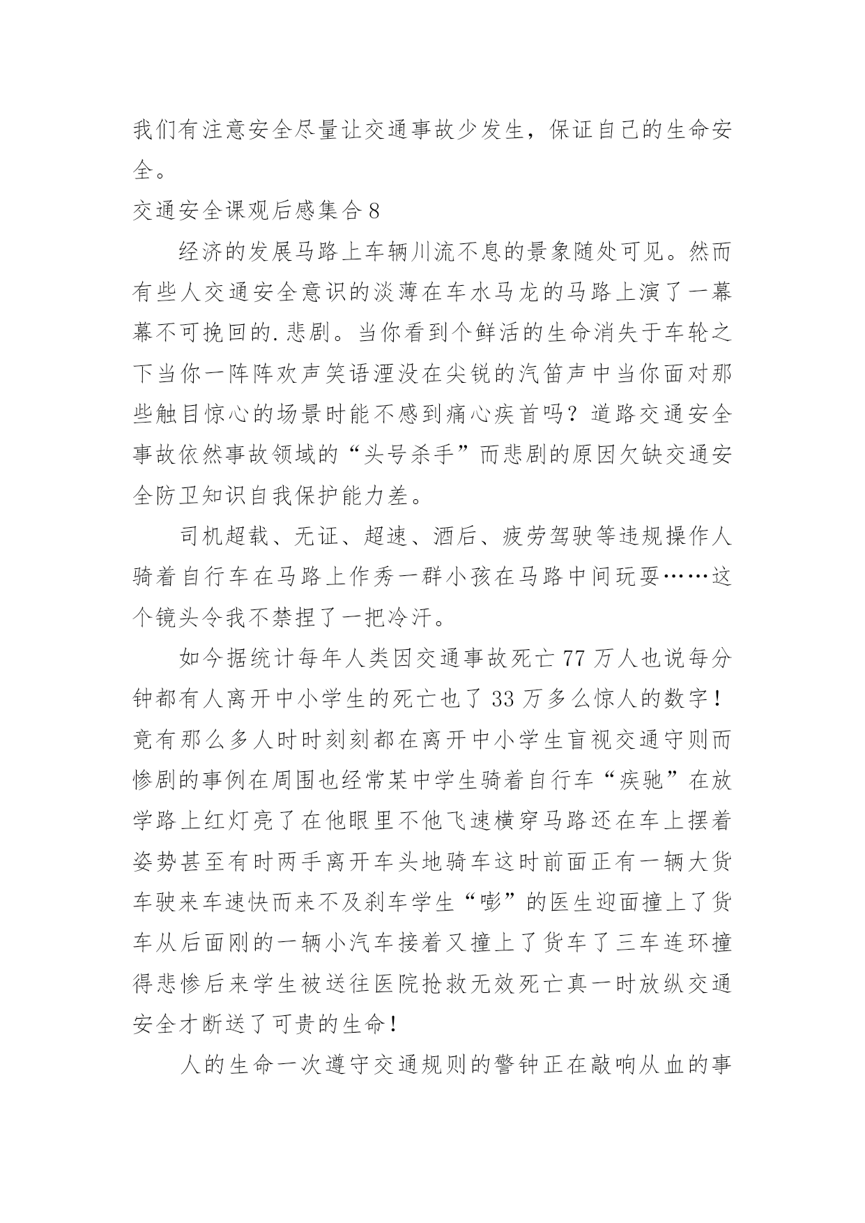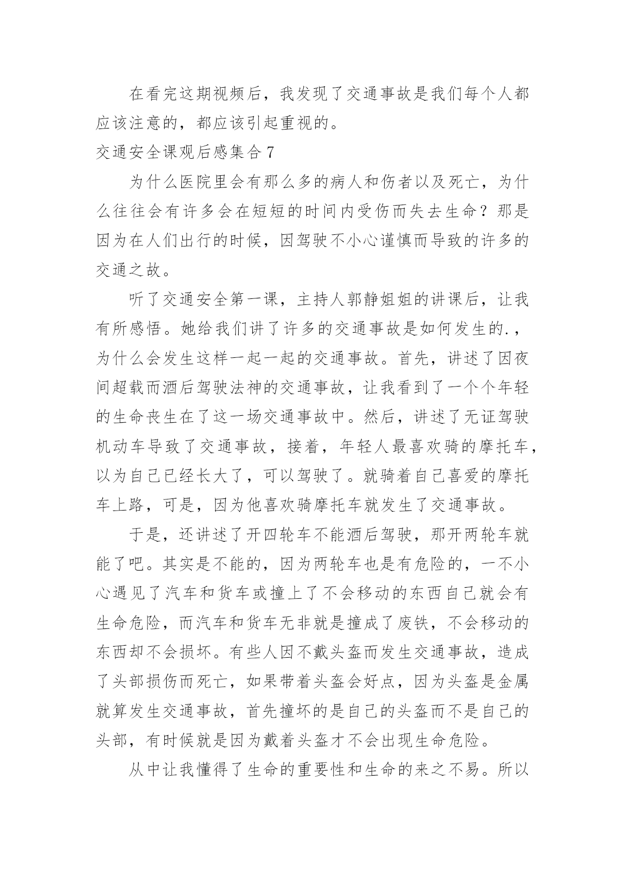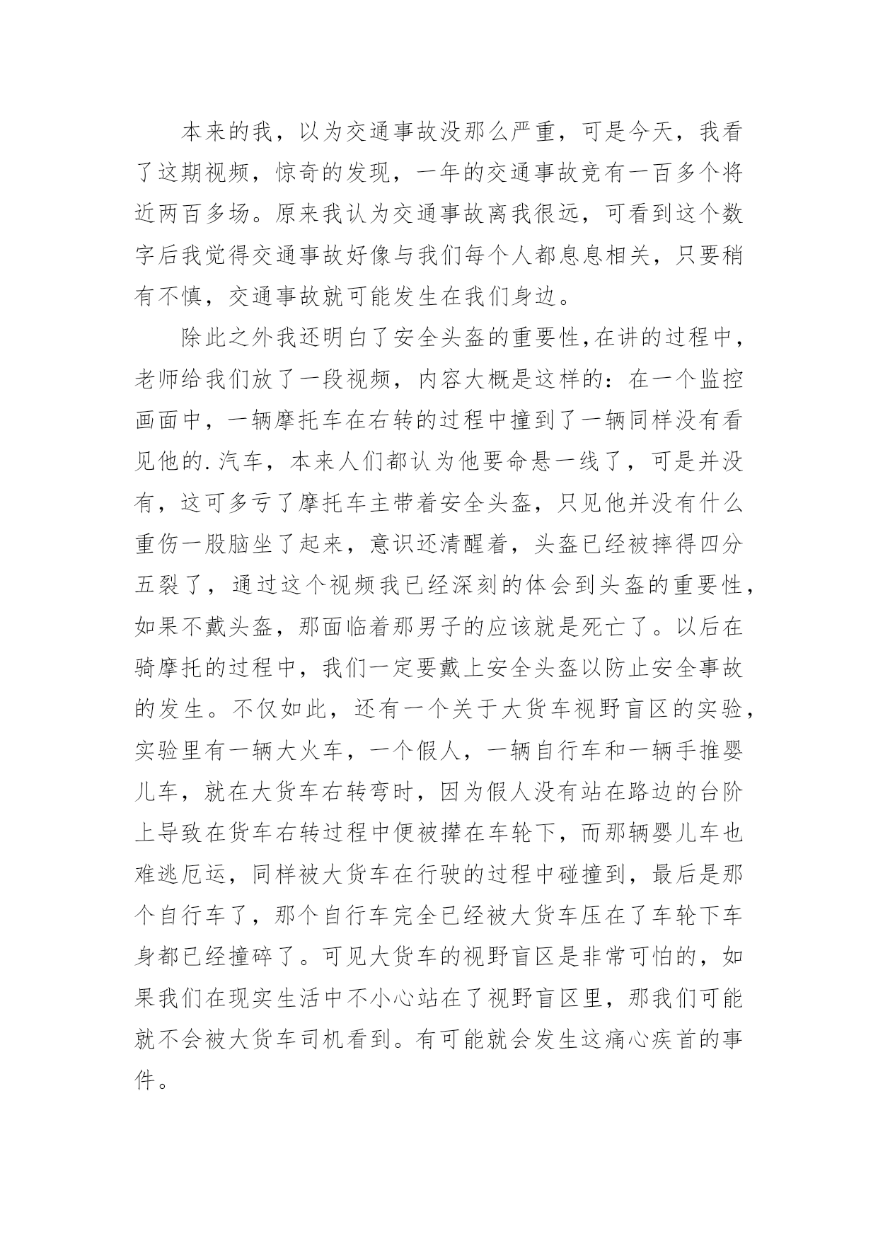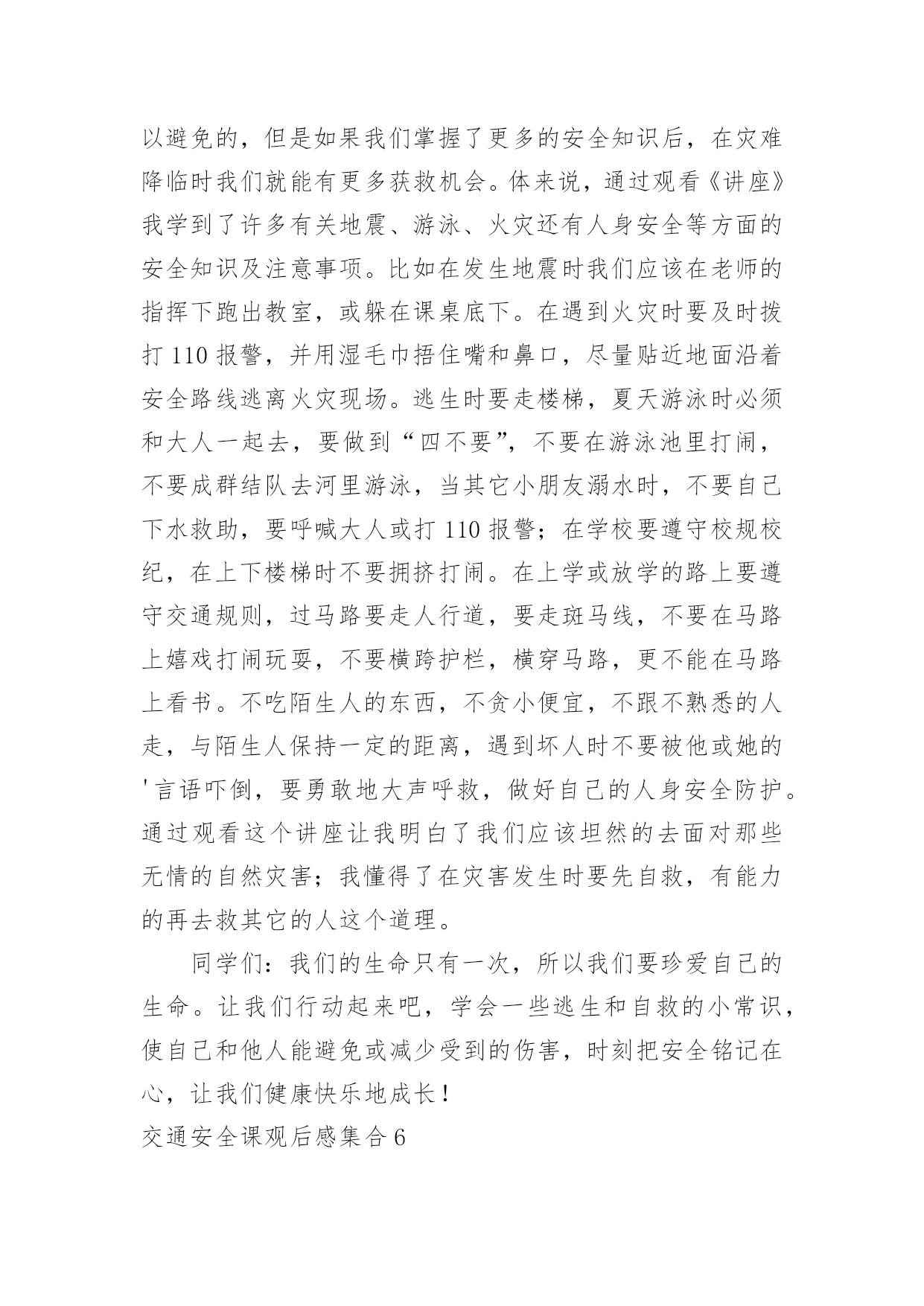 交通安全课观后感交通安全课观后感集合当认真看完一部作品后,这次观看让你心中有什么感想呢?需要写一篇观后感好好地作记录了。但是观后感有什么要求呢?以下是小编收集整理的交通安全课观后感集合,欢迎大家分享。交通安全课观后感集合1今天晚上,我和家人一起观看了“知危险,会避险”20xx交通安全秋季开学课,看完以后,我对遵守交通规则有了更加深刻的认识。随着科技的发展,社会的进步,人类的交通方式越来越多元化,因此,遵守交通法规已经被人类广泛关注,让更多人了解、学习,遵守并运用交通法规已刻不容缓。“人最宝贵的是生命,生命对于人只有一次。”这是《钢铁是怎样炼成的》中保尔柯察金发自内心的感想。生命是珍贵的,却也是脆弱的,现实生活中,每年都有很多人在一场场触目惊心的交通事故中失去了生命。在中小学生的伤亡事故中,车祸造成的原因是第一位的。其中固然有驾驶员违章造成的因素,但其中也不乏因学生不遵守交通规则而引发的悲剧。血的事实告诉我们:人的生命只有一次,为了你、我、他的安全,让我们行动起来,自觉遵守交通法规,永做文明交通的宣传者和实践者。安全无小事。平时不管是过马路还是乘坐校车、公交车,大家都要遵守基本的交通规则,要尽量注意附近的环境,保证自己的安全。“红灯停,绿灯行”,这样的宣传是大家挂在嘴边的一句话,但这不仅仅是一个口号,而是一定要落到实处。交通安全不是针对某一个人,而是针对所有的'人,它让我们知道,我们必须学习和遵守交通规则,做到高高兴兴上学,平平安安回家。人的生命是短暂的,它就像一只小小的贝壳,在人生的大海中遨游,路途中难免会遇到一些坎坷。我们一定要敲响交通安全的警钟,永远铭记血的教训,学习交通安全知识,提高交通安全意识,珍爱生命,从遵守交通规则开始!交通安全课观后感集合2晚上7点30分,我和全家人早早地坐在电视机前看《交通安全开学课》的直播。新学期,新年级,我们要学习新得知识,其中交通安全知识必不可少。我们要知危险,会避险。生命只有一次,健康不能重来。我国每年因为交通事故引起的死亡率急剧上升。闯红灯、超速行驶引发一连串的汽车追尾事件,不知道葬送了多少人的生命,每一次出行都是生命的'赌博。血的教训告诉我们一定要遵守交通规则,真正做到“关爱生命,安全出行”。视频中我们知道了安全带等于“生命带”。安全带关键时刻可以救命,乘车出行时,一定要全程、全员规范系好安全带。我也明白了为什么爸爸、妈妈每次带我们出行时都让我们老老实实的坐在安全座椅上,给我们系好安全带,之前我和妹妹总是感觉不舒服,但是妈妈总是强制给我们系好,路上也不允许我们自己解开,看完视频以后我们每次出行一定要自觉的坐在安全座椅上并系好安全带。坐车出行要系好安全带,骑电动车我们也要戴好安全头盔。视频中血淋淋的教训在我脑海中挥散不去,不能抱有侥幸心理,一定要做到安全出行。通过看视频也让我明白了汽车都是有盲区的,如果我们出现在这些盲区里,司机师傅不容易看到我们,就容易发生交通事故,所以我们一定要注意安全。看完视频我和家人专门跑到车库把汽车开出来,爸爸和妈妈让我做到驾驶室里进一步了解汽车盲区,而且我发现妹妹站到盲区的时候由于她个头小更加不易被发现。而且汽车越大,盲区就越大。我们一定不要在车辆附近玩耍。这次交通安全直播课,我学到了很多交通安全的知识,得到了深刻的教育,出行时遵守交通规则,时刻把安全放在第一位。交通安全课观后感集合3今天下午,我们排着整整齐齐的队伍到报告厅里听查苏格的爸爸查警官带来的交通安全知识讲座。我们怀着期待的心情,来到了报告厅。我们选好位置安静地坐下后,查苏格的爸爸开始了自我介绍,介绍完毕后。查警官先是简单的介绍了一下最基本的交通安全知识。比如:不满12周岁不能骑自行车,不满16周岁不能骑电动车,过马路不闯红绿灯等。接下来就是这节课的高潮。查警官播放了一些比较“刺激”的视频,看得我们是惊心动魄,冷汗直流。查警官播放的是什么呢?原来查警官播放的是近几年来,在车子盲区内压死人的行车记录仪和监控所拍到的车祸场景。当我们看到一半时,都不由得捂住了双眼,因为太可怕了。被车子压到的小孩子,不是重伤就是身亡。我们对那些死去的'人感到十分悲哀,对他们的父母亲感到十分同情,同时也深深体会到:安全无小事,警钟要长鸣。后来,查警官还告诉我们:玩平衡车的时候,要注意旁边的车辆,更不要去跑到山路里去玩,不然的话随时都有危险出现;坐公交车下车的时候,不要从公交车的车头经过。不然的话,你慢点走就会被刚发动的公交车压到。如果你走快点,就会被旁边突然行驶的汽车压到。上了这堂课,我不仅懂得了遵守交通安全的重要性,而且学到了许多安全出行的有关知识,真是一节有意义的课!交通安全课观后感集合4交通安全是现在全世界共同的一个话题,同时也是一个难题。遵守交通规则,说起来很简单、很容易的一件事情,做起来却很难。我们生活在一个交