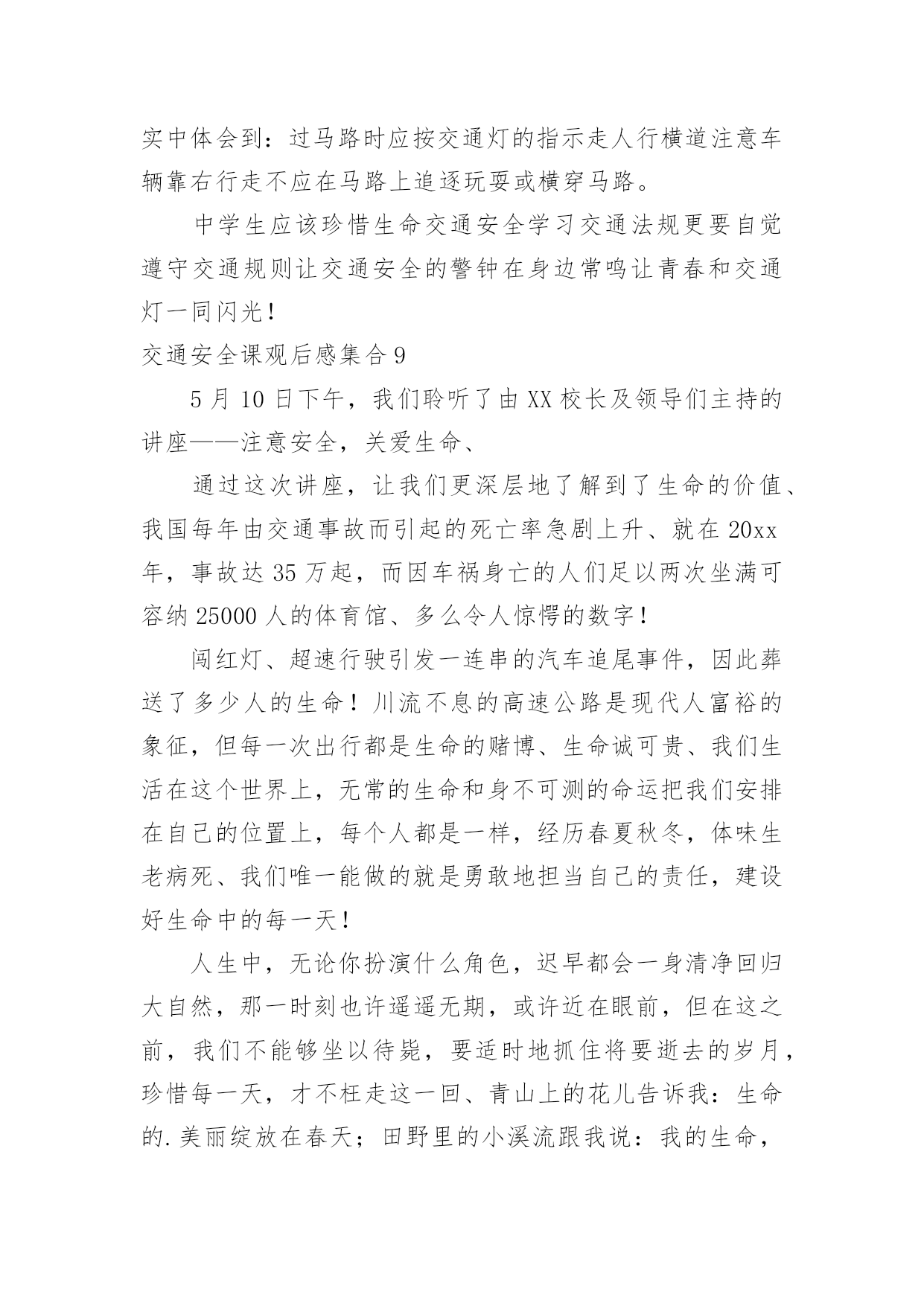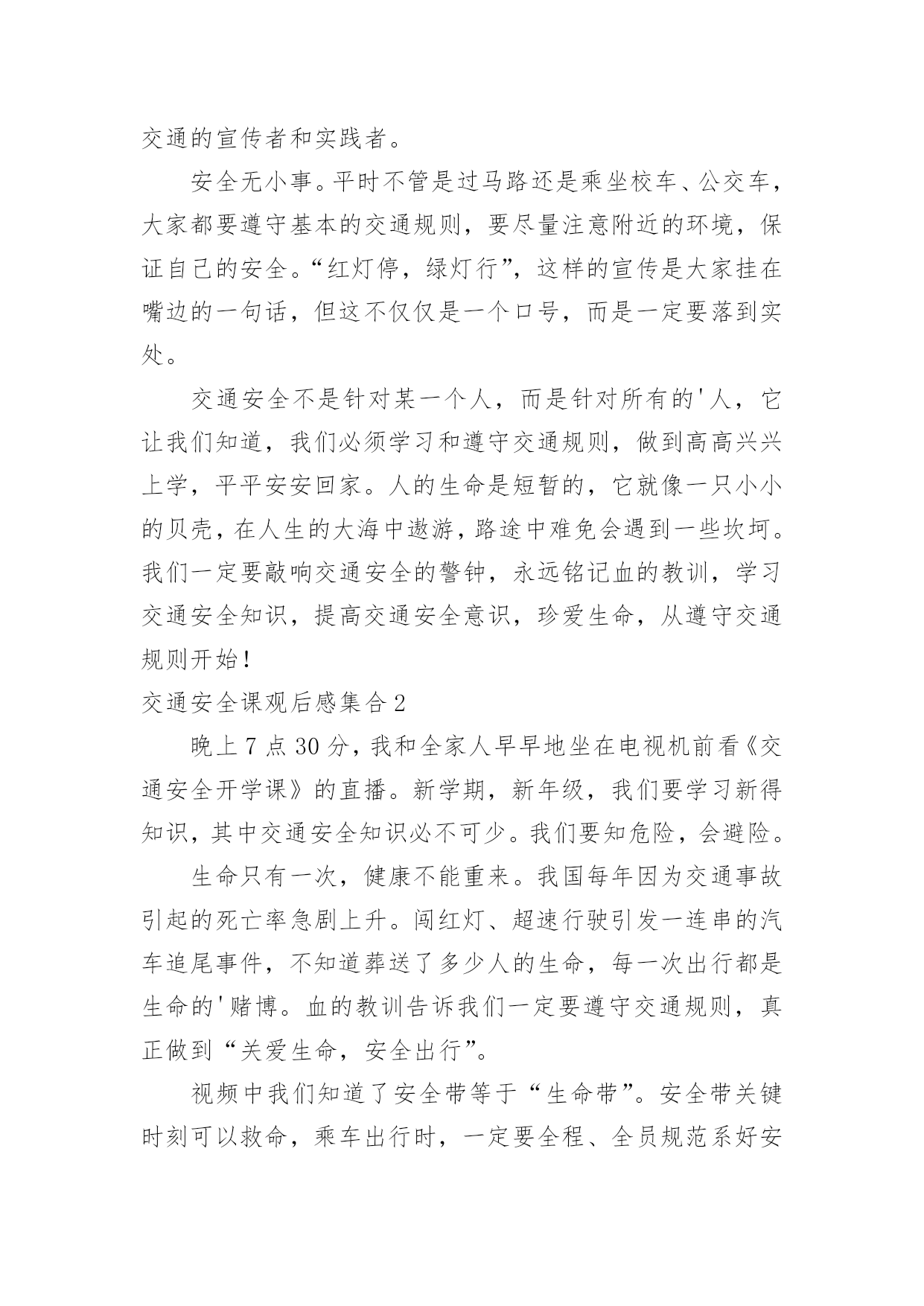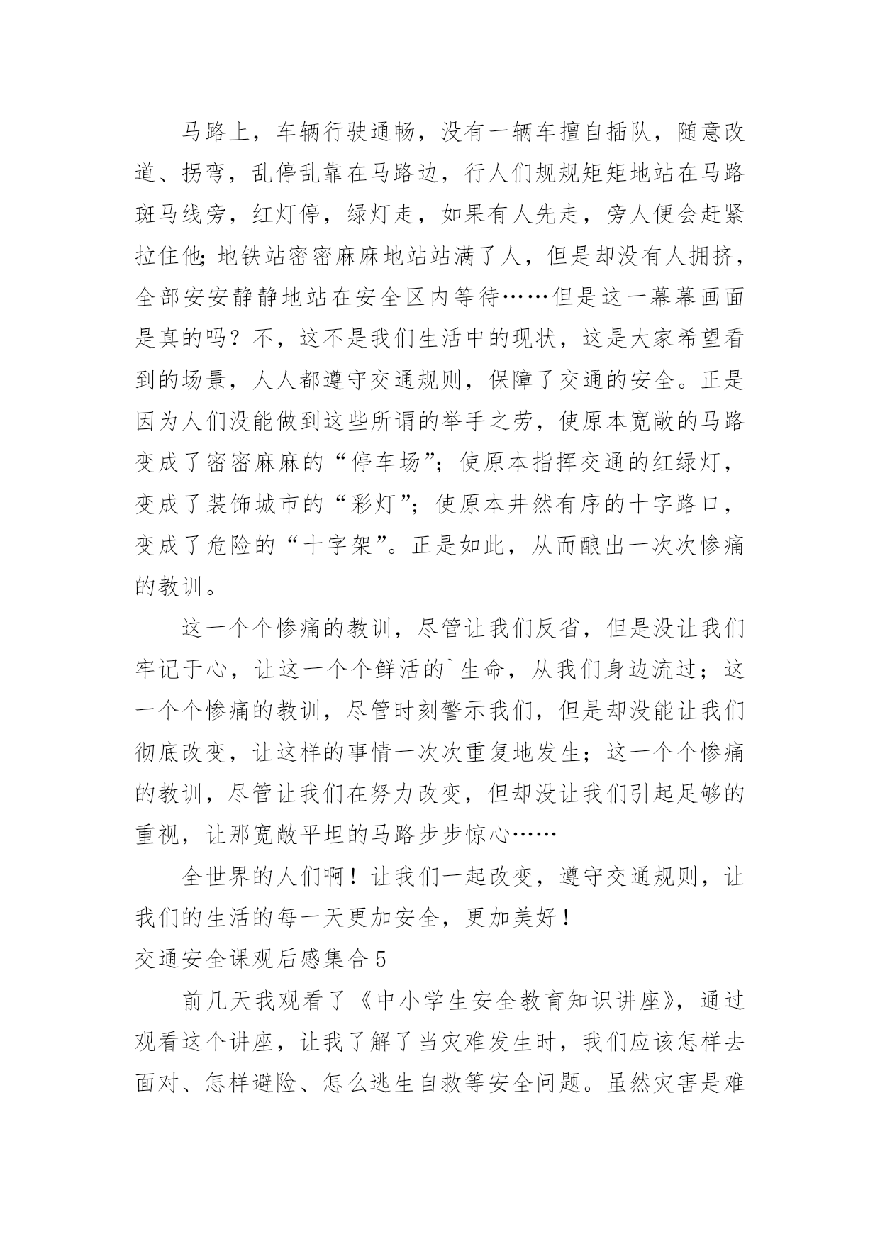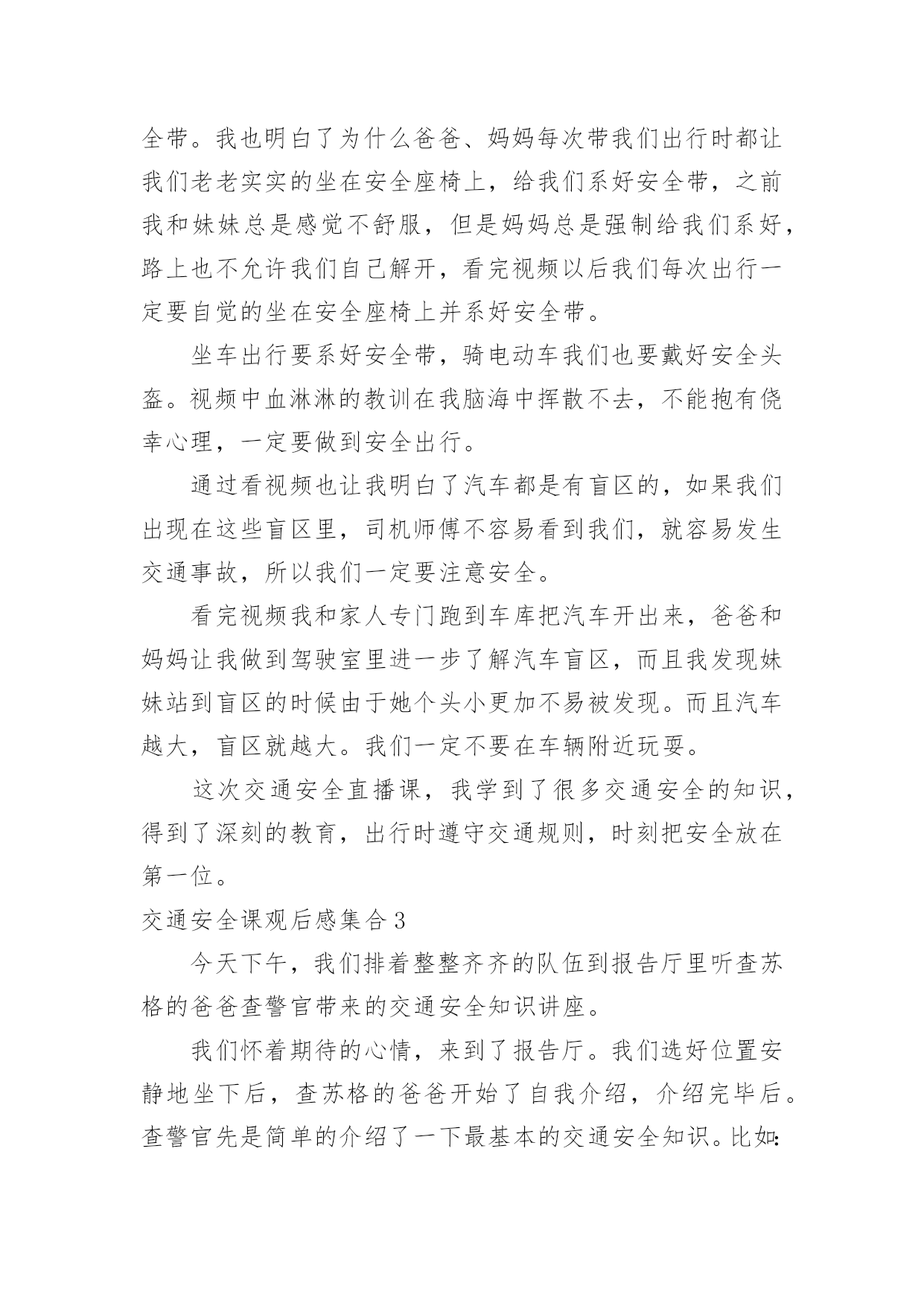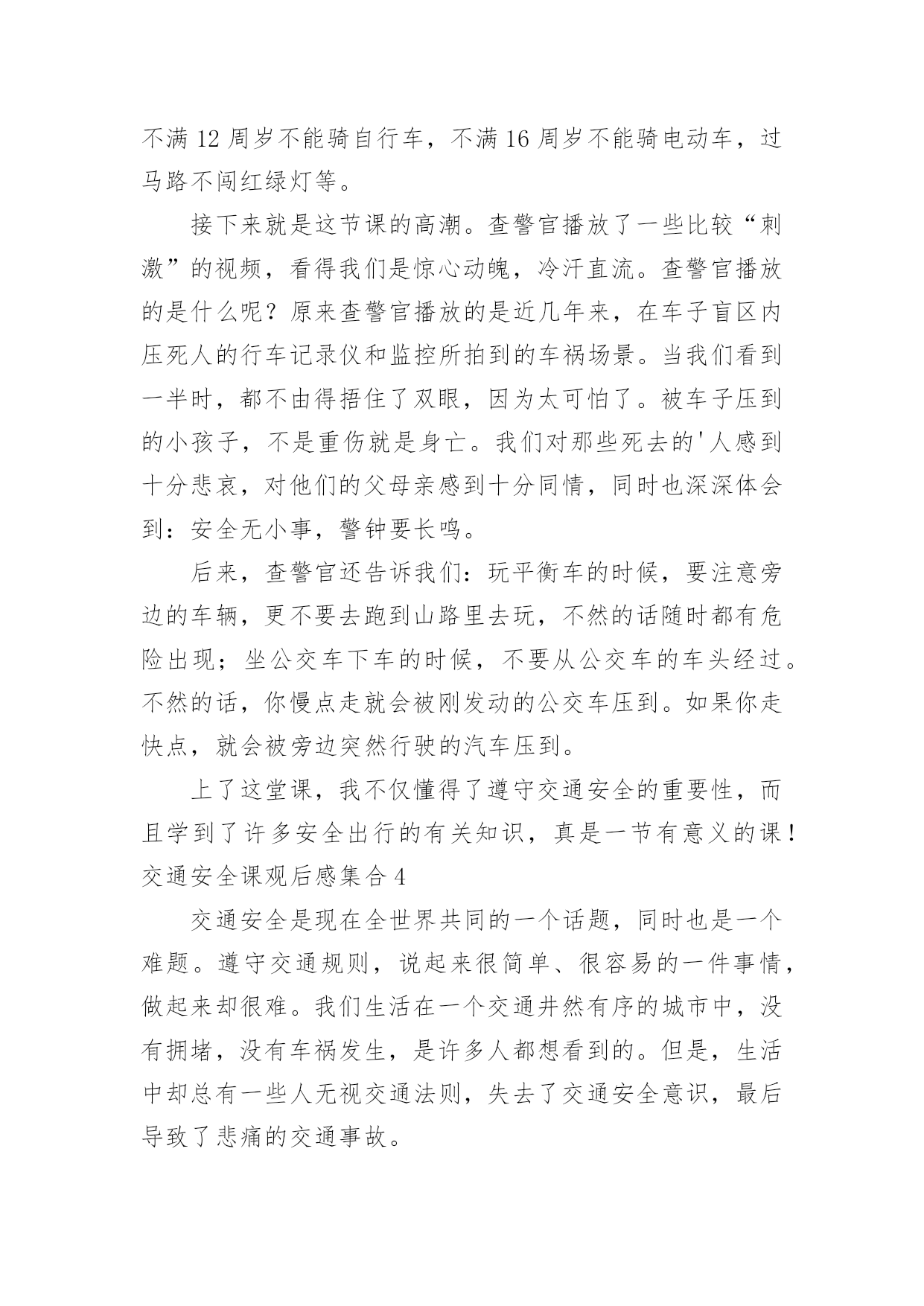 交通安全课观后感交通安全课观后感集合当认真看完一部作品后,这次观看让你心中有什么感想呢?需要写一篇观后感好好地作记录了。但是观后感有什么要求呢?以下是小编收集整理的交通安全课观后感集合,欢迎大家分享。交通安全课观后感集合1今天晚上,我和家人一起观看了“知危险,会避险”20xx交通安全秋季开学课,看完以后,我对遵守交通规则有了更加深刻的认识。随着科技的发展,社会的进步,人类的交通方式越来越多元化,因此,遵守交通法规已经被人类广泛关注,让更多人了解、学习,遵守并运用交通法规已刻不容缓。“人最宝贵的是生命,生命对于人只有一次。”这是《钢铁是怎样炼成的》中保尔柯察金发自内心的感想。生命是珍贵的,却也是脆弱的,现实生活中,每年都有很多人在一场场触目惊心的交通事故中失去了生命。在中小学生的伤亡事故中,车祸造成的原因是第一位的。其中固然有驾驶员违章造成的因素,但其中也不乏因学生不遵守交通规则而引发的悲剧。血的事实告诉我们:人的生命只有一次,为了你、我、他的安全,让我们行动起来,自觉遵守交通法规,永做文明交通的宣传者和实践者。安全无小事。平时不管是过马路还是乘坐校车、公交车,大家都要遵守基本的交通规则,要尽量注意附近的环境,保证自己的安全。“红灯停,绿灯行”,这样的宣传是大家挂在嘴边的一句话,但这不仅仅是一个口号,而是一定要落到实处。交通安全不是针对某一个人,而是针对所有的'人,它让我们知道,我们必须学习和遵守交通规则,做到高高兴兴上学,平平安安回家。人的生命是短暂的,它就像一只小小的贝壳,在人生的大海中遨游,路途中难免会遇到一些坎坷。我们一定要敲响交通安全的警钟,永远铭记血的教训,学习交通安全知识,提高交通安全意识,珍爱生命,从遵守交通规则开始!交通安全课观后感集合2晚上7点30分,我和全家人早早地坐在电视机前看《交通安全开学课》的直播。新学期,新年级,我们要学习新得知识,其中交通安全知识必不可少。我们要知危险,会避险。生命只有一次,健康不能重来。我国每年因为交通事故引起的死亡率急剧上升。闯红灯、超速行驶引发一连串的汽车追尾事件,不知道葬送了多少人的生命,每一次出行都是生命的'赌博。血的教训告诉我们一定要遵守交通规则,真正做到“关爱生命,安全出行”。视频中我们知道了安全带等于“生命带”。安全带关键时刻可以救命,乘车出行时,一定要全程、全员规范系好安全带。我也明白了为什么爸爸、妈妈每次带我们出行时都让我们老老实实的坐在安全座椅上,给我们系好安全带,之前我和妹妹总是感觉不舒服,但是妈妈总是强制给我们系好,路上也不允许我们自己解开,看完视频以后我们每次出行一定要自觉的坐在安全座椅上并系好安全带。坐车出行要系好安全带,骑电动车我们也要戴好安全头盔。视频中血淋淋的教训在我脑海中挥散不去,不能抱有侥幸心理,一定要做到安全出行。通过看视频也让我明白了汽车都是有盲区的,如果我们出现在这些盲区里,司机师傅不容易看到我们,就容易发生交通事故,所以我们一定要注意安全。看完视频我和家人专门跑到车库把汽车开出来,爸爸和妈妈让我做到驾驶室里进一步了解汽车盲区,而且我发现妹妹站到盲区的时候由于她个头小更加不易被发现。而且汽车越大,盲区就越大。我们一定不要在车辆附近玩耍。这次交通安全直播课,我学到了很多交通安全的知识,得到了深刻的教育,出行时遵守交通规则,时刻把安全放在第一位。交通安全课观后感集合3今天下午,我们排着整整齐齐的队伍到报告厅里听查苏格的爸爸查警官带来的交通安全知识讲座。我们怀着期待的心情,来到了报告厅。我们选好位置安静地坐下后,查苏格的爸爸开始了自我介绍,介绍完毕后。查警官先是简单的介绍了一下最基本的交通安全知识。比如:不满12周岁不能骑自行车,不满16周岁不能骑电动车,过马路不闯红绿灯等。接下来就是这节课的高潮。查警官播放了一些比较“刺激”的视频,看得我们是惊心动魄,冷汗直流。查警官播放的是什么呢?原来查警官播放的是近几年来,在车子盲区内压死人的行车记录仪和监控所拍到的车祸场景。当我们看到一半时,都不由得捂住了双眼,因为太可怕了。被车子压到的小孩子,不是重伤就是身亡。我们对那些死去的'人感到十分悲哀,对他们的父母亲感到十分同情,同时也深深体会到:安全无小事,警钟要长鸣。后来,查警官还告诉我们:玩平衡车的时候,要注意旁边的车辆,更不要去跑到山路里去玩,不然的话随时都有危险出现;坐公交车下车的时候,不要从公交车的车头经过。不然的话,你慢点走就会被刚发动的公交车压到。如果你走快点,就会被旁边突然行驶的汽车压到。上了这堂课,我不仅懂得了遵守交通安全的重要性,而且学到了许多安全出行的有关知识,真是一节有意义的课!交通安全课观后感集合4交通安全是现在全世界共同的一个话题,同时也是一个难题。遵守交通规则,说起来很简单、很容易的一件事情,做起来却很难。我们生活在一个交