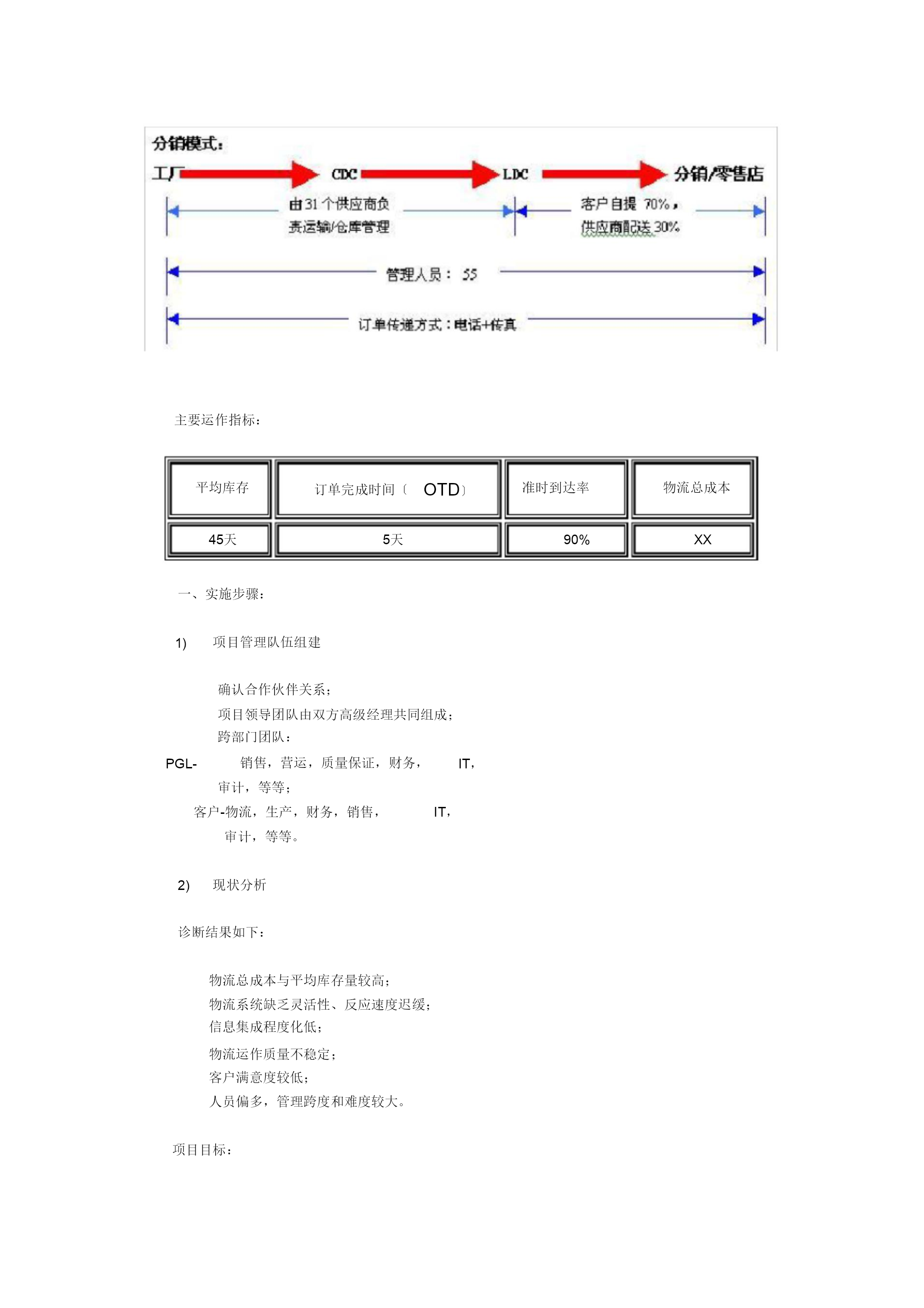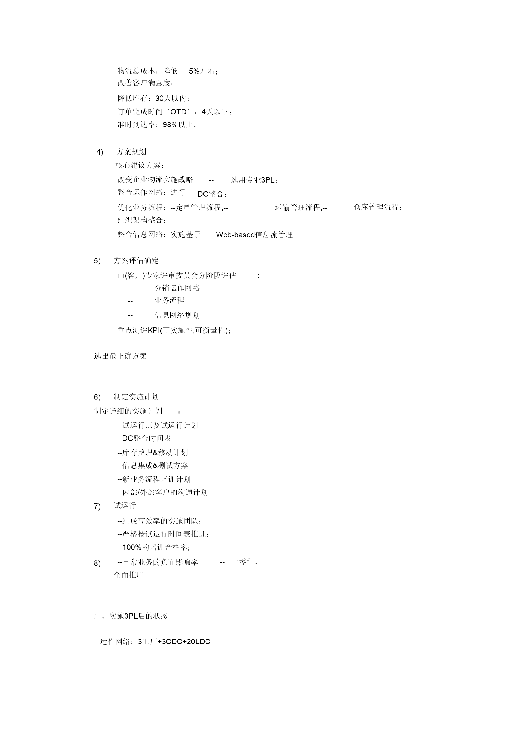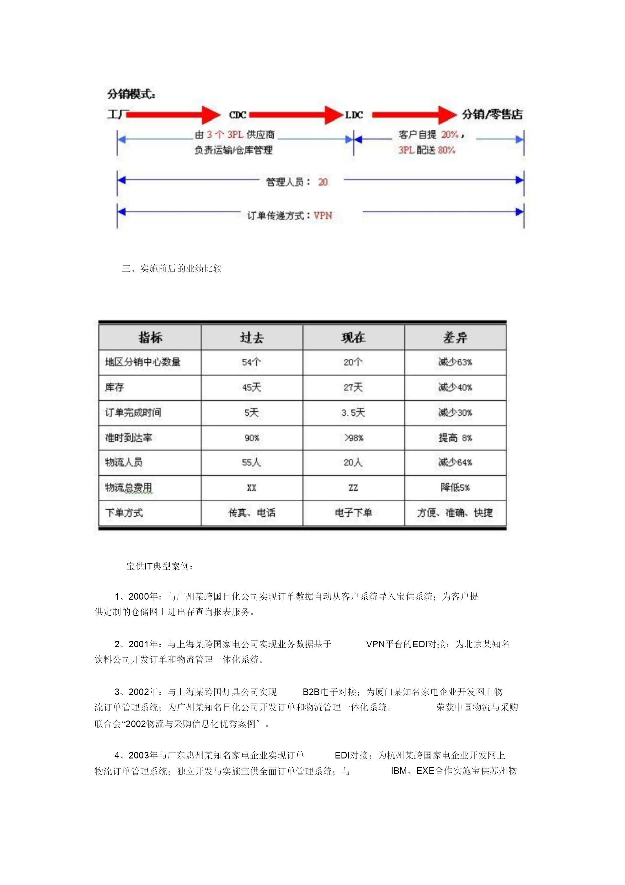 宝供物流案例解决介绍典型案例介绍:1.宝供在为国内某知名大型电器制造企业实施物流系统优化前,该企业一直依靠传统的仓库和运输公司来提供物流服务,存在着:管理混乱,“跑冒漏滴〞现象严重;库存量大,资金积压严重;费用居高不下,人员极度膨胀三大主要问题。2001年开始,宝供与该企业展开全面的物流业务合作,提出对该企业整体供应链进行改革的建议。分三部分实施:将物流与商流分离,实现物流外包;通过规划和整合,将原有的经营部库存分布点向上集中为一了服务水平。RDC库存点;通过信息技术的运用,提高了工作效率,减少了人员,统该企业通过实施宝供提供的供应链优化方案,全国库存点数量由原来遍布全国的260多个经营部减少为35个RDC,库存面积由过去的源,大大降低了库存,专业分工更加明确;库存资金由32亿降低到14亿,减少了库存资金占压;12000人减少到6000人,节省了人力成本支出;产品周转天数由65天降低到110万平方米减少为40万平方米,充分整合了资从业人员由原来的24天,加快了库存周转速度;订单处理方式由手工变为电子化,信息化程度及工作效率得以提升。2.2004年起,宝供为某国际日化企业实施原辅材料的客户原材料零库存。宝供利用自身在全国各个物流基地的管理和调控能力,通过系统对接,该企业只需每天向宝供下达生产计划和原辅材料供应计划,宝供那么在规定时间进行原辅材料的分拣理货,配送到生产线,实现了客户原辅材料零JIT生产,同时实现了运VMI〔供应商管理库存〕管理,实现了有效地管理客户1000多家供应商的原辅材料的供应,库存的愿望,降低了库存风险,也能为客户管理原材料库存,支持客户输资源的充分整合,降低了运输成本,使供应链全程可视化、可控化。图示案例:某国际著名电器公司案例:一、实施3PL前的状态运作网络:3工厂+3CDC+54LDC主要运作指标:平均库存OTD〕准时到达率物流总成本订单完成时间〔45天5天90%XX一、实施步骤:1)项目管理队伍组建确认合作伙伴关系;项目领导团队由双方高级经理共同组成;跨部门团队:PGL-销售,营运,质量保证,财务,IT,审计,等等;客户-物流,生产,财务,销售,IT,审计,等等。2)现状分析诊断结果如下:物流总成本与平均库存量较高;物流系统缺乏灵活性、反应速度迟缓;信息集成程度化低;物流运作质量不稳定;客户满意度较低;人员偏多,管理跨度和难度较大。项目目标:物流总成本:降低改善客户满意度;5%左右;降低库存:30天以内;订单完成时间〔OTD〕:4天以下;准时到达率:98%以上。4)方案规划核心建议方案:改变企业物流实施战略整合运作网络:进行--选用专业3PL;DC整合;优化业务流程:--定单管理流程,--运输管理流程,--仓库管理流程;组织架构整合;整合信息网络:实施基于Web-based信息流管理。5)方案评估确定由(客户)专家评审委员会分阶段评估:------分销运作网络业务流程信息网络规划重点测评KPI(可实施性,可衡量性);选出最正确方案6)制定实施计划制定详细的实施计划:--试运行点及试运行计划--DC整合时间表--库存整理&移动计划--信息集成&测试方案--新业务流程培训计划--内部/外部客户的沟通计划试运行7)8)--组成高效率的实施团队;--严格按试运行时间表推进;--100%的培训合格率;--日常业务的负面影响率--“零〞。全面推广二、实施3PL后的状态运作网络:3工厂+3CDC+20LDC三、实施前后的业绩比较宝供IT典型案例:1、2000年:与广州某跨国日化公司实现订单数据自动从客户系统导入宝供系统;为客户提供定制的仓储网上进出存查询报表服务。2、2001年:与上海某跨国家电公司实现业务数据基于VPN平台的EDI对接;为北京某知名饮料公司开发订单和物流管理一体化系统。3、2002年:与上海某跨国灯具公司实现B2B电子对接;为厦门某知名家电企业开发网上物流订单管理系统;为广州某知名日化公司开发订单和物流管理一体化系统。荣获中国物流与采购联合会“2002物流与采购信息化优秀案例〞。4、2003年与广东惠州某知名家电企业实现订单EDI对接;为杭州某跨国家电企业开发网上IBM、EXE合作实施宝供苏州物物流订单管理系统;独立开发与实施宝供全面订单管理系统;与