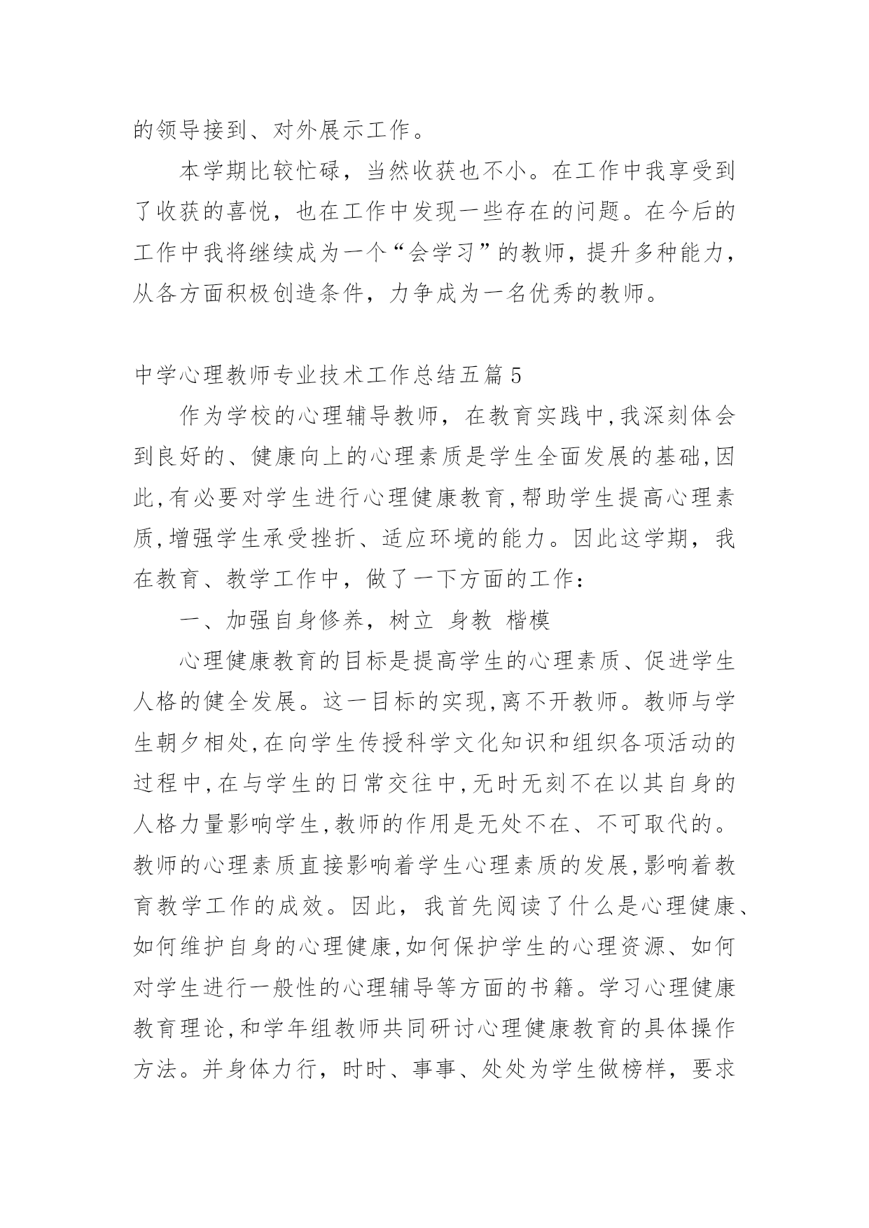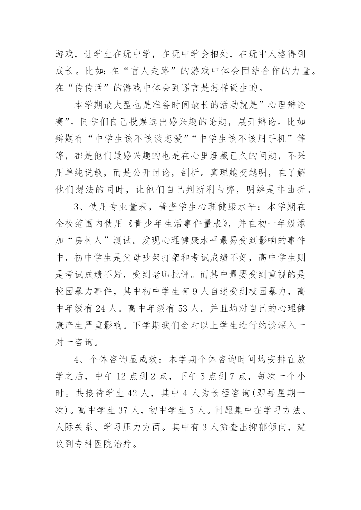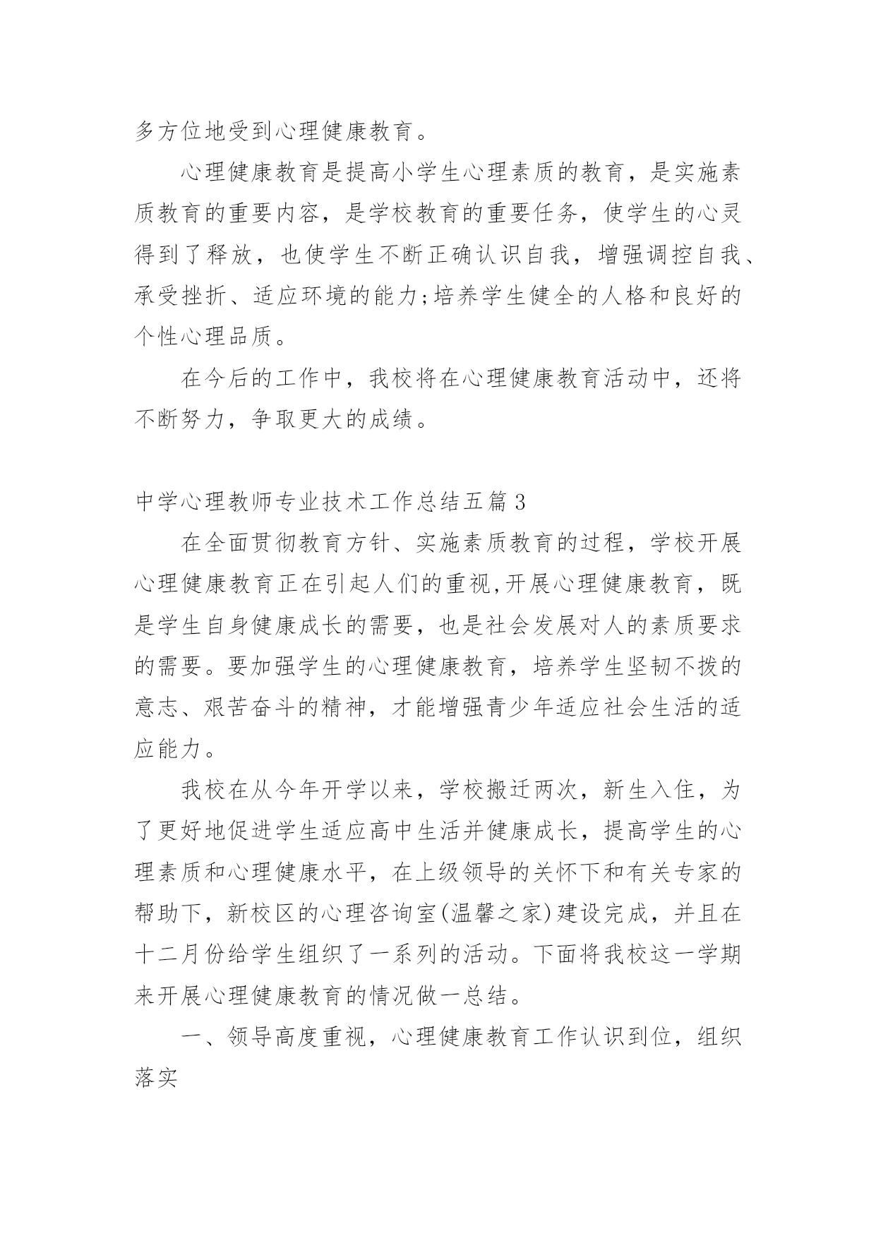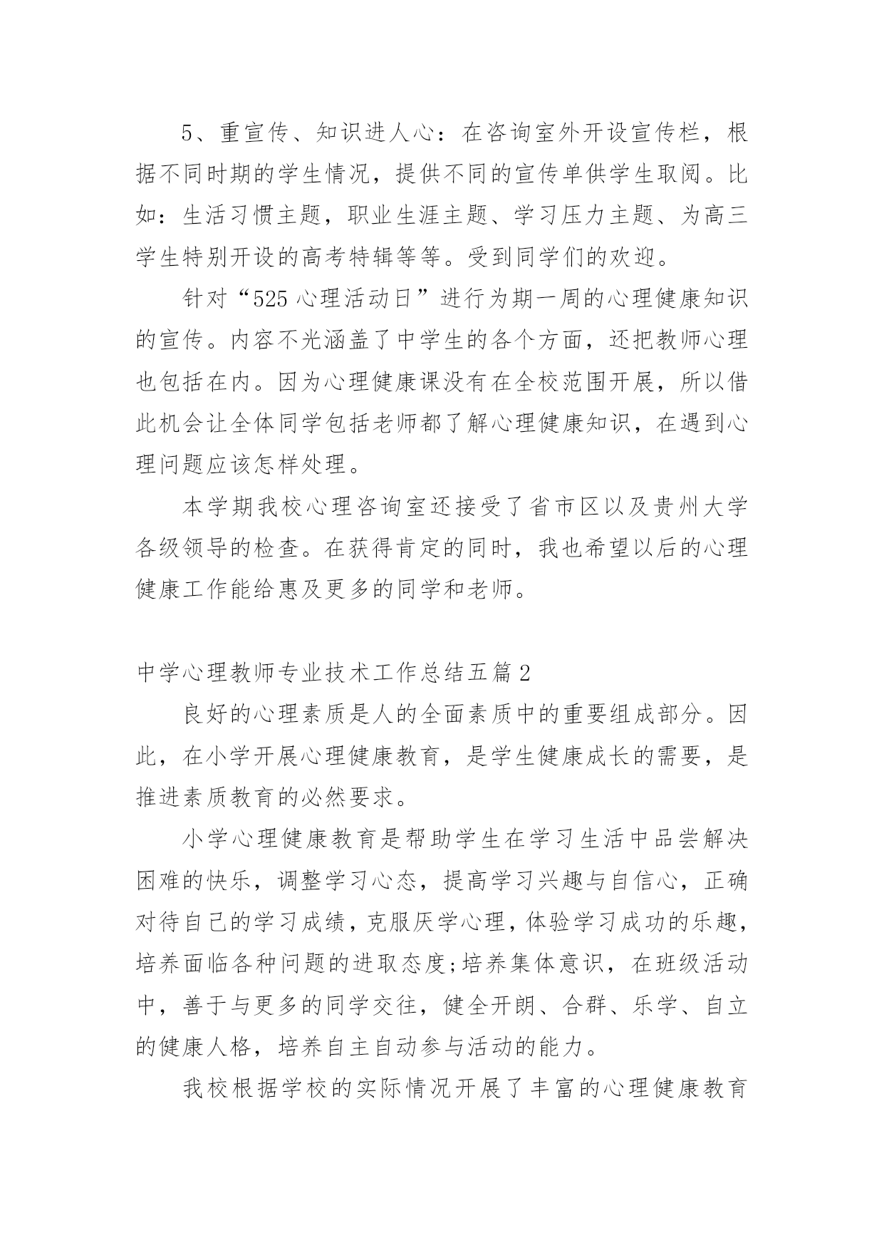 中学心理教师专业技术工作总结中学心理教师专业技术工作总结五篇总结在一个时期、一个年度、一个阶段对学习和工作生活等情况加以回顾和分析的一种书面材料,它能使我们及时找出错误并改正,因此我们要做好归纳,写好总结。如何把总结做到重点突出呢?以下是小编为大家整理的中学心理教师专业技术工作总结五篇,仅供参考,希望能够帮助到大家。中学心理教师专业技术工作总结五篇1本学期我担任初一年级心理健康老师,并负责运行管理心理咨询中心和开展全校学生心理咨询工作。工作总结如下:1、努力专研、自制教材:在初一年级没有心理健康教材的情况下,我自费购买市面上多种版本的初一心理健康课本及教师用书,并且查找文献资料学习国外发达国家先进的中学生心理健康课程理念,结合本校学生实际情况,自己制定和开设课程,使得课程更加切合学生实际,也能更加有效的帮助学生解决当下的心理问题。2、在“玩”中人格得到成长:有位著名的心理学家曾经说过:是游戏教会了一个人如何和这个世界相处,尤其对于青少年而言,游戏对于他们的健康成长尤其重要。心理健康课不是统考科目,因此很容易受到学生的忽视。如果课程再死板枯燥些,学生更加不会听课。所以我会设计了一些小游戏,让学生在玩中学,在玩中学会相处,在玩中人格得到成长。比如:在“盲人走路”的游戏中体会团结合作的力量。在“传传话”的游戏中体会到谣言是怎样诞生的。本学期最大型也是准备时间最长的活动就是”心理辩论赛”。同学们自己投票选出感兴趣的论题,展开辩论。比如辩题有“中学生该不该谈恋爱”“中学生该不该用手机”等等,都是他们最感兴趣的也是在心里埋藏已久的问题,不采用单纯说教,而是公开讨论,剖析。真理越变越明,在了解他们想法的同时,让他们自己判断利与弊,明辨是非曲折。3、使用专业量表,普查学生心理健康水平:本学期在全校范围内使用《青少年生活事件量表》,并在初一年级添加“房树人”测试。发现心理健康水平最易受到影响的事件中,初中学生是父母吵架打架和考试成绩不好,高中学生则是考试成绩不好,受到老师批评。而其中最要受到重视的是校园暴力事件,其中初中学生有9人自述受到校园暴力,高中年级有24人。高中年级有53人。并且均对自己的心理健康产生严重影响。下学期我们会对以上学生进行约谈深入一对一咨询。4、个体咨询显成效:本学期个体咨询时间均安排在放学之后,中午12点到2点,下午5点到7点,每次一个小时。共接待学生42人,其中4人为长程咨询(即每星期一次)。高中学生37人,初中学生5人。问题集中在学习方法、人际关系、学习压力方面。其中有3人筛查出抑郁倾向,建议到专科医院治疗。5、重宣传、知识进人心:在咨询室外开设宣传栏,根据不同时期的学生情况,提供不同的宣传单供学生取阅。比如:生活习惯主题,职业生涯主题、学习压力主题、为高三学生特别开设的高考特辑等等。受到同学们的欢迎。针对“525心理活动日”进行为期一周的心理健康知识的宣传。内容不光涵盖了中学生的各个方面,还把教师心理也包括在内。因为心理健康课没有在全校范围开展,所以借此机会让全体同学包括老师都了解心理健康知识,在遇到心理问题应该怎样处理。本学期我校心理咨询室还接受了省市区以及贵州大学各级领导的检查。在获得肯定的同时,我也希望以后的心理健康工作能给惠及更多的同学和老师。中学心理教师专业技术工作总结五篇2良好的心理素质是人的全面素质中的重要组成部分。因此,在小学开展心理健康教育,是学生健康成长的需要,是推进素质教育的必然要求。小学心理健康教育是帮助学生在学习生活中品尝解决困难的快乐,调整学习心态,提高学习兴趣与自信心,正确对待自己的学习成绩,克服厌学心理,体验学习成功的乐趣,培养面临各种问题的进取态度;培养集体意识,在班级活动中,善于与更多的同学交往,健全开朗、合群、乐学、自立的健康人格,培养自主自动参与活动的能力。我校根据学校的实际情况开展了丰富的心理健康教育活动,注意发挥各种方式和途径的综合作用,增强心理健康教育的效果。一、心理知识讲座我校定期开展心理知识讲座,普及心理健康科学常识,帮助学生掌握一般的心理保健知识,培养良好的心理素质。心理健康教育并非只是个别学生教育的需要,心理健康教育是面向全体学生的重要课题,因为心理健康是全员性的问题,是每一位学生在成长与发展中都必然会面临的挑战,包括那些学习优秀、在教师看来是“好”孩子的学生,也同样需要心理健康教育。许多研究与实践证明,有时这些“好”学生反而更需要心理健康教育。因为,往往由于学习成绩好,这些“好”学生心理发展中不健康的侧面就常常被忽视,得不到教师的重视和及时的帮助教育。如,一些“好”学生由于长期被宠、被捧,心理承受能力已变得极脆弱,稍不如意就发脾气,有的还采取极端措施进行打击、报复,甚至走上犯罪道路。可见,心理健康教育应成为我们学校教育的重要的防止心理健康教育学科化的倾向。