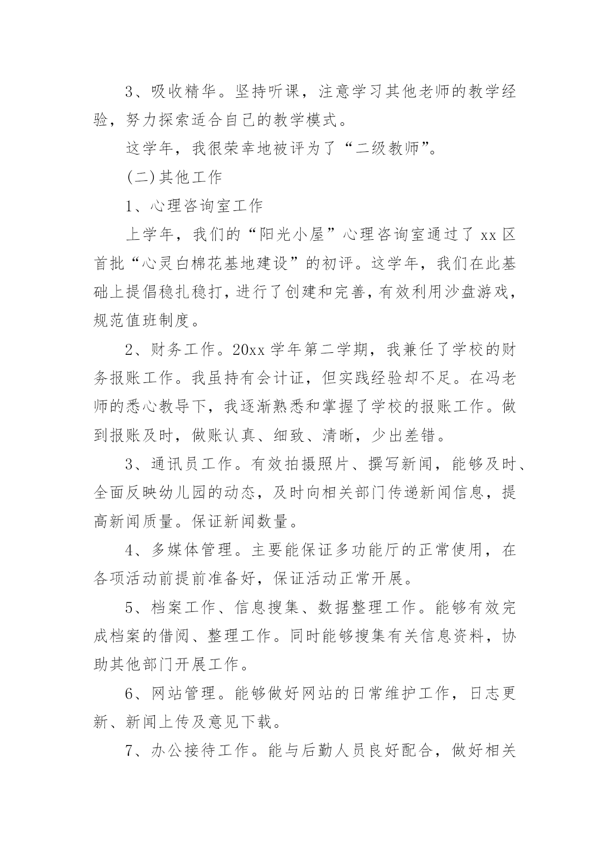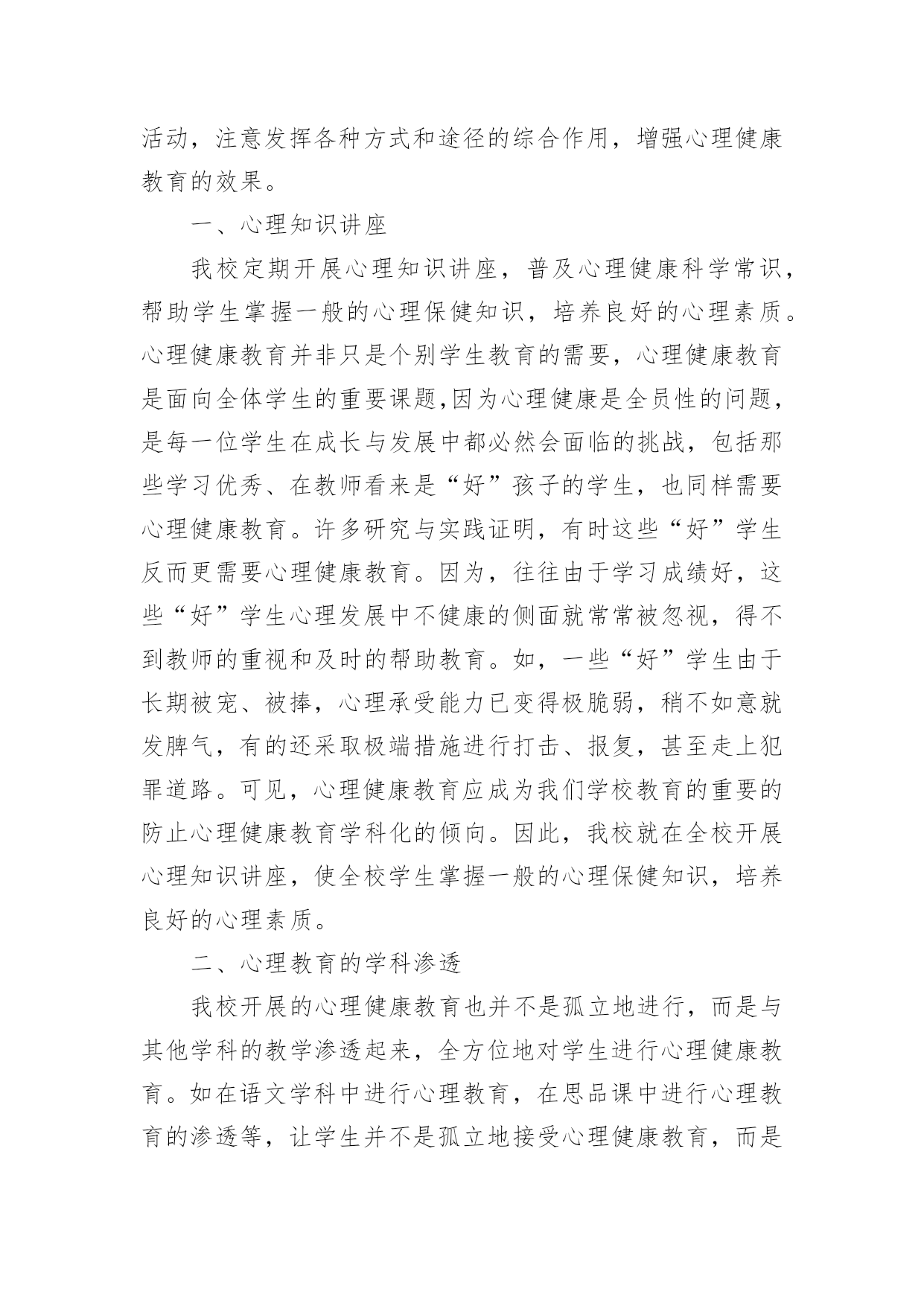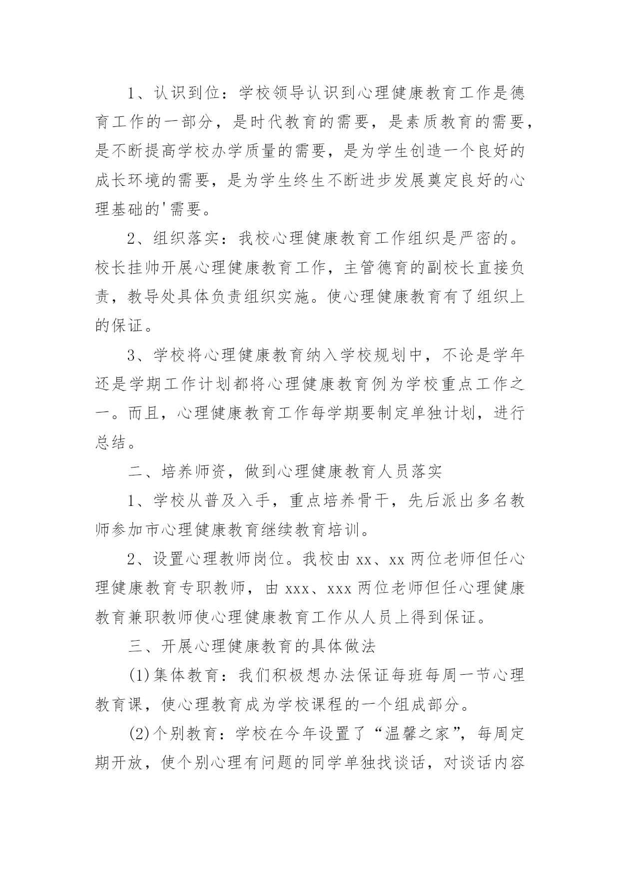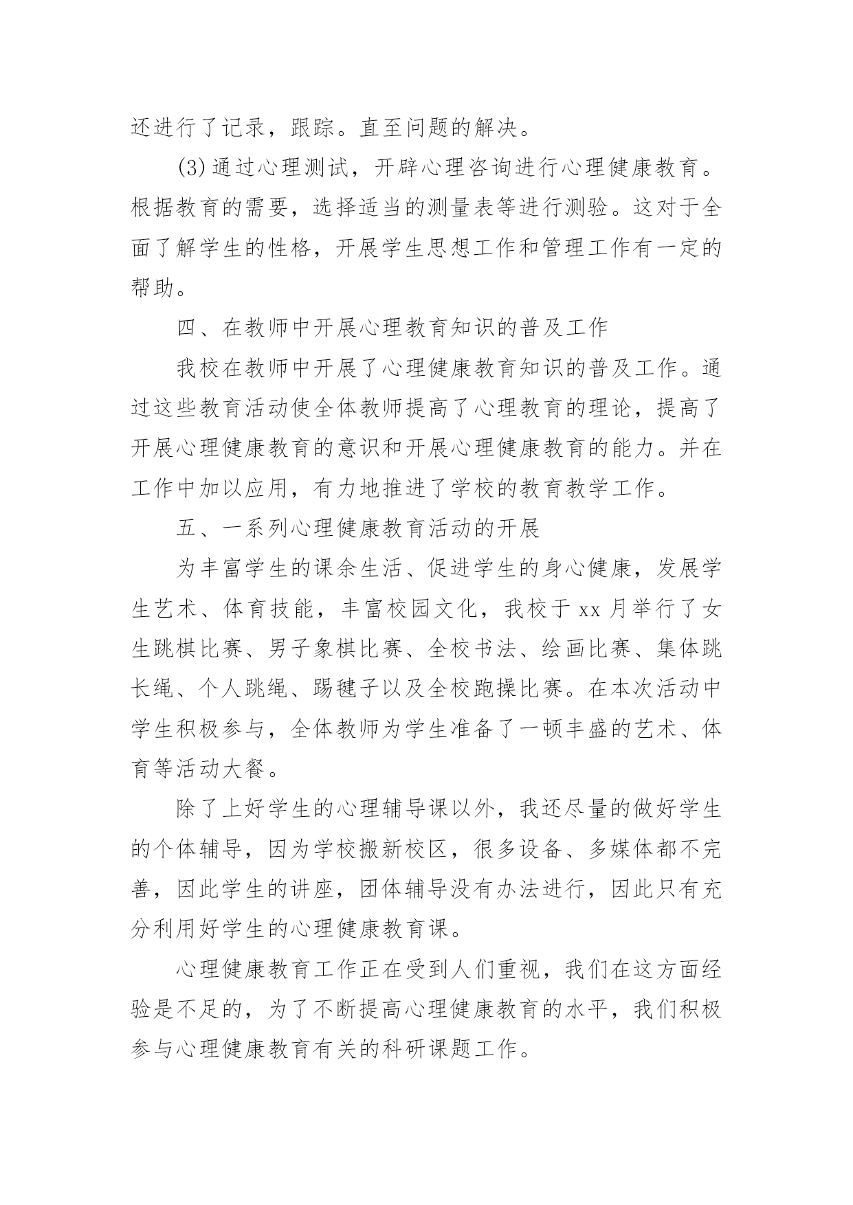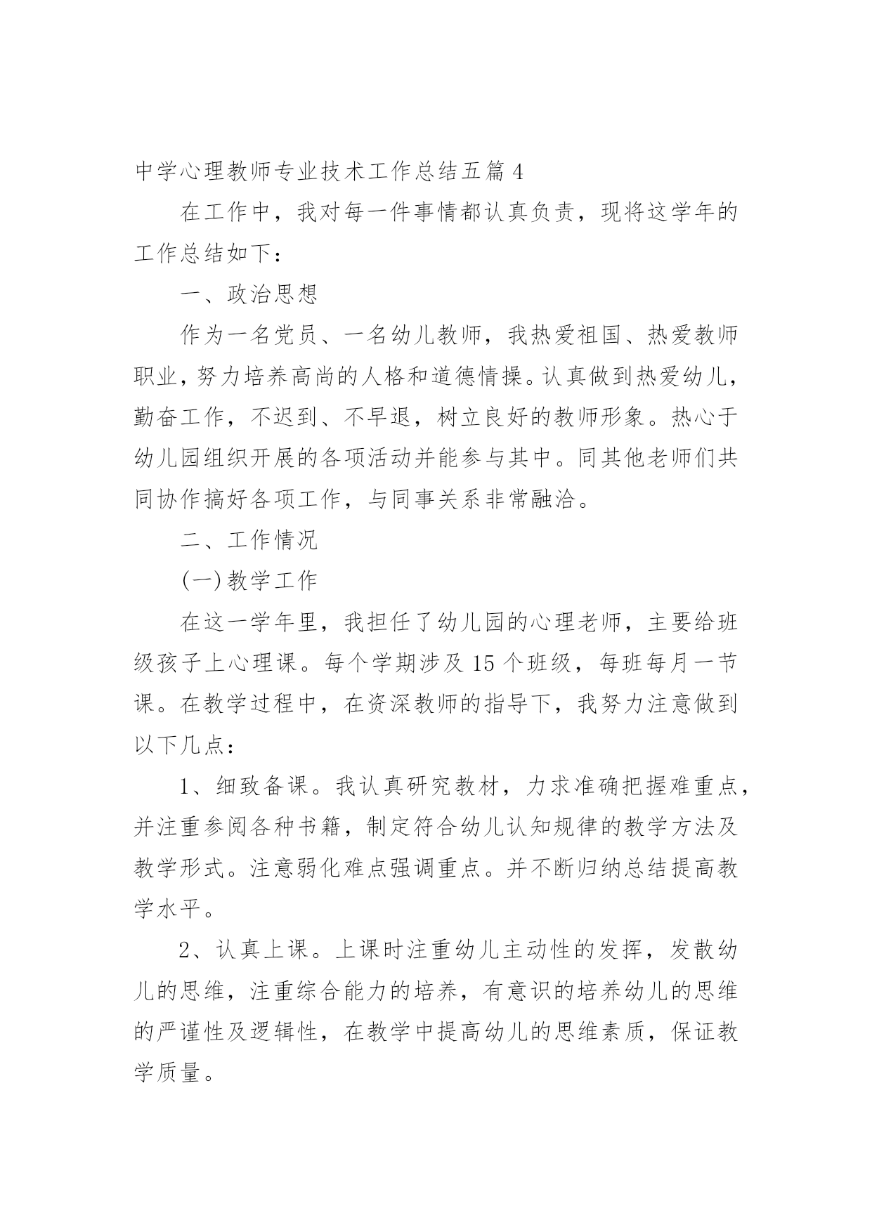 中学心理教师专业技术工作总结中学心理教师专业技术工作总结五篇总结在一个时期、一个年度、一个阶段对学习和工作生活等情况加以回顾和分析的一种书面材料,它能使我们及时找出错误并改正,因此我们要做好归纳,写好总结。如何把总结做到重点突出呢?以下是小编为大家整理的中学心理教师专业技术工作总结五篇,仅供参考,希望能够帮助到大家。中学心理教师专业技术工作总结五篇1本学期我担任初一年级心理健康老师,并负责运行管理心理咨询中心和开展全校学生心理咨询工作。工作总结如下:1、努力专研、自制教材:在初一年级没有心理健康教材的情况下,我自费购买市面上多种版本的初一心理健康课本及教师用书,并且查找文献资料学习国外发达国家先进的中学生心理健康课程理念,结合本校学生实际情况,自己制定和开设课程,使得课程更加切合学生实际,也能更加有效的帮助学生解决当下的心理问题。2、在“玩”中人格得到成长:有位著名的心理学家曾经说过:是游戏教会了一个人如何和这个世界相处,尤其对于青少年而言,游戏对于他们的健康成长尤其重要。心理健康课不是统考科目,因此很容易受到学生的忽视。如果课程再死板枯燥些,学生更加不会听课。所以我会设计了一些小游戏,让学生在玩中学,在玩中学会相处,在玩中人格得到成长。比如:在“盲人走路”的游戏中体会团结合作的力量。在“传传话”的游戏中体会到谣言是怎样诞生的。本学期最大型也是准备时间最长的活动就是”心理辩论赛”。同学们自己投票选出感兴趣的论题,展开辩论。比如辩题有“中学生该不该谈恋爱”“中学生该不该用手机”等等,都是他们最感兴趣的也是在心里埋藏已久的问题,不采用单纯说教,而是公开讨论,剖析。真理越变越明,在了解他们想法的同时,让他们自己判断利与弊,明辨是非曲折。3、使用专业量表,普查学生心理健康水平:本学期在全校范围内使用《青少年生活事件量表》,并在初一年级添加“房树人”测试。发现心理健康水平最易受到影响的事件中,初中学生是父母吵架打架和考试成绩不好,高中学生则是考试成绩不好,受到老师批评。而其中最要受到重视的是校园暴力事件,其中初中学生有9人自述受到校园暴力,高中年级有24人。高中年级有53人。并且均对自己的心理健康产生严重影响。下学期我们会对以上学生进行约谈深入一对一咨询。4、个体咨询显成效:本学期个体咨询时间均安排在放学之后,中午12点到2点,下午5点到7点,每次一个小时。共接待学生42人,其中4人为长程咨询(即每星期一次)。高中学生37人,初中学生5人。问题集中在学习方法、人际关系、学习压力方面。其中有3人筛查出抑郁倾向,建议到专科医院治疗。5、重宣传、知识进人心:在咨询室外开设宣传栏,根据不同时期的学生情况,提供不同的宣传单供学生取阅。比如:生活习惯主题,职业生涯主题、学习压力主题、为高三学生特别开设的高考特辑等等。受到同学们的欢迎。针对“525心理活动日”进行为期一周的心理健康知识的宣传。内容不光涵盖了中学生的各个方面,还把教师心理也包括在内。因为心理健康课没有在全校范围开展,所以借此机会让全体同学包括老师都了解心理健康知识,在遇到心理问题应该怎样处理。本学期我校心理咨询室还接受了省市区以及贵州大学各级领导的检查。在获得肯定的同时,我也希望以后的心理健康工作能给惠及更多的同学和老师。中学心理教师专业技术工作总结五篇2良好的心理素质是人的全面素质中的重要组成部分。因此,在小学开展心理健康教育,是学生健康成长的需要,是推进素质教育的必然要求。小学心理健康教育是帮助学生在学习生活中品尝解决困难的快乐,调整学习心态,提高学习兴趣与自信心,正确对待自己的学习成绩,克服厌学心理,体验学习成功的乐趣,培养面临各种问题的进取态度;培养集体意识,在班级活动中,善于与更多的同学交往,健全开朗、合群、乐学、自立的健康人格,培养自主自动参与活动的能力。我校根据学校的实际情况开展了丰富的心理健康教育活动,注意发挥各种方式和途径的综合作用,增强心理健康教育的效果。一、心理知识讲座我校定期开展心理知识讲座,普及心理健康科学常识,帮助学生掌握一般的心理保健知识,培养良好的心理素质。心理健康教育并非只是个别学生教育的需要,心理健康教育是面向全体学生的重要课题,因为心理健康是全员性的问题,是每一位学生在成长与发展中都必然会面临的挑战,包括那些学习优秀、在教师看来是“好”孩子的学生,也同样需要心理健康教育。许多研究与实践证明,有时这些“好”学生反而更需要心理健康教育。因为,往往由于学习成绩好,这些“好”学生心理发展中不健康的侧面就常常被忽视,得不到教师的重视和及时的帮助教育。如,一些“好”学生由于长期被宠、被捧,心理承受能力已变得极脆弱,稍不如意就发脾气,有的还采取极端措施进行打击、报复,甚至走上犯罪道路。可见,心理健康教育应成为我们学校教育的重要的防止心理健康教育学科化的倾向。