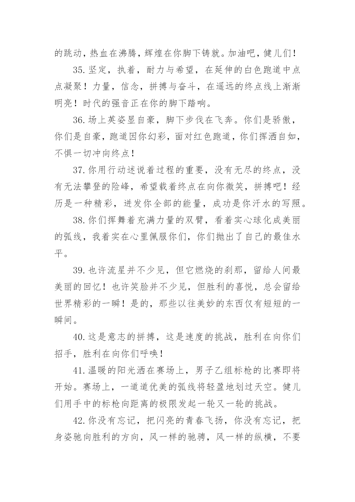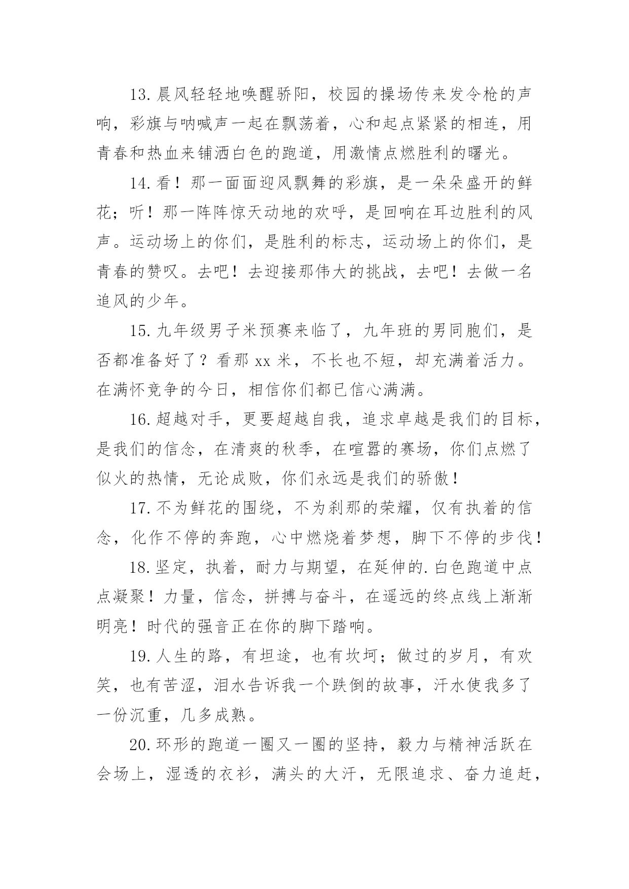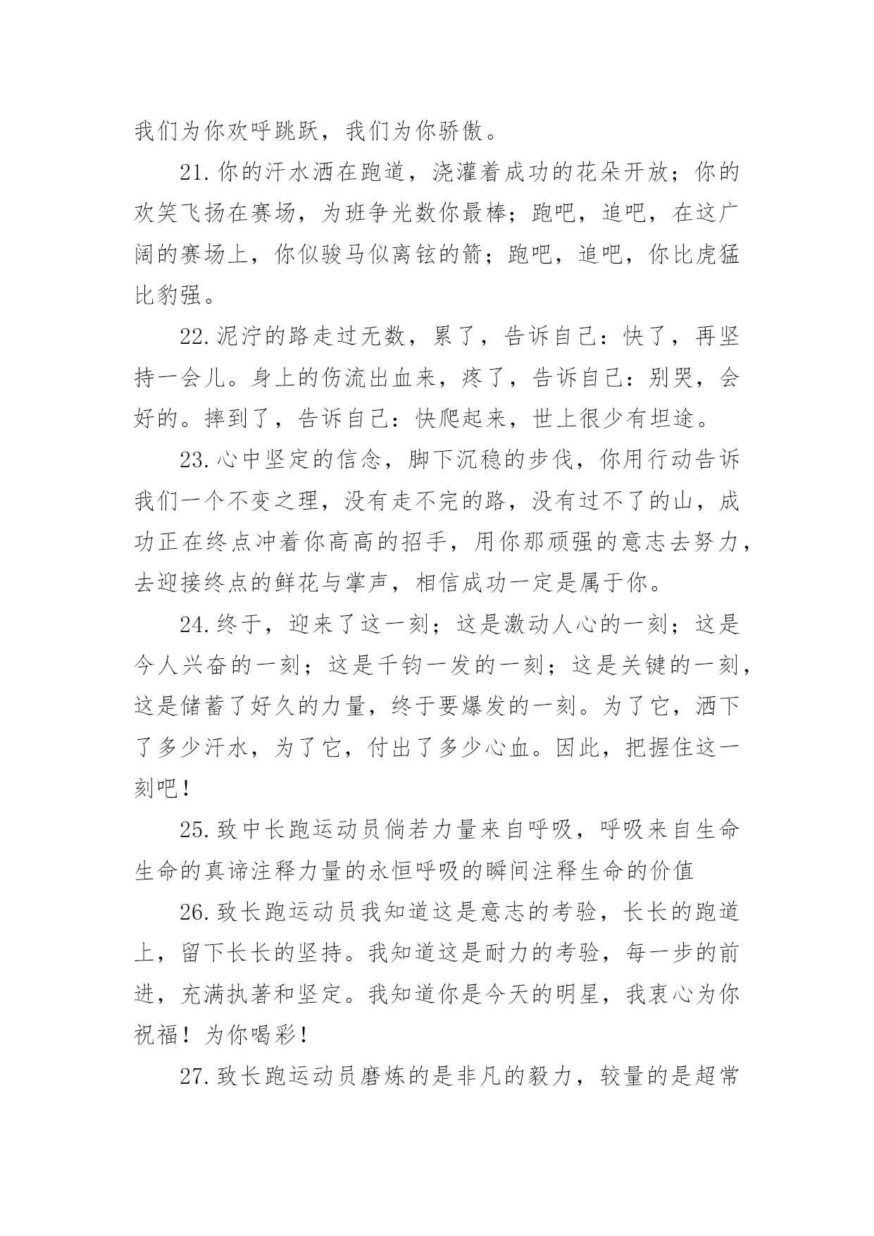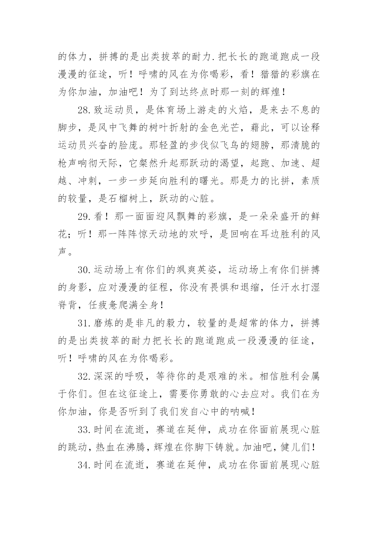 运动会加油稿运动会加油稿在充满活力,日益开放的今天,能够利用到加油稿的场合越来越多,借助加油稿可以活跃气氛,催人奋进。你知道加油稿怎样写才规范吗?下面是小编收集整理的运动会加油稿,仅供参考,希望能够帮助到大家。运动会加油稿11.泰戈尔在诗中说,天空没有翅膀的影子,但我已飞过;艾青对朋友说,也许有人到达不了彼岸,但我们共同拥有大海。也许你们没有显赫的成绩,但运动场上留下了你们的足迹。也许你们没有奖品,但我们心中留下了你们拼搏的身影。所有的努力都是为了迎接这一刹那,所有的拼搏都是为了这一声令下。2.赞三千米坚持者:漫漫长路,你愿一人独撑,忍受着孤独与寂寞,承受着体力与精神的压迫,只任汗水溶于泪水,可脚步却从不停歇。好样的,纵然得不了桂冠,可坚持的你,定会赢得最后的掌声。3.看台上,千百只眼睛充满希望的望着你。人生拼搏的机会能有几何?把握机会,一定成功!4.马上就要进行高一女子400米预赛了,伍月莹,黄海花加油!希望你们在赛场上能够赛出自己的风采,没有你们的拼搏奋进,就没有赛场上的即激烈,呐喊声,加油!你们永远是最棒的想雄鹰展翅一般,勇向终点,我们等着你的加油!5.昨天的辉煌与失败已成为过去,今天又是一个崭新的看似是,高二(xx)班的同学们,你们个个朝气蓬勃,英姿煞爽,加油!让我们一齐偶写出关于青春青春的赞歌,展示青春的活力和风采!许一个美好的心愿,祝你快乐连连没送一份美妙的感觉祝万事圆圆,写一句股东的话语,祝你胜利!6.踏上跑道,是一种选择。离开起点,是一种勇气。驰骋赛场,是一种胜利。7.看,终点就在眼前;听,同学为你呼喊。鼓起勇气奋力向前,用你的荣誉带给我们希望。8.运动健将们,用你的实力,用你的精神,去开拓出,一片属于你的长跑天地!9.不为掌声的注释,不为刻意的征服,不为失败的痛苦,只有辛勤的汗水,化作成功的脚步!10.不为鲜花的围绕,不为刹那的荣耀,只有执着的信念,化作不停的奔跑,心中燃烧着梦想,脚下不停的步伐!11.1500米既是对你实力的考验,又是对你耐力的考察,经过1500米之后,及将变得更强,xx,我们的xx,我们的开心过,向前冲吧!1500米虽漫长。但我们的情谊更长,xx加油!12.今天的你们英姿飒爽,今天的你们朝气蓬勃,今天的你们一马当先。相信自己,你是最棒的!不要放弃,不要气馁。成功永远属于你们。运动员~加油!13.晨风轻轻地唤醒骄阳,校园的操场传来发令枪的声响,彩旗与呐喊声一起在飘荡着,心和起点紧紧的相连,用青春和热血来铺洒白色的跑道,用激情点燃胜利的曙光。14.看!那一面面迎风飘舞的彩旗,是一朵朵盛开的鲜花;听!那一阵阵惊天动地的欢呼,是回响在耳边胜利的风声。运动场上的你们,是胜利的标志,运动场上的你们,是青春的赞叹。去吧!去迎接那伟大的挑战,去吧!去做一名追风的少年。15.九年级男子米预赛来临了,九年班的男同胞们,是否都准备好了?看那xx米,不长也不短,却充满着活力。在满怀竞争的今日,相信你们都已信心满满。16.超越对手,更要超越自我,追求卓越是我们的目标,是我们的信念,在清爽的秋季,在喧嚣的赛场,你们点燃了似火的热情,无论成败,你们永远是我们的骄傲!17.不为鲜花的围绕,不为刹那的荣耀,仅有执着的信念,化作不停的奔跑,心中燃烧着梦想,脚下不停的步伐!18.坚定,执着,耐力与期望,在延伸的.白色跑道中点点凝聚!力量,信念,拼搏与奋斗,在遥远的终点线上渐渐明亮!时代的强音正在你的脚下踏响。19.人生的路,有坦途,也有坎坷;做过的岁月,有欢笑,也有苦涩,泪水告诉我一个跌倒的故事,汗水使我多了一份沉重,几多成熟。20.环形的跑道一圈又一圈的坚持,毅力与精神活跃在会场上,湿透的衣衫,满头的大汗,无限追求、奋力追赶,我们为你欢呼跳跃,我们为你骄傲。21.你的汗水洒在跑道,浇灌着成功的花朵开放;你的欢笑飞扬在赛场,为班争光数你最棒;跑吧,追吧,在这广阔的赛场上,你似骏马似离铉的箭;跑吧,追吧,你比虎猛比豹强。22.泥泞的路走过无数,累了,告诉自己:快了,再坚持一会儿。身上的伤流出血来,疼了,告诉自己:别哭,会好的。摔到了,告诉自己:快爬起来,世上很少有坦途。23.心中坚定的信念,脚下沉稳的步伐,你用行动告诉我们一个不变之理,没有走不完的路,没有过不了的山,成功正在终点冲着你高高的招手,用你那顽强的意志去努力,去迎接终点的鲜花与掌声,相信成功一定是属于你。24.终于,迎来了这一刻;这是激动人心的一刻;这是今人兴奋的一刻;这是千钧一发的一刻;这是关键的一刻,这是储蓄了好久的力量,终于要爆发的一刻。为了它,洒下了多少汗水,为了它,付出了多少心血。因此,把握住这一刻吧!25.致中长跑运动员倘若力量来自呼吸,呼吸来自生命生命的真谛注释力量的永恒呼吸的瞬间注释生命的价值26.致长跑运动员我知道这是意志的考验,长长的跑道上,留