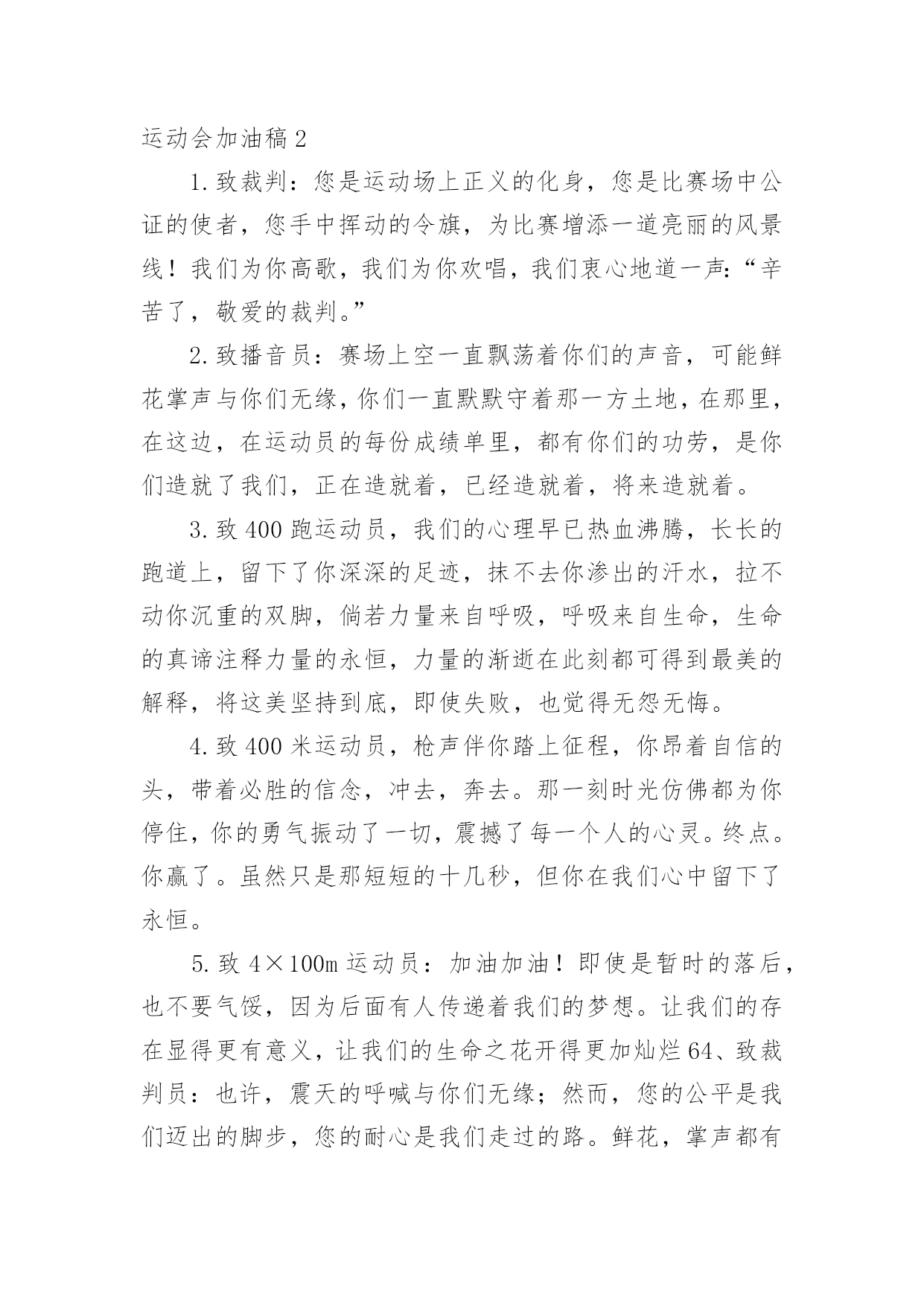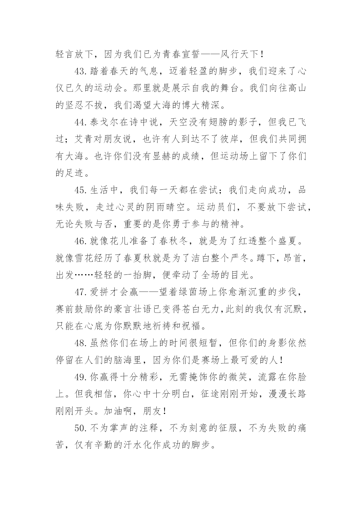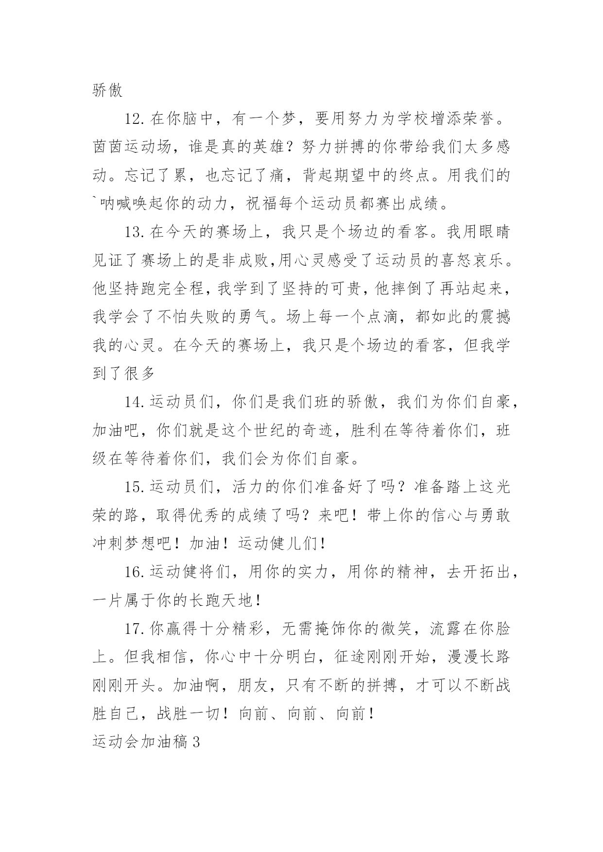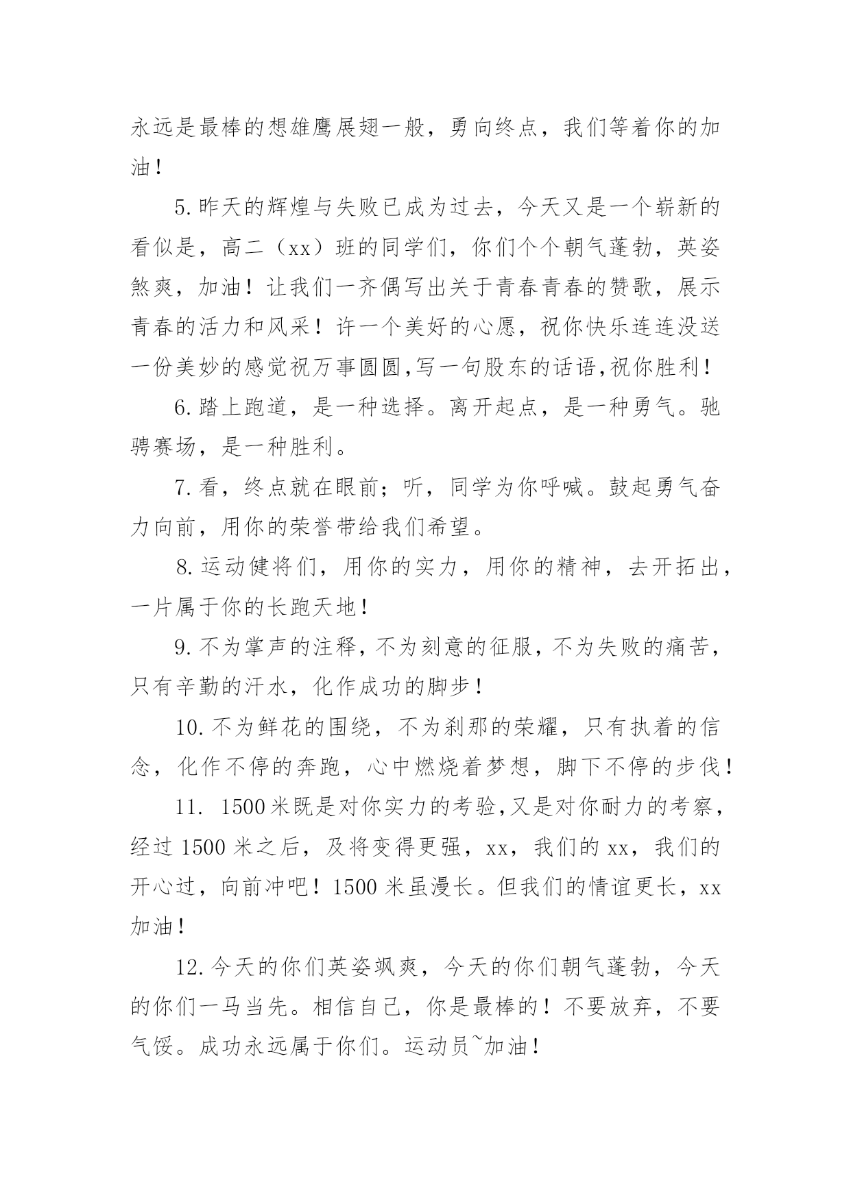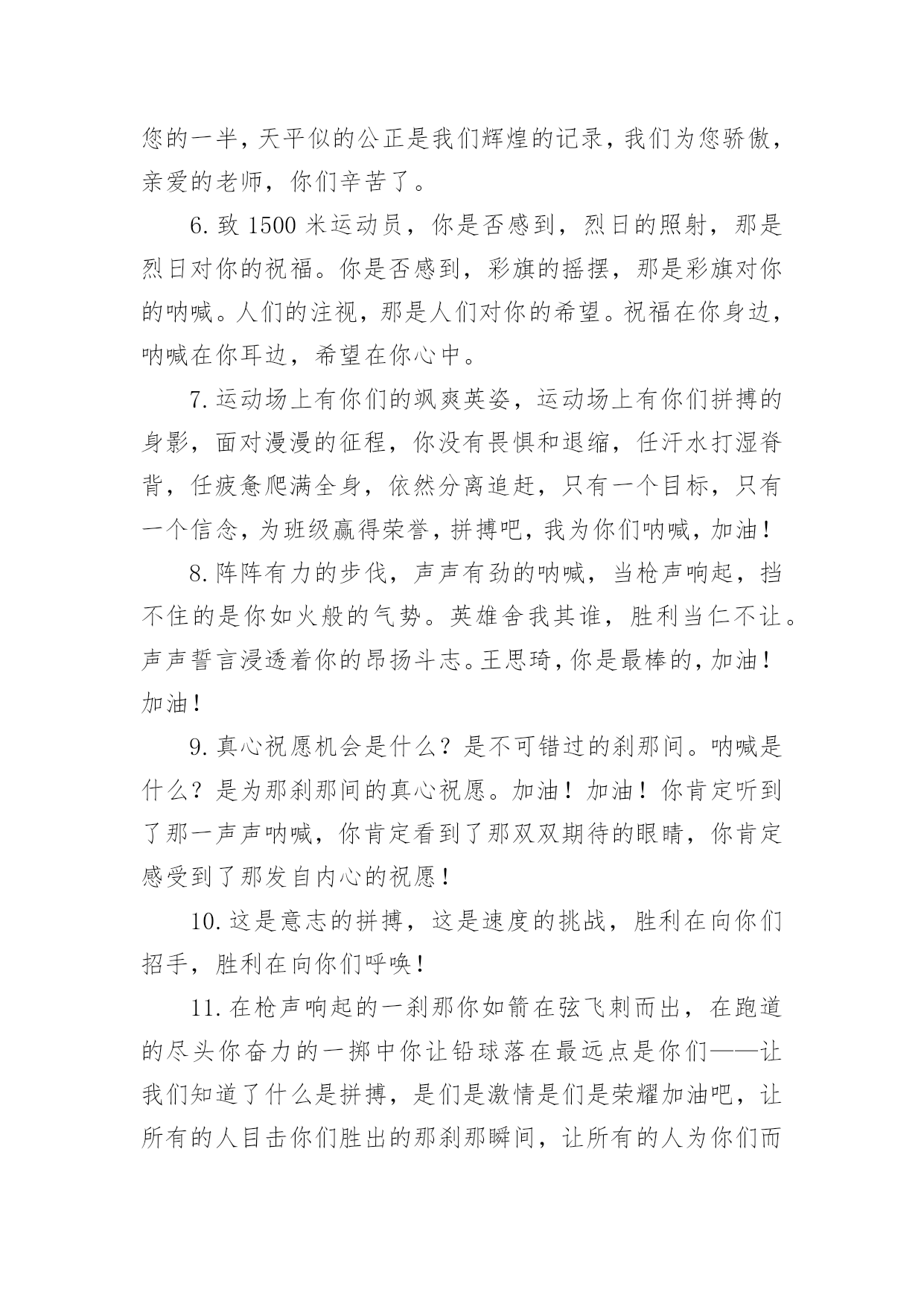 运动会加油稿运动会加油稿在充满活力,日益开放的今天,能够利用到加油稿的场合越来越多,借助加油稿可以活跃气氛,催人奋进。你知道加油稿怎样写才规范吗?下面是小编收集整理的运动会加油稿,仅供参考,希望能够帮助到大家。运动会加油稿11.泰戈尔在诗中说,天空没有翅膀的影子,但我已飞过;艾青对朋友说,也许有人到达不了彼岸,但我们共同拥有大海。也许你们没有显赫的成绩,但运动场上留下了你们的足迹。也许你们没有奖品,但我们心中留下了你们拼搏的身影。所有的努力都是为了迎接这一刹那,所有的拼搏都是为了这一声令下。2.赞三千米坚持者:漫漫长路,你愿一人独撑,忍受着孤独与寂寞,承受着体力与精神的压迫,只任汗水溶于泪水,可脚步却从不停歇。好样的,纵然得不了桂冠,可坚持的你,定会赢得最后的掌声。3.看台上,千百只眼睛充满希望的望着你。人生拼搏的机会能有几何?把握机会,一定成功!4.马上就要进行高一女子400米预赛了,伍月莹,黄海花加油!希望你们在赛场上能够赛出自己的风采,没有你们的拼搏奋进,就没有赛场上的即激烈,呐喊声,加油!你们永远是最棒的想雄鹰展翅一般,勇向终点,我们等着你的加油!5.昨天的辉煌与失败已成为过去,今天又是一个崭新的看似是,高二(xx)班的同学们,你们个个朝气蓬勃,英姿煞爽,加油!让我们一齐偶写出关于青春青春的赞歌,展示青春的活力和风采!许一个美好的心愿,祝你快乐连连没送一份美妙的感觉祝万事圆圆,写一句股东的话语,祝你胜利!6.踏上跑道,是一种选择。离开起点,是一种勇气。驰骋赛场,是一种胜利。7.看,终点就在眼前;听,同学为你呼喊。鼓起勇气奋力向前,用你的荣誉带给我们希望。8.运动健将们,用你的实力,用你的精神,去开拓出,一片属于你的长跑天地!9.不为掌声的注释,不为刻意的征服,不为失败的痛苦,只有辛勤的汗水,化作成功的脚步!10.不为鲜花的围绕,不为刹那的荣耀,只有执着的信念,化作不停的奔跑,心中燃烧着梦想,脚下不停的步伐!11.1500米既是对你实力的考验,又是对你耐力的考察,经过1500米之后,及将变得更强,xx,我们的xx,我们的开心过,向前冲吧!1500米虽漫长。但我们的情谊更长,xx加油!12.今天的你们英姿飒爽,今天的你们朝气蓬勃,今天的你们一马当先。相信自己,你是最棒的!不要放弃,不要气馁。成功永远属于你们。运动员~加油!13.晨风轻轻地唤醒骄阳,校园的操场传来发令枪的声响,彩旗与呐喊声一起在飘荡着,心和起点紧紧的相连,用青春和热血来铺洒白色的跑道,用激情点燃胜利的曙光。14.看!那一面面迎风飘舞的彩旗,是一朵朵盛开的鲜花;听!那一阵阵惊天动地的欢呼,是回响在耳边胜利的风声。运动场上的你们,是胜利的标志,运动场上的你们,是青春的赞叹。去吧!去迎接那伟大的挑战,去吧!去做一名追风的少年。15.九年级男子米预赛来临了,九年班的男同胞们,是否都准备好了?看那xx米,不长也不短,却充满着活力。在满怀竞争的今日,相信你们都已信心满满。16.超越对手,更要超越自我,追求卓越是我们的目标,是我们的信念,在清爽的秋季,在喧嚣的赛场,你们点燃了似火的热情,无论成败,你们永远是我们的骄傲!17.不为鲜花的围绕,不为刹那的荣耀,仅有执着的信念,化作不停的奔跑,心中燃烧着梦想,脚下不停的步伐!18.坚定,执着,耐力与期望,在延伸的.白色跑道中点点凝聚!力量,信念,拼搏与奋斗,在遥远的终点线上渐渐明亮!时代的强音正在你的脚下踏响。19.人生的路,有坦途,也有坎坷;做过的岁月,有欢笑,也有苦涩,泪水告诉我一个跌倒的故事,汗水使我多了一份沉重,几多成熟。20.环形的跑道一圈又一圈的坚持,毅力与精神活跃在会场上,湿透的衣衫,满头的大汗,无限追求、奋力追赶,我们为你欢呼跳跃,我们为你骄傲。21.你的汗水洒在跑道,浇灌着成功的花朵开放;你的欢笑飞扬在赛场,为班争光数你最棒;跑吧,追吧,在这广阔的赛场上,你似骏马似离铉的箭;跑吧,追吧,你比虎猛比豹强。22.泥泞的路走过无数,累了,告诉自己:快了,再坚持一会儿。身上的伤流出血来,疼了,告诉自己:别哭,会好的。摔到了,告诉自己:快爬起来,世上很少有坦途。23.心中坚定的信念,脚下沉稳的步伐,你用行动告诉我们一个不变之理,没有走不完的路,没有过不了的山,成功正在终点冲着你高高的招手,用你那顽强的意志去努力,去迎接终点的鲜花与掌声,相信成功一定是属于你。24.终于,迎来了这一刻;这是激动人心的一刻;这是今人兴奋的一刻;这是千钧一发的一刻;这是关键的一刻,这是储蓄了好久的力量,终于要爆发的一刻。为了它,洒下了多少汗水,为了它,付出了多少心血。因此,把握住这一刻吧!25.致中长跑运动员倘若力量来自呼吸,呼吸来自生命生命的真谛注释力量的永恒呼吸的瞬间注释生命的价值26.致长跑运动员我知道这是意志的考验,长长的跑道上,留