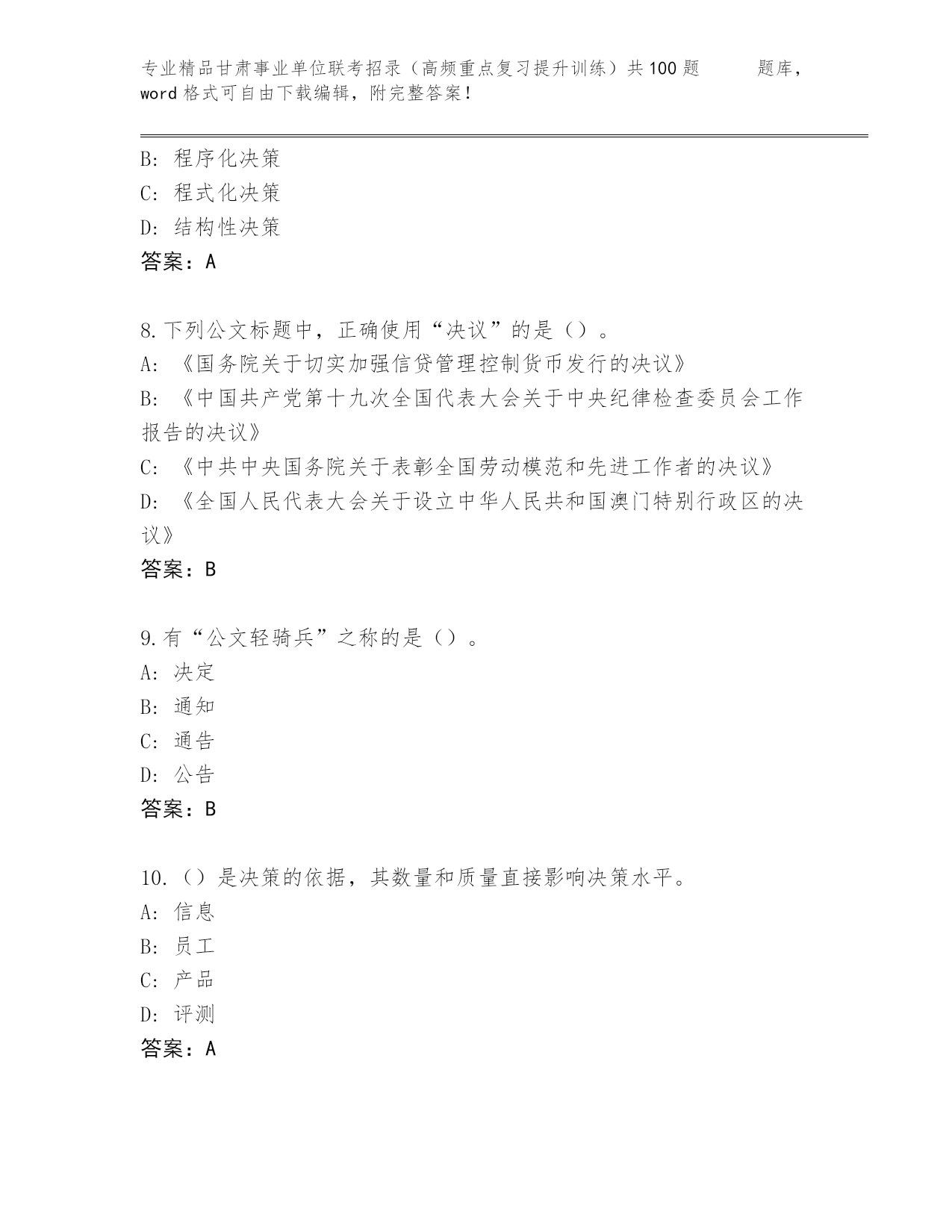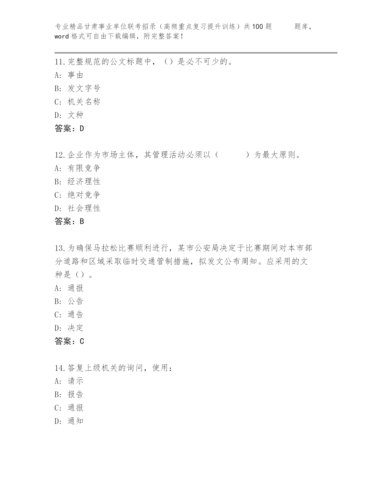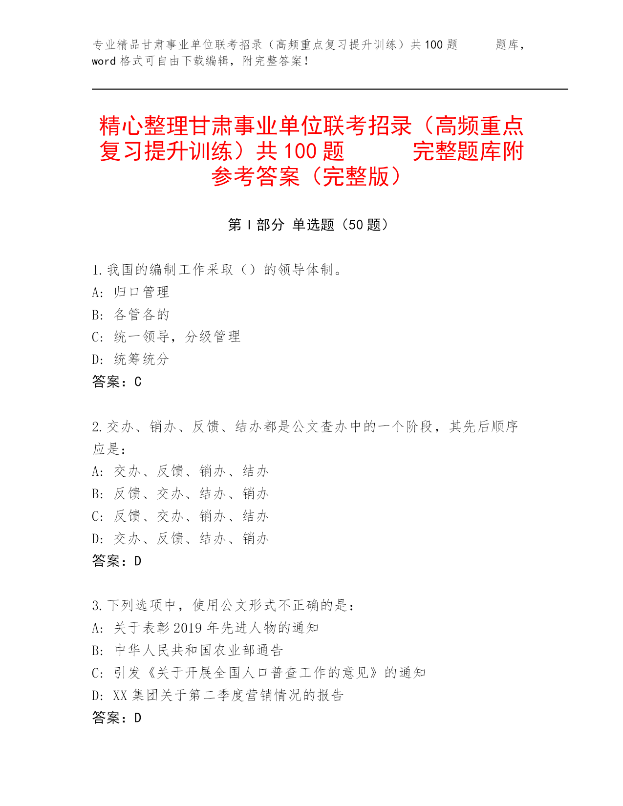 精心整理甘肃事业单位联考招录(高频重点复习提升训练)共100题 完整题库(综合题)