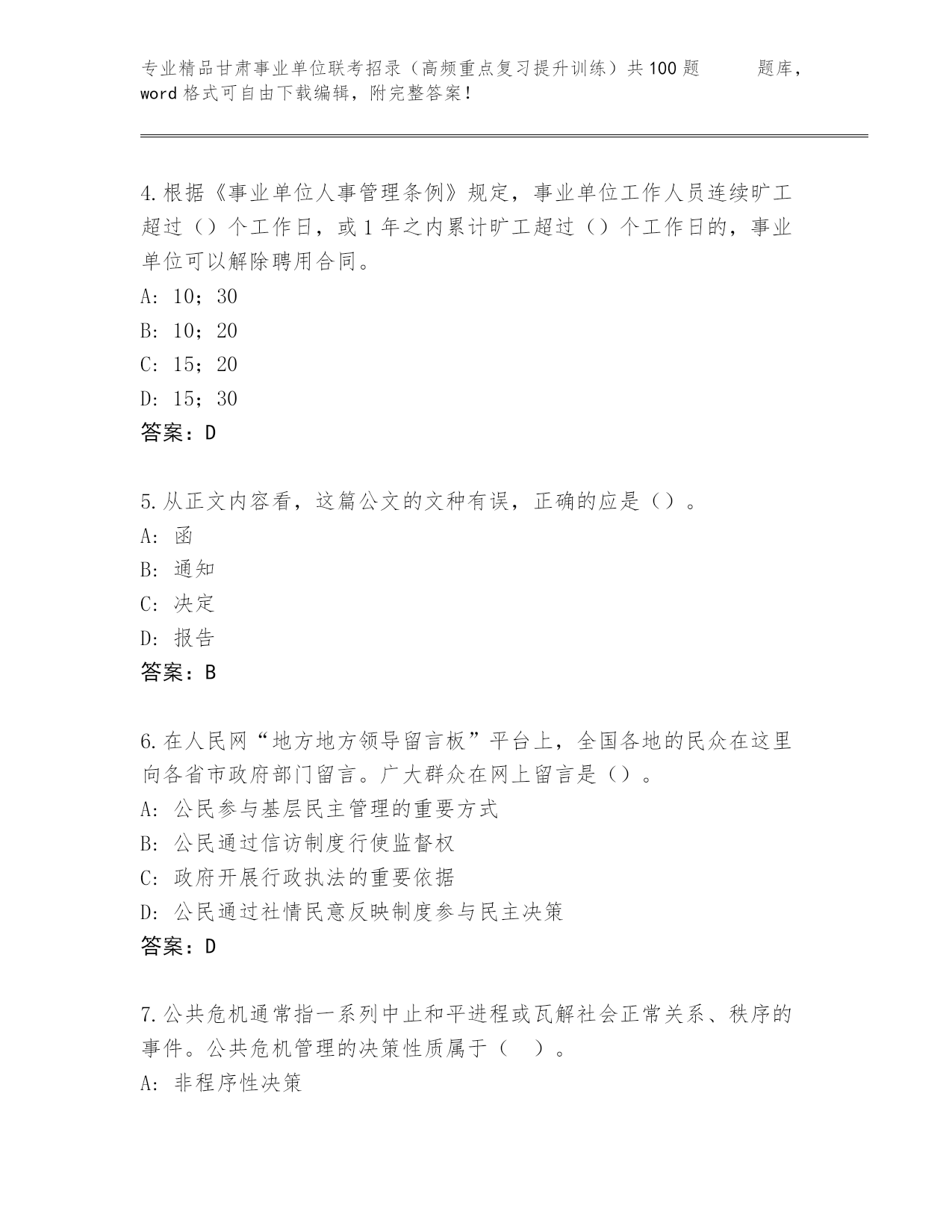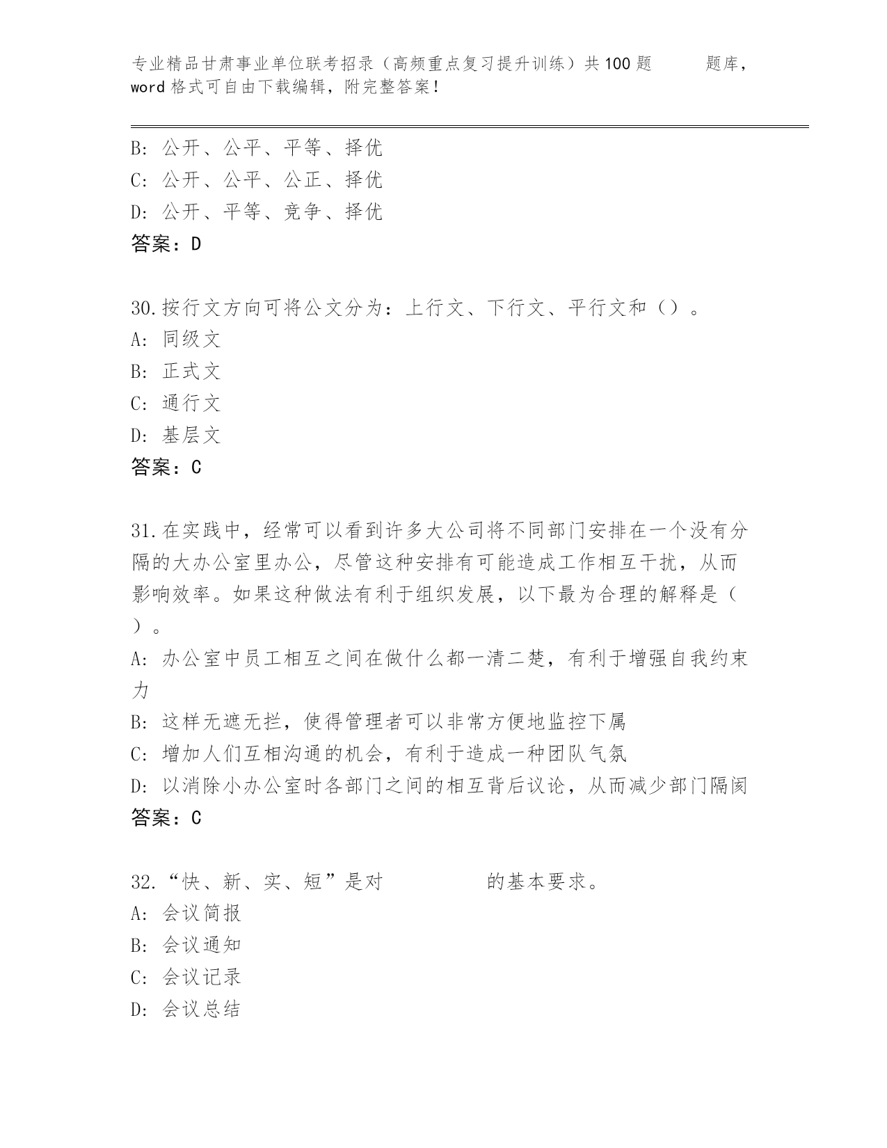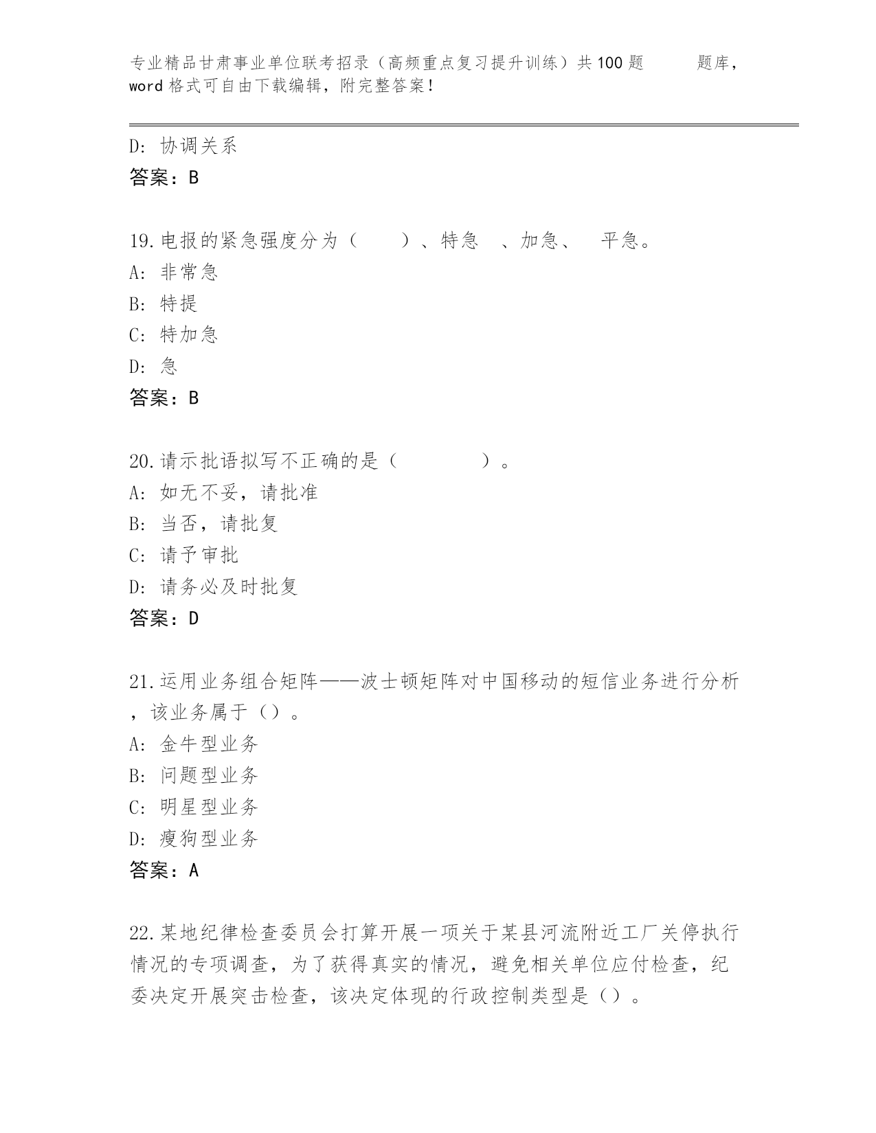 精心整理甘肃事业单位联考招录(高频重点复习提升训练)共100题 题库【精选题】