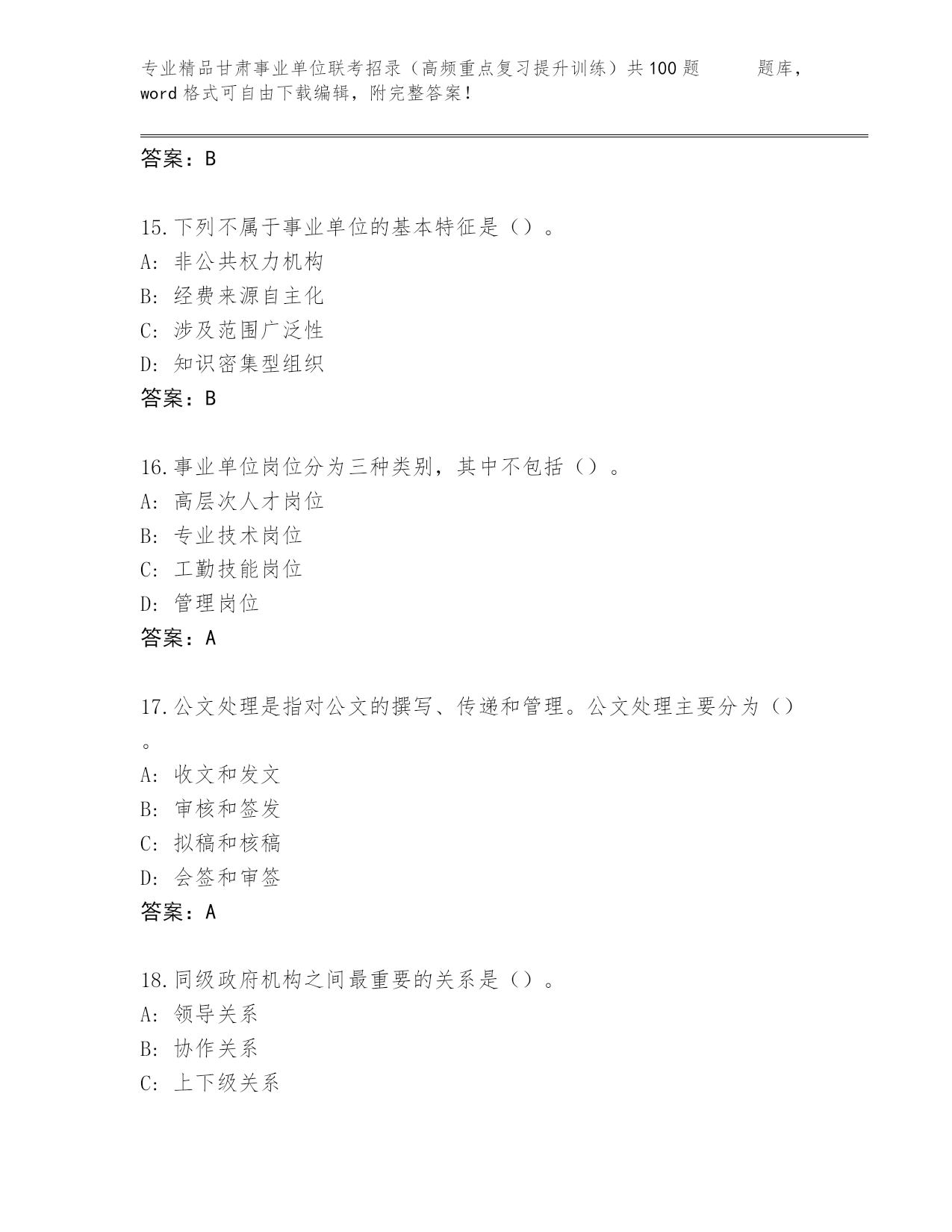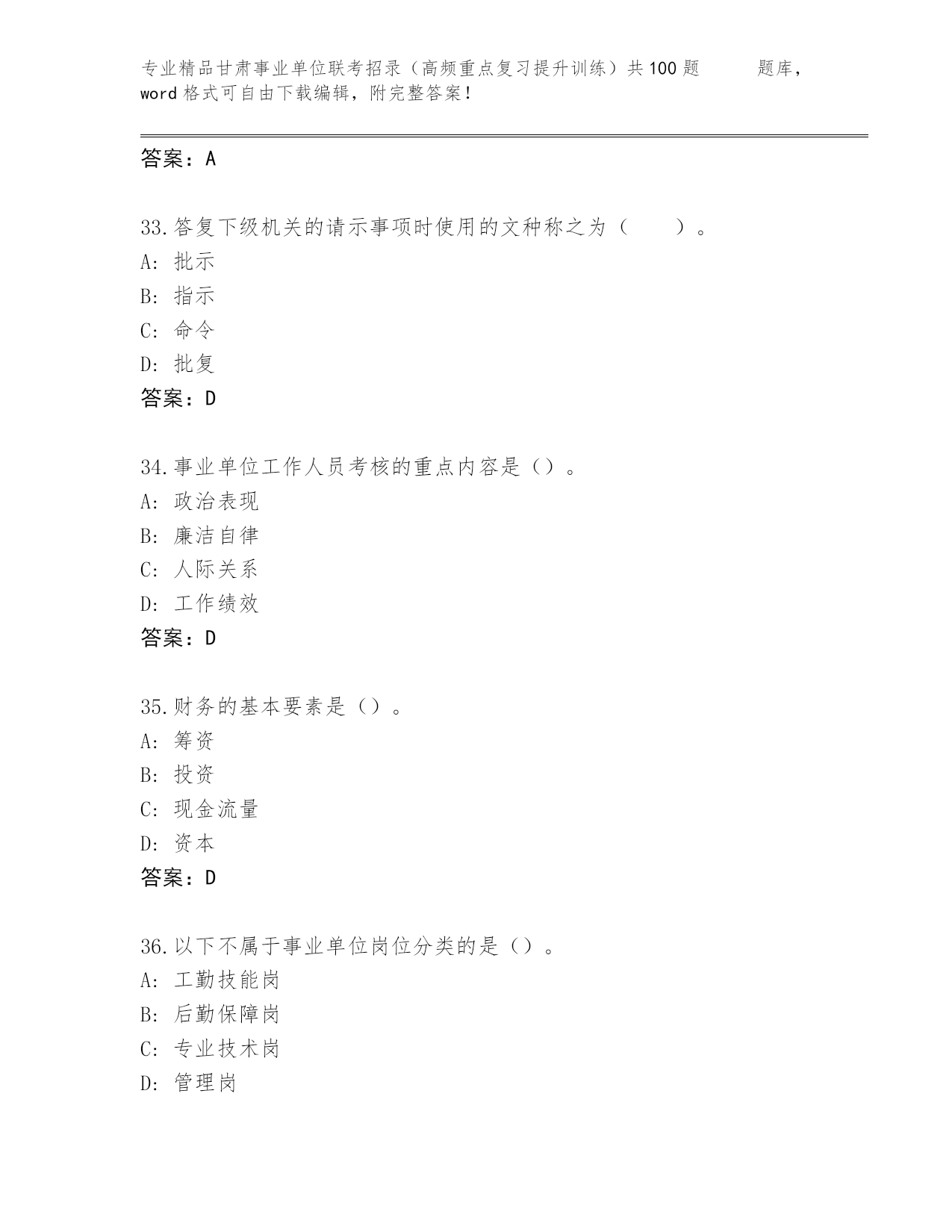 精心整理甘肃事业单位联考招录(高频重点复习提升训练)共100题 内部题库及参考答案(能力提升)
