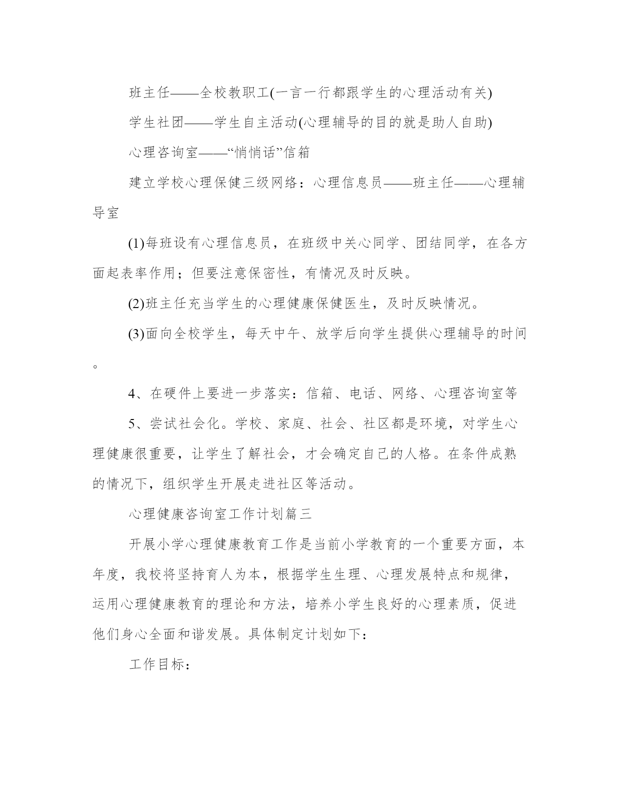 最新心理健康咨询室工作计划(十三篇)光阴的迅速,一眨眼就过去了,成绩已属于过去,新一轮的工作即将来临,写好计划才不会让我们努力的时候迷失方向哦。计划怎么写才能发挥它最大的作用呢?下面是我给大家整理的计划范文,欢迎大家阅读分享借鉴,希望对大家能够有所帮助。心理健康咨询室工作计划篇一一、目标小学心理健康教育的直接目标是提高全体学生的心理素质,最终目标是促进学生人格的健全发展。结合学生实际,确立我校的具体工作目标如下:了解自我。培养良好的学习适应能力、养成理想的人际交往习惯、养成理想的人际交往习惯、促进人格的健全发展。努力使小学生成为一个自信,自立,自强的合格的小学生。并对孩子的学习有个好的支持作用。二、实施方案1、根据学生心理发展特点和身心发展规律,面向全体学生有针对性地实施教育;2、面向全体学生,通过普遍开展教育活动,使学生对心理健康教育有积极的认识,使心理素质逐步得到提高;3、关注个别差异,尊重学生的尊严和价值,根据不同学生的不同需要开展多种形式的教育和辅导,提高他们的心理健康水平;4、尊重学生,以学生为主体,充分启发和调动学生的积极性。积极做到心理健康教育的科学性和针对性相结合;5、面对全体学生与关注个别差异相结合;6、预防和矫治相结合;7、教师的科学辅导和学生的主动参与相结合;8、助人与自助相结合9、心理教育宣传和心理辅导相结合三、具体工作内容安排四、具体时间安排周一至周五:中午12:50——13:50下午16:10——17:10(其它时间的咨询辅导由学生另行预约)心理健康咨询室工作计划篇二结合我校的实际情况,特制订本计划,采取积极有效的措施,推进我校心理健康教育发展,以创新的思路推进心理健康教育校本模式的持续发展,全面促进学生健康成长。增加学生心理健康教育的实效性,减少和预防学生心理问题的产生与发展,积极挽救有心理疾病的学生。一、做好心理咨询室的常规工作1、认真上好每一堂心理课,使学生对心理健康有一个正确的认识,充分挖掘学生的主观能动性,由不情不愿到发自内心的需要。2、每天定时、定人坚持做好“心理咨询室”的开放工作;3、对于年级中反映的心理状况异常的学生给予重点关注4、特别关注生活在特殊家庭中的学生;5、及时为“尖子生”提供有效支持;6、与班主任老师共同学习有关班级心理辅导的内容;7、主动作好与家长的沟通互动;8、搞好心理辅导的科研工作,开设讲座。9、根据心理咨询情况,及时与老师、家长取得联系,共同引导学生。二、心理辅导工作在学校领导的关心指导下,除了做好常规工作外,在思想、组织、宣传、硬件等方面进一步做到规范。1、作为心理辅导老师首先在思想上要以学生发展为本,要充分认识到学生不规范的行为或多或少都与心理问题有关,都是自己份内的事,要主动出击而不仅仅是“守株待兔”。2、要大力宣传心理健康的重要性,建立宣传工作的四个体系:面向全体教师、面向全体学生、面向家长、面向心理偏差学生设立一个心理健康宣传周,利用广播、黑板报、知识竞赛等,推动全校师生共同关心心理健康问题。3、在组织上要给予落实,拟建立学校心理宣传、保健两条三级网络。建立学校心理宣传三级网络:班主任——全校教职工(一言一行都跟学生的心理活动有关)学生社团——学生自主活动(心理辅导的目的就是助人自助)心理咨询室——“悄悄话”信箱建立学校心理保健三级网络:心理信息员——班主任——心理辅导室(1)每班设有心理信息员,在班级中关心同学、团结同学,在各方面起表率作用;但要注意保密性,有情况及时反映。(2)班主任充当学生的心理健康保健医生,及时反映情况。(3)面向全校学生,每天中午、放学后向学生提供心理辅导的时间。4、在硬件上要进一步落实:信箱、电话、网络、心理咨询室等5、尝试社会化。学校、家庭、社会、社区都是环境,对学生心理健康很重要,让学生了解社会,才会确定自己的人格。在条件成熟的情况下,组织学生开展走进社区等活动。心理健康咨询室工作计划篇三开展小学心理健康教育工作是当前小学教育的一个重要方面,本年度,我校将坚持育人为本,根据学生生理、心理发展特点和规律,运用心理健康教育的理论和方法,培养小学生良好的心理素质,促进他们身心全面和谐发展。具体制定计划如下:工作目标:一、培养和造就具有良好的文明习惯、学习习惯、生活习惯、劳动习惯和卫生习惯,具有坚忍不拔的意志品质,自立自强的生存、生活能力,有强烈的爱国意识和社会责任感,会做人,会求知,会创新,能从容迎接未来挑战的高素质的人才。二、通过心理健康教育,帮助学生学会调适。帮助学生学会正确对待自己、接纳自己,化解冲突情绪,保持个人心理的内部和谐。矫治学生的问题行为,养成正确的适应学校与社会的行为,消除人际交往障碍,提高人际交往的质量。