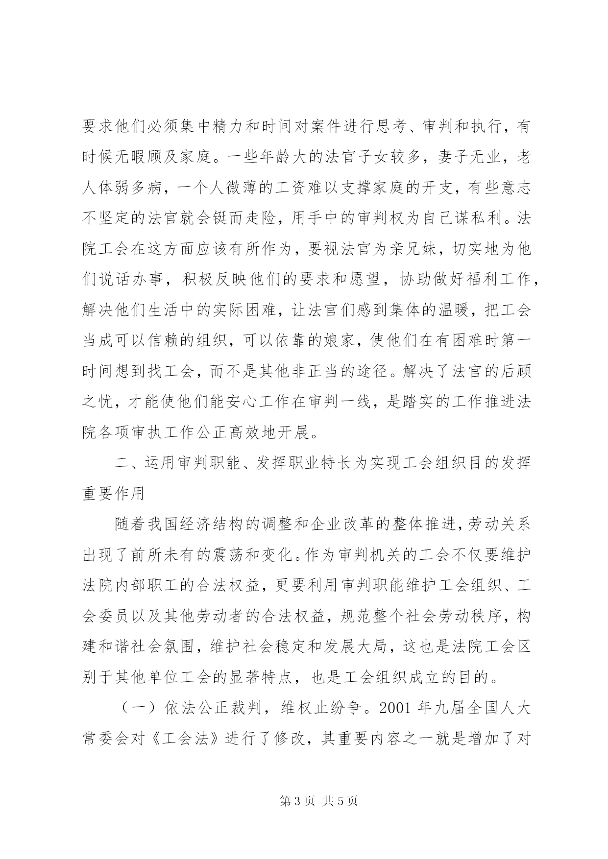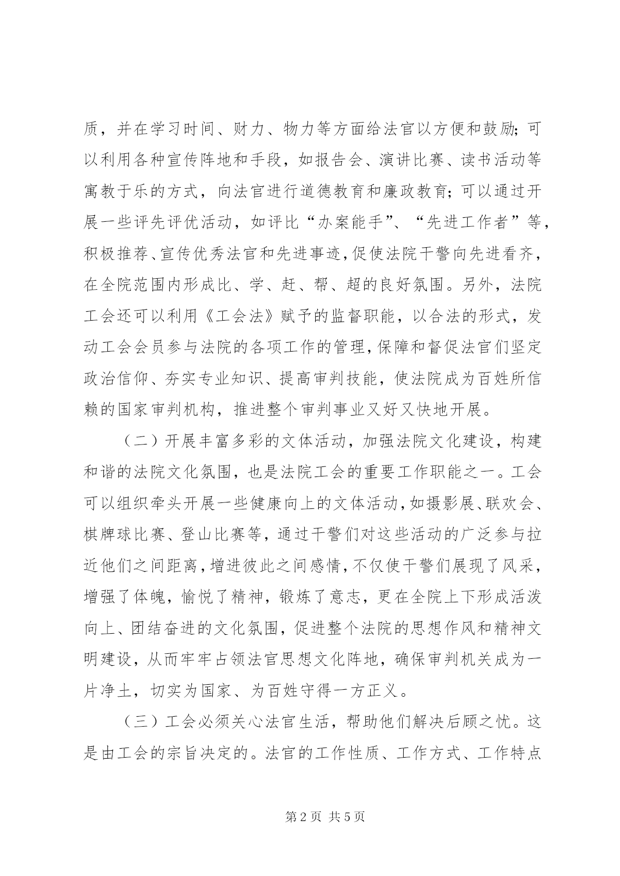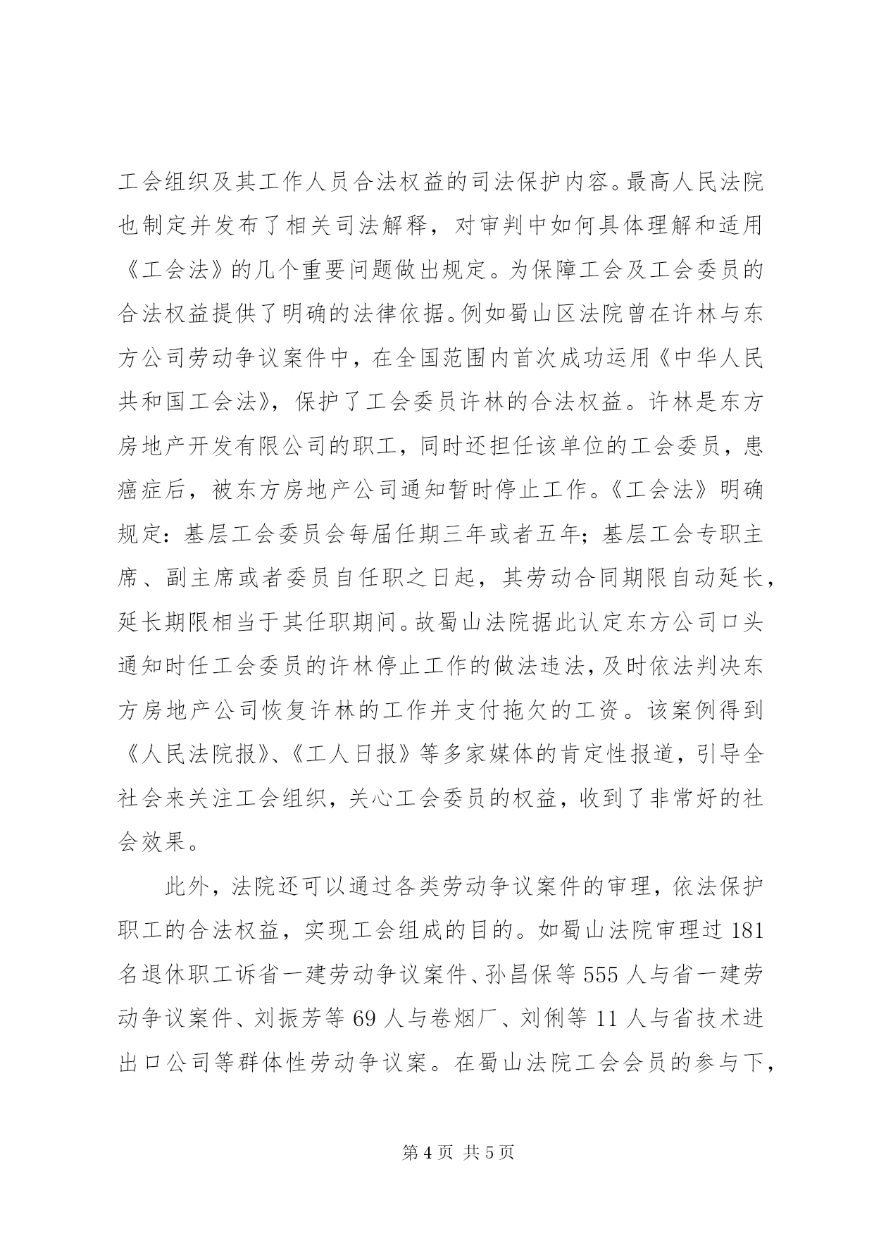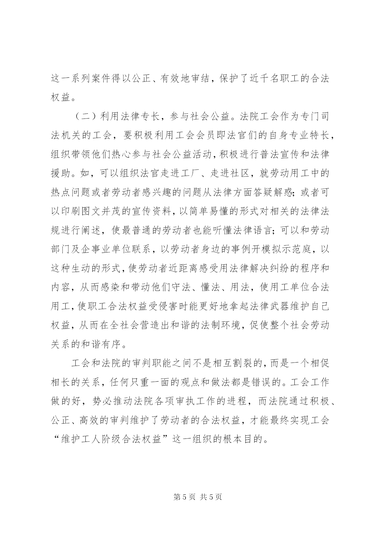 第PAGE\*Arabic\*MERGEFORMAT5页共NUMPAGES\*MERGEFORMAT5页工会与司法审判工作汇报工会是职工自愿结合的工人阶级的群众组织。在我国,工会较普遍地存在于各种性质的企业、事业单位中,为维护职工权益,监督企事业单位合法用工,稳定社会秩序起到了非常积极的作用。在法院,工会因为法院本身具备的司法审判的职能而和其他单纯维护本单位职工利益的工会有所区别,工会作用不仅是传统观念所认为的“组织娱乐唱唱歌、安排比赛下下棋”,更与法院充分地发挥审判职能有着密不可分的关系。一、工会帮助提升法官综合素质,全力服务法院审判大局法院作为维护社会正义的最后一道防线,如果法官业务不熟,就会出现“葫芦僧办糊涂案”,如果法官道德沦丧,则会出现枉法裁判,导致冤假错案,这必将是社会的不幸,法制的悲哀。《中华人民共和国工会法》第七条规定“工会动员和组织职工积极参加经济建设,努力完成生产任务和工作任务。教育职工不断提高思想道德、技术业务和科学文化素质,建设有理想、有道德、有文化、有纪律的职工队伍”。可见,提高帮助、教育法官,协助、督促法院工作是工会义不容辞的法定职责。(一)法院工会可以通过各种政治学习,如“社会主义法治理念教育”、“大学习大讨论”等活动,着力提高法官的政治理论素质;可以根据审判工作需要,主动与教育培训部门配合,通过学历教育、专业培训、技能考试等形式着力提高法官的业务素质,并在学习时间、财力、物力等方面给法官以方便和鼓励;可以利用各种宣传阵地和手段,如报告会、演讲比赛、读书活动等寓教于乐的方式,向法官进行道德教育和廉政教育;可以通过开展一些评先评优活动,如评比“办案能手”、“先进工作者”等,积极推荐、宣传优秀法官和先进事迹,促使法院干警向先进看齐,在全院范围内形成比、学、赶、帮、超的良好氛围。另外,法院工会还可以利用《工会法》赋予的监督职能,以合法的形式,发动工会会员参与法院的各项工作的管理,保障和督促法官们坚定政治信仰、夯实专业知识、提高审判技能,使法院成为百姓所信赖的国家审判机构,推进整个审判事业又好又快地开展。(二)开展丰富多彩的文体活动,加强法院文化建设,构建和谐的法院文化氛围,也是法院工会的重要工作职能之一。工会可以组织牵头开展一些健康向上的文体活动,如摄影展、联欢会、棋牌球比赛、登山比赛等,通过干警们对这些活动的广泛参与拉近他们之间距离,增进彼此之间感情,不仅使干警们展现了风采,增强了体魄,愉悦了精神,锻炼了意志,更在全院上下形成活泼向上、团结奋进的文化氛围,促进整个法院的思想作风和精神文明建设,从而牢牢占领法官思想文化阵地,确保审判机关成为一片净土,切实为国家、为百姓守得一方正义。(三)工会必须关心法官生活,帮助他们解决后顾之忧。这是由工会的宗旨决定的。法官的工作性质、工作方式、工作特点要求他们必须集中精力和时间对案件进行思考、审判和执行,有时候无暇顾及家庭。一些年龄大的法官子女较多,妻子无业,老人体弱多病,一个人微薄的工资难以支撑家庭的开支,有些意志不坚定的法官就会铤而走险,用手中的审判权为自己谋私利。法院工会在这方面应该有所作为,要视法官为亲兄妹,切实地为他们说话办事,积极反映他们的要求和愿望,协助做好福利工作,解决他们生活中的实际困难,让法官们感到集体的温暖,把工会当成可以信赖的组织,可以依靠的娘家,使他们在有困难时第一时间想到找工会,而不是其他非正当的途径。解决了法官的后顾之忧,才能使他们能安心工作在审判一线,是踏实的工作推进法院各项审执工作公正高效地开展。二、运用审判职能、发挥职业特长为实现工会组织目的发挥重要作用随着我国经济结构的调整和企业改革的整体推进,劳动关系出现了前所未有的震荡和变化。作为审判机关的工会不仅要维护法院内部职工的合法权益,更要利用审判职能维护工会组织、工会委员以及其他劳动者的合法权益,规范整个社会劳动秩序,构建和谐社会氛围,维护社会稳定和发展大局,这也是法院工会区别于其他单位工会的显著特点,也是工会组织成立的目的。(一)依法公正裁判,维权止纷争。2001年九届全国人大常委会对《工会法》进行了修改,其重要内容之一就是增加了对工会组织及其工作人员合法权益的司法保护内容。最高人民法院也制定并发布了相关司法解释,对审判中如何具体理解和适用《工会法》的几个重要问题做出规定。为保障工会及工会委员的合法权益提供了明确的法律依据。例如蜀山区法院曾在许林与东方公司劳动争议案件中,在全国范围内首次成功运用《中华人民共和国工会法》,保护了工会委员许林的合法权益。许林是东方房地产开发有限公司的职工,同时还担任该单位的工会委员,患癌症后,被东方房地产公司通知暂时停止工作。《工会法》明确规定:基层工会委员会每届任期三年或者五年;基层工会专职主席、副主席或者委员自任职之日起,