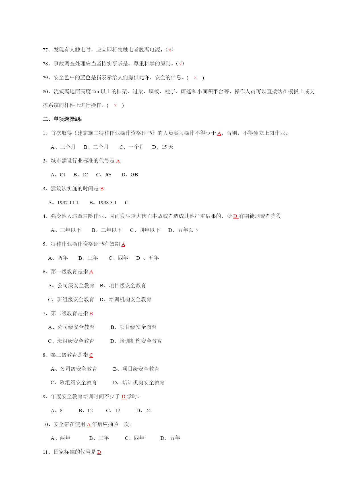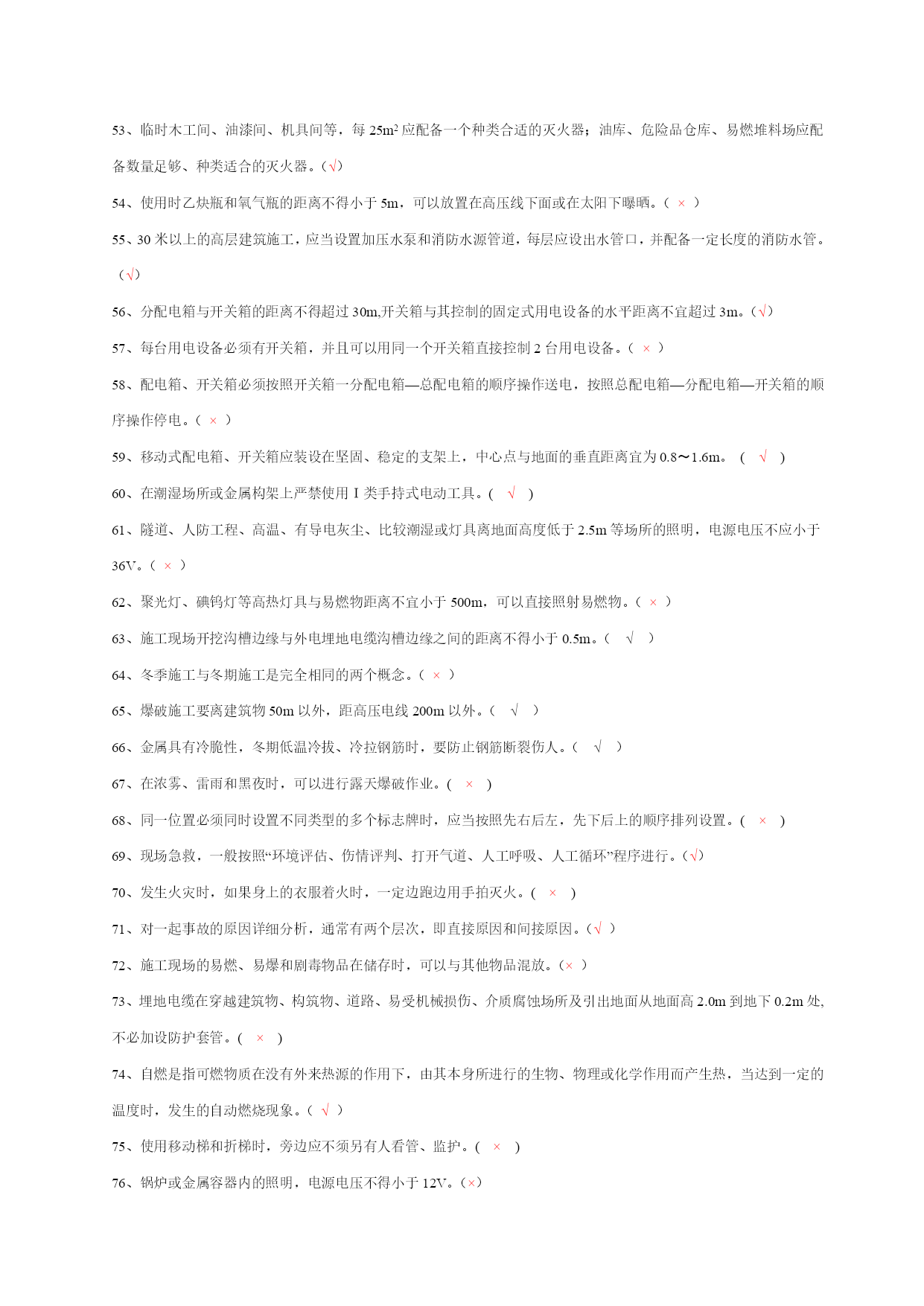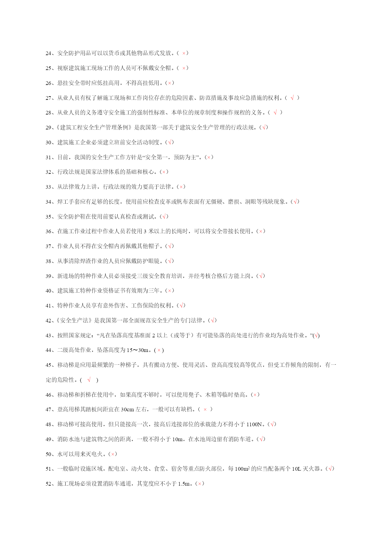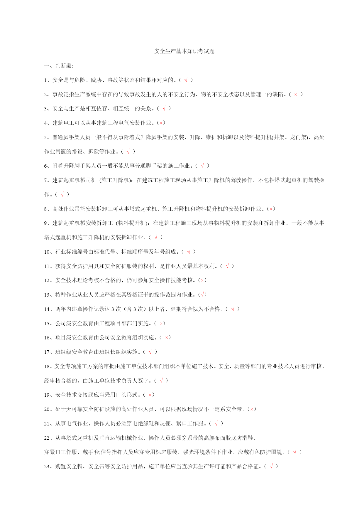 安全生产基本知识理论试题优质资料(可以直接使用,可编辑优质资料,欢迎下载)安全生产基本知识考试题一、判断题:1、安全是与危险、威胁、事故等状态和结果相对应的。(√)2、事故泛指生产系统中存在的导致事故发生的人的不安全行为、物的不安全状态以及管理上的缺陷。(×)3、安全与生产是相互依存、相互统一的关系。(√)4、建筑电工可以从事建筑工程电气安装作业。(×)5、普通脚手架人员一般不得从事附着式升降脚手架的安装、升降、维护和拆卸以及物料提升机(井架、龙门架)、高处作业吊篮的搭设、拆除等作业。(√)6、附着升降脚手架人员一般不能从事普通脚手架的施工作业。(√)7、建筑起重机械司机(施工升降机):在建筑工程施工现场从事施工升降机的驾驶操作,不包括塔式起重机的驾驶操作。(√)8、高处作业吊篮安装拆卸工可从事塔式起重机、施工升降机和物料提升机的安装拆卸作业。(×)9、建筑起重机械安装拆卸工(物料提升机):在建筑工程施工现场从事物料提升机的安装和拆卸作业,一般不能从事塔式起重机和施工升降机的安装拆卸作业。(√)10、行业标准编号由标准代号、标准顺序号及年号组成。(√)11、获得安全防护用具和安全防护服装的权利,是作业人员最基本权利。(√)12、安全技术理论考核不合格的,仍可参加安全操作技能考核。(×)13、特种作业从业人员应严格在其资格证书的操作范围内作业。(√)14、两年内违章操作记录达3次(含3次)以上者,延期符合视为不合格。(√)15、公司级安全教育由工程项目部部门实施。(×)16、项目级安全教育由公司安全教育组织实施。(×)17、班组级安全教育由班组长组织实施。(√)18、安全专项施工方案的审批由施工单位技术部门组织本单位施工技术、安全、质量等部门的专业技术人员进行审核。经审核合格的,由施工单位技术负责人签字。(√)19、安全技术交接底应当采用口头形式。(×)20、处于无可靠安全防护设施的高处作业人员,可以根据现场情况不一定系安全带。(×)21、从事电气作业,操作人员必须穿电绝缘鞋和灵便、紧口工作服。(√)22、从事塔式起重机及垂直运输机械作业,操作人员必须穿系带的高腰布面胶底防滑鞋,穿紧口工作服,戴手套;信号指挥人员应穿专用标志服装,强光环境条件下作业,应戴有色防护眼镜。(√)23、购置安全帽、安全带等安全防护用品,施工单位应当查验其生产许可证和产品合格证。(√)24、安全防护用品可以以货币或其他物品形式发放。(×)25、视察建筑施工现场工作的人员可不佩戴安全帽。(×)26、悬挂安全带时应低挂高用,不得高挂低用。(×)27、从业人员有权了解施工现场和工作岗位存在的危险因素、防范措施及事故应急措施的权利。(√)28、从业人员的义务遵守安全施工的强制性标准、本单位的规章制度和操作规程的义务。(√)29、《建筑工程安全生产管理条例》是我国第一部关于建筑安全生产管理的行政法规。(√)30、建筑施工企业必须建立班前安全活动制度。(√)31、目前,我国的安全生产工作方针是“安全第一,预防为主”。(×)32、行政法规是国家法律体系的基础和核心。(×)33、从法律效力上讲,行政法规的效力要高于法律。(×)34、焊工手套应有足够的长度,使用前应检查皮革或帆布表面有无僵硬、磨损、洞眼等残缺现象。(√)35、安全防护鞋在使用前要认真检查或测试。(√)36、在施工作业过程中作业人员若使用3米以上的长绳时,可以将安全带接长使用。(×)37、作业人员不得在安全帽内再佩戴其他帽子。(√)38、从事清除焊渣作业的人员应佩戴防护眼镜。(√)39、新进场的特种作业人员必须接受三级安全教育培训,并经考核合格后方能上岗。(√)40、建筑施工特种作业资格证书有效期为三年。(×)41、特种作业人员享有意外伤害、工伤保险的权利。(√)42、《安全生产法》是我国第一部全面规范安全生产的专门法律。(√)43、按照国家规定:“凡在坠落高度基准面2以上(或等于)有可能坠落的高处进行的作业均为高处作业。”(√)44、二级高处作业,坠落高度为15〜30m。(×)45、移动梯是应用最频繁的一种梯子,具有搬动方便、使用灵活、登高高度较髙等优点,但受工作倾角的限制,有一定的危险性。(√)46、移动梯和折梯在使用中,如果高度不够时,可以使用凳子、木箱等临时垫高。(×)47、登高用梯其踏板间距宜在30cm左右,一般可以有缺档。(×)48、移动梯可接高使用,但只能接高一次,接高后连接部位的承载能力不得小于1100N。(√)49、消防水池与建筑物之间的距离,一般不得小于10m,在水池周边留有消防车道。(√)50、水可以用来灭电火。(×)51、一般临时设施区域,配电室、动火处、食堂、宿舍等重点防火