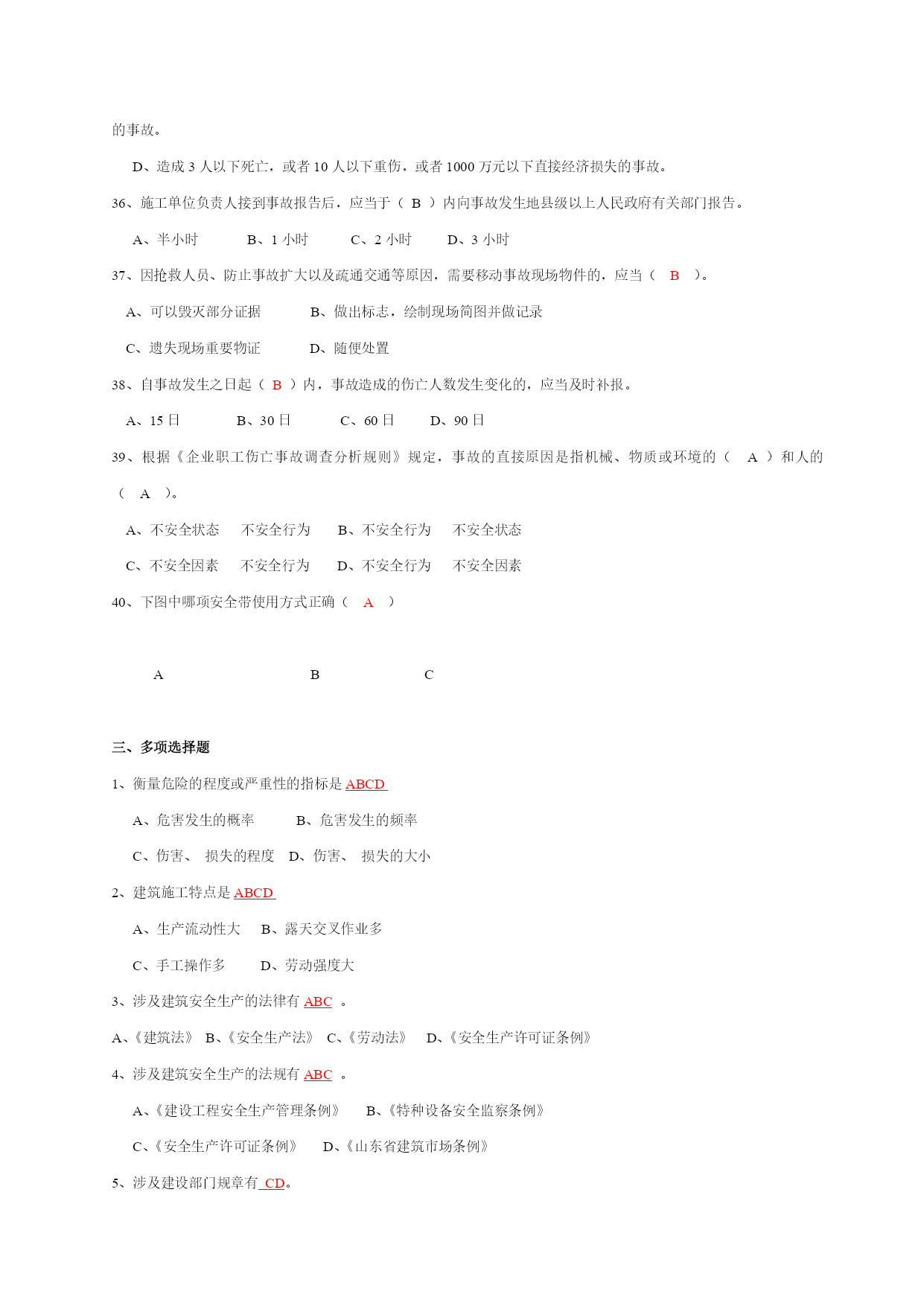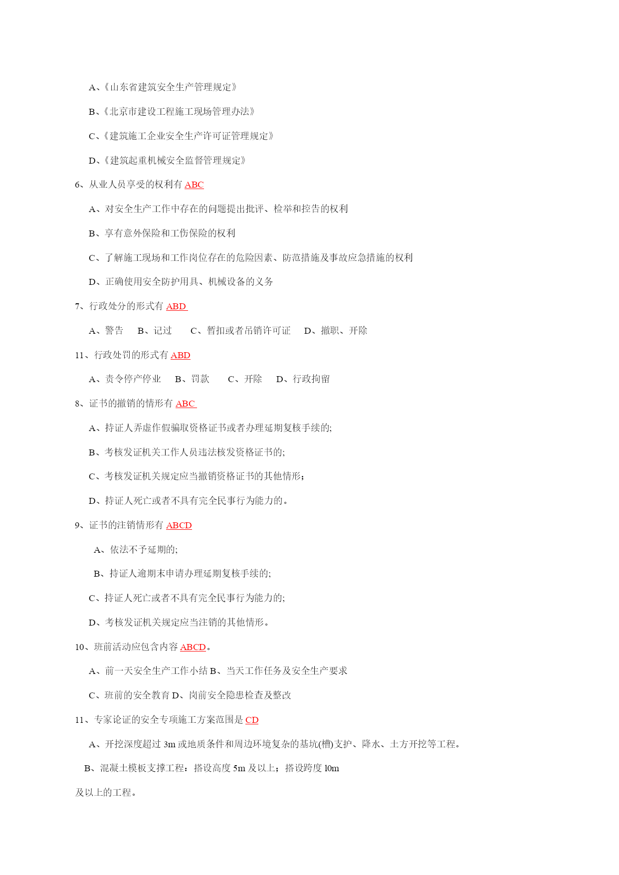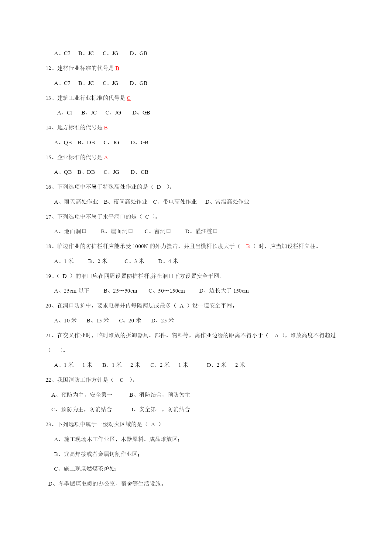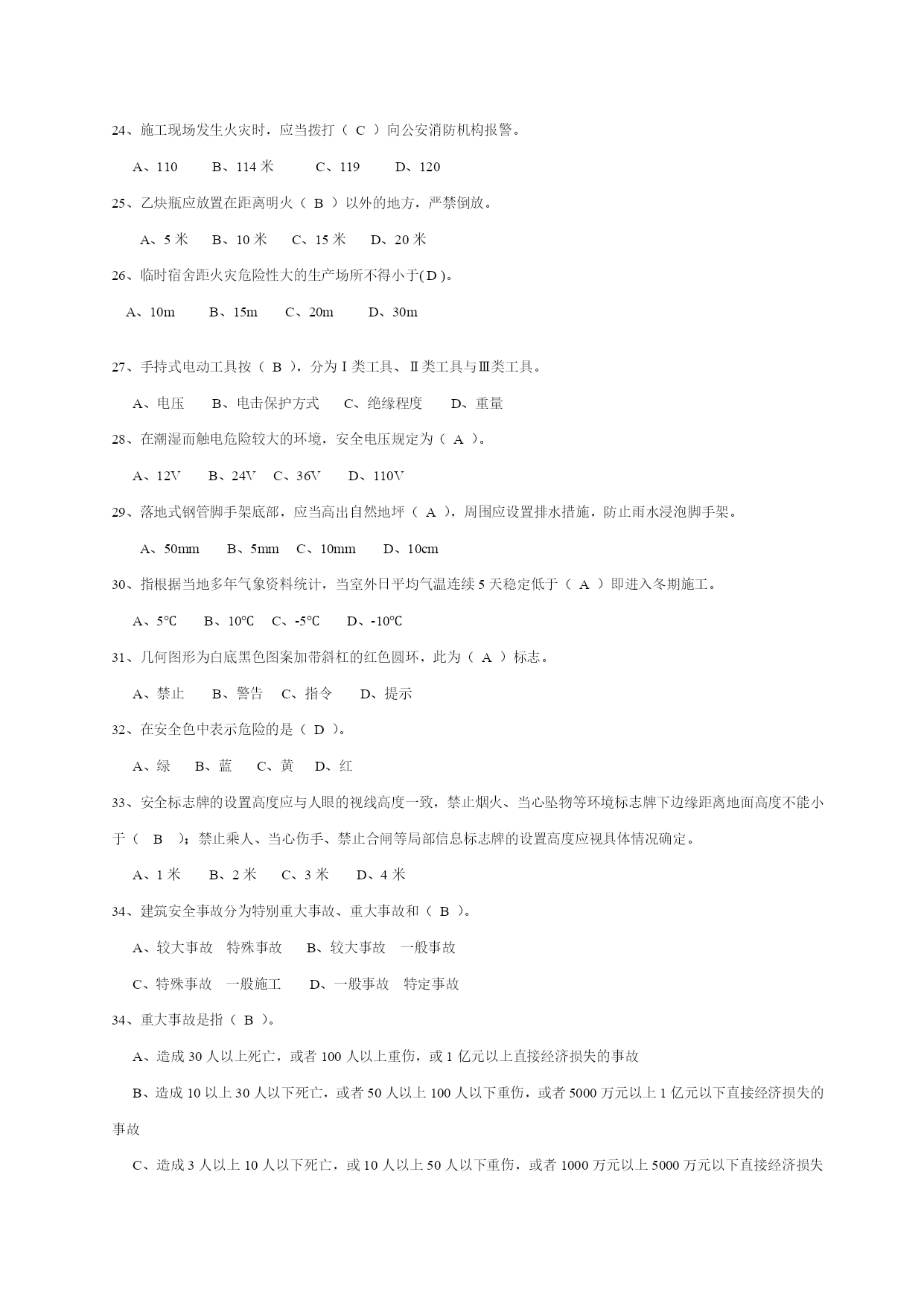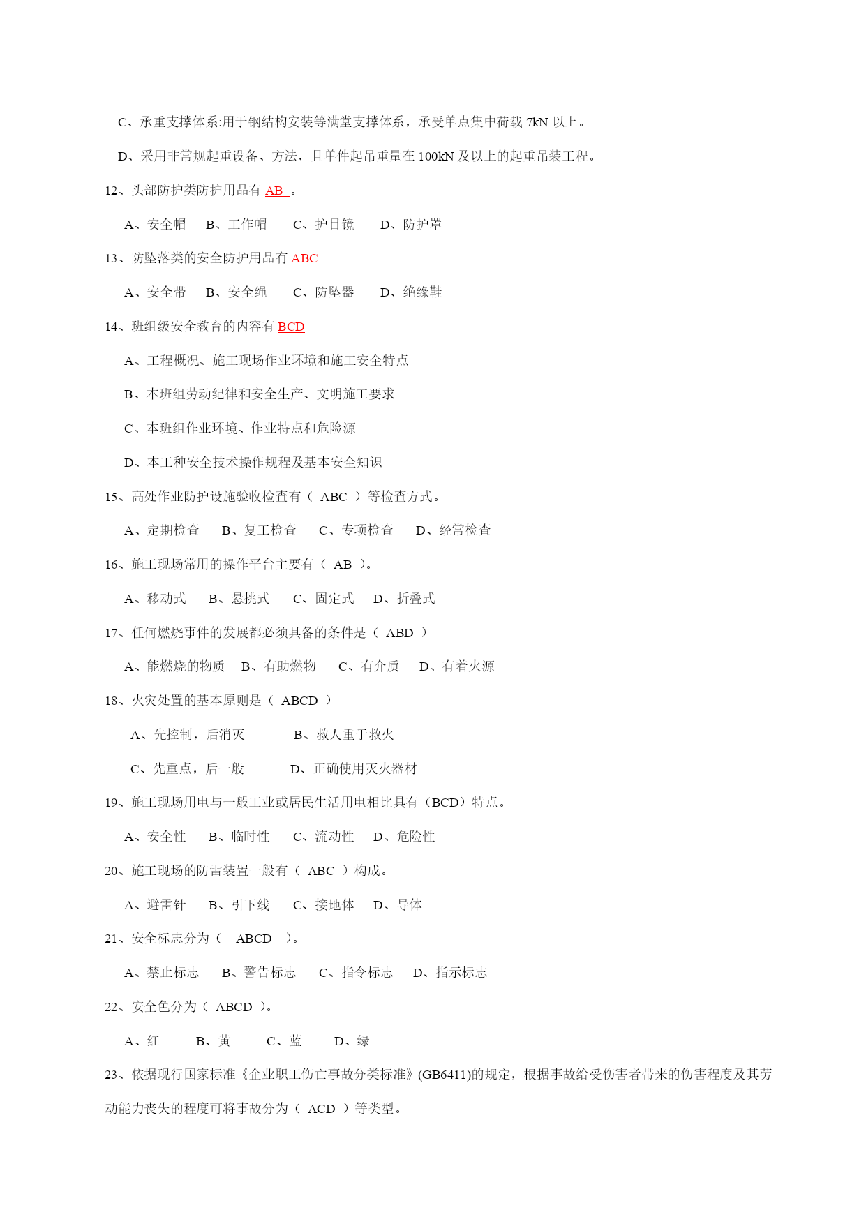 安全生产基本知识理论试题优质资料(可以直接使用,可编辑优质资料,欢迎下载)安全生产基本知识考试题一、判断题:1、安全是与危险、威胁、事故等状态和结果相对应的。(√)2、事故泛指生产系统中存在的导致事故发生的人的不安全行为、物的不安全状态以及管理上的缺陷。(×)3、安全与生产是相互依存、相互统一的关系。(√)4、建筑电工可以从事建筑工程电气安装作业。(×)5、普通脚手架人员一般不得从事附着式升降脚手架的安装、升降、维护和拆卸以及物料提升机(井架、龙门架)、高处作业吊篮的搭设、拆除等作业。(√)6、附着升降脚手架人员一般不能从事普通脚手架的施工作业。(√)7、建筑起重机械司机(施工升降机):在建筑工程施工现场从事施工升降机的驾驶操作,不包括塔式起重机的驾驶操作。(√)8、高处作业吊篮安装拆卸工可从事塔式起重机、施工升降机和物料提升机的安装拆卸作业。(×)9、建筑起重机械安装拆卸工(物料提升机):在建筑工程施工现场从事物料提升机的安装和拆卸作业,一般不能从事塔式起重机和施工升降机的安装拆卸作业。(√)10、行业标准编号由标准代号、标准顺序号及年号组成。(√)11、获得安全防护用具和安全防护服装的权利,是作业人员最基本权利。(√)12、安全技术理论考核不合格的,仍可参加安全操作技能考核。(×)13、特种作业从业人员应严格在其资格证书的操作范围内作业。(√)14、两年内违章操作记录达3次(含3次)以上者,延期符合视为不合格。(√)15、公司级安全教育由工程项目部部门实施。(×)16、项目级安全教育由公司安全教育组织实施。(×)17、班组级安全教育由班组长组织实施。(√)18、安全专项施工方案的审批由施工单位技术部门组织本单位施工技术、安全、质量等部门的专业技术人员进行审核。经审核合格的,由施工单位技术负责人签字。(√)19、安全技术交接底应当采用口头形式。(×)20、处于无可靠安全防护设施的高处作业人员,可以根据现场情况不一定系安全带。(×)21、从事电气作业,操作人员必须穿电绝缘鞋和灵便、紧口工作服。(√)22、从事塔式起重机及垂直运输机械作业,操作人员必须穿系带的高腰布面胶底防滑鞋,穿紧口工作服,戴手套;信号指挥人员应穿专用标志服装,强光环境条件下作业,应戴有色防护眼镜。(√)23、购置安全帽、安全带等安全防护用品,施工单位应当查验其生产许可证和产品合格证。(√)24、安全防护用品可以以货币或其他物品形式发放。(×)25、视察建筑施工现场工作的人员可不佩戴安全帽。(×)26、悬挂安全带时应低挂高用,不得高挂低用。(×)27、从业人员有权了解施工现场和工作岗位存在的危险因素、防范措施及事故应急措施的权利。(√)28、从业人员的义务遵守安全施工的强制性标准、本单位的规章制度和操作规程的义务。(√)29、《建筑工程安全生产管理条例》是我国第一部关于建筑安全生产管理的行政法规。(√)30、建筑施工企业必须建立班前安全活动制度。(√)31、目前,我国的安全生产工作方针是“安全第一,预防为主”。(×)32、行政法规是国家法律体系的基础和核心。(×)33、从法律效力上讲,行政法规的效力要高于法律。(×)34、焊工手套应有足够的长度,使用前应检查皮革或帆布表面有无僵硬、磨损、洞眼等残缺现象。(√)35、安全防护鞋在使用前要认真检查或测试。(√)36、在施工作业过程中作业人员若使用3米以上的长绳时,可以将安全带接长使用。(×)37、作业人员不得在安全帽内再佩戴其他帽子。(√)38、从事清除焊渣作业的人员应佩戴防护眼镜。(√)39、新进场的特种作业人员必须接受三级安全教育培训,并经考核合格后方能上岗。(√)40、建筑施工特种作业资格证书有效期为三年。(×)41、特种作业人员享有意外伤害、工伤保险的权利。(√)42、《安全生产法》是我国第一部全面规范安全生产的专门法律。(√)43、按照国家规定:“凡在坠落高度基准面2以上(或等于)有可能坠落的高处进行的作业均为高处作业。”(√)44、二级高处作业,坠落高度为15〜30m。(×)45、移动梯是应用最频繁的一种梯子,具有搬动方便、使用灵活、登高高度较髙等优点,但受工作倾角的限制,有一定的危险性。(√)46、移动梯和折梯在使用中,如果高度不够时,可以使用凳子、木箱等临时垫高。(×)47、登高用梯其踏板间距宜在30cm左右,一般可以有缺档。(×)48、移动梯可接高使用,但只能接高一次,接高后连接部位的承载能力不得小于1100N。(√)49、消防水池与建筑物之间的距离,一般不得小于10m,在水池周边留有消防车道。(√)50、水可以用来灭电火。(×)51、一般临时设施区域,配电室、动火处、食堂、宿舍等重点防火