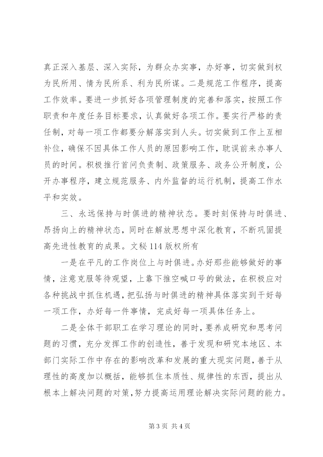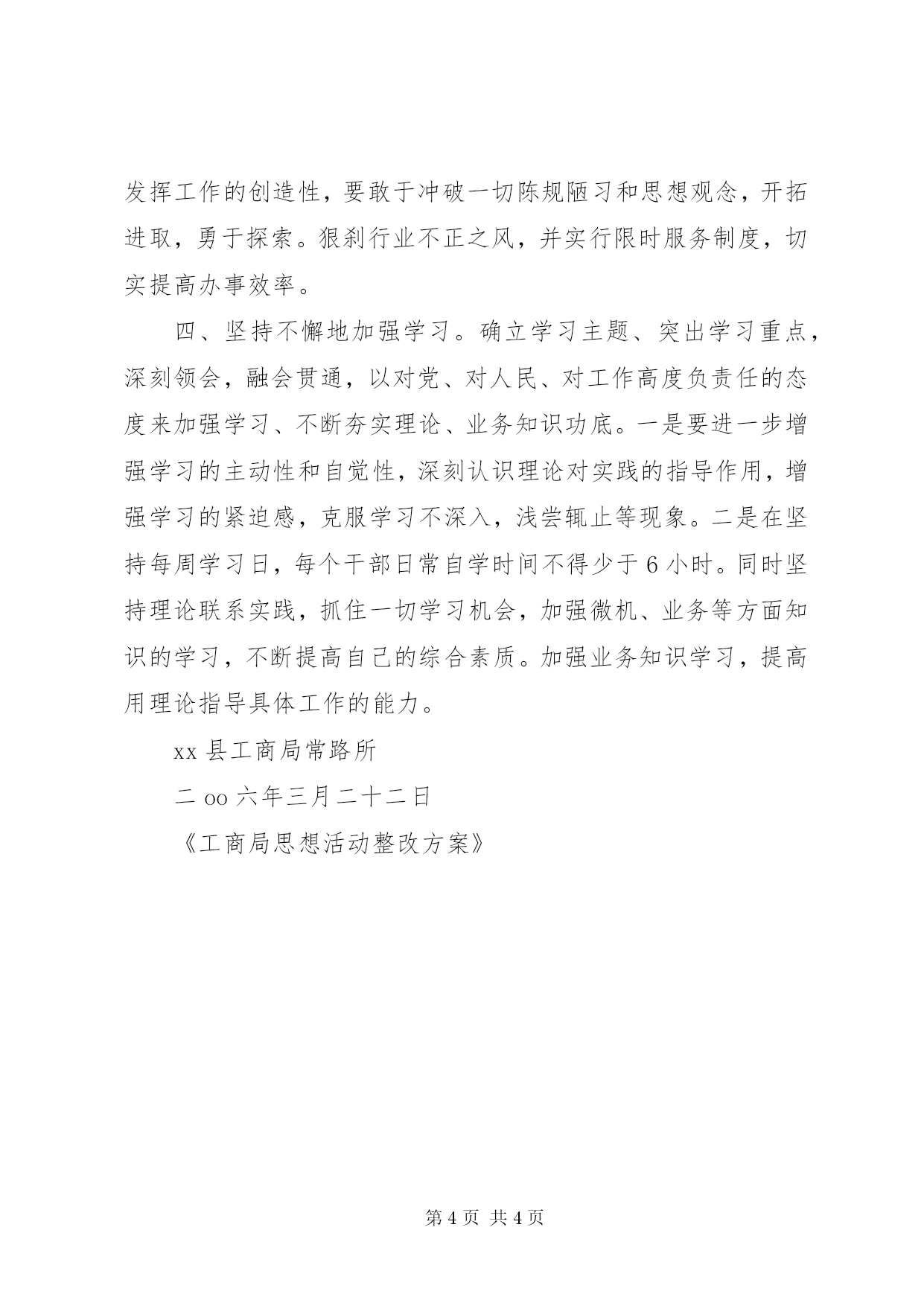 第PAGE\*Arabic\*MERGEFORMAT4页共NUMPAGES\*MERGEFORMAT4页工商局思想活动整改方案xx县工商局常路所解放思想活动整改方案据全局开展新一轮解放思想大讨论的部署安排,为接受组织和党员群众的有效监督,确保达到切实解决存在的"满、难、低、慢"等问题和不足,提高认识,增强紧迫感和责任感,不断创新思路,开拓常路工商行政管理工作新局面,现深刻剖析存在的问题和不足,并制定整改方案如下:一、存在的问题和不足文秘114版权所有一是创新意识不强,观念不新,视野不宽,因循守旧,习惯于凭老方式老办法想问题、做工作,缺乏主动性、开拓性、创造性的问题;二是竞争意识不强,小成即满,标杆不高、目标不明,缺乏勇争一流精神,习惯于纵向比较,不思进取的问题;三是机遇意识不强,发现机遇、挖掘机遇、抓住机遇、利用机遇的能力不足、等靠心理严重的问题;四是创优意识不强,工作定位不高,缺乏追求,不敢闯,不求“锦上添花”的问题。五是责任意识不强,不求有功、但求无过,工作上满足于一般要求的问题;六是学习意识不强,满足现状,松于学习、惰于学习、懈于学习,落后时代发展要求的问题。二、整改措施针对以上问题,我们将从以下五个方面入手,积极进行整改,努力消除“满”、“低”、“难”、“慢”的现象,以推动常路镇经济建设和工商行政管理工作实现新的发展和更大的跨越。一、不断强化开拓创新的发展理念。要按照创新的时代要求,把开拓创新放在十分突出的位置,以创新的观念、创新的思路、创新的举措将信息产业工作推向发展的新阶段。重点在以下几个方面开展创新:一是通过超前思考、深入钻研、统筹规划、综合协调、严格管理、科学决策等项措施,制订好我所月度、季度、年度工作规划。二是办理营业执照,按照法定程序,涉及前置审批的要有关部门批准。我所将进一步改善服务态度,提高服务质量,积极指导企业办理营业执照,认真清理国务院和自治区人民政府已经取消的行政审批项目,对已取消的行政审批项目不再要求企业提交,并做到一次性告知。对无照经营户,预先通知办照。三是加强业务创新能力,从创新的角度抓好重点工做的推进。(一)推动信息化建设。做好oa系统、综合业务系统等等工作的建设和使用,逐步完善信息服务功能,提高公共管理水平。(二)推进企业信息化。引导常路企业加快信息化步伐、大力发展网上商务,为中小企业信息化和电子商务提供支撑服务。二、持续培养务实高效的工作作风。以提高工商行政执法能力和为重点,以建设人民满意的机关为目标,强化求真务实、快捷高效的作风,使工作作风有新的改进,服务水平有新的提高。一是强化宗旨观念,密切联系群众。切实克服和纠正办事拖拉、推诿扯皮、“门难进、脸难看、话难听、事难办”等不正之风,真正深入基层、深入实际,为群众办实事,办好事,切实做到权为民所用、情为民所系、利为民所谋。二是规范工作程序,提高工作效率。要进一步抓好各项管理制度的完善和落实,按照工作职责和年度任务目标要求,认真做好各项工作。要实行严格的责任制,对每一项工作都要分解落实到人头。切实做到工作上互相补位,确保不因具体工作人员的原因影响工作,耽误前来办事人员的时间。积极推行首问负责制、政策服务、政务公开制度,公开办事程序,建立规范服务、内外监督的运行机制,提高工作水平和实效。三、永远保持与时俱进的精神状态。要时刻保持与时俱进、昂扬向上的精神状态,同时在解放思想中深化教育,不断巩固提高先进性教育的成果。文秘114版权所有一是在平凡的工作岗位上与时俱进。办好那些能够做好的事情,注意克服等待观望,上靠下推空喊口号的做法,在积极应对各种挑战中抓住机遇,把弘扬与时俱进的精神具体落实到干好每一项工作,办好每一件事情,完成好每一项具体任务上。二是全体干部职工在学习理论的同时,要养成研究和思考问题的习惯,充分发挥工作的创造性,善于发现和研究本地区、本部门实际工作中存在的影响改革和发展的重大现实问题,善于从理性的高度加以概括,能够抓住本质性、规律性的东西,提出从根本上解决问题的对策,努力提高运用理论解决实际问题的能力。发挥工作的创造性,要敢于冲破一切陈规陋习和思想观念,开拓进取,勇于探索。狠刹行业不正之风,并实行限时服务制度,切实提高办事效率。四、坚持不懈地加强学习。确立学习主题、突出学习重点,深刻领会,融会贯通,以对党、对人民、对工作高度负责任的态度来加强学习、不断夯实理论、业务知识功底。一是要进一步增强学习的主动性和自觉性,深刻认识理论对实践的指导作用,增强学习的紧迫感,克服学习不深入,浅尝辄止等现象。二是在坚持每周学习日,每个干部日常自学时间不得少于6小时。同时坚持理论联系实践,抓住一切学习机会,加强微机、业务等方面知识的学习,不断提高自己的综合素质。加强业务知识学习,提高用理论指导具体工作的能力。xx县工商局常路