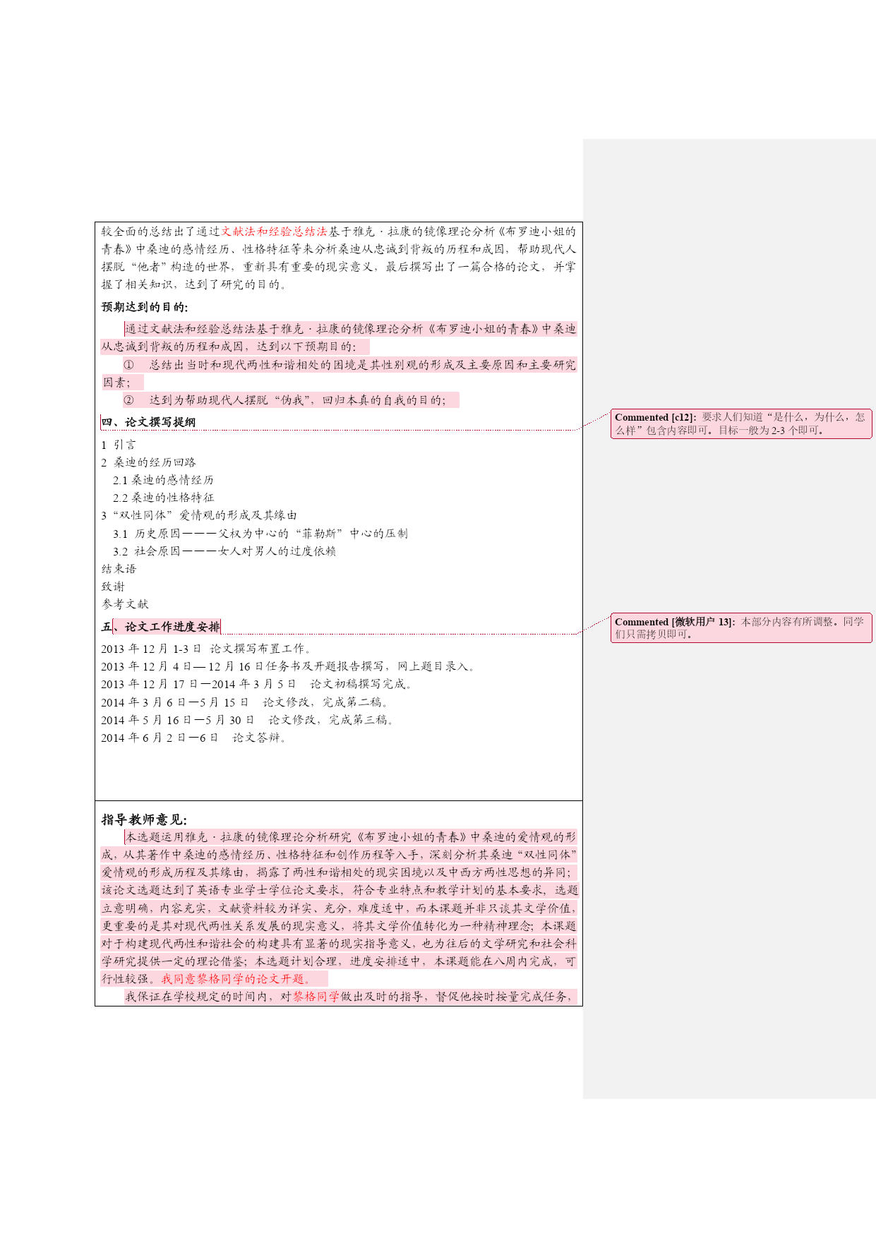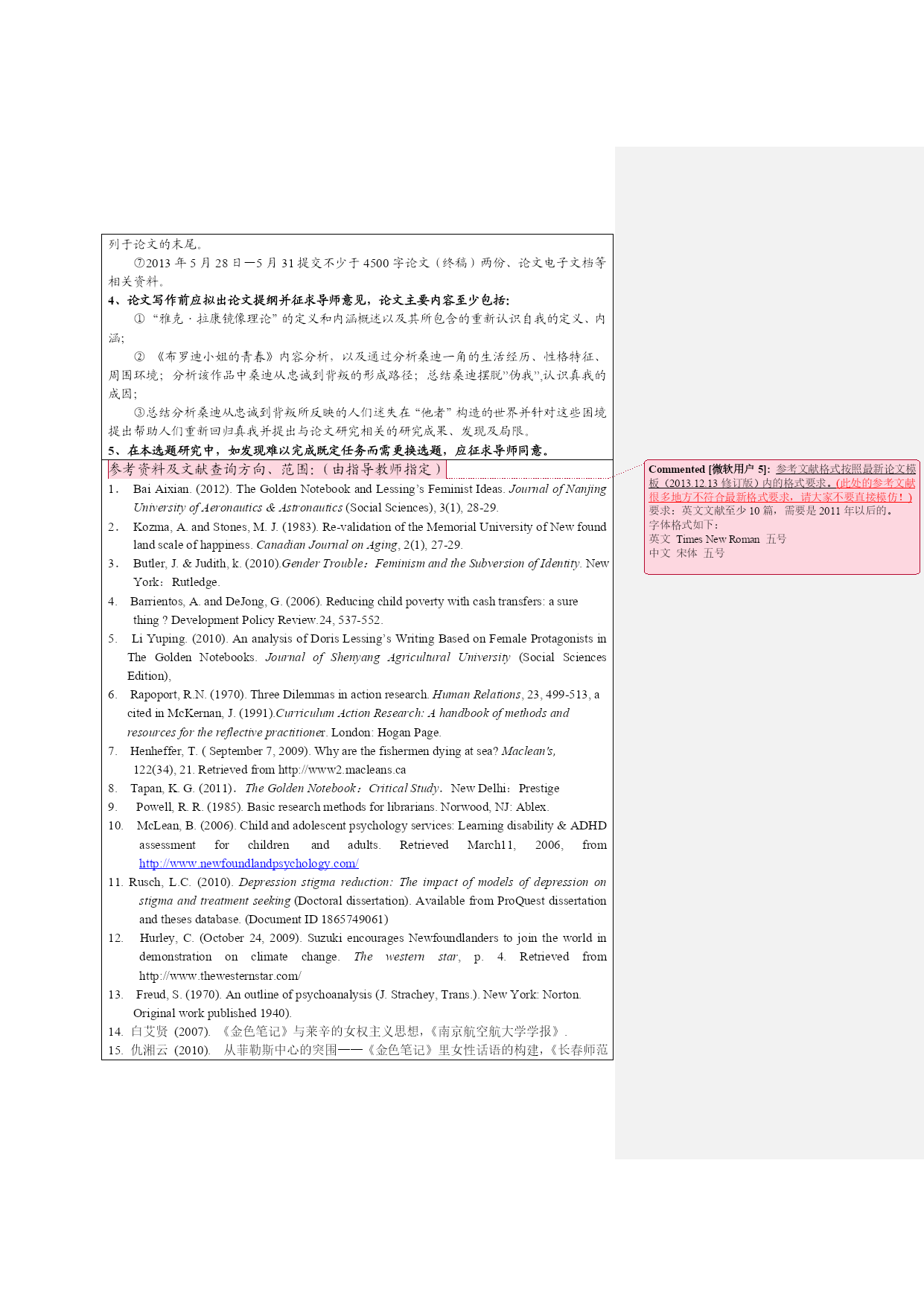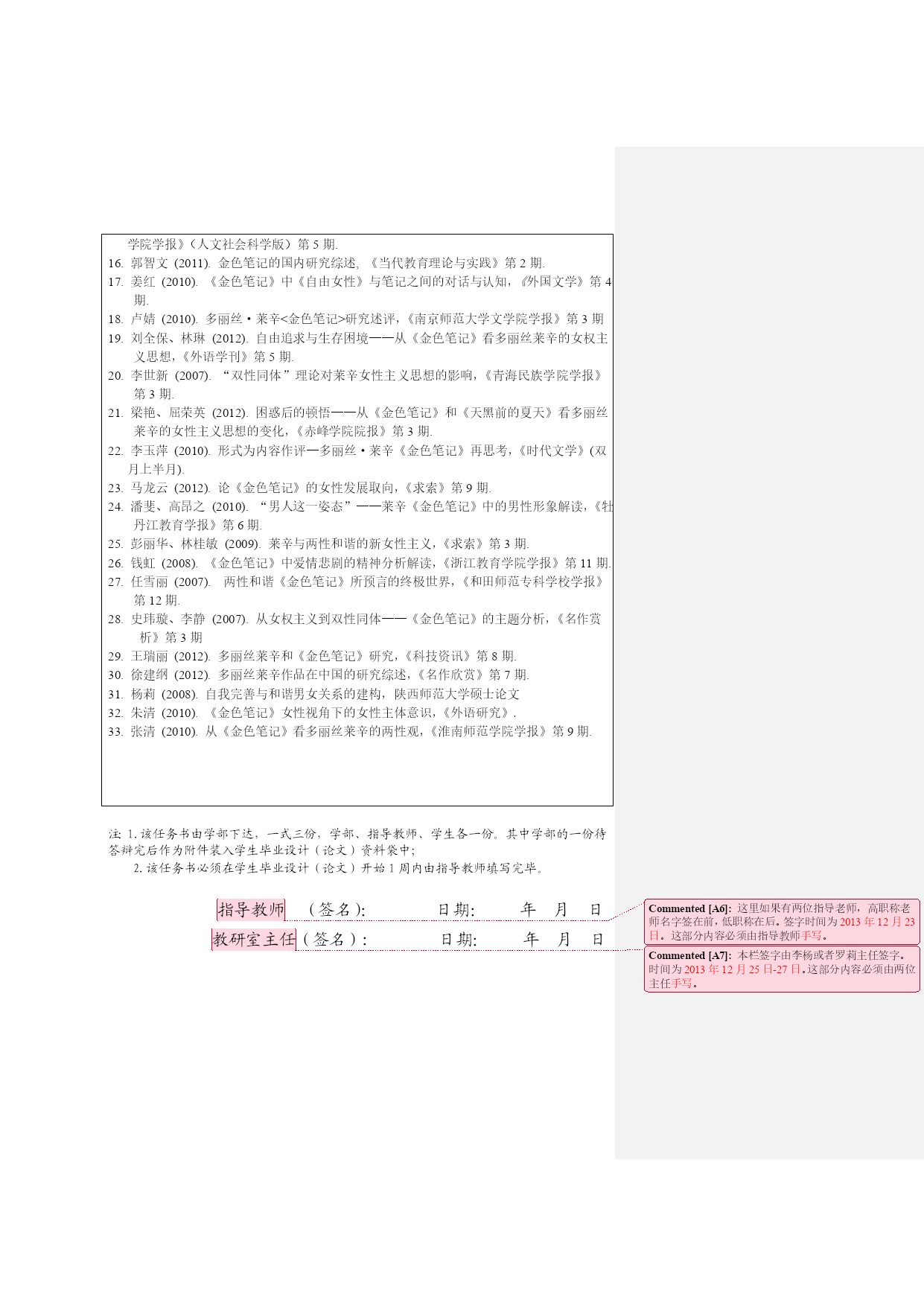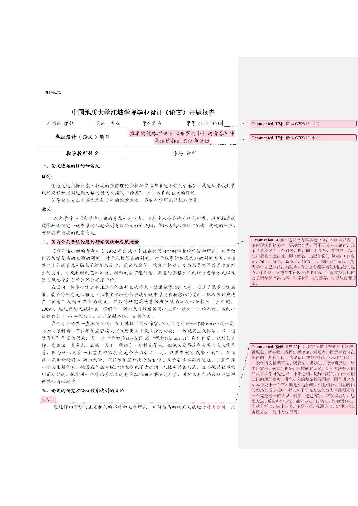 附表一中国地质大学江城学院毕业设计(论文)任务书外国语学部英语专业学生黎格学号4130100208楷体GB2312五号指导教师陈杨讲师工作单位中国地质大学江城学院毕业设计(论文)拟定题目拉康的主体理论下《布罗迪小姐的青春》中桑迪选择的忠诚与背叛楷体GB2312小四毕业设计(论文)时间安排2013年12月1日至2014年6月5日毕业设计(论文)的主要内容1、目的和意义以下所写内容全部都是楷体GB2312五号目的:=1\*GB3①通过运用据雅克·拉康的镜像理论分析研究《布罗迪小姐的青春》中桑迪从忠诚到背叛的历程和成因达到为帮助现代人摆脱“伪我”,回归本真的自我的目的。②学会本专业中英文文献资料的检索方法,养成科学研究的基本素质。意义:以文学作品《布罗迪小姐的青春》为代表,以其桑迪为研究对象,运用拉康的镜像理论研究小说中桑迪从忠诚到背叛的历程和成因,帮助现代人摆脱“他者”构造的世界,重新认识真我具有重要的现实意义。2、工作进程①在准备阶段,进行本选题资料收集、整理并完成文献综述、任务书、开题报告和网上录入工作;②在撰写论文阶段,充分阅读和整理相关理论知识,按照导师陈杨讲师审定的论文撰写流程要求完成论文初稿、二稿和终稿,尽量完善论文格式。在陈杨讲师提出修改意见的基础下,认真修改论文,完善论文内容,直至完成论文终稿。③在最终答辩阶段,按照陈杨讲师的指导下认真完成答辩ppt,做到脱稿陈述论文主要内容,并准时顺利完成答辩。这里同学们只需替换指导老师的姓名和职称。有两位指导老师的请将两位导师的姓名职称都写上,中间用顿号隔开。3、具体要求①论文题目:要求准确、简练、醒目、新颖。一般不宜超过30个字。=2\*GB3②目录:既是论文的提纲,包括论文的主干部分,以及各主干部分下属的分标题。=3\*GB3③摘要:阐述学位论文的主要观点。说明本论文的目的、研究方法、成果和结论。尽可能保留原论文的基本信息,突出论文的创造性成果和新见解。而不应是各章节标题的简单罗列。摘要以200字左右为宜。=4\*GB3④关键词:能反映论文主旨最关键的词语。一般选取3-5个词汇作为关键词.=5\*GB3⑤论文正文:a.引言:引言又称前言、序言和导言,用在论文的开头。引言一般应包括本研究领域的国内外现状,概括地写出作者意图,说明选题的目的和意义,并指出论文写作的范围。引言要短小精悍、紧扣主题。b.论文:正文:正文是论文的主体,正文应包括论点、论据、论证过程和结论。主体部分包括以下内容:a.提出-论点;b.分析问题-论据和论证;c.解决问题-论证与步骤;d.结论。=6\*GB3⑥参考文献和注释为在论文写作中可参考或引证的主要文献资料,须按照所要求的格式列于论文的末尾。=7\*GB3⑦2013年5月28日—5月31提交不少于4500字论文(终稿)两份、论文电子文档等相关资料。4、论文写作前应拟出论文提纲并征求导师意见,论文主要内容至少包括:①“雅克·拉康镜像理论”的定义和内涵概述以及其所包含的重新认识自我的定义、内涵;②《布罗迪小姐的青春》内容分析,以及通过分析桑迪一角的生活经历、性格特征、周围环境;分析该作品中桑迪从忠诚到背叛的形成路径;总结桑迪摆脱”伪我”,认识真我的成因;③总结分析桑迪从忠诚到背叛所反映的人们迷失在“他者”构造的世界并针对这些困境提出帮助人们重新回归真我并提出与论文研究相关的研究成果、发现及局限。5、在本选题研究中,如发现难以完成既定任务而需更换选题,应征求导师同意。参考资料及文献查询方向、范围:(由指导教师指定)参考文献格式按照最新论文模板(2013.12.13修订版)内的格式要求。(此处的参考文献很多地方不符合最新格式要求,请大家不要直接模仿!)要求:英文文献至少10篇,需要是2011年以后的。字体格式如下:英文TimesNewRoman五号中文宋体五号BaiAixian.(2012).TheGoldenNotebookandLessing’sFeministIdeas.JournalofNanjingUniversityofAeronautics&Astronautics(SocialSciences),3(1),28-29.Kozma,A.andStones,M.J.(1983).Re-validationoftheMemorialUniversityofNewfoundlandscaleofhappiness.CanadianJournalonAging,2(1),27-29.3.Butler,J.&Judith,k.(2010).GenderTrouble:FeminismandtheSubversionofIdent