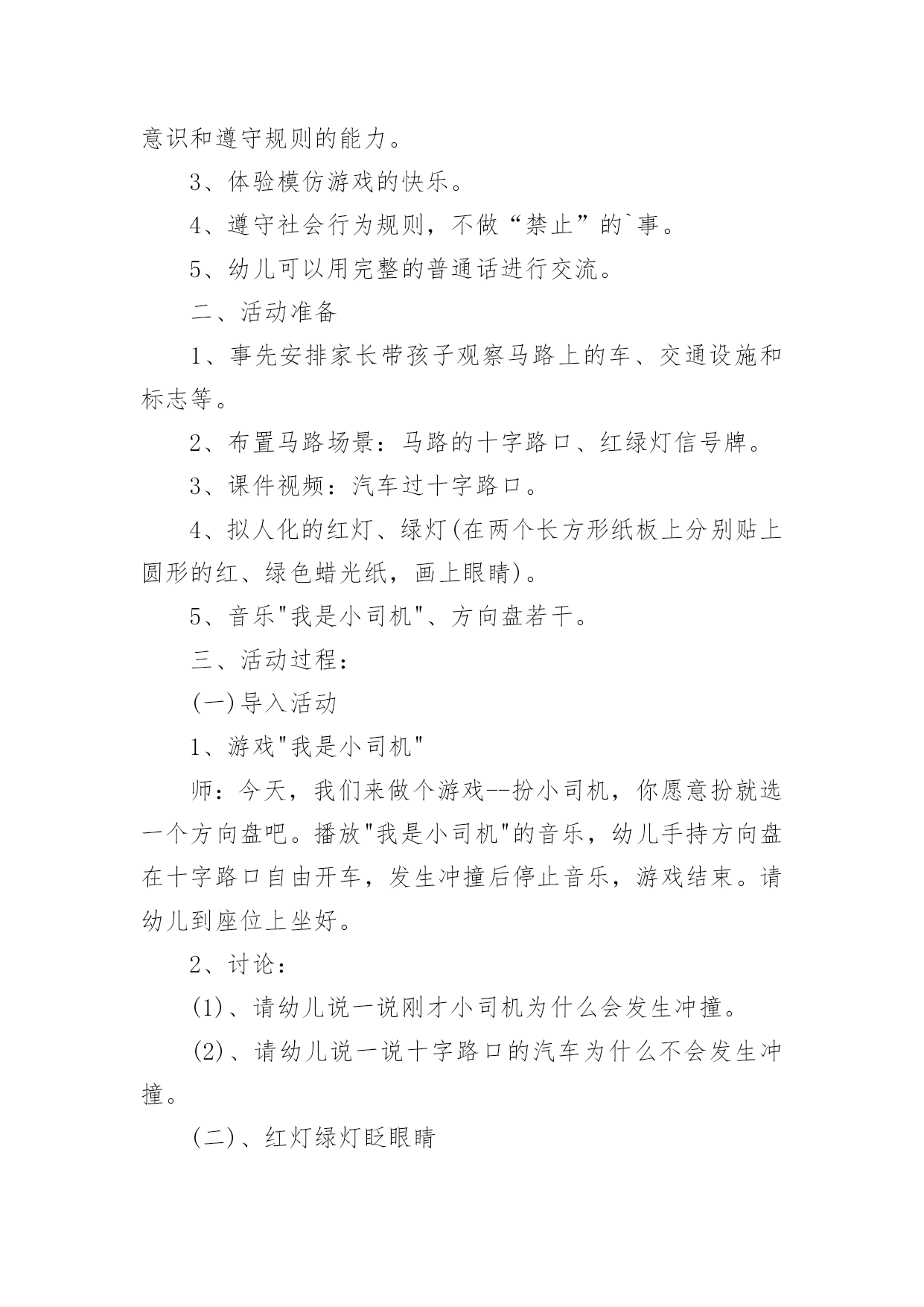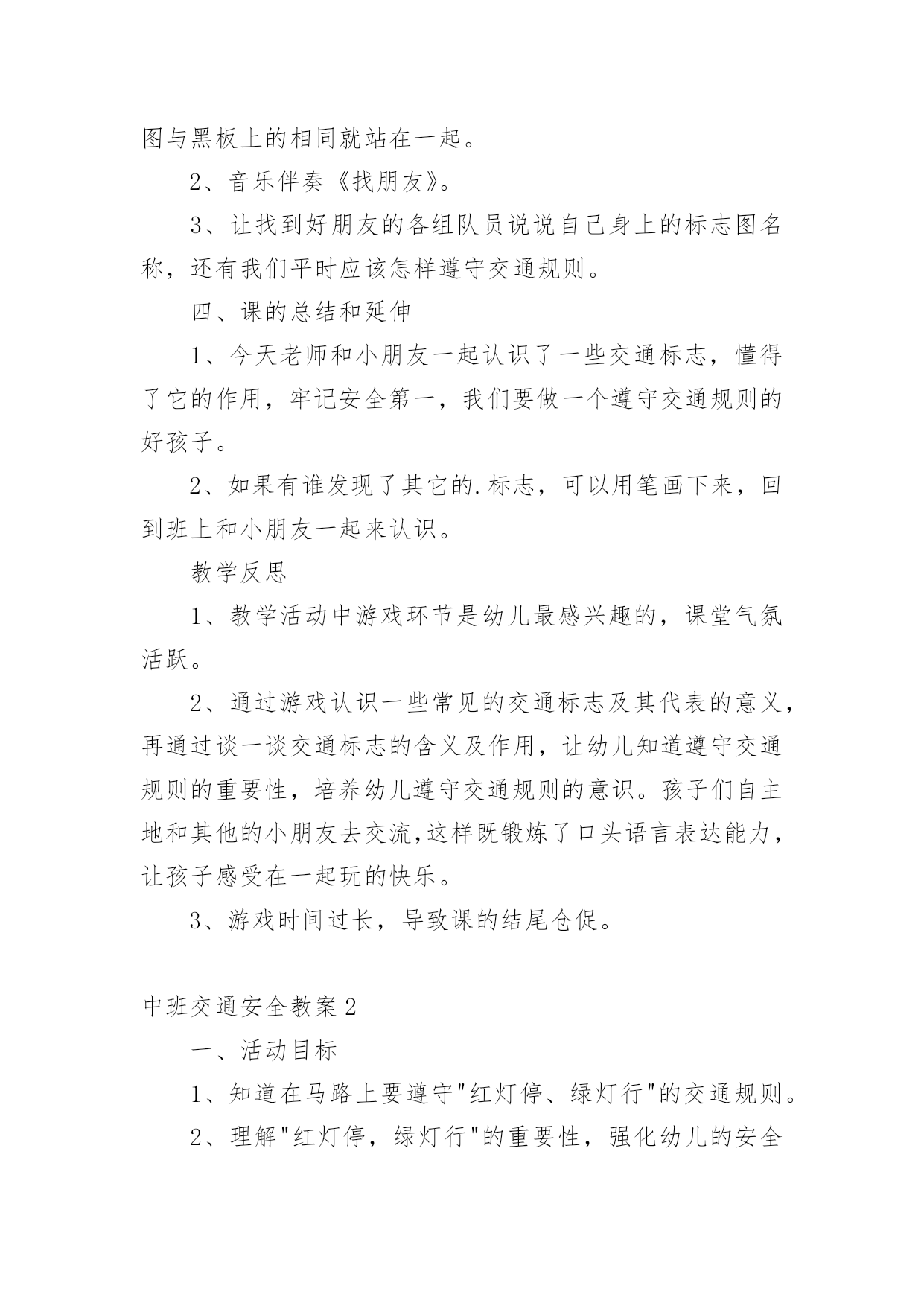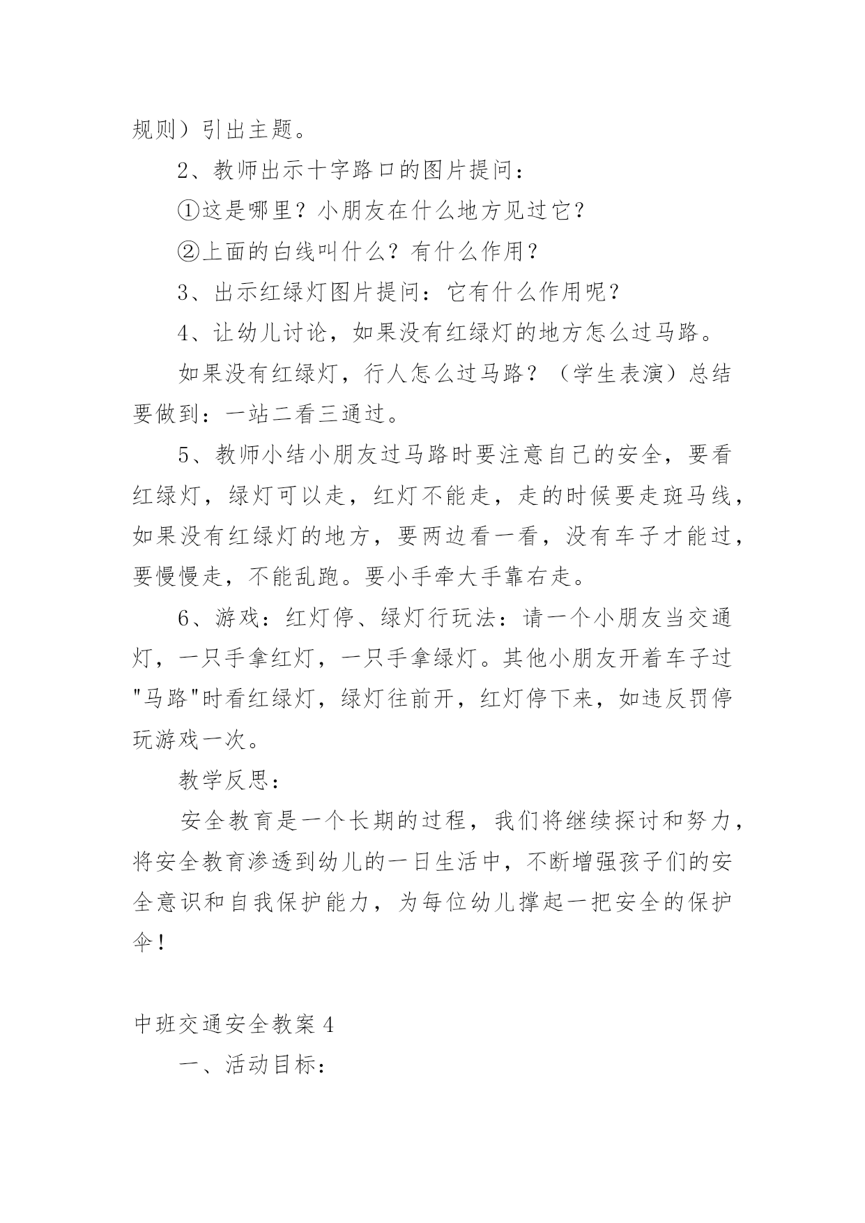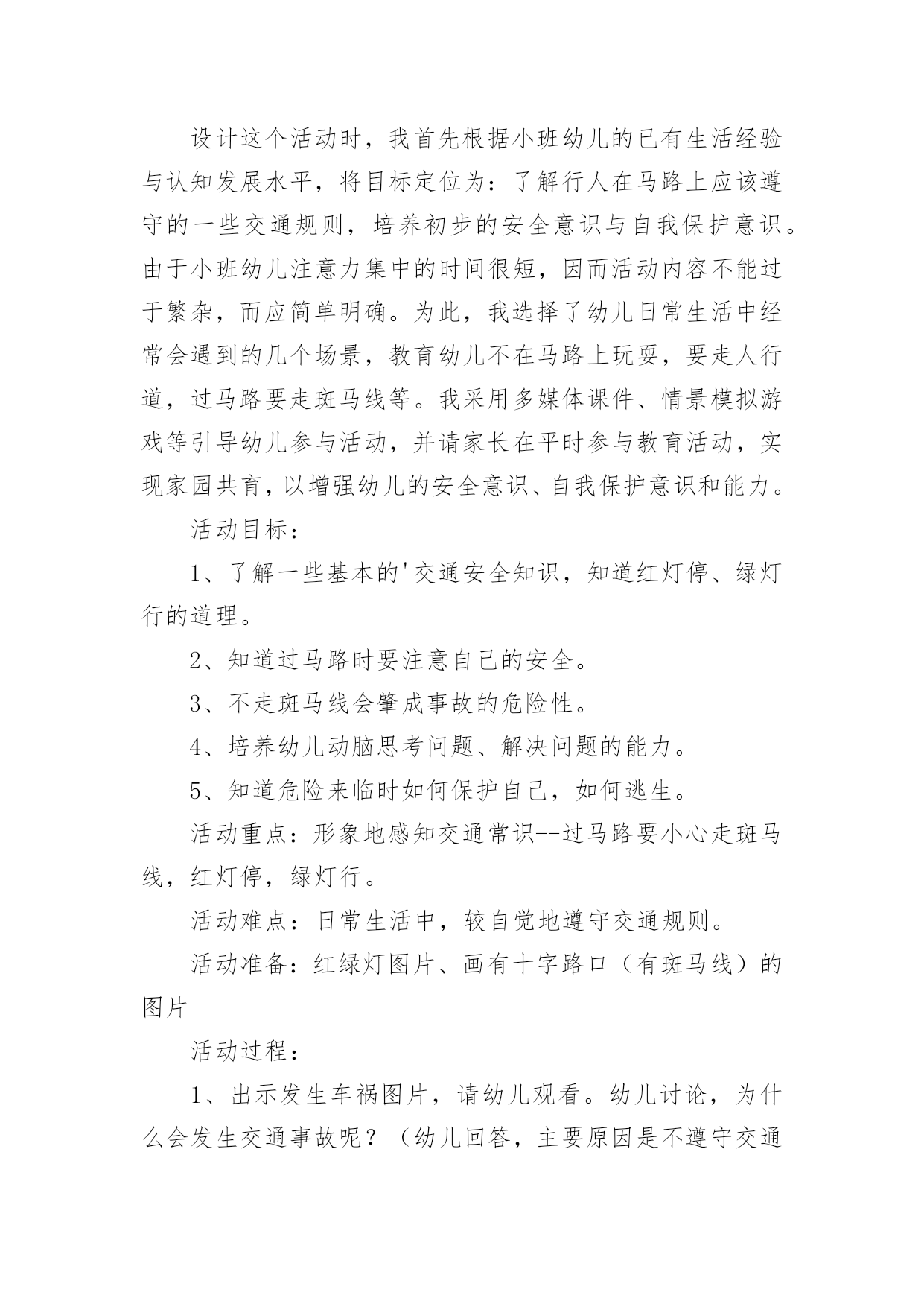 中班交通安全教案【精选】中班交通安全教案作为一名为他人授业解惑的教育工作者,很有必要精心设计一份教案,教案是教学活动的总的组织纲领和行动方案。那么什么样的教案才是好的呢?下面是小编收集整理的中班交通安全教案,欢迎阅读,希望大家能够喜欢。中班交通安全教案1活动意图:开学了,校园安全再次成为关注焦点。新的学期你怎么上学呢?是爸爸妈妈送你,还是自己去上学呢?无论何种方式都要注意安全。活动目标:1、在交流活动中认识常见的交通标志。2、体验交通规则的重要性,自觉遵守交通规则。3、遵守社会行为规则,不做“禁止”的事。4、考验小朋友们的反应能力,锻炼他们的个人能力。5、加强幼儿的安全意识。活动准备:6、布置活动场景。7、收集各种交通标志(照片或图片)。8、字卡:交通安全、红灯停,绿灯行、人行道、非机动车道、汽车道。活动过程:一、展开联想,揭示活动主题1、出示交通事故图片,请幼儿仔细观察。提问:孩子们,刚才你们看到了什么?想到了什么?2、多么可怕的车祸,为了不让这样的事情再发生,我们一定要注意交通安全。(出示字卡“交通安全”)二、在活动中体会交通规则的重要性老师请出表演者,其余幼儿观看表演。活动准备交通标志图若干,音乐光碟、挂图活动过程一、开始部分:课前律动。1、老师带领幼儿伴随音乐玩开小汽车的游戏。2、中途会出现斑马线、红绿灯等标志引出课题。二、基本部分:认识一些常见的交通标志及重要性。1、逐一出示刚才游戏中看到的斑马线、红绿灯标志、人行横道、地下通道、步行街等标志,引导幼儿说出其名称及作用。A、提问:如何过马路?安全过马路有什么好处?培养幼儿的自我保护意识。2、结合幼儿实际,用互动谈话的形式请幼儿说说自己都见过那些交通标志,它们都告诉我们什么?三、找朋友1、每名幼儿身前贴一张标志图,看看自己身上的标志图与黑板上的相同就站在一起。2、音乐伴奏《找朋友》。3、让找到好朋友的各组队员说说自己身上的标志图名称,还有我们平时应该怎样遵守交通规则。四、课的总结和延伸1、今天老师和小朋友一起认识了一些交通标志,懂得了它的作用,牢记安全第一,我们要做一个遵守交通规则的好孩子。2、如果有谁发现了其它的.标志,可以用笔画下来,回到班上和小朋友一起来认识。教学反思1、教学活动中游戏环节是幼儿最感兴趣的,课堂气氛活跃。2、通过游戏认识一些常见的交通标志及其代表的意义,再通过谈一谈交通标志的含义及作用,让幼儿知道遵守交通规则的重要性,培养幼儿遵守交通规则的意识。孩子们自主地和其他的小朋友去交流,这样既锻炼了口头语言表达能力,让孩子感受在一起玩的快乐。3、游戏时间过长,导致课的结尾仓促。中班交通安全教案2一、活动目标1、知道在马路上要遵守"红灯停、绿灯行"的交通规则。2、理解"红灯停,绿灯行"的重要性,强化幼儿的安全意识和遵守规则的能力。3、体验模仿游戏的快乐。4、遵守社会行为规则,不做“禁止”的`事。5、幼儿可以用完整的普通话进行交流。二、活动准备1、事先安排家长带孩子观察马路上的车、交通设施和标志等。2、布置马路场景:马路的十字路口、红绿灯信号牌。3、课件视频:汽车过十字路口。4、拟人化的红灯、绿灯(在两个长方形纸板上分别贴上圆形的红、绿色蜡光纸,画上眼睛)。5、音乐"我是小司机"、方向盘若干。三、活动过程:(一)导入活动1、游戏"我是小司机"师:今天,我们来做个游戏--扮小司机,你愿意扮就选一个方向盘吧。播放"我是小司机"的音乐,幼儿手持方向盘在十字路口自由开车,发生冲撞后停止音乐,游戏结束。请幼儿到座位上坐好。2、讨论:(1)、请幼儿说一说刚才小司机为什么会发生冲撞。(2)、请幼儿说一说十字路口的汽车为什么不会发生冲撞。(二)、红灯绿灯眨眼睛1、教师出示教具红灯绿灯提问:"这是什么?你在哪里见过?它有什么用途?"引导幼儿说出红灯停、绿灯行的交通规则。讨论:如果没有红绿灯会怎么样?引导幼儿说出没有红绿灯就会像开始我们小朋友扮小司机乱撞那样,容易发生交通事故。2、放课件,看视频-----汽车过十字路口引导幼儿讨论:"汽车和行人什么时候停下?什么时候才能走?""红灯亮了,汽车会怎样?绿灯亮了,汽车又会怎样?""红灯亮了,行人会怎样?绿灯亮了,行人又会怎样?"3、教师小结:马路上有很多的车和行人,因此在十字路口设置了红绿灯,不管是车还是行人,看见红灯都要停下,看见绿灯才能走,这样才不会发生交通事故。引导幼儿说出:看见红灯停一停,看见绿灯向前行。(三)、玩开汽车游戏,练习遵守交通规则教师讲解游戏玩法:请2-3名幼儿当小司机,其余幼儿当乘客,乘客愿意上谁的车就把手搭在谁的肩膀上。教师用红绿灯指挥交通。1、开始游戏:红灯亮了,汽车停下;绿灯亮了,汽车前行。看一看小司机是不是遵守交通规则。2、变换角色,反复玩游戏:幼儿轮流当小司机,不限制汽车数量,让幼儿当信号员用红绿灯