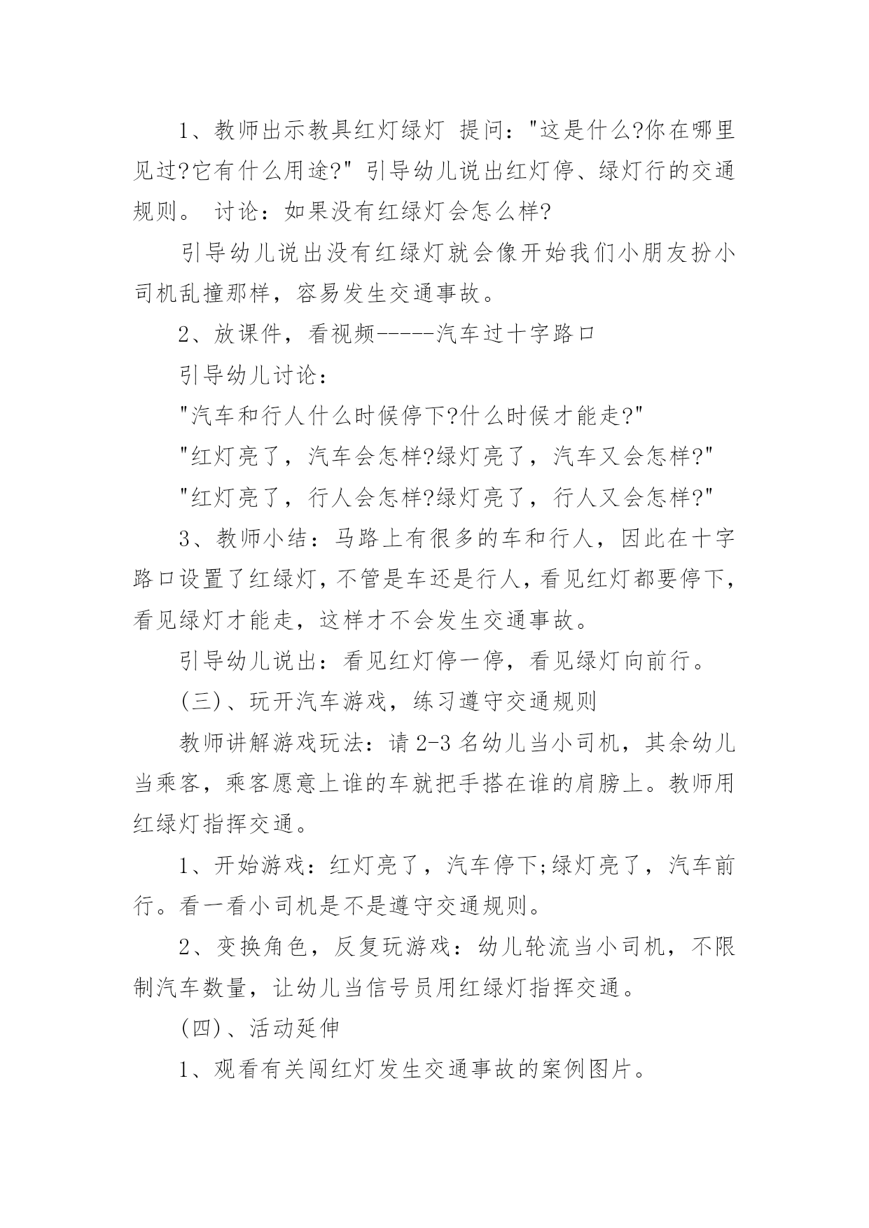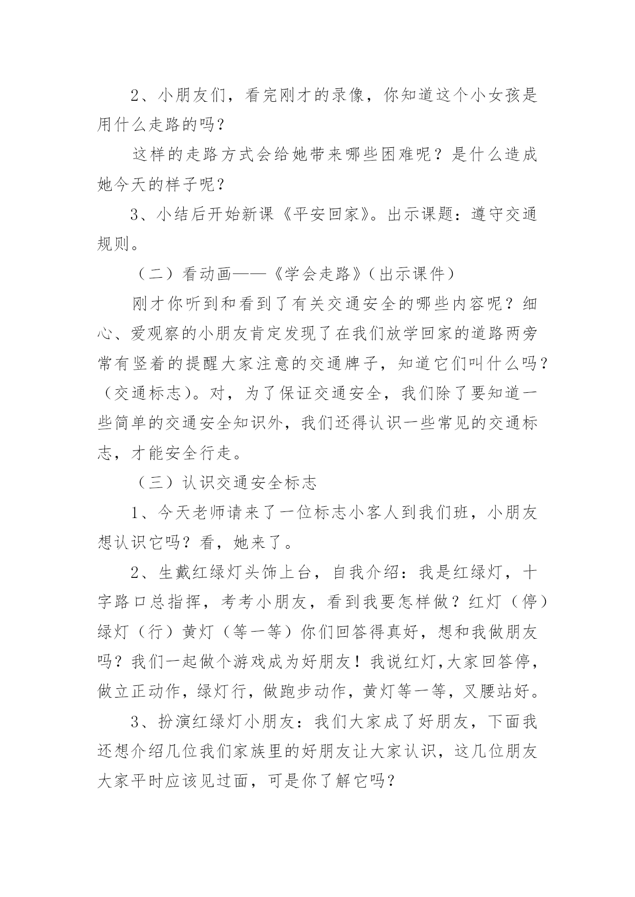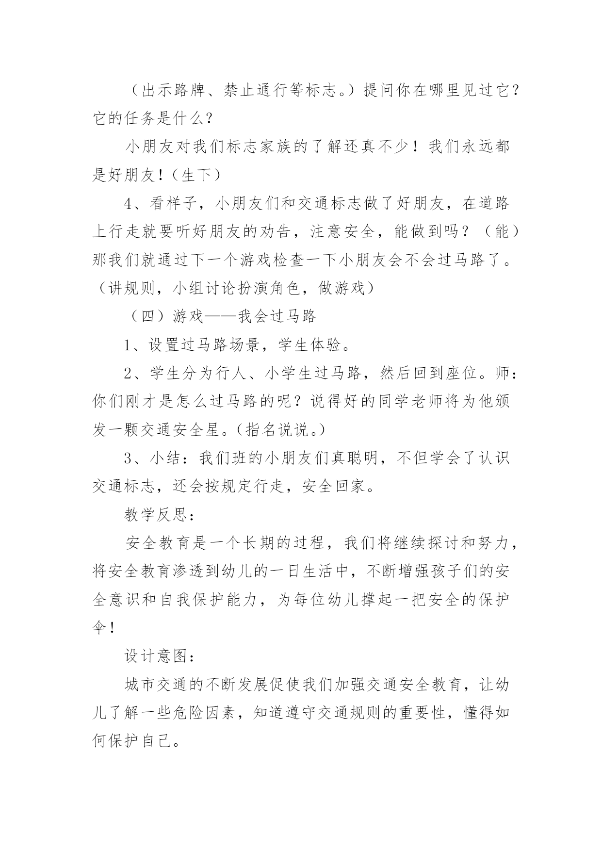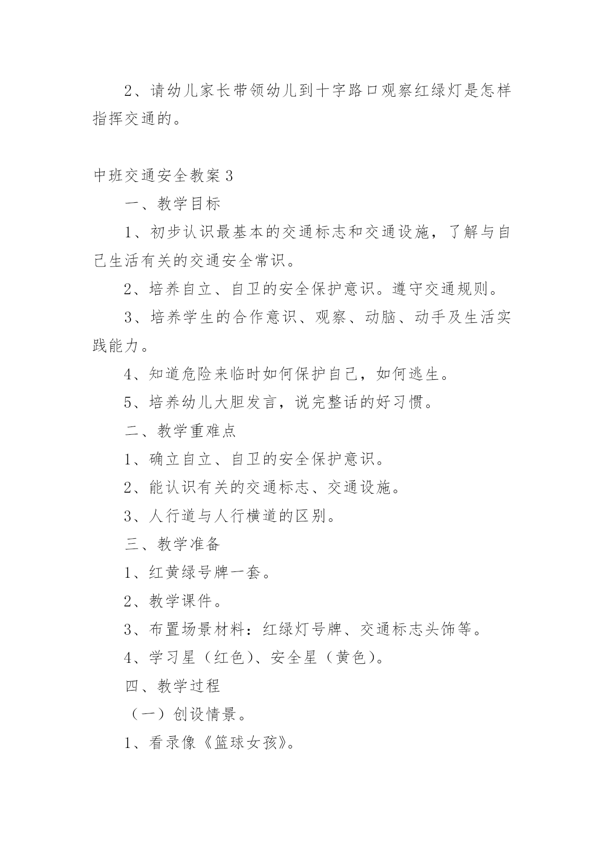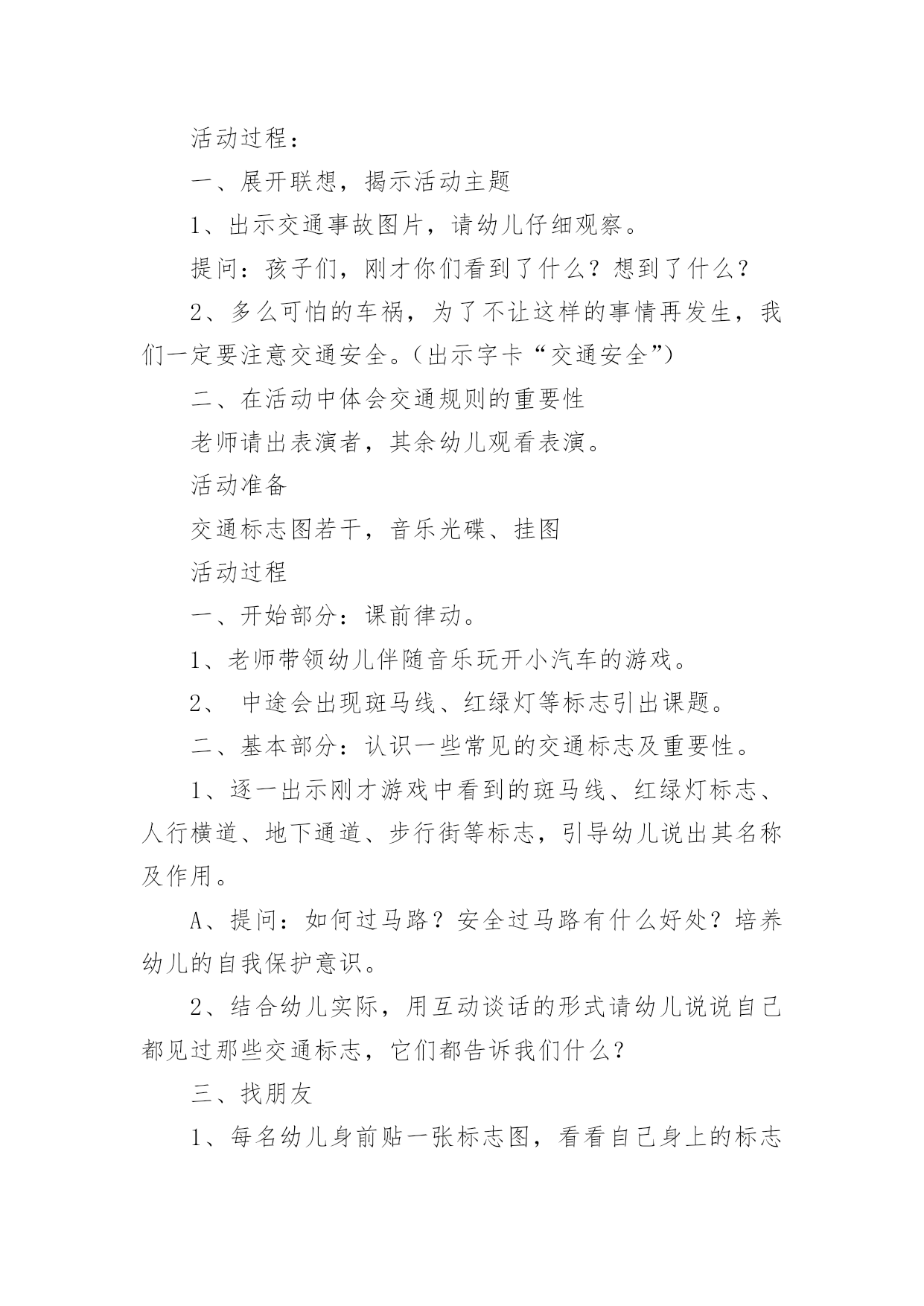 中班交通安全教案【精选】中班交通安全教案作为一名为他人授业解惑的教育工作者,很有必要精心设计一份教案,教案是教学活动的总的组织纲领和行动方案。那么什么样的教案才是好的呢?下面是小编收集整理的中班交通安全教案,欢迎阅读,希望大家能够喜欢。中班交通安全教案1活动意图:开学了,校园安全再次成为关注焦点。新的学期你怎么上学呢?是爸爸妈妈送你,还是自己去上学呢?无论何种方式都要注意安全。活动目标:1、在交流活动中认识常见的交通标志。2、体验交通规则的重要性,自觉遵守交通规则。3、遵守社会行为规则,不做“禁止”的事。4、考验小朋友们的反应能力,锻炼他们的个人能力。5、加强幼儿的安全意识。活动准备:6、布置活动场景。7、收集各种交通标志(照片或图片)。8、字卡:交通安全、红灯停,绿灯行、人行道、非机动车道、汽车道。活动过程:一、展开联想,揭示活动主题1、出示交通事故图片,请幼儿仔细观察。提问:孩子们,刚才你们看到了什么?想到了什么?2、多么可怕的车祸,为了不让这样的事情再发生,我们一定要注意交通安全。(出示字卡“交通安全”)二、在活动中体会交通规则的重要性老师请出表演者,其余幼儿观看表演。活动准备交通标志图若干,音乐光碟、挂图活动过程一、开始部分:课前律动。1、老师带领幼儿伴随音乐玩开小汽车的游戏。2、中途会出现斑马线、红绿灯等标志引出课题。二、基本部分:认识一些常见的交通标志及重要性。1、逐一出示刚才游戏中看到的斑马线、红绿灯标志、人行横道、地下通道、步行街等标志,引导幼儿说出其名称及作用。A、提问:如何过马路?安全过马路有什么好处?培养幼儿的自我保护意识。2、结合幼儿实际,用互动谈话的形式请幼儿说说自己都见过那些交通标志,它们都告诉我们什么?三、找朋友1、每名幼儿身前贴一张标志图,看看自己身上的标志图与黑板上的相同就站在一起。2、音乐伴奏《找朋友》。3、让找到好朋友的各组队员说说自己身上的标志图名称,还有我们平时应该怎样遵守交通规则。四、课的总结和延伸1、今天老师和小朋友一起认识了一些交通标志,懂得了它的作用,牢记安全第一,我们要做一个遵守交通规则的好孩子。2、如果有谁发现了其它的.标志,可以用笔画下来,回到班上和小朋友一起来认识。教学反思1、教学活动中游戏环节是幼儿最感兴趣的,课堂气氛活跃。2、通过游戏认识一些常见的交通标志及其代表的意义,再通过谈一谈交通标志的含义及作用,让幼儿知道遵守交通规则的重要性,培养幼儿遵守交通规则的意识。孩子们自主地和其他的小朋友去交流,这样既锻炼了口头语言表达能力,让孩子感受在一起玩的快乐。3、游戏时间过长,导致课的结尾仓促。中班交通安全教案2一、活动目标1、知道在马路上要遵守"红灯停、绿灯行"的交通规则。2、理解"红灯停,绿灯行"的重要性,强化幼儿的安全意识和遵守规则的能力。3、体验模仿游戏的快乐。4、遵守社会行为规则,不做“禁止”的`事。5、幼儿可以用完整的普通话进行交流。二、活动准备1、事先安排家长带孩子观察马路上的车、交通设施和标志等。2、布置马路场景:马路的十字路口、红绿灯信号牌。3、课件视频:汽车过十字路口。4、拟人化的红灯、绿灯(在两个长方形纸板上分别贴上圆形的红、绿色蜡光纸,画上眼睛)。5、音乐"我是小司机"、方向盘若干。三、活动过程:(一)导入活动1、游戏"我是小司机"师:今天,我们来做个游戏--扮小司机,你愿意扮就选一个方向盘吧。播放"我是小司机"的音乐,幼儿手持方向盘在十字路口自由开车,发生冲撞后停止音乐,游戏结束。请幼儿到座位上坐好。2、讨论:(1)、请幼儿说一说刚才小司机为什么会发生冲撞。(2)、请幼儿说一说十字路口的汽车为什么不会发生冲撞。(二)、红灯绿灯眨眼睛1、教师出示教具红灯绿灯提问:"这是什么?你在哪里见过?它有什么用途?"引导幼儿说出红灯停、绿灯行的交通规则。讨论:如果没有红绿灯会怎么样?引导幼儿说出没有红绿灯就会像开始我们小朋友扮小司机乱撞那样,容易发生交通事故。2、放课件,看视频-----汽车过十字路口引导幼儿讨论:"汽车和行人什么时候停下?什么时候才能走?""红灯亮了,汽车会怎样?绿灯亮了,汽车又会怎样?""红灯亮了,行人会怎样?绿灯亮了,行人又会怎样?"3、教师小结:马路上有很多的车和行人,因此在十字路口设置了红绿灯,不管是车还是行人,看见红灯都要停下,看见绿灯才能走,这样才不会发生交通事故。引导幼儿说出:看见红灯停一停,看见绿灯向前行。(三)、玩开汽车游戏,练习遵守交通规则教师讲解游戏玩法:请2-3名幼儿当小司机,其余幼儿当乘客,乘客愿意上谁的车就把手搭在谁的肩膀上。教师用红绿灯指挥交通。1、开始游戏:红灯亮了,汽车停下;绿灯亮了,汽车前行。看一看小司机是不是遵守交通规则。2、变换角色,反复玩游戏:幼儿轮流当小司机,不限制汽车数量,让幼儿当信号员用红绿灯