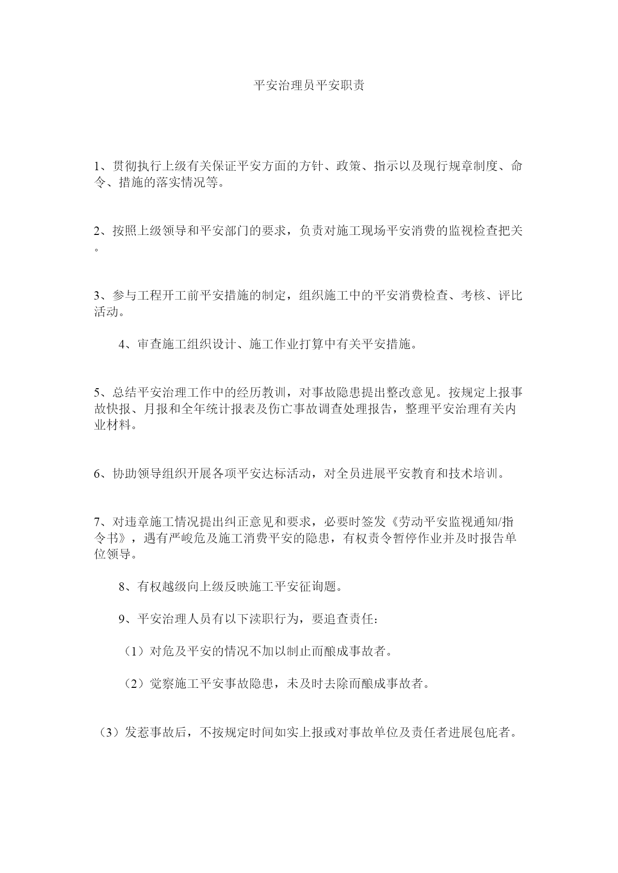 平安治理员平安职责1、贯彻执行上级有关保证平安方面的方针、政策、指示以及现行规章制度、命令、措施的落实情况等。2、按照上级领导和平安部门的要求,负责对施工现场平安消费的监视检查把关。3、参与工程开工前平安措施的制定,组织施工中的平安消费检查、考核、评比活动。4、审查施工组织设计、施工作业打算中有关平安措施。5、总结平安治理工作中的经历教训,对事故隐患提出整改意见。按规定上报事故快报、月报和全年统计报表及伤亡事故调查处理报告,整理平安治理有关内业材料。6、协助领导组织开展各项平安达标活动,对全员进展平安教育和技术培训。7、对违章施工情况提出纠正意见和要求,必要时签发《劳动平安监视通知/指令书》,遇有严峻危及施工消费平安的隐患,有权责令暂停作业并及时报告单位领导。8、有权越级向上级反映施工平安征询题。9、平安治理人员有以下渎职行为,要追查责任:(1)对危及平安的情况不加以制止而酿成事故者。(2)觉察施工平安事故隐患,未及时去除而酿成事故者。(3)发惹事故后,不按规定时间如实上报或对事故单位及责任者进展包庇者。