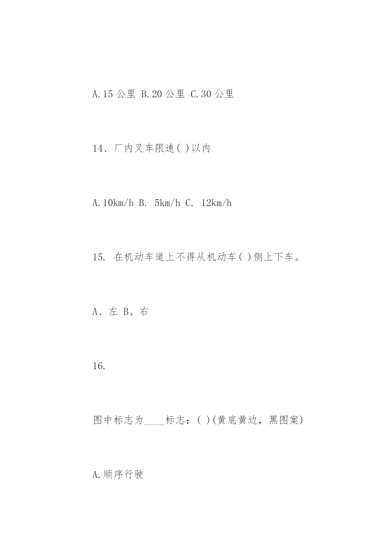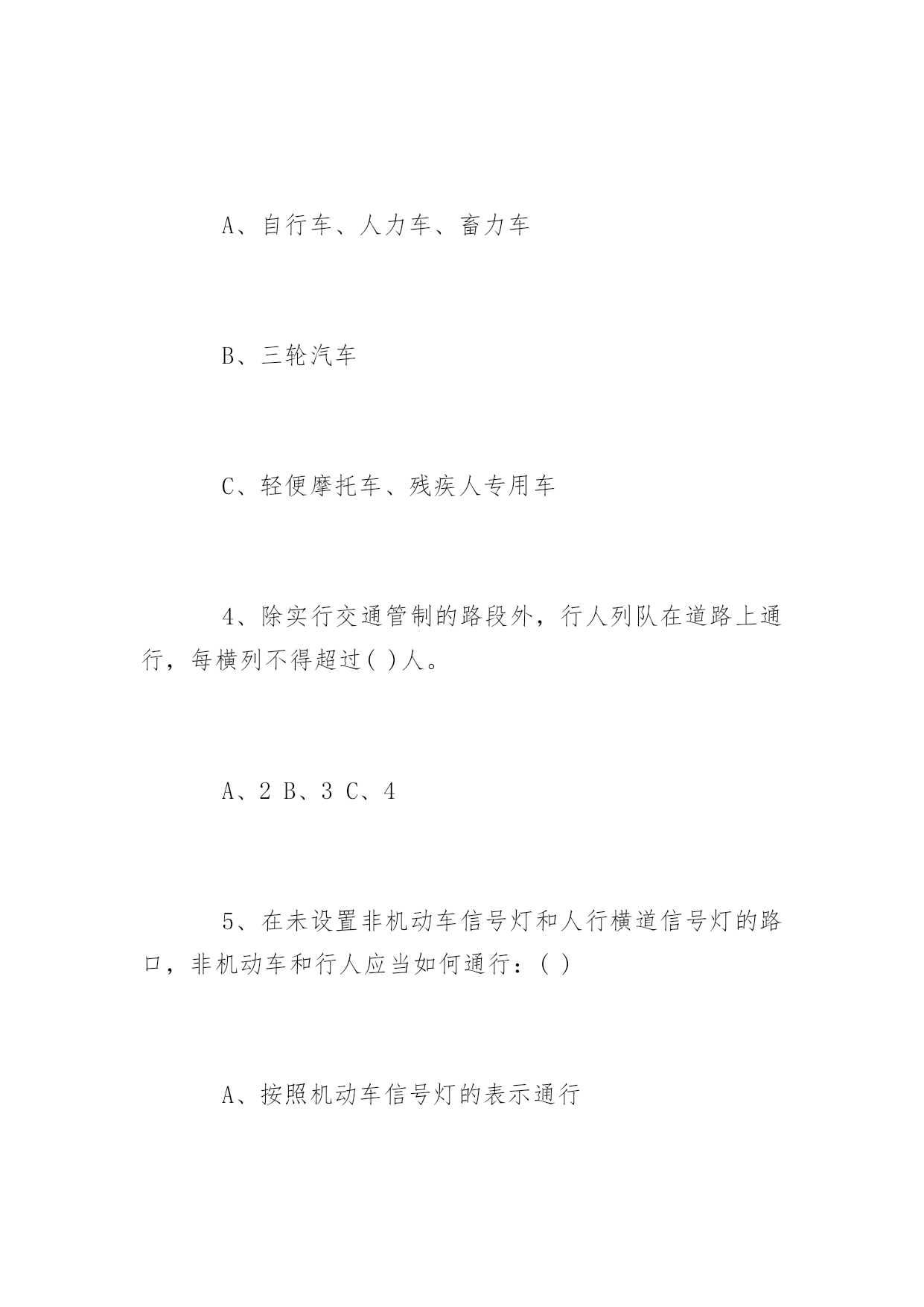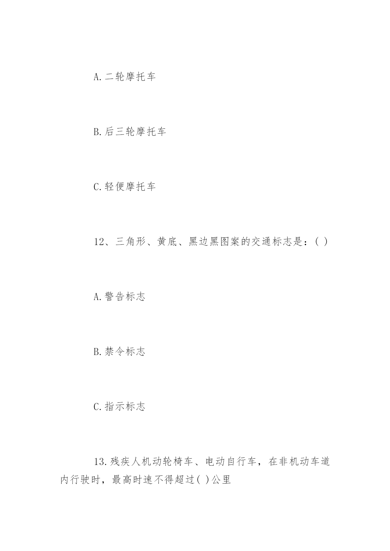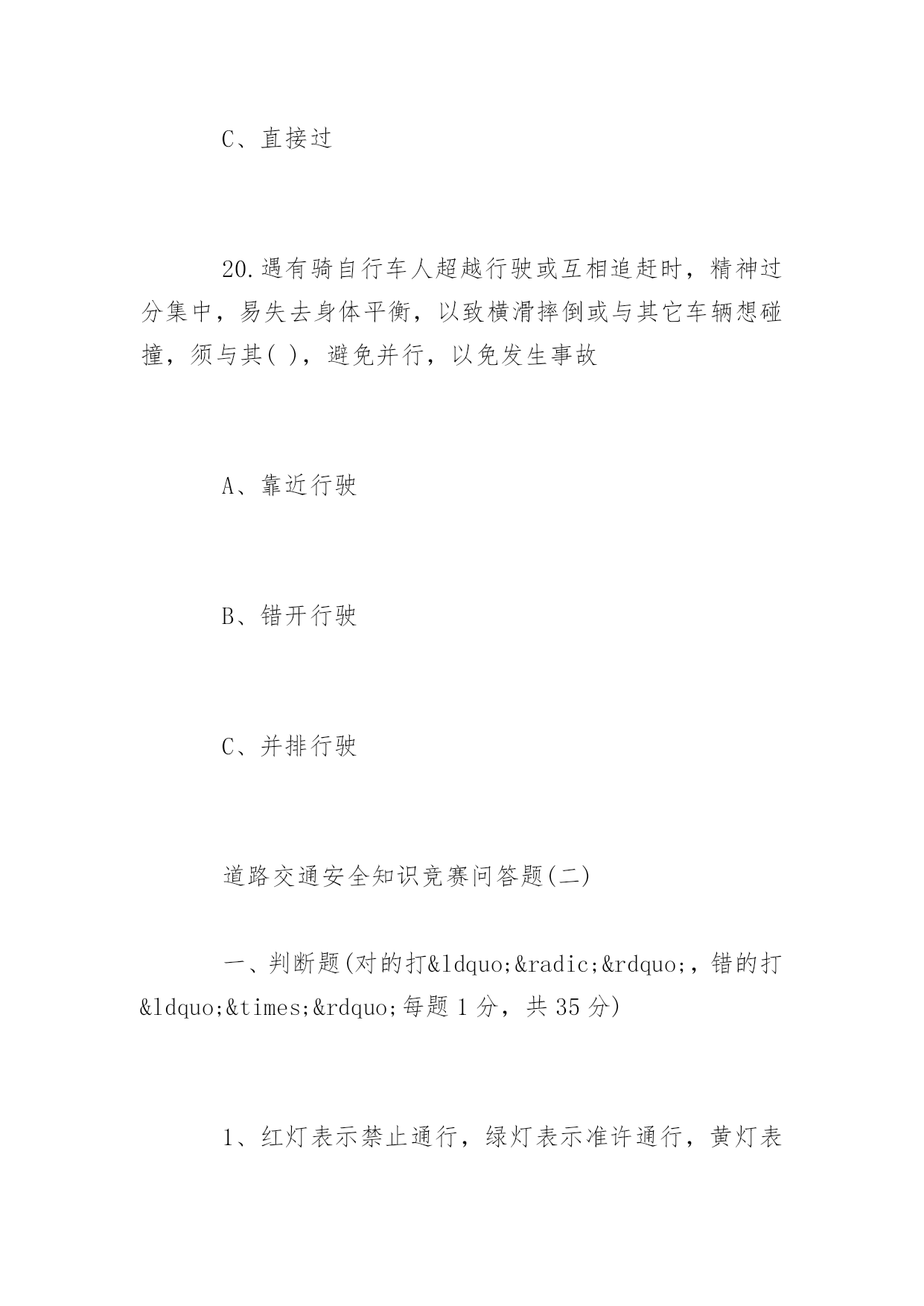道路交通安全知识竞赛问答道路交通安全知识竞赛问答道路交通安全关系到大家的出行安全。下面百分网小编为大家整理了相关道路交通安全知识竞赛问答题,你会做多少?。道路交通安全知识竞赛问答题(一)1、交通信号灯中的黄灯表示什么?()A、禁止通行B、准许通行C、警示2、()周岁以下儿童不能骑自行车上街A、10B、12C、143、下列哪项属于非机动车:()A、自行车、人力车、畜力车B、三轮汽车C、轻便摩托车、残疾人专用车4、除实行交通管制的路段外,行人列队在道路上通行,每横列不得超过()人。A、2B、3C、45、在未设置非机动车信号灯和人行横道信号灯的路口,非机动车和行人应当如何通行:()A、按照机动车信号灯的表示通行B、直接快速通过C、等候没有机动车时再通过6、驾驶非机动车应当在非机动车道内行驶,在没有非机动车道的道路上,应当靠车行道的()行驶A、左侧B、中间C、右侧7、未满()周岁的学生不驾驶电动自行车A、14周岁B、16周岁C、18周岁8、三轮车、人力车载物,高度从地面起不得超过()米。A、2B、3C、49、摩托车后坐不得乘坐未满()周岁的未成年人。A、11B、12C、1310、车辆通过没有交通信号灯也没有交通警察指挥的交叉路口,相对方向行驶的:()A.直行车让左转弯车先行B.左转弯车让右转弯车先行C.右转弯车让左转弯车先行11、下列哪种摩托车不准载人:()A.二轮摩托车B.后三轮摩托车C.轻便摩托车12、三角形、黄底、黑边黑图案的交通标志是:()A.警告标志B.禁令标志C.指示标志13.残疾人机动轮椅车、电动自行车,在非机动车道内行驶时,最高时速不得超过()公里A.15公里B.20公里C.30公里14、厂内叉车限速()以内A.10km/hB.5km/hC.12km/h15.在机动车道上不得从机动车()侧上下车。A、左B、右16.图中标志为____标志:()(黄底黄边,黑图案)A.顺序行驶B.反向弯路C.环形交叉路口17.图中标志为____标志:()(黄底、黑边、黑感叹号)A.注意危险B.禁行C.停车18.图中标志为____标志:()(蓝底白图案)A.鸣喇叭B.解除禁止鸣喇叭C.禁止鸣喇叭19.通过没有人行横道的街道时,在安全的情况下要直线通过,要注意来往车辆:()A、先看左后看右B、先看右后看左C、直接过20.遇有骑自行车人超越行驶或互相追赶时,精神过分集中,易失去身体平衡,以致横滑摔倒或与其它车辆想碰撞,须与其(),避免并行,以免发生事故A、靠近行驶B、错开行驶C、并排行驶道路交通安全知识竞赛问答题(二)一、判断题(对的打“√”,错的打“×”每题1分,共35分)1、红灯表示禁止通行,绿灯表示准许通行,黄灯表示警示(√)2、道路划分为机动车道、非机动车道和人行道的,机动车、非机动车、行人实行分道通行(√)3、没有划分机动车道、非机动车道和人行道的,机动车在道路中间通行,非机动车、行人在道路两侧通行(√)4、遇有交通警察现场指挥时,应当按照交通警察的指挥通行(√)5、电动自行车应当在机动车道内行驶(×)6、行人应当在人行道内行走,没有人行道的.靠路边行走(√)7、行人通过路口或者横过道路应当走人行横道或者过街设施(√)8、非机动车、行人不需要遵守交通信号灯的指示(×)9、行人通过没有人行横道的路口可以随便横过道路(×)10、行人横过道路时,遇有道路隔离设施可以跨越通过(×)11、在道路上可以依坐在隔离设施上休息(×)12、在乘坐公共汽车时不得向车外抛洒物品(√)13、进行锻炼时可以在道路上进行(×)14、横过道路时应当加速通过或忽前忽后避让车辆(×)15、骑自行车遇有黄灯亮时,已经越过停止线的可以继续通行(√)16、乘坐两轮摩托车应当正向骑坐(√)17、方向指示信号灯的箭头方向向左、向上、向右分别表示左转、直行、右转(√)18、闪光信号灯为持续闪烁的黄灯,指示车辆、行人通过时注意了望,确认安全后通过(√)19、出行时可以坐在货车车厢内(×)20、轻便摩托车不得载人(√)21、驾驶自行车、电动自行车、三轮车横过机动车道的,应当下车推行(√)22、驾驶电动自行车必须年满16周岁(√)23、驾驶自行车转弯时应当伸手示意(&radi