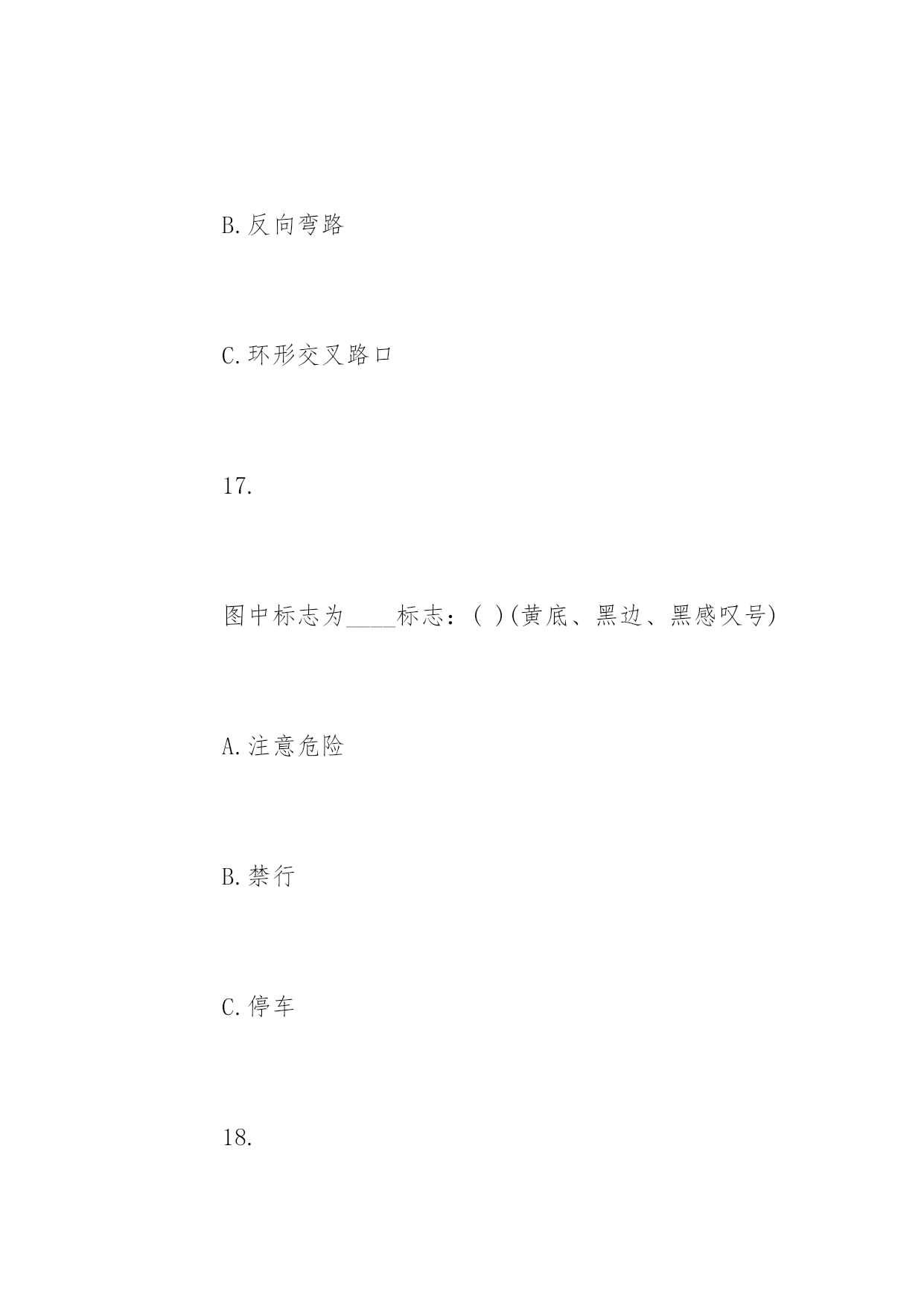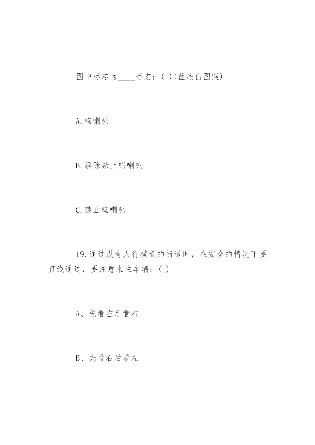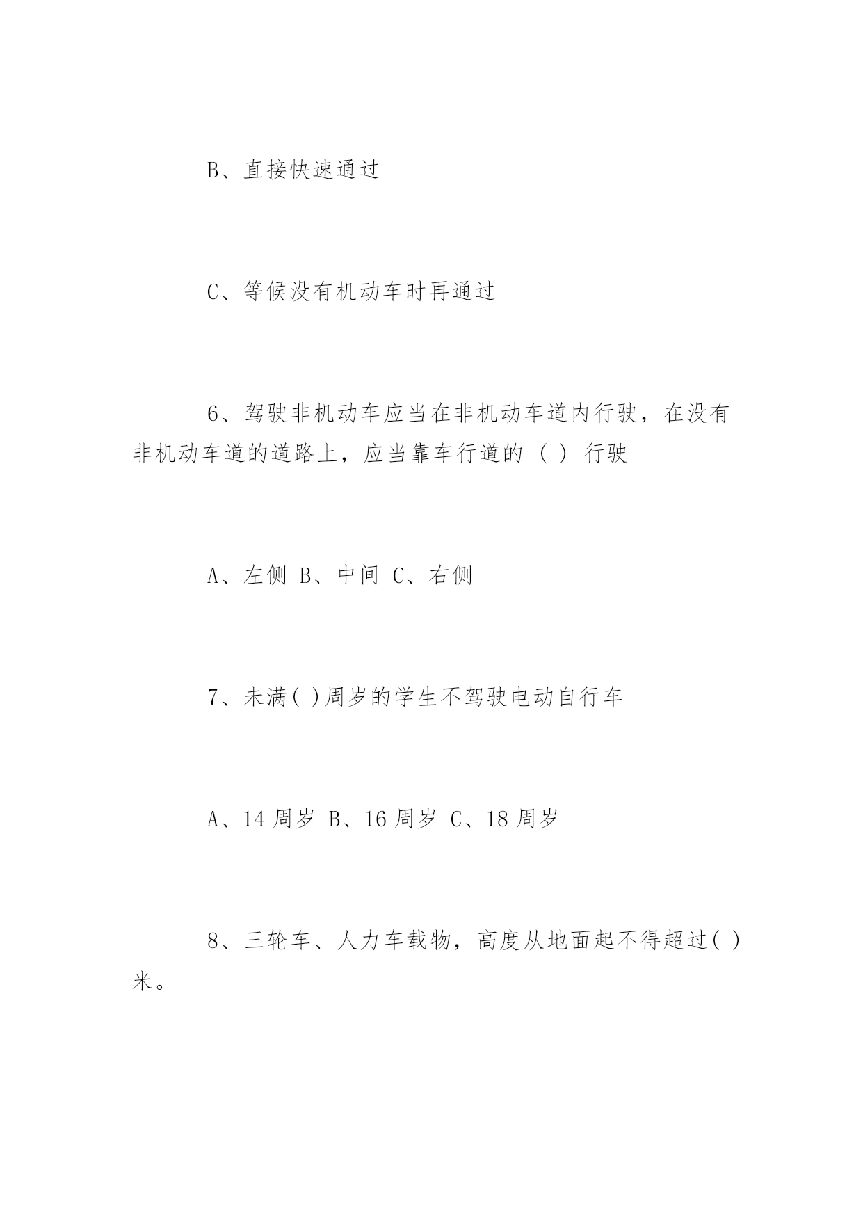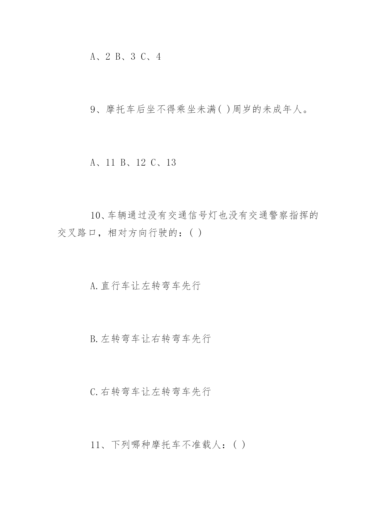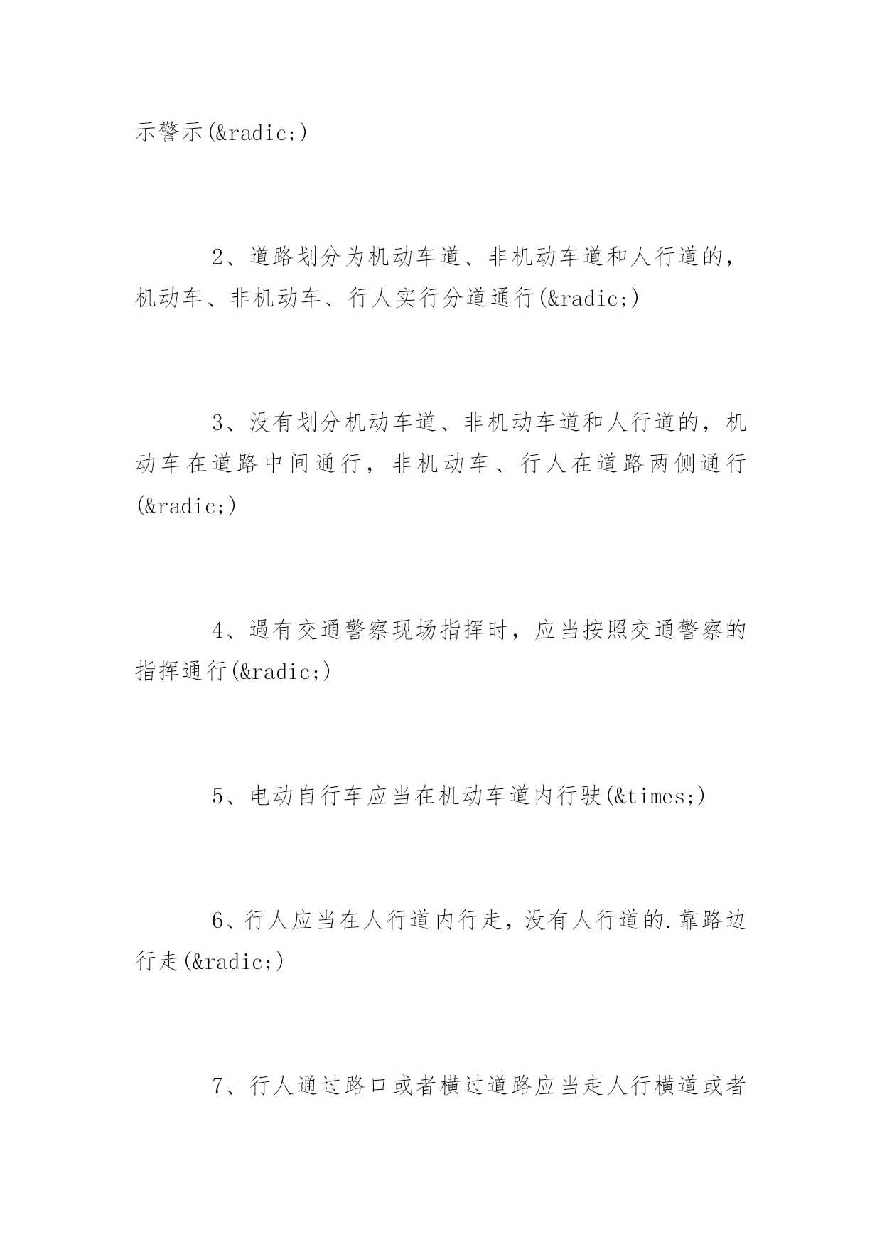 道路交通安全知识竞赛问答道路交通安全知识竞赛问答道路交通安全关系到大家的出行安全。下面百分网小编为大家整理了相关道路交通安全知识竞赛问答题,你会做多少?。道路交通安全知识竞赛问答题(一)1、交通信号灯中的黄灯表示什么?()A、禁止通行B、准许通行C、警示2、()周岁以下儿童不能骑自行车上街A、10B、12C、143、下列哪项属于非机动车:()A、自行车、人力车、畜力车B、三轮汽车C、轻便摩托车、残疾人专用车4、除实行交通管制的路段外,行人列队在道路上通行,每横列不得超过()人。A、2B、3C、45、在未设置非机动车信号灯和人行横道信号灯的路口,非机动车和行人应当如何通行:()A、按照机动车信号灯的表示通行B、直接快速通过C、等候没有机动车时再通过6、驾驶非机动车应当在非机动车道内行驶,在没有非机动车道的道路上,应当靠车行道的()行驶A、左侧B、中间C、右侧7、未满()周岁的学生不驾驶电动自行车A、14周岁B、16周岁C、18周岁8、三轮车、人力车载物,高度从地面起不得超过()米。A、2B、3C、49、摩托车后坐不得乘坐未满()周岁的未成年人。A、11B、12C、1310、车辆通过没有交通信号灯也没有交通警察指挥的交叉路口,相对方向行驶的:()A.直行车让左转弯车先行B.左转弯车让右转弯车先行C.右转弯车让左转弯车先行11、下列哪种摩托车不准载人:()A.二轮摩托车B.后三轮摩托车C.轻便摩托车12、三角形、黄底、黑边黑图案的交通标志是:()A.警告标志B.禁令标志C.指示标志13.残疾人机动轮椅车、电动自行车,在非机动车道内行驶时,最高时速不得超过()公里A.15公里B.20公里C.30公里14、厂内叉车限速()以内A.10km/hB.5km/hC.12km/h15.在机动车道上不得从机动车()侧上下车。A、左B、右16.图中标志为____标志:()(黄底黄边,黑图案)A.顺序行驶B.反向弯路C.环形交叉路口17.图中标志为____标志:()(黄底、黑边、黑感叹号)A.注意危险B.禁行C.停车18.图中标志为____标志:()(蓝底白图案)A.鸣喇叭B.解除禁止鸣喇叭C.禁止鸣喇叭19.通过没有人行横道的街道时,在安全的情况下要直线通过,要注意来往车辆:()A、先看左后看右B、先看右后看左C、直接过20.遇有骑自行车人超越行驶或互相追赶时,精神过分集中,易失去身体平衡,以致横滑摔倒或与其它车辆想碰撞,须与其(),避免并行,以免发生事故A、靠近行驶B、错开行驶C、并排行驶道路交通安全知识竞赛问答题(二)一、判断题(对的打“√”,错的打“×”每题1分,共35分)1、红灯表示禁止通行,绿灯表示准许通行,黄灯表示警示(√)2、道路划分为机动车道、非机动车道和人行道的,机动车、非机动车、行人实行分道通行(√)3、没有划分机动车道、非机动车道和人行道的,机动车在道路中间通行,非机动车、行人在道路两侧通行(√)4、遇有交通警察现场指挥时,应当按照交通警察的指挥通行(√)5、电动自行车应当在机动车道内行驶(×)6、行人应当在人行道内行走,没有人行道的.靠路边行走(√)7、行人通过路口或者横过道路应当走人行横道或者过街设施(√)8、非机动车、行人不需要遵守交通信号灯的指示(×)9、行人通过没有人行横道的路口可以随便横过道路(×)10、行人横过道路时,遇有道路隔离设施可以跨越通过(×)11、在道路上可以依坐在隔离设施上休息(×)12、在乘坐公共汽车时不得向车外抛洒物品(√)13、进行锻炼时可以在道路上进行(×)14、横过道路时应当加速通过或忽前忽后避让车辆(×)15、骑自行车遇有黄灯亮时,已经越过停止线的可以继续通行(√)16、乘坐两轮摩托车应当正向骑坐(√)17、方向指示信号灯的箭头方向向左、向上、向右分别表示左转、直行、右转(√)18、闪光信号灯为持续闪烁的黄灯,指示车辆、行人通过时注意了望,确认安全后通过(√)19、出行时可以坐在货车车厢内(×)20、轻便摩托车不得载人(√)21、驾驶自行车、电动自行车、三轮车横过机动车道的,应当下车推行(√)22、驾驶电动自行车必须年满16周岁(√)23、驾驶自行车转弯时应当伸手示意(&radi