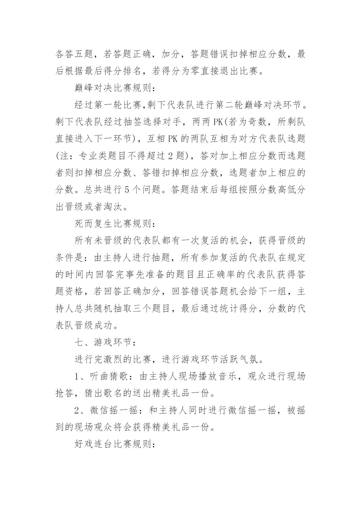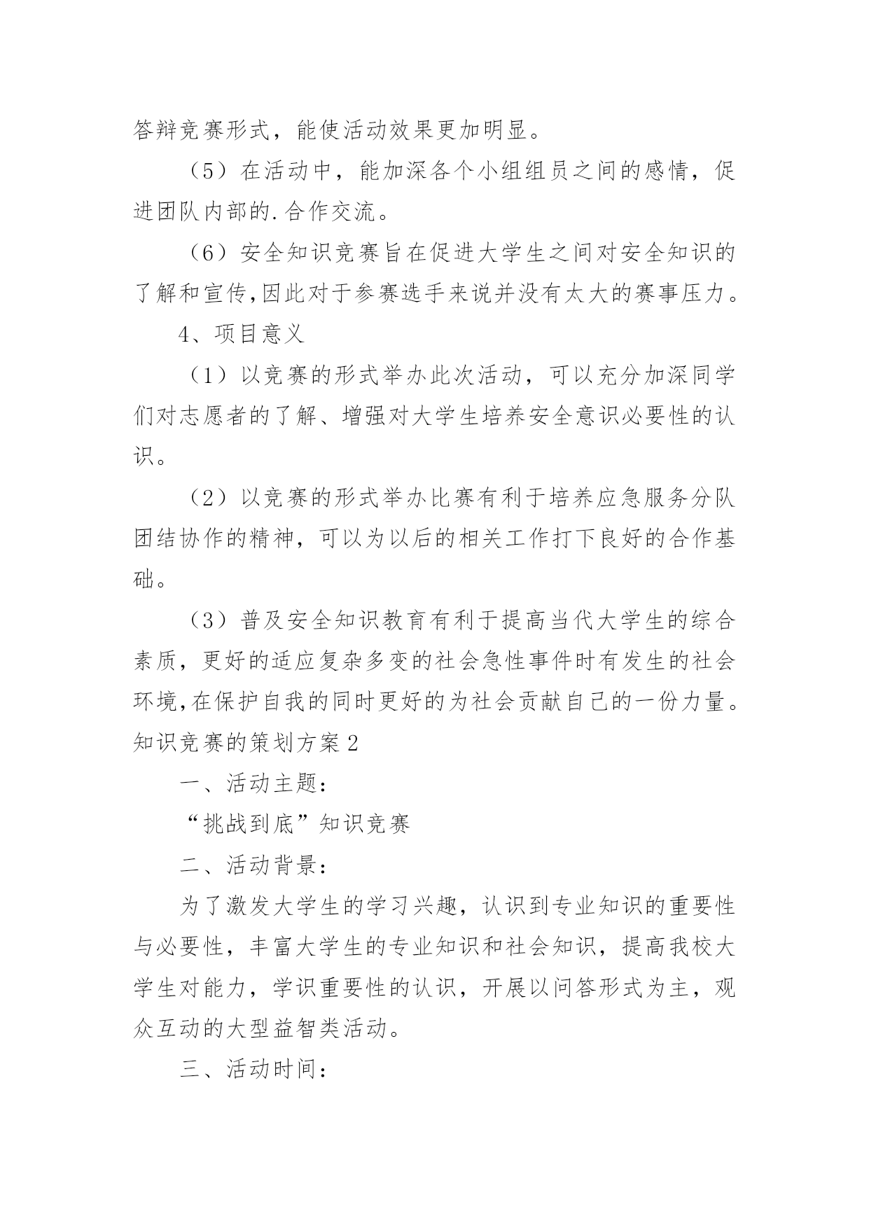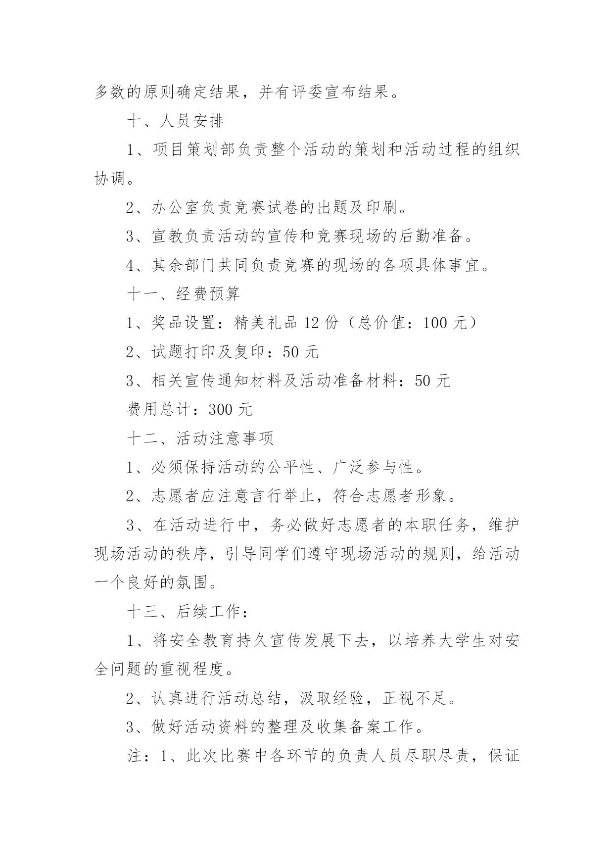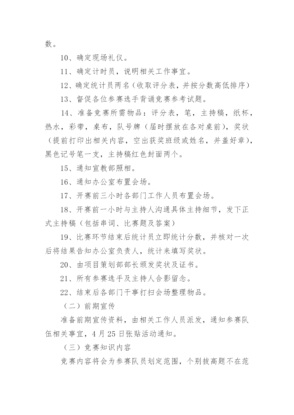 知识竞赛的策划方案知识竞赛的策划方案(合集15篇)为了确保工作或事情有序地进行,常常需要预先准备方案,方案的内容多是上级对下级或涉及面比较大的工作,一般都用带“文件头”形式下发。那么制定方案需要注意哪些问题呢?下面是小编帮大家整理的知识竞赛的策划方案,欢迎大家分享。知识竞赛的策划方案1一、活动主题关注安全,人人参与,构建和谐校园二、活动目的为了切实加强学院安全教育和管理,避免或减少安全事故,保障学生人身、财产安全,构建平安和谐校园,在大学生中普及国家安全、交通安全、消防安全、人身安全、财物安全、网络安全等方面的法律知识和一般常识,增强大学生安全防范意识和自我防范能力,引导大学生树立关爱生命、关注安全、关注社会和社会公益的良好道德风尚,特举办大学生安全知识竞赛。通过本次安全知识竞赛的开展,加深同学们对安全知识的了解,激发同学们的安全意识,提高自我保护能力,共同创建和谐安全校园。三、活动原则求知、求实、求精,公平、公开、公正四、活动对象淮海工学院高校应急志愿者支队五、活动时间4月28日下午六、活动地点大学生活动中心报告厅七、主办单位淮海工学院青年志愿者协会八、活动流程(一)活动准备1、确定参赛人员名单。2、打印竞赛参考试题,每人一份。3、活动前一个星期,宣教部联系其他部门制作出活动所需所需物品及比赛场地。并给每对参赛负责人开会明确竞赛相关事宜,分发试题、竞赛形式及流程安排,并通知时间地点。4、确定竞赛各个环节竞赛题目(由项目策划部保存)5、根据竞赛流程及正式的竞赛题目,写出详细的主持稿。6、确定主持人:男女各一名7、准备主持人服装。8、确定评委,嘉宾,并发请柬,需做场人数通知各志愿者服务大队。9、写出评分表,评分细则,每位评委负责一个队的分数。10、确定现场礼仪。11、确定计时员,说明相关工作事宜。12、确定统计员两名(收取评分表,并按分数高低排序)13、督促各位参赛选手背诵竞赛参考试题。14、准备竞赛所需物品:评分表,笔,主持稿,纸杯,热水,彩带,桌布,队号牌(届时摆放在各对桌前),奖状(提前打印出相关内容,空出获奖班级或姓名,并盖好章),黑色记号笔一支,主持稿红色封面两个。15、通知宣教部照相。16、通知办公室布置会场。17、开赛前三小时各部门工作人员布置会场。18、开赛前一小时与主持人沟通具体主持细节,发下正式主持稿(包括串词、比赛题及答案)19、比赛环节结束后统计员立即统计分数,并核对一次后将结果告知办公室负责人,统计来填写奖状。20、由项目策划部部长颁发奖状及证书。21、所有参赛选手及主持人合影留念。22、结束后各部门干事打扫会场整理物品。(二)前期宣传准备前期宣传资料,由相关工作人员派发,通知参赛队伍相关事宜,4月25日张贴活动通知。(三)竞赛知识内容竞赛内容将会为参赛队员划定范围,个别拔高题不在范围内。(四)参赛形式参赛以组队形式,队员3名,其中一人为队长。(五)竞赛流程初赛:(4月28日上午9点,以15个参赛队为基本单位进行比赛)答卷形式:通过综合试题的考察,包括各方面的安全防护知识,届时将根据得分高低选取6个参赛队进入决赛。考题满分100分。决赛:(4月29日下午2点,6个队伍决赛)(1)第一轮为必答题:分为1到6组题,每组3道题,3位选手轮流独立作答,答对得10分,答错不扣分。(2)第二轮为抢答题:主持人将会依次给出4个提示,猜一个安全物品,给出第一个提示时回答正确得40分,给出两个提示时回答正确得30分,以此类推。共有8个物品。答错不扣分,每队每次均可抢答。主持人说开始之后抢答,提前抢答算犯规,取消本轮答题机会。(3)第三轮为判断题:要求每队选出一名参赛队员,在2分钟内回答判断题,共有6道题,每道判断题5分,答错不扣分。答题时组内部不可讨论。(4)第三轮为简答题:共6道简答题,每道题共20分,答题踩点得分。答对几点得相应分值,打错不扣分。答题在规定的时间里写在答题板上。(5)第三轮为风险题:共有12道风险题,分值分别为10分、30分、50分、80分,每队回答2道问题,每次均可选任意分值题。答对得相应分,打错扣相应分。从目前累计分值最高的队伍依次开始选题作答。(6)若有分数相同情况,进行加赛。6、决赛现场观众互动决赛的每两个环节之后均有两次抽奖活动。以观众所在作为坐标为抽取对象。所有参与观看决赛的同学均有机会成为幸运观众,并赢得幸运小礼品。7、颁发奖品奖项设置:个人一等奖一名,个人二等奖两名,个人三等奖三名,团体一等奖一名,团体一等奖两名,团体二等奖两名,团体三等奖三名,给获奖者颁发荣誉证书。幸运观众6名。九、竞赛注意事项1、比赛进行过程中,各参赛队员需将各种通讯设施关闭,比赛开始时,场下观众调至为静音模式。2、队员在回答必答题时,该队其他队员不能给予任何形式的提示,违者该队取消此题答题资格,该试题作废。3