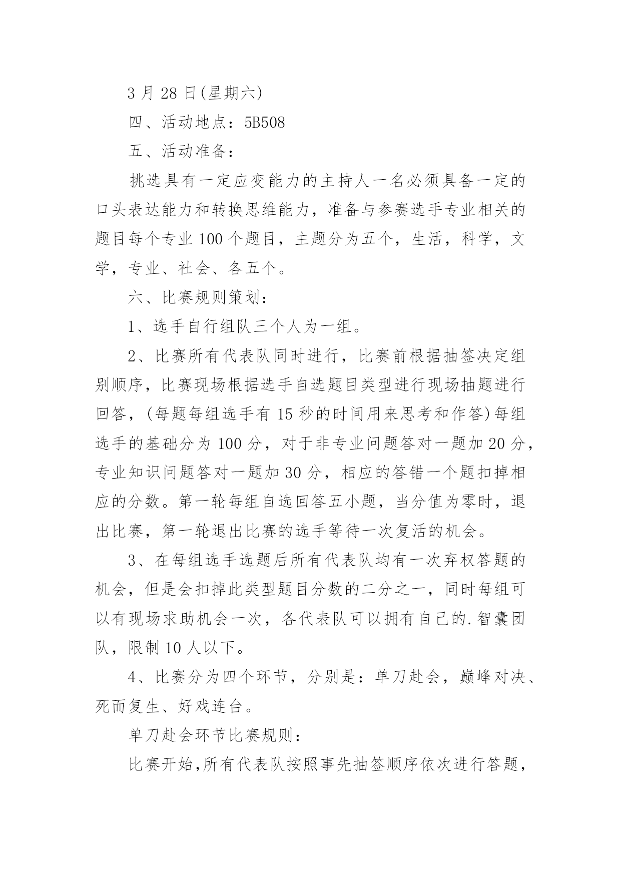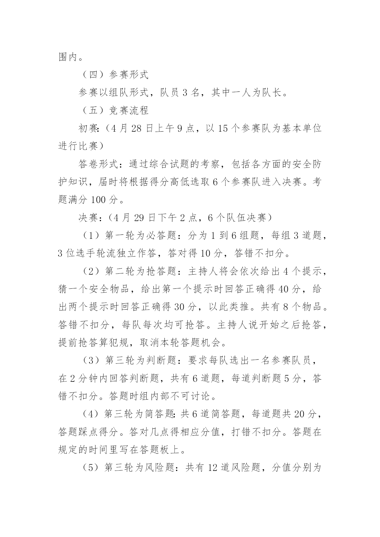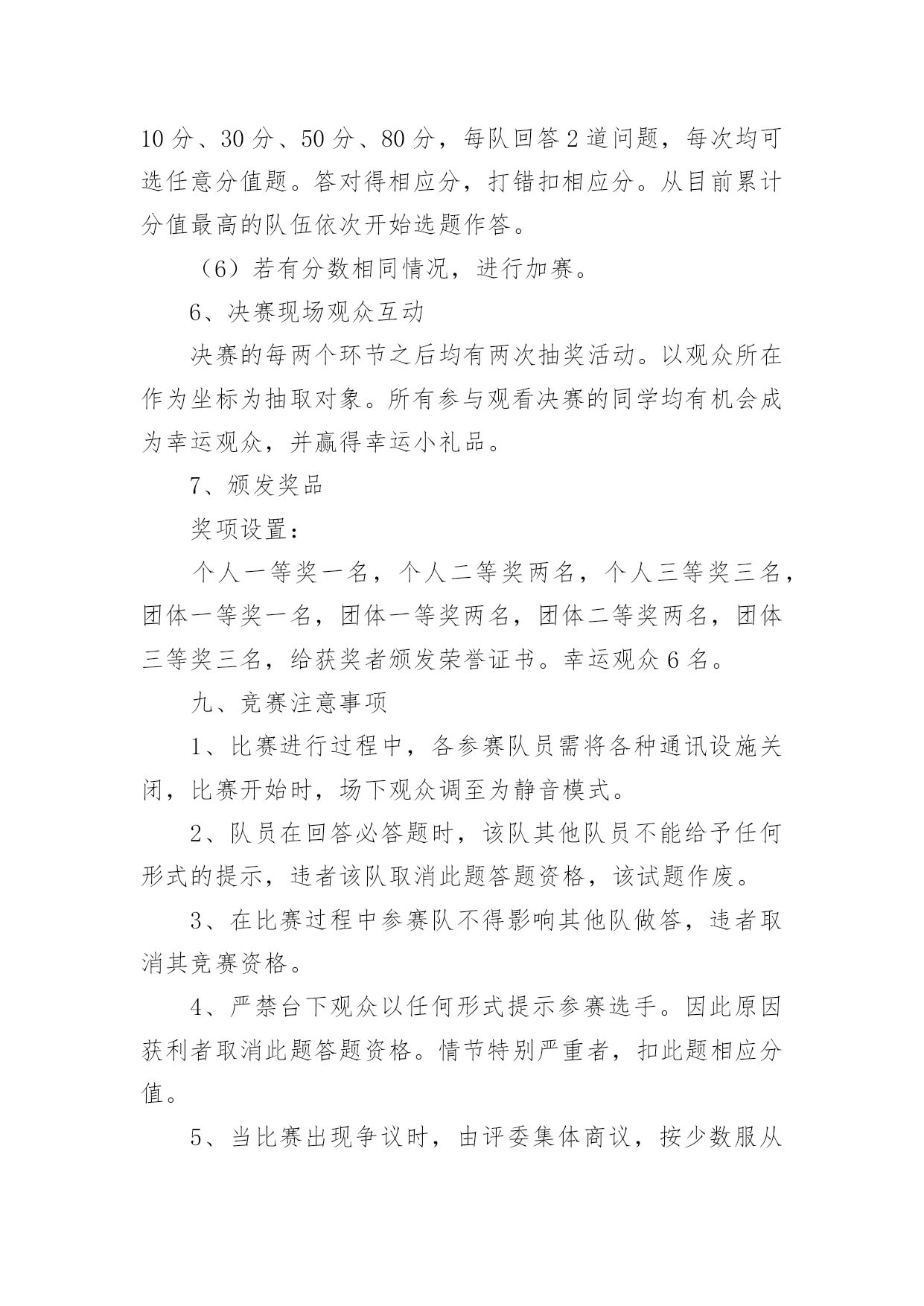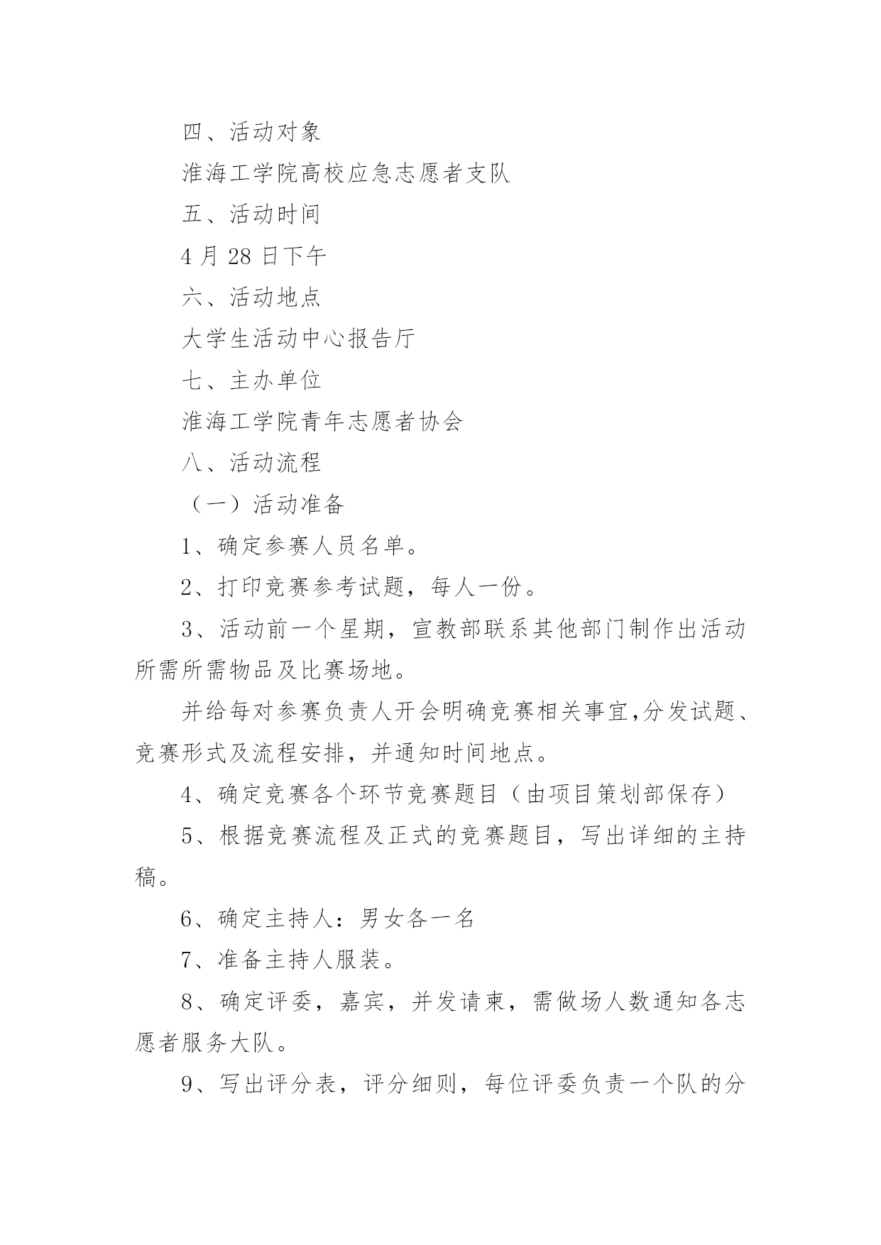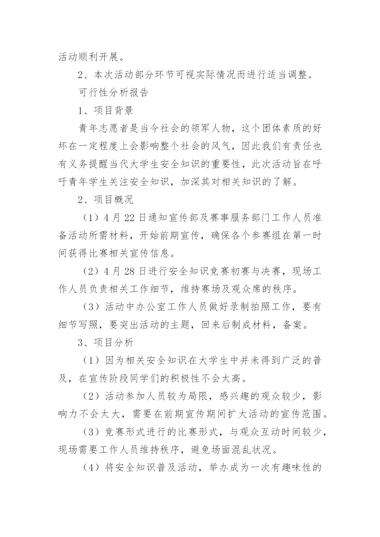 知识竞赛的策划方案知识竞赛的策划方案(合集15篇)为了确保工作或事情有序地进行,常常需要预先准备方案,方案的内容多是上级对下级或涉及面比较大的工作,一般都用带“文件头”形式下发。那么制定方案需要注意哪些问题呢?下面是小编帮大家整理的知识竞赛的策划方案,欢迎大家分享。知识竞赛的策划方案1一、活动主题关注安全,人人参与,构建和谐校园二、活动目的为了切实加强学院安全教育和管理,避免或减少安全事故,保障学生人身、财产安全,构建平安和谐校园,在大学生中普及国家安全、交通安全、消防安全、人身安全、财物安全、网络安全等方面的法律知识和一般常识,增强大学生安全防范意识和自我防范能力,引导大学生树立关爱生命、关注安全、关注社会和社会公益的良好道德风尚,特举办大学生安全知识竞赛。通过本次安全知识竞赛的开展,加深同学们对安全知识的了解,激发同学们的安全意识,提高自我保护能力,共同创建和谐安全校园。三、活动原则求知、求实、求精,公平、公开、公正四、活动对象淮海工学院高校应急志愿者支队五、活动时间4月28日下午六、活动地点大学生活动中心报告厅七、主办单位淮海工学院青年志愿者协会八、活动流程(一)活动准备1、确定参赛人员名单。2、打印竞赛参考试题,每人一份。3、活动前一个星期,宣教部联系其他部门制作出活动所需所需物品及比赛场地。并给每对参赛负责人开会明确竞赛相关事宜,分发试题、竞赛形式及流程安排,并通知时间地点。4、确定竞赛各个环节竞赛题目(由项目策划部保存)5、根据竞赛流程及正式的竞赛题目,写出详细的主持稿。6、确定主持人:男女各一名7、准备主持人服装。8、确定评委,嘉宾,并发请柬,需做场人数通知各志愿者服务大队。9、写出评分表,评分细则,每位评委负责一个队的分数。10、确定现场礼仪。11、确定计时员,说明相关工作事宜。12、确定统计员两名(收取评分表,并按分数高低排序)13、督促各位参赛选手背诵竞赛参考试题。14、准备竞赛所需物品:评分表,笔,主持稿,纸杯,热水,彩带,桌布,队号牌(届时摆放在各对桌前),奖状(提前打印出相关内容,空出获奖班级或姓名,并盖好章),黑色记号笔一支,主持稿红色封面两个。15、通知宣教部照相。16、通知办公室布置会场。17、开赛前三小时各部门工作人员布置会场。18、开赛前一小时与主持人沟通具体主持细节,发下正式主持稿(包括串词、比赛题及答案)19、比赛环节结束后统计员立即统计分数,并核对一次后将结果告知办公室负责人,统计来填写奖状。20、由项目策划部部长颁发奖状及证书。21、所有参赛选手及主持人合影留念。22、结束后各部门干事打扫会场整理物品。(二)前期宣传准备前期宣传资料,由相关工作人员派发,通知参赛队伍相关事宜,4月25日张贴活动通知。(三)竞赛知识内容竞赛内容将会为参赛队员划定范围,个别拔高题不在范围内。(四)参赛形式参赛以组队形式,队员3名,其中一人为队长。(五)竞赛流程初赛:(4月28日上午9点,以15个参赛队为基本单位进行比赛)答卷形式:通过综合试题的考察,包括各方面的安全防护知识,届时将根据得分高低选取6个参赛队进入决赛。考题满分100分。决赛:(4月29日下午2点,6个队伍决赛)(1)第一轮为必答题:分为1到6组题,每组3道题,3位选手轮流独立作答,答对得10分,答错不扣分。(2)第二轮为抢答题:主持人将会依次给出4个提示,猜一个安全物品,给出第一个提示时回答正确得40分,给出两个提示时回答正确得30分,以此类推。共有8个物品。答错不扣分,每队每次均可抢答。主持人说开始之后抢答,提前抢答算犯规,取消本轮答题机会。(3)第三轮为判断题:要求每队选出一名参赛队员,在2分钟内回答判断题,共有6道题,每道判断题5分,答错不扣分。答题时组内部不可讨论。(4)第三轮为简答题:共6道简答题,每道题共20分,答题踩点得分。答对几点得相应分值,打错不扣分。答题在规定的时间里写在答题板上。(5)第三轮为风险题:共有12道风险题,分值分别为10分、30分、50分、80分,每队回答2道问题,每次均可选任意分值题。答对得相应分,打错扣相应分。从目前累计分值最高的队伍依次开始选题作答。(6)若有分数相同情况,进行加赛。6、决赛现场观众互动决赛的每两个环节之后均有两次抽奖活动。以观众所在作为坐标为抽取对象。所有参与观看决赛的同学均有机会成为幸运观众,并赢得幸运小礼品。7、颁发奖品奖项设置:个人一等奖一名,个人二等奖两名,个人三等奖三名,团体一等奖一名,团体一等奖两名,团体二等奖两名,团体三等奖三名,给获奖者颁发荣誉证书。幸运观众6名。九、竞赛注意事项1、比赛进行过程中,各参赛队员需将各种通讯设施关闭,比赛开始时,场下观众调至为静音模式。2、队员在回答必答题时,该队其他队员不能给予任何形式的提示,违者该队取消此题答题资格,该试题作废。3