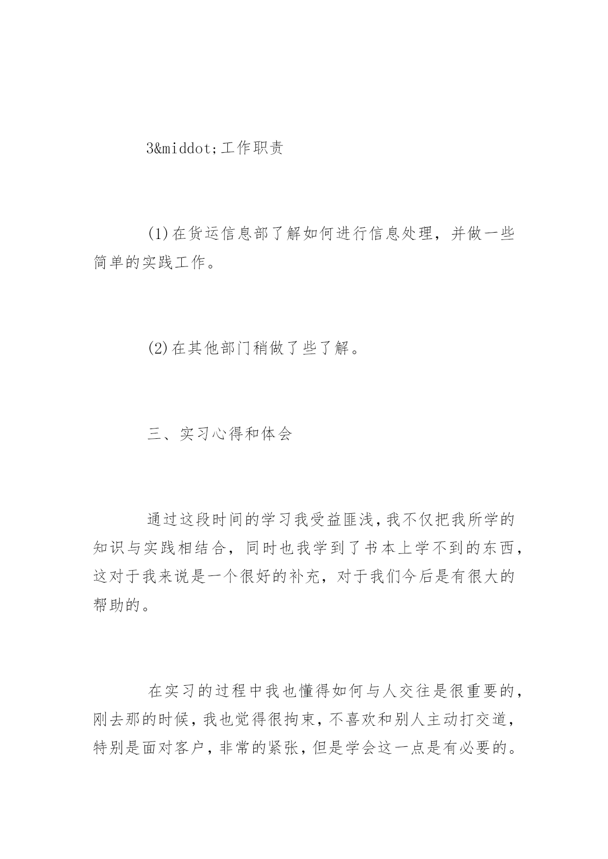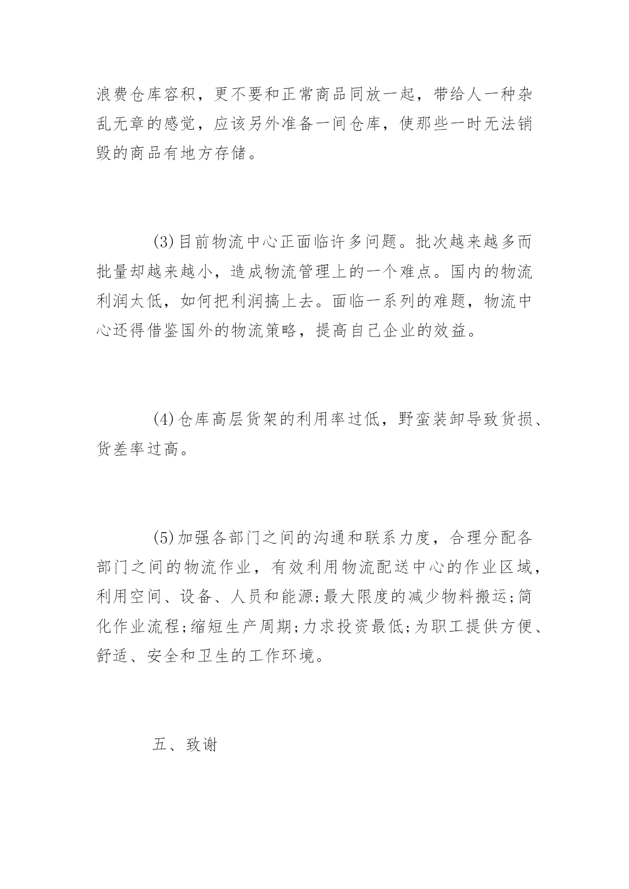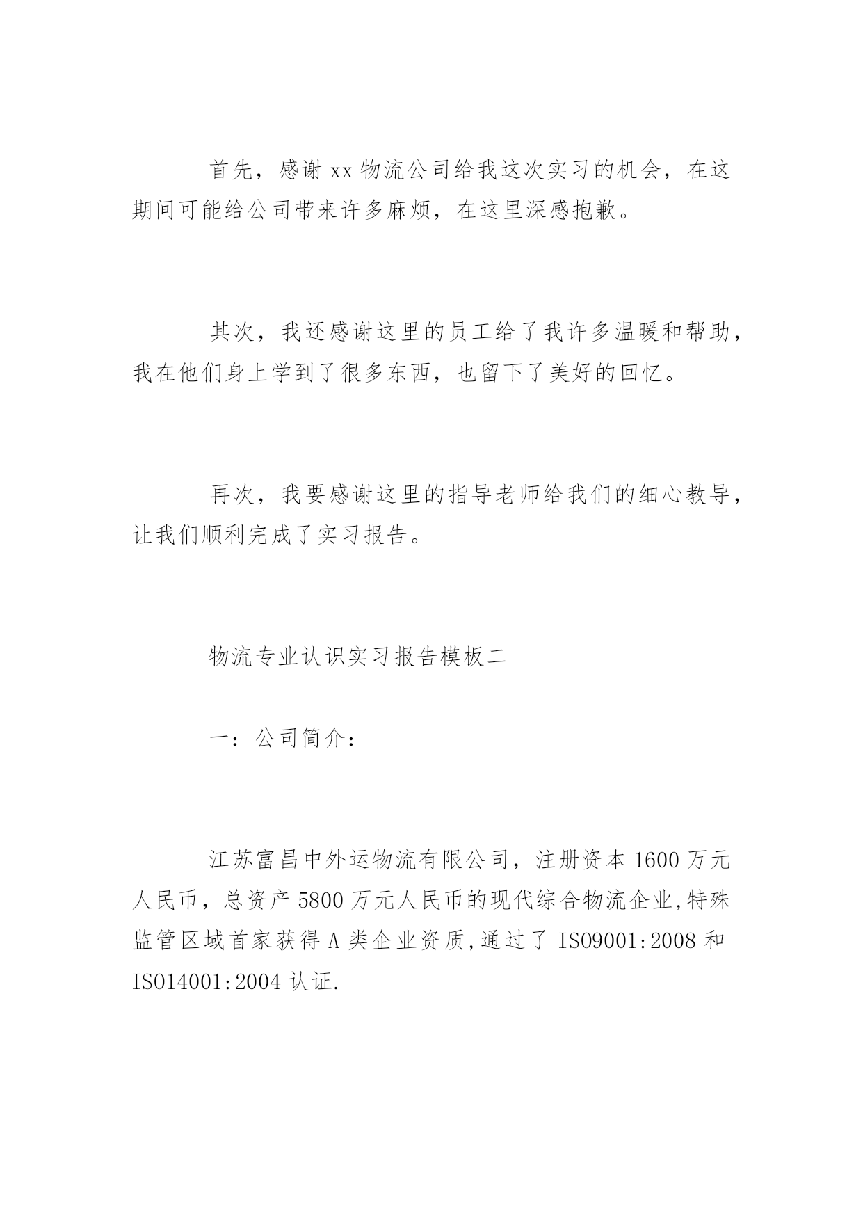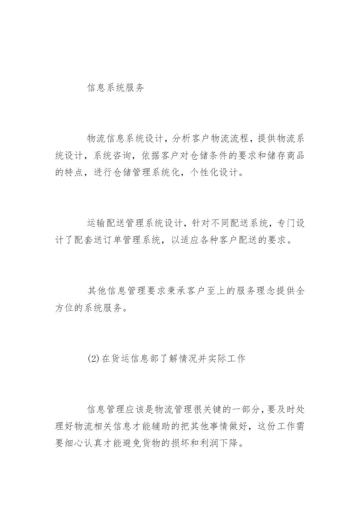 物流专业认识实习报告物流专业认识实习报告模板物流专业认识实习是学校教育向课堂外的一种延伸,也是推进素质教育进程的重要手段。以下是物流专业认识实习报告模板,欢迎阅览!物流专业认识实习报告模板一一、实习单位简介xx物流位于湖北省松滋市新江口镇,这家公司位于环城路,交通方便,是个天时地利人和的地方,虽是个小型的物流公司,人员不多,但服务周到细致。各部门相互配合得很好,密不可分。二、实习岗位及过程1·实习岗位:货物看管员2·实现过程:(1)通过资料查询和实地观察了解货运问题仓储系统服务市内、国内配送,单品、综合配送,各有各式的车型,承运商品包括:百货商品、冷藏保温、特殊商品。贵重物品配送,提供到门服务,确保商品安全抵达用户手中。隔日零担物流,对于零担配送,公司承诺,货物隔日上车发货。上架陈列,对于市内各商场、各类超市、连锁网点的配送服务,公司还提供协助客户商品上架陈列的服务。常温、恒温仓库存储,高层、堆垛货架存储存货及时控制,有效地货卡登记制度,可随时了解库存商品的数量,确保商品质量,随时检查,出现问题及时上报调整。定时观察库房条件,确保库房内温,温度不超标。加工调整,提供完善的分炼、换包装等加工服务。订单处理,对订单处理要求做到及时准确、高效。退货处理,全力协助货主公司通行退货收获作业,并填写好单据,及时反馈货主公司,一边货主公司尽快对退货做出处理。信息系统服务物流信息系统设计,分析客户物流流程,提供物流系统设计,系统咨询,依据客户对仓储条件的要求和储存商品的特点,进行仓储管理系统化,个性化设计。运输配送管理系统设计,针对不同配送系统,专门设计了配套送订单管理系统,以适应各种客户配送的要求。其他信息管理要求秉承客户至上的服务理念提供全方位的系统服务。(2)在货运信息部了解情况并实际工作信息管理应该是物流管理很关键的一部分,要及时处理好物流相关信息才能辅助的把其他事情做好,这份工作需要细心认真才能避免货物的损坏和利润下降。3·工作职责(1)在货运信息部了解如何进行信息处理,并做一些简单的实践工作。(2)在其他部门稍做了些了解。三、实习心得和体会通过这段时间的学习我受益匪浅,我不仅把我所学的知识与实践相结合,同时也我学到了书本上学不到的东西,这对于我来说是一个很好的补充,对于我们今后是有很大的帮助的。在实习的过程中我也懂得如何与人交往是很重要的,刚去那的时候,我也觉得很拘束,不喜欢和别人主动打交道,特别是面对客户,非常的紧张,但是学会这一点是有必要的。这段时间我在我见到的`客户身上学到了很多,品质、气质、吃苦耐劳、脚踏实地,这都是他们成功不可缺少的,也是我们必须学习的。现在有些年轻人做事不踏实,喜欢换工作换来换去也许就丢掉了最好的工作,有时候不一定开始就做得很好,但只要一心一意、踏踏实实,就会有成功的一天。学哪门就要爱哪门,这样,在激烈的竞争环境中才能立于不败之地。四、对实习单位的建议及改进措施1·对实习单位的建议(1)进货堆放货物时不过只顾着一时的方便,应考虑出货时的方便,不能耽误客户的时间,因此要按标准把货物堆起,堆放要整齐合理,以免倒塌。(2)严格按照仓储管理的要求,对于过期的货物要及时与厂家联系,并得到应允后及时销毁,不要堆积在仓库中,浪费仓库容积,更不要和正常商品同放一起,带给人一种杂乱无章的感觉,应该另外准备一间仓库,使那些一时无法销毁的商品有地方存储。(3)目前物流中心正面临许多问题。批次越来越多而批量却越来越小,造成物流管理上的一个难点。国内的物流利润太低,如何把利润搞上去。面临一系列的难题,物流中心还得借鉴国外的物流策略,提高自己企业的效益。(4)仓库高层货架的利用率过低,野蛮装卸导致货损、货差率过高。(5)加强各部门之间的沟通和联系力度,合理分配各部门之间的物流作业,有效利用物流配送中心的作业区域,利用空间、设备、人员和能源;最大限度的减少物料搬运;简化作业流程;缩短生产周期;力求投资最低;为职工提供方便、舒适、安全和卫生的工作环境。五、致谢首先,感谢xx物流公司给我这次实习的机会,在这期间可能给公司带来许多麻烦,在这里深感抱歉。其次,我还感谢这里的员工给了我许多温暖和帮助,我在他们身上学到了很多东西,也留下了美好的回忆。再次,我要感谢这里的指导老师给我们的细心教导,让我们顺利完成了实习报告。物流专业认识实习报告模板二一:公司简介:江苏富昌中外运物流有限公司,注册资本1600万元人民币,总资产5800万元人民币的现代综合物流企业,特殊监管区域首家获得A类企业资质,通过了ISO9001:2008和ISO14001:2004认证.公司位于无锡新区出口加工区A区锡钦路1号
