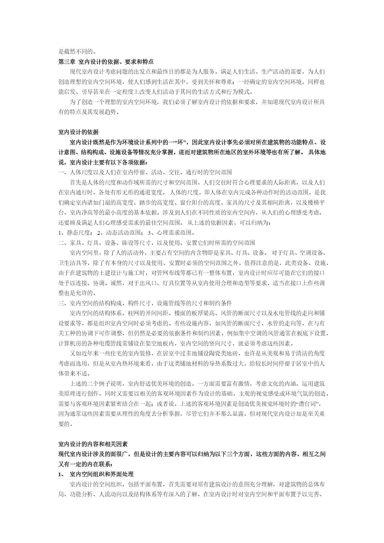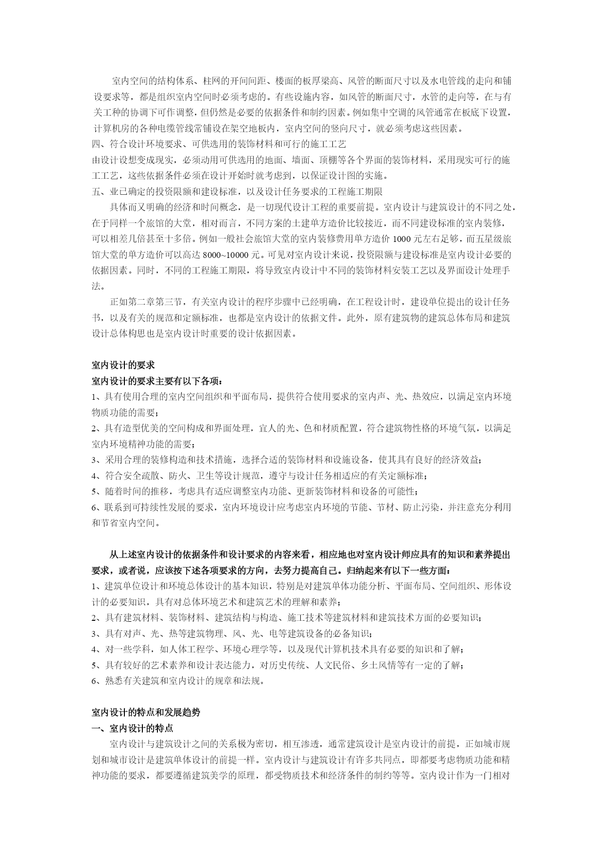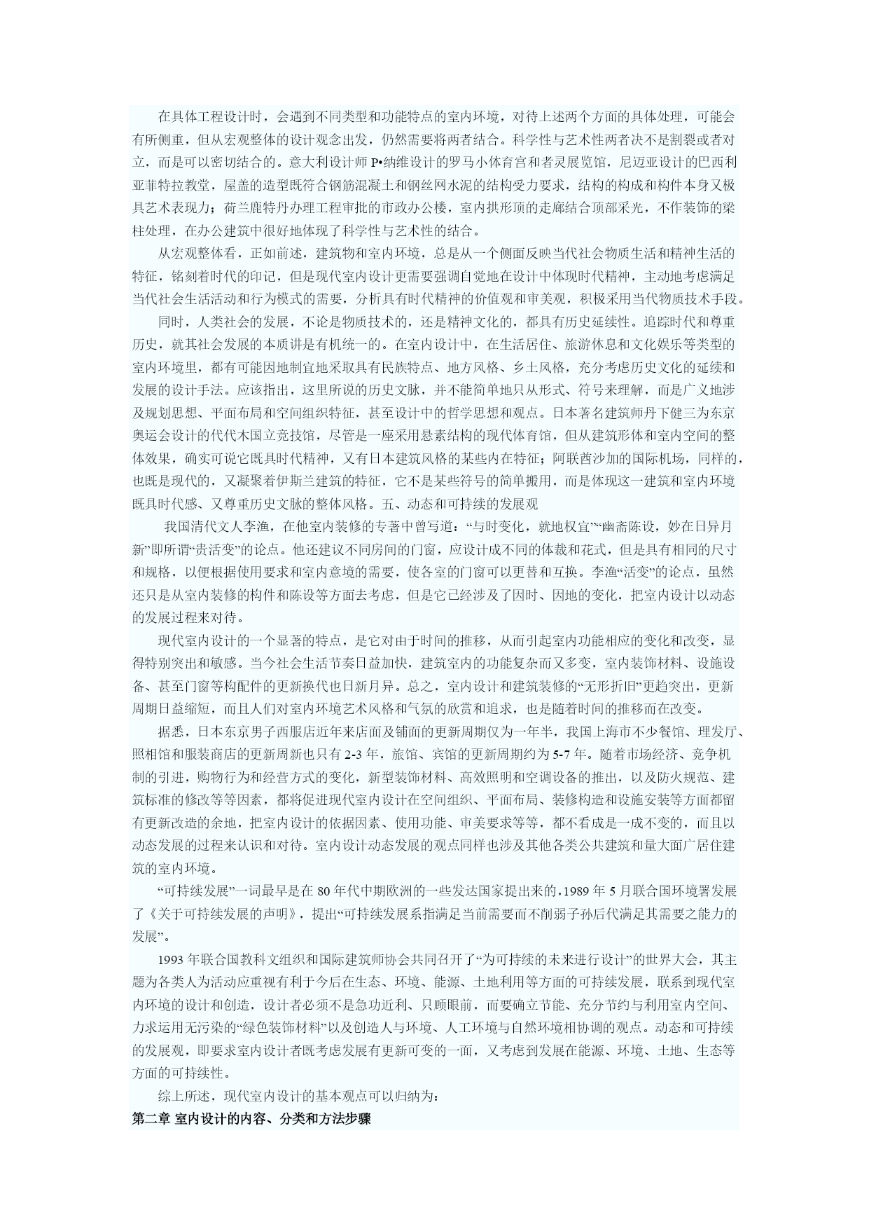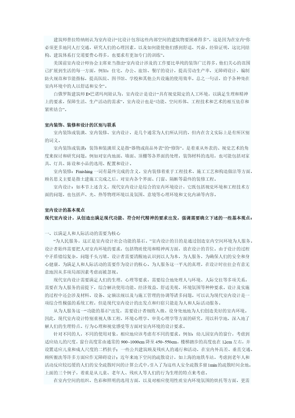 室内设计师理论教程1室内设计原理第一章室内设计的含义和基本观点人的一生,绝大部分时间是在室内度过的,因此,人们设计创造的室内环境,必然会直接关系到室内生活、生产活动的质量,关系到人们的安全、健康、效率、舒适等等。室内环境的创造,应该把保障安全和有利于人们的身心健康作为室内设计的首要前提。人们对于室内环境除了有使用安排、冷暖光照等物质功能方面的要求之外,还常有与建筑物的类型、性格相适应的室内环境氛围、风格文脉等精神功能方面的要求。由于人们长时间半生活活动于室内,因此现代室内设计,或称室内环境设计,相对地是环境设计系列中和人们关系最为密切的环节。室内设计的总体,包括艺术风格,从宏观来看,往往能从一个侧面反映相应时期社会物质和精神生活的特征。随着社会发展的历代的室内设计,总是具有时代的印记,犹如一部无字的史书。这里由于室内设计从设计构思、施工工艺、装饰材料到内部设施,必须和社会当时的物质生产水平、社会文化和精神生活状况联系在一起;在室内空间组织、平面布局和装饰处理等方面,从总体说来,也还和当时的哲学思想、美学观点、社会经济、民俗民风等密切相关。从微观的、个别的作品来看,室内设计水平的高低、质量的优劣又都与设计者的专业素质和文化艺术素养等联系在一起。至于各个单项设计最终实施后成果的品位,又和该项工程具体的施工技术、用材质量、设施配置情况,以及与建设者的协调关系密切相关,即设计是具有决定意义的最关键的环节和前提,但最终成果的质量有赖于:设计——施工——用材——与业主关系的整体协调。室内设计的含义室内设计是根据建筑物的使用性质、所处环境和相应标准,运用物质技术手段和建筑美学原理,创造功能合理、舒适优美、满足人们物质和精神生活需要的室内环境。这一空间环境既具有使用价值,满足相应的功能要求,同时也反映了历史文脉、建筑风格、环境气氛等精神因素。上述含义中,明确地把“创造满足人们物质和精神生活需要的室内环境”作为室内设计的目的,即以人为本,一切围绕为人的生活生产活动创造美好的室内环境。同时,室内设计中,从整体上把握设计对象的依据因素则是:使用性质——为什么样功能设计建筑物和室内空间;所在场所——这一建筑物和室内空间的周围环境状况;经济投入——相应工程项目的总投资和单方造价标准的控制。设计构思时,需要运用物质技术手段,即各类装饰材料和设施设备等,这是容易理解的;还需要遵循建筑美学原理,这是因为室内设计的艺术性,除了有与绘画、雕塑等艺术之间共同的美学法则之外,作为“建筑美学”,更需要综合考虑使用功能、结构施工、材料设备、造价标准等多种因素。建筑美学总是和实用、技术、经济等因素联结在一起,这是它有别于绘画、雕塑等纯艺术的差异所在。现代室内设计既有很高的艺术性的要求,其涉及的设计内容又有很高的技术含量,并且与一些新兴学科,如:人体工程学、环境心理学、环境物理学等关系极为密切。现代室内设计已经在环境设计中发展成为独立的新兴学科。对室内设计含义的理解,以及它与建筑设计的关系,从不同的视角、不同的侧重点来分析,许多学者都有不少具有深刻见解、值得我们仔细思考和借鉴的观点,例如:认为室内设计“是建筑设计的继续和深化,是室内空间和环境的再创造”。认为室内是“建筑的灵魂,是人与环境的联系,是人类艺术与物质文明的结合”。我国前辈建筑师戴念慈先生认为“建筑设计的出发点和着眼点是内涵的建筑空间,把空间效果作为建筑艺术追求的目标,而界面、门窗是构成空间必要的从属部分。从属部分是构成空间的物质基础,并对内涵空间使用的观感起决定性作用,然而毕竟是从属部分。至于外形只是构成内涵空间的必然结果”。建筑师普拉特纳则认为室内设计“比设计包容这些内部空间的建筑物要困难得多”,这是因为在室内“你必须更多地同人打交通,研究人们的心理因素,以及如何能使他们感到舒适、兴奋。经验证明,这比同结构、建筑体系打交道要费心得多,也要求有更加专门的训练”。美国前室内设计师协会主席亚当指出“室内设计涉及的工作要比单纯的装饰广泛得多,他们关心的范围已扩展到生活的每一方面,例如:住宅、办公、旅馆、餐厅的设计,提高劳动生产率,无障碍设计,编制防火规范和节能指标,提高医院、图书馆、学校和其他公共设施的使用效率。总之一句话,给予各种处在室内环境中的人以舒适和安全”。白俄罗斯建筑师E•巴诺玛列娃认为,室内设计是设计“具有视觉限定的人工环境,以满足生理和精神上的要求,保障生活、生产活动的需求”,室内设计也是“功能、空间形体、工程技术和艺术的相互依存和紧密结合”。室内装饰、装修和设计的区别与联系室内装饰或装潢、室内装修、室内设计,是几个通常为人们所认同的,但内在含义实际上是有所区别的词义。室内装饰或装潢:装饰和装潢原义是指“器物或商品外表”的“修饰”,是着重从外表的、视觉艺术的角度来探讨和研究问题。例如对室内地面