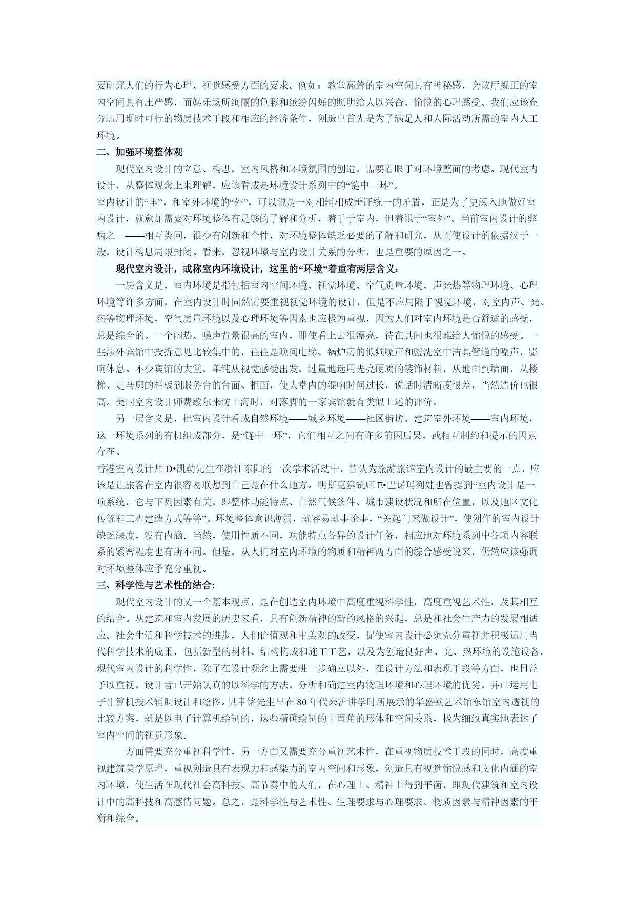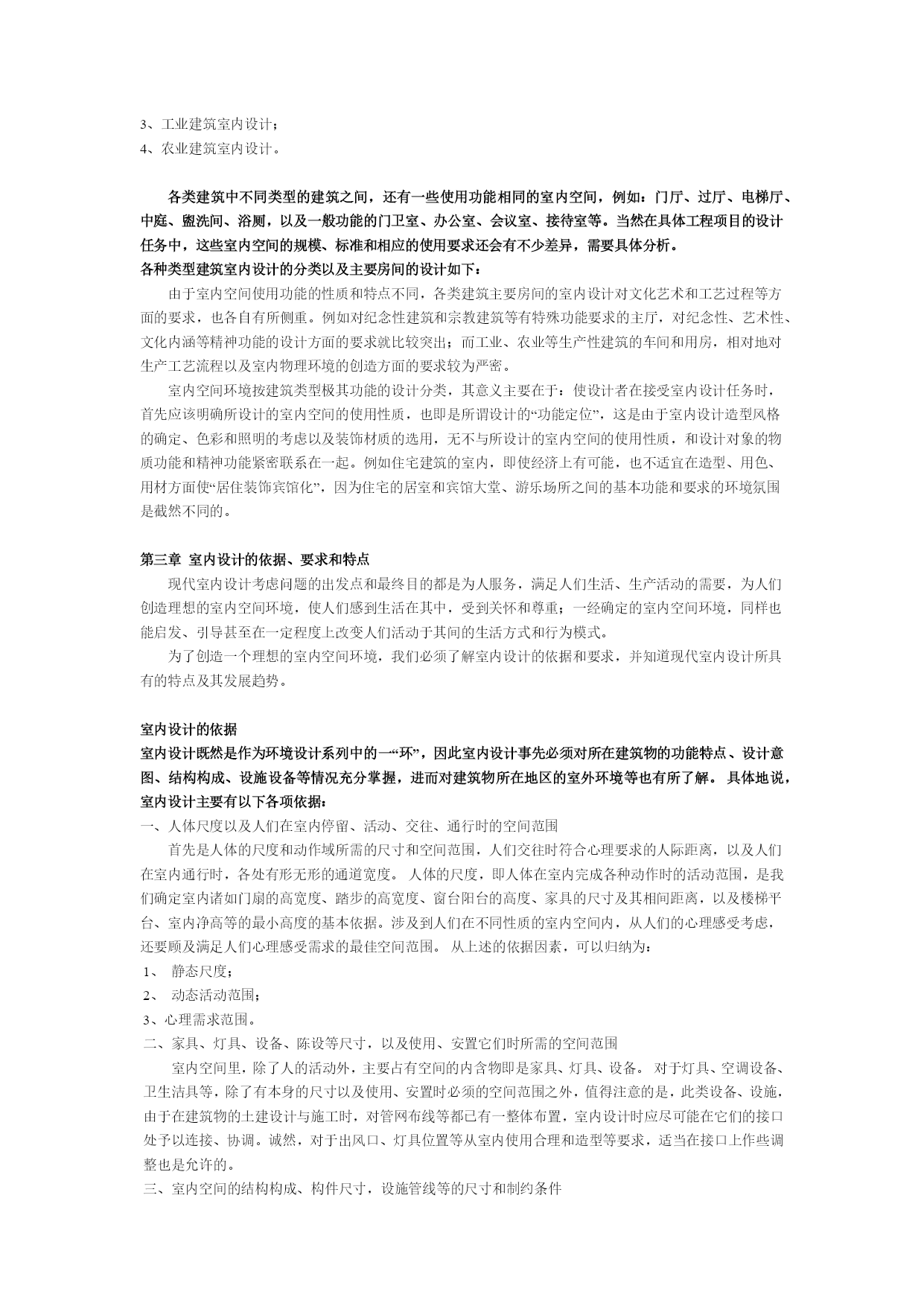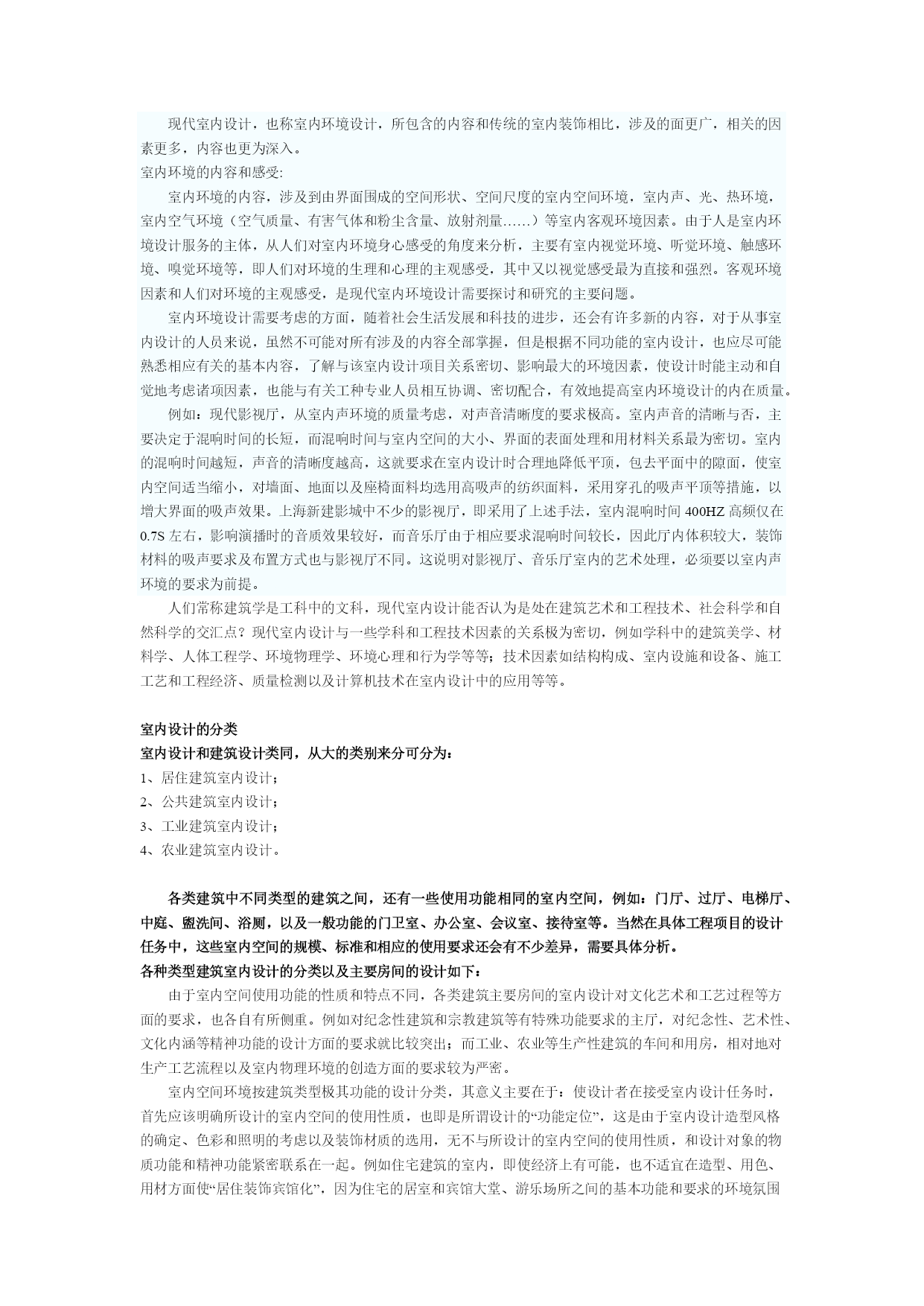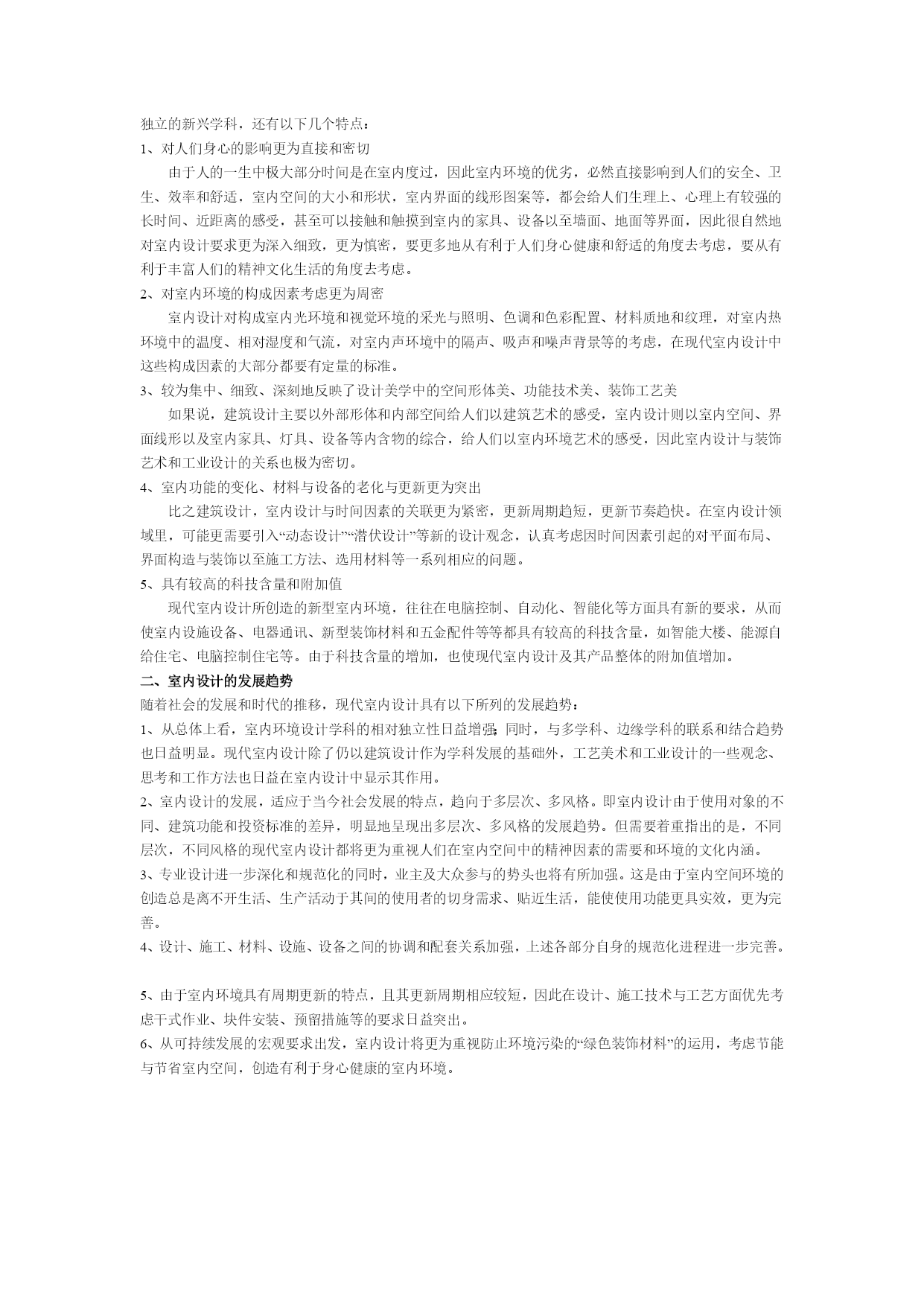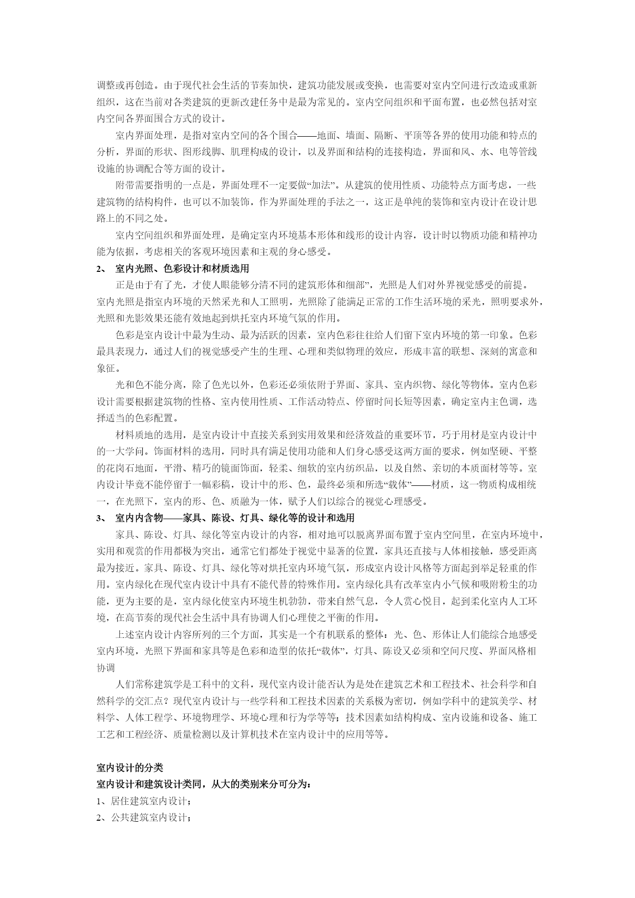 室内设计师理论教程1室内设计原理第一章室内设计的含义和基本观点人的一生,绝大部分时间是在室内度过的,因此,人们设计创造的室内环境,必然会直接关系到室内生活、生产活动的质量,关系到人们的安全、健康、效率、舒适等等。室内环境的创造,应该把保障安全和有利于人们的身心健康作为室内设计的首要前提。人们对于室内环境除了有使用安排、冷暖光照等物质功能方面的要求之外,还常有与建筑物的类型、性格相适应的室内环境氛围、风格文脉等精神功能方面的要求。由于人们长时间半生活活动于室内,因此现代室内设计,或称室内环境设计,相对地是环境设计系列中和人们关系最为密切的环节。室内设计的总体,包括艺术风格,从宏观来看,往往能从一个侧面反映相应时期社会物质和精神生活的特征。随着社会发展的历代的室内设计,总是具有时代的印记,犹如一部无字的史书。这里由于室内设计从设计构思、施工工艺、装饰材料到内部设施,必须和社会当时的物质生产水平、社会文化和精神生活状况联系在一起;在室内空间组织、平面布局和装饰处理等方面,从总体说来,也还和当时的哲学思想、美学观点、社会经济、民俗民风等密切相关。从微观的、个别的作品来看,室内设计水平的高低、质量的优劣又都与设计者的专业素质和文化艺术素养等联系在一起。至于各个单项设计最终实施后成果的品位,又和该项工程具体的施工技术、用材质量、设施配置情况,以及与建设者的协调关系密切相关,即设计是具有决定意义的最关键的环节和前提,但最终成果的质量有赖于:设计——施工——用材——与业主关系的整体协调。室内设计的含义室内设计是根据建筑物的使用性质、所处环境和相应标准,运用物质技术手段和建筑美学原理,创造功能合理、舒适优美、满足人们物质和精神生活需要的室内环境。这一空间环境既具有使用价值,满足相应的功能要求,同时也反映了历史文脉、建筑风格、环境气氛等精神因素。上述含义中,明确地把“创造满足人们物质和精神生活需要的室内环境”作为室内设计的目的,即以人为本,一切围绕为人的生活生产活动创造美好的室内环境。同时,室内设计中,从整体上把握设计对象的依据因素则是:使用性质——为什么样功能设计建筑物和室内空间;所在场所——这一建筑物和室内空间的周围环境状况;经济投入——相应工程项目的总投资和单方造价标准的控制。设计构思时,需要运用物质技术手段,即各类装饰材料和设施设备等,这是容易理解的;还需要遵循建筑美学原理,这是因为室内设计的艺术性,除了有与绘画、雕塑等艺术之间共同的美学法则之外,作为“建筑美学”,更需要综合考虑使用功能、结构施工、材料设备、造价标准等多种因素。建筑美学总是和实用、技术、经济等因素联结在一起,这是它有别于绘画、雕塑等纯艺术的差异所在。现代室内设计既有很高的艺术性的要求,其涉及的设计内容又有很高的技术含量,并且与一些新兴学科,如:人体工程学、环境心理学、环境物理学等关系极为密切。现代室内设计已经在环境设计中发展成为独立的新兴学科。对室内设计含义的理解,以及它与建筑设计的关系,从不同的视角、不同的侧重点来分析,许多学者都有不少具有深刻见解、值得我们仔细思考和借鉴的观点,例如:认为室内设计“是建筑设计的继续和深化,是室内空间和环境的再创造”。认为室内是“建筑的灵魂,是人与环境的联系,是人类艺术与物质文明的结合”。我国前辈建筑师戴念慈先生认为“建筑设计的出发点和着眼点是内涵的建筑空间,把空间效果作为建筑艺术追求的目标,而界面、门窗是构成空间必要的从属部分。从属部分是构成空间的物质基础,并对内涵空间使用的观感起决定性作用,然而毕竟是从属部分。至于外形只是构成内涵空间的必然结果”。建筑师普拉特纳则认为室内设计“比设计包容这些内部空间的建筑物要困难得多”,这是因为在室内“你必须更多地同人打交通,研究人们的心理因素,以及如何能使他们感到舒适、兴奋。经验证明,这比同结构、建筑体系打交道要费心得多,也要求有更加专门的训练”。美国前室内设计师协会主席亚当指出“室内设计涉及的工作要比单纯的装饰广泛得多,他们关心的范围已扩展到生活的每一方面,例如:住宅、办公、旅馆、餐厅的设计,提高劳动生产率,无障碍设计,编制防火规范和节能指标,提高医院、图书馆、学校和其他公共设施的使用效率。总之一句话,给予各种处在室内环境中的人以舒适和安全”。白俄罗斯建筑师E•巴诺玛列娃认为,室内设计是设计“具有视觉限定的人工环境,以满足生理和精神上的要求,保障生活、生产活动的需求”,室内设计也是“功能、空间形体、工程技术和艺术的相互依存和紧密结合”。室内装饰、装修和设计的区别与联系室内装饰或装潢、室内装修、室内设计,是几个通常为人们所认同的,但内在含义实际上是有所区别的词义。室内装饰或装潢:装饰和装潢原义是指“器物或商品外表”的“修饰”,是着重从外表的、视觉艺术的角度来探讨和研究问题。例如对室内地面